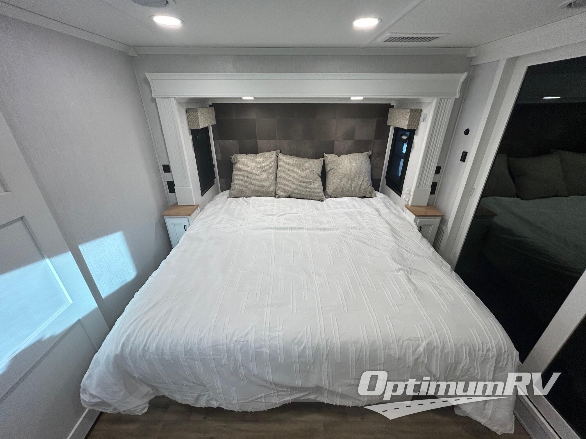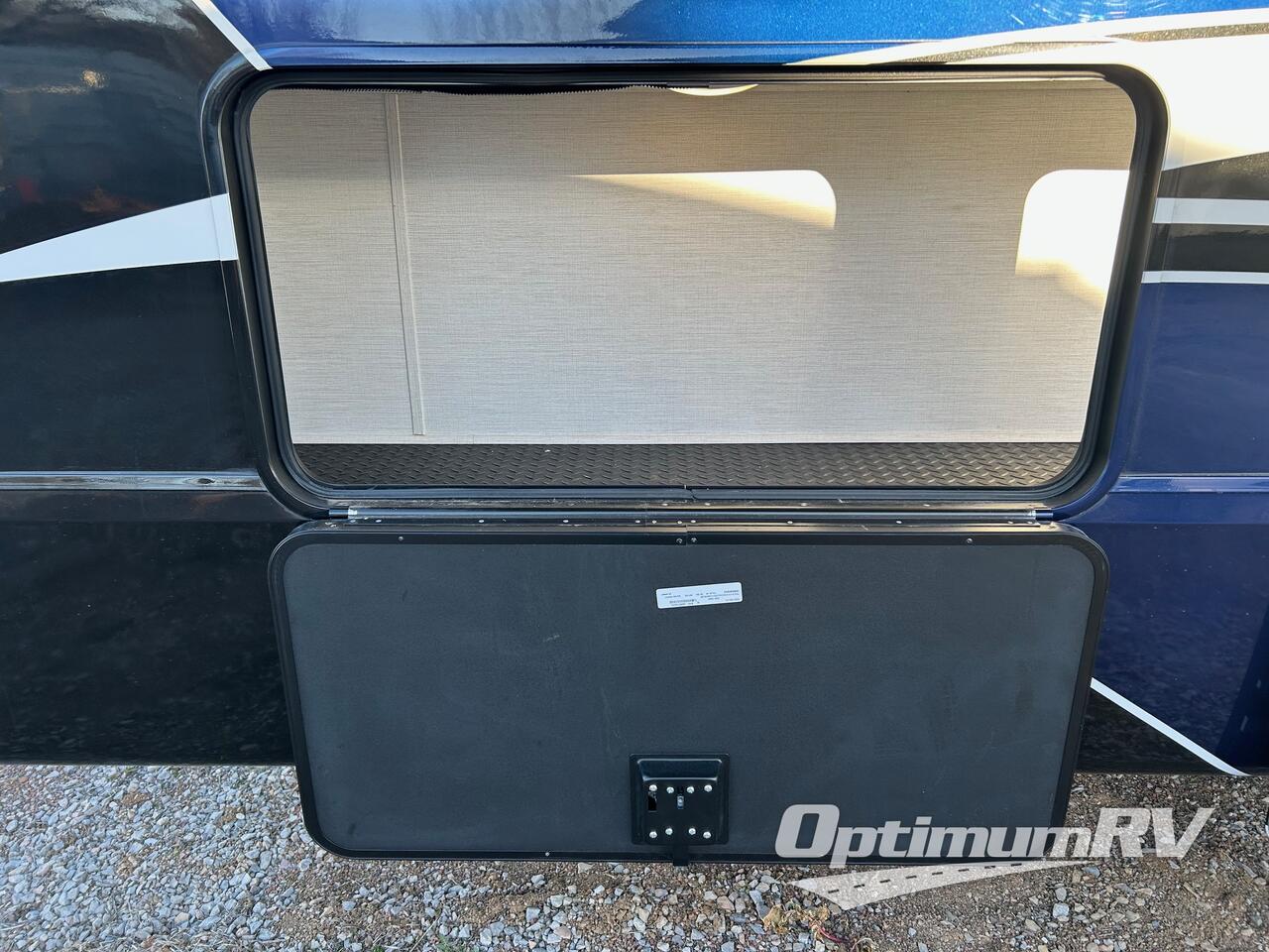 You will be completely impressed with this RiverStone fifth wheel! There is a private bedroom that includes a king-size bed, 40" LED TV, washer/dryer, dresser, and a mirrored wardrobe. The bedroom is right next to the full bathroom where you will find a dual-sink vanity, porcelain toilet with foot flush, shower, and linen closet. The kitchen has opposing slides that keep this space open, and there is a pull-out dinette that you can sit at when it's dinner time. Above the island there is a large Infiniti light, and the ceiling fan will keep the interior cool while you relax. Speaking of relaxing, there's no better place to do that than in the rear den. This separate living area has a theater sofa, two E-Z glide sofas, and an entertainment center with a 65" Samsung LED Smart TV and fireplace.