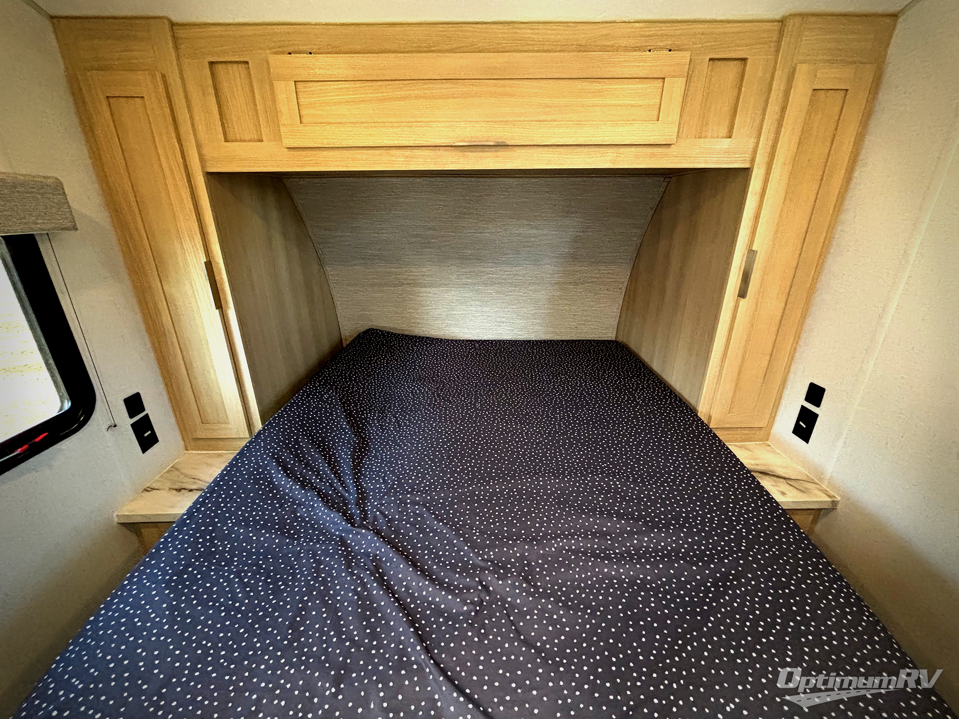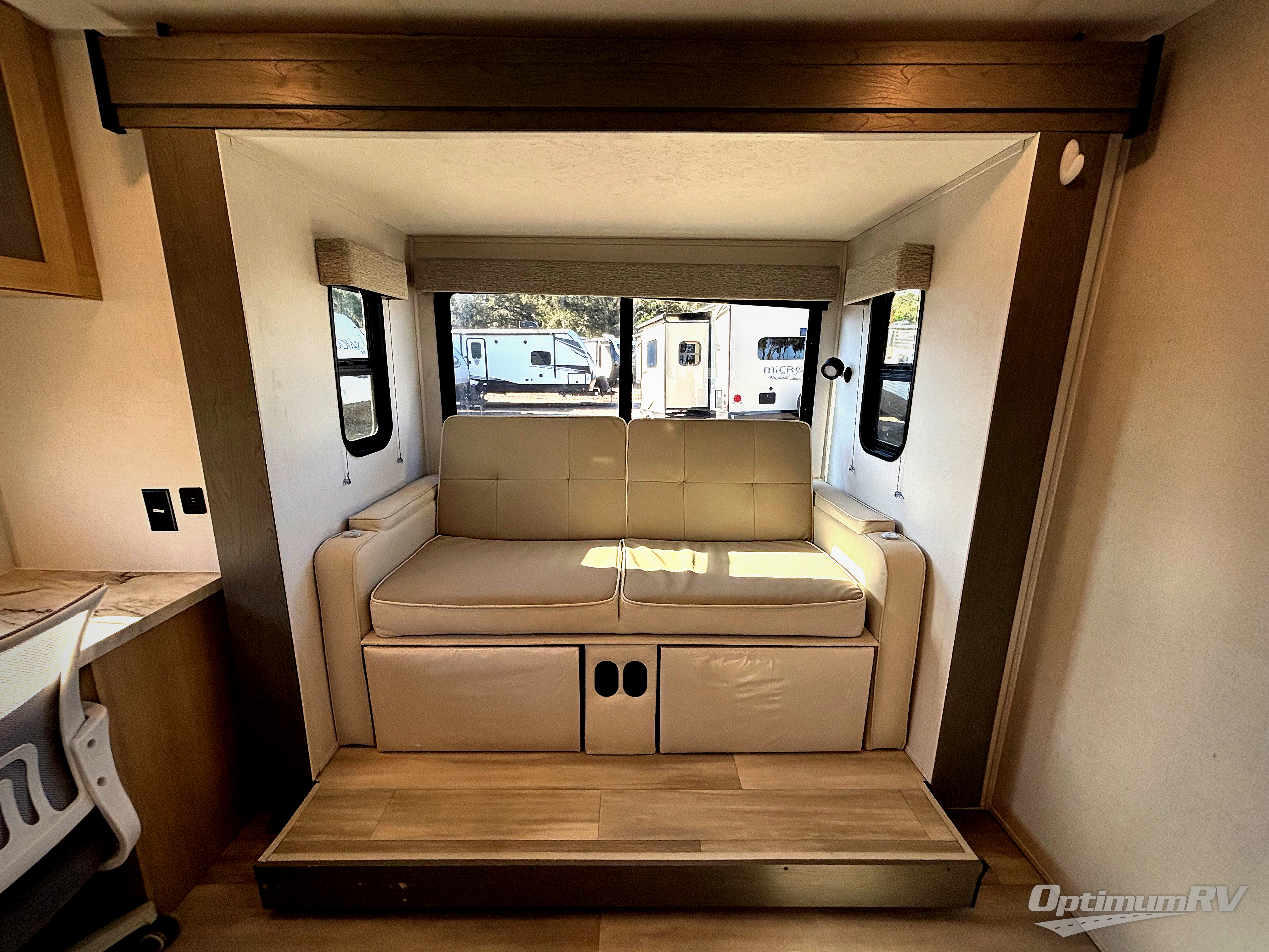You're going to love every minute spent in this couple's trailer. The queen bed in the front private bedroom will provide a great night's rest, and there are dual wardrobes to easily get dressed in the morning. Head to the kitchen through the bath, then prepare eggs and bacon on the two burner cooktop. There is theater seating here to enjoy your coffee at each morning, or you may want to get some work done at the mobile workstation!