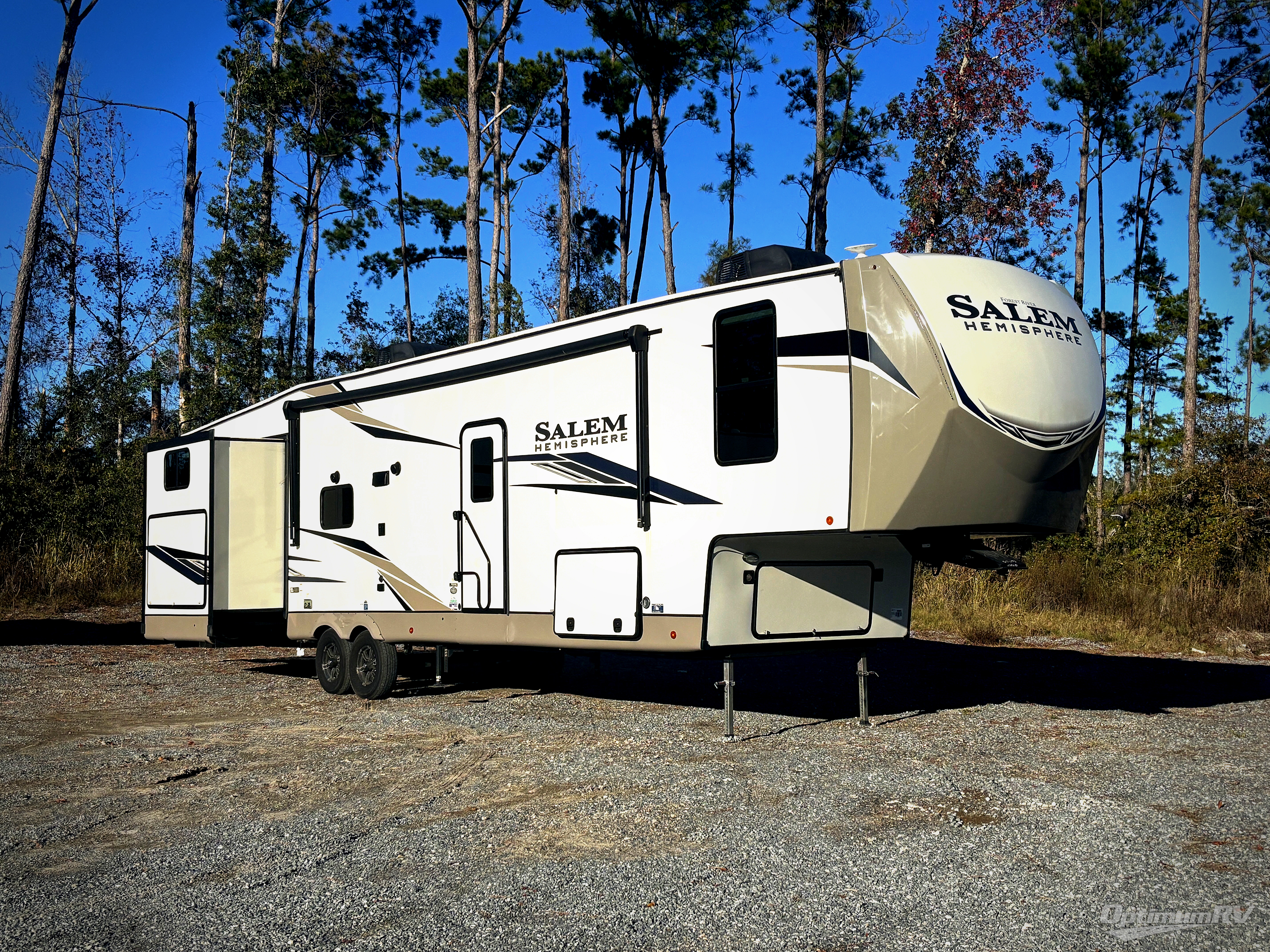 With each Forest River Salem Hemisphere fifth wheel and travel trailer, there are vacuum bonded "Aluma frame" sidewalls and floors, a heated and enclosed underbelly, and an extra large pass-through storage so you can bring along hiking gear, fishing poles, and more! Each model includes an Ivory Performance colored exterior fiberglass, a central switch center, a spare tire and carrier, and many more convenient features within the included Upgraded Options Package. There is also European Oak colored horizontal plank linoleum flooring, a Designer's Choice comforter, and saddle colored wood cabinetry to name a few at-home comforts. Power stabilizers comes standard with the VIP Package, along with 12V heat pads on all holding tanks, extra large Max-Tint panoramic window package, and the list goes on!