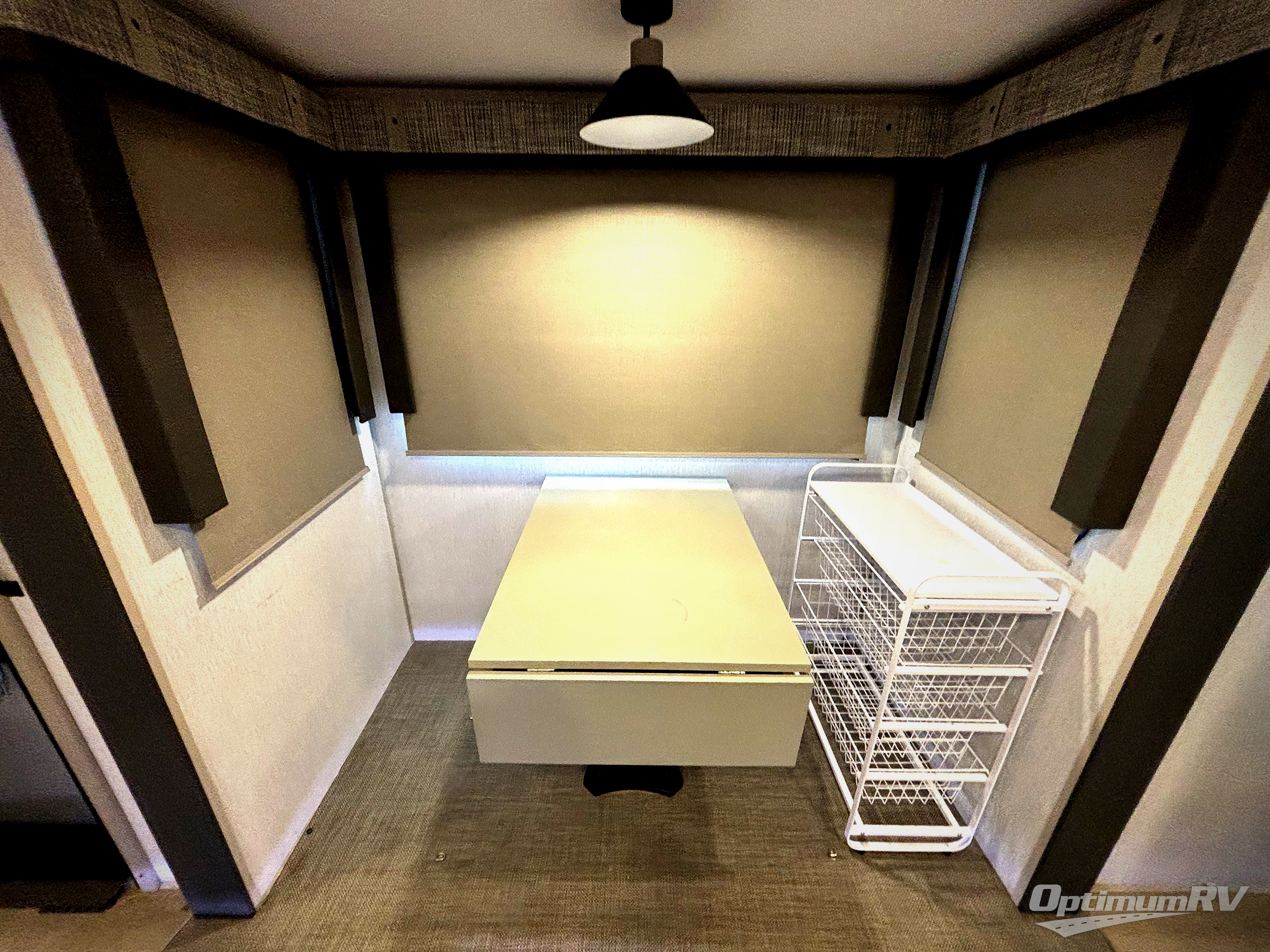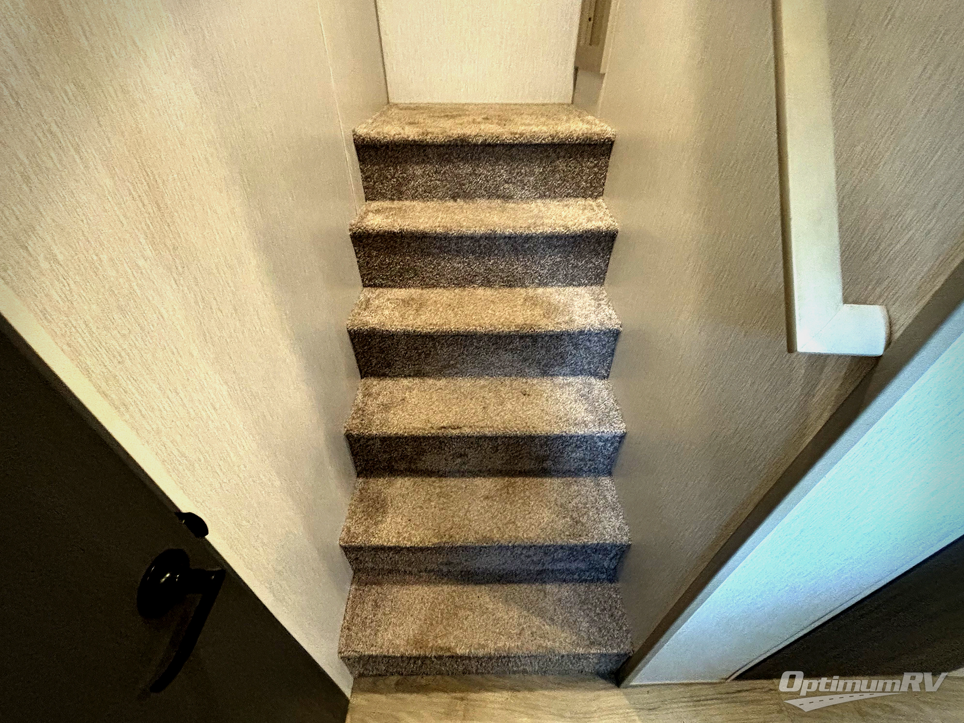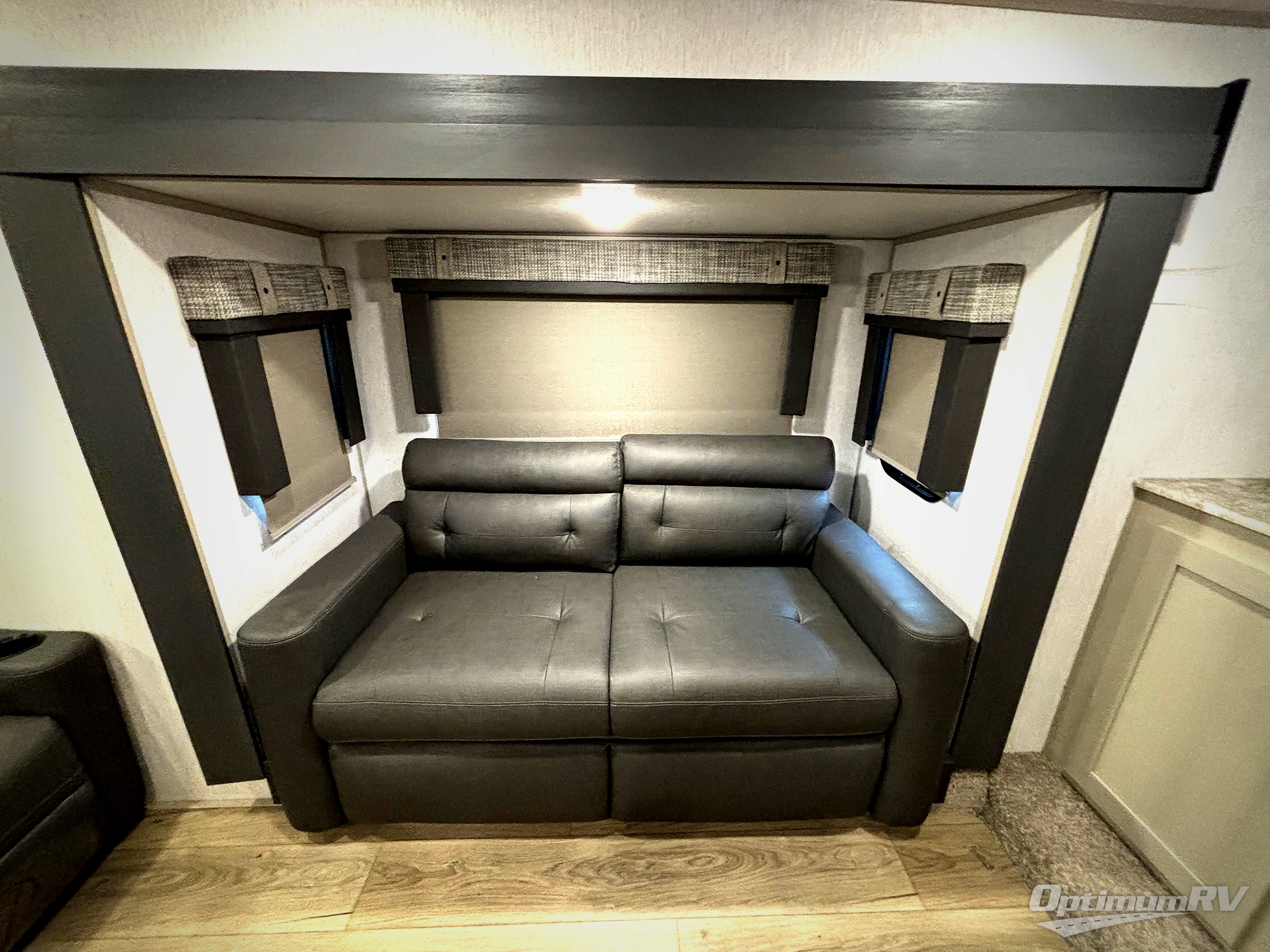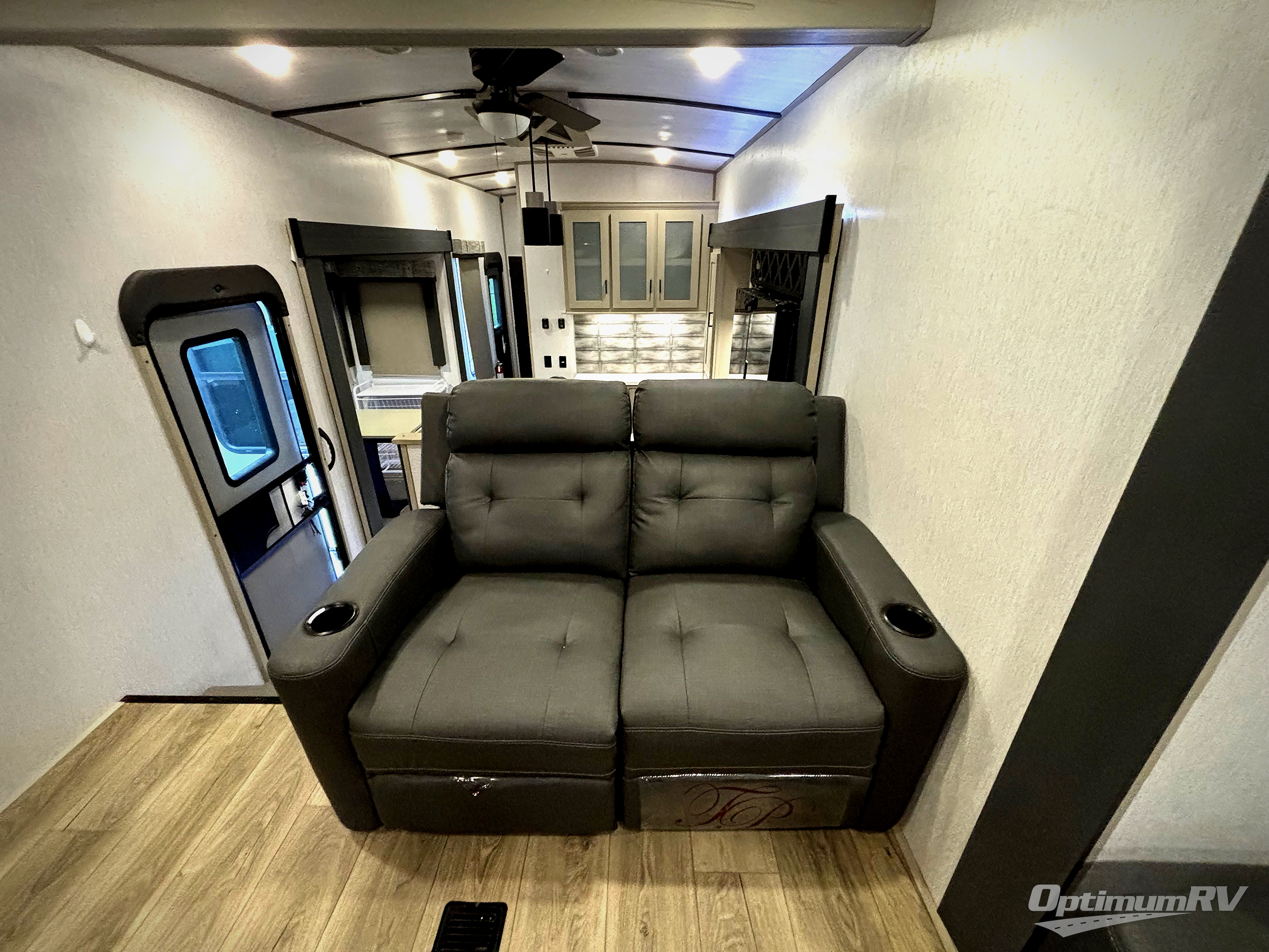 This fifth wheel is decked out in features you're going to love from the front separate living area to the Texas-sized exterior pass-through storage area! The two tri-fold sofas can convert into sleeping space and the theater seating is the perfect place to relax while you watch your favorite movie on the 50" LED TV. The kitchen island not only makes meal prepping easy, but cleaning up just as easy with the large sink. Everyone will enjoy getting ready each morning in the full bathroom with the residential walk-in shower and a vanity sink next to it. The rear private bedroom has everything you will need to feel right at home with the custom king bed, the wardrobe that is prepped to add the optional washer and dryer, and the large panoramic window on the rear wall to let in some morning sunlight. Plus, there are stairs just outside the bedroom that lead up to the loft with two bunk mats and storage areas!