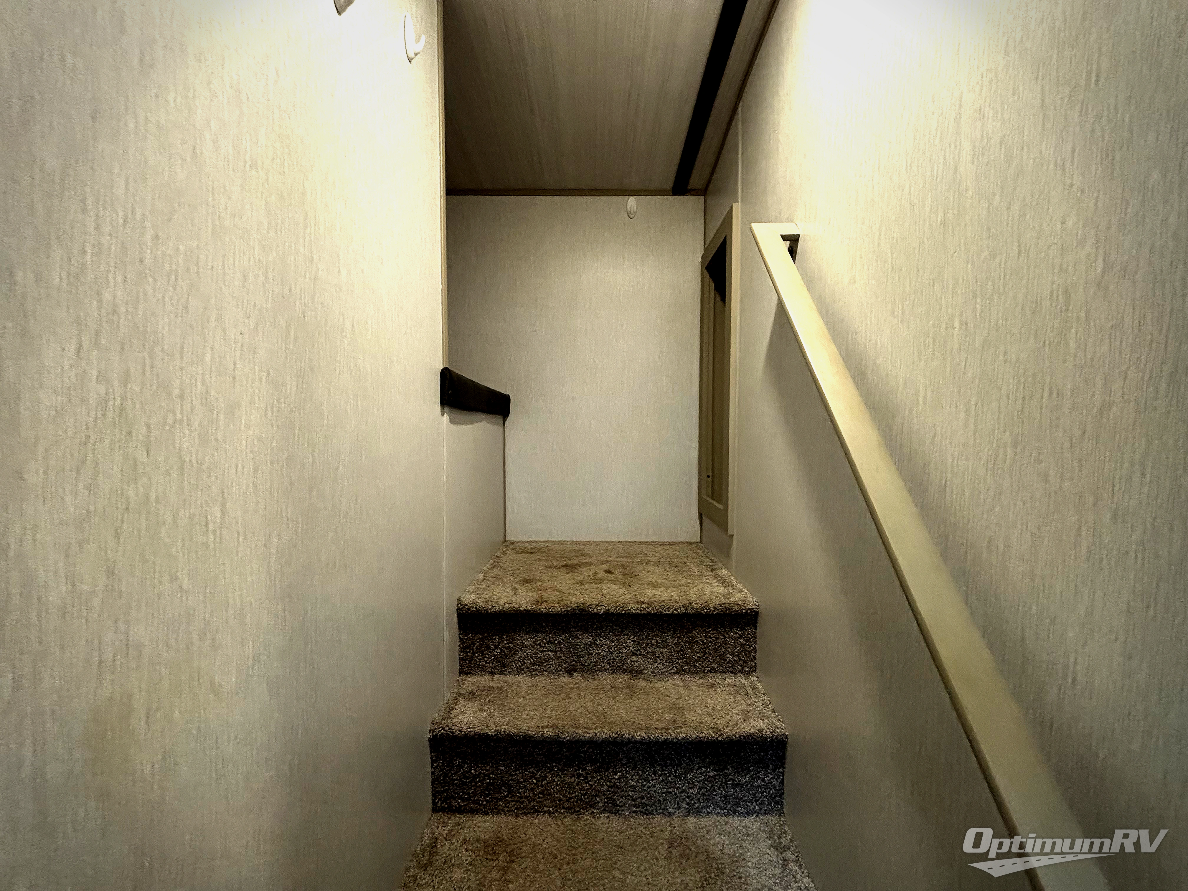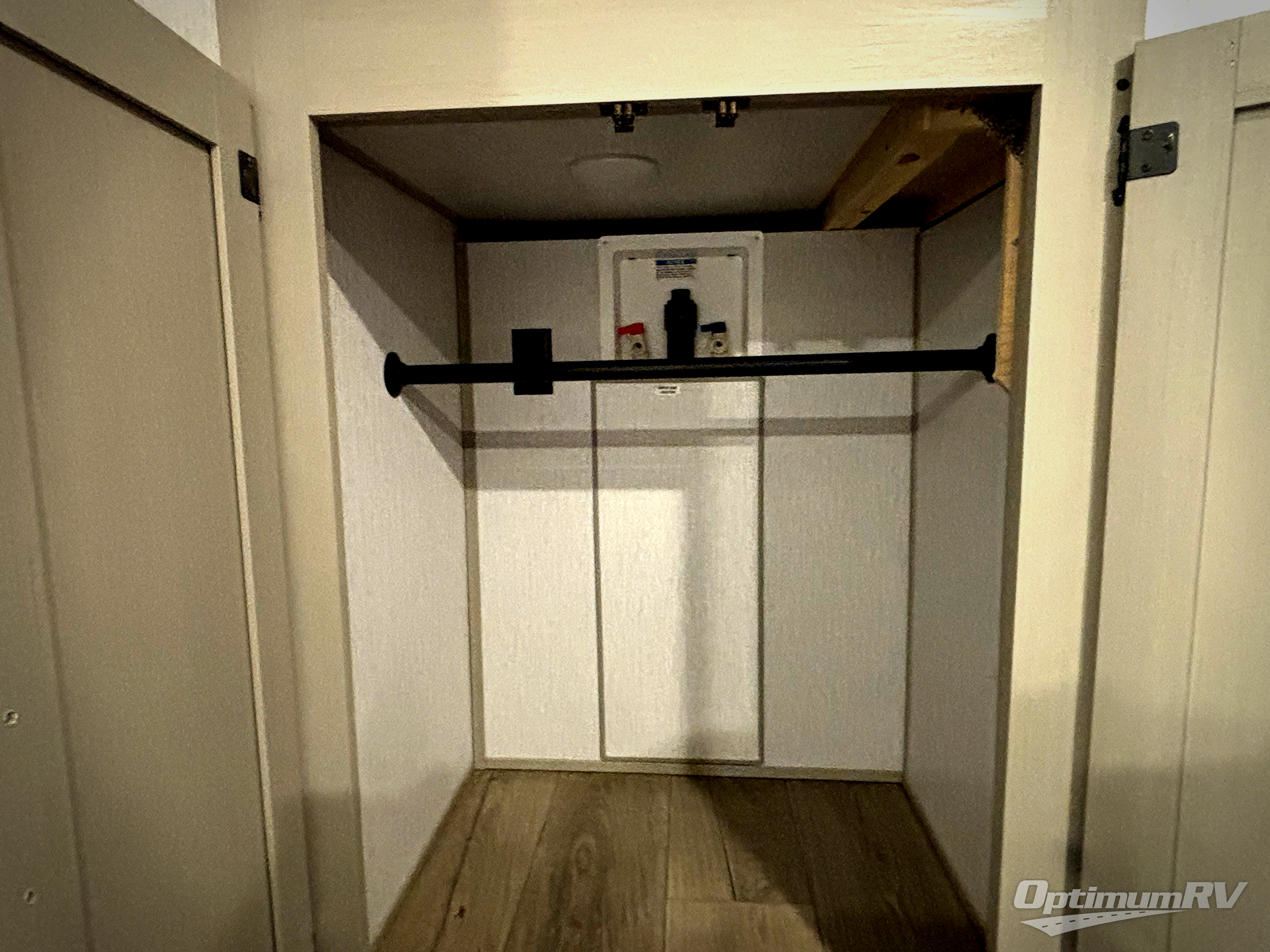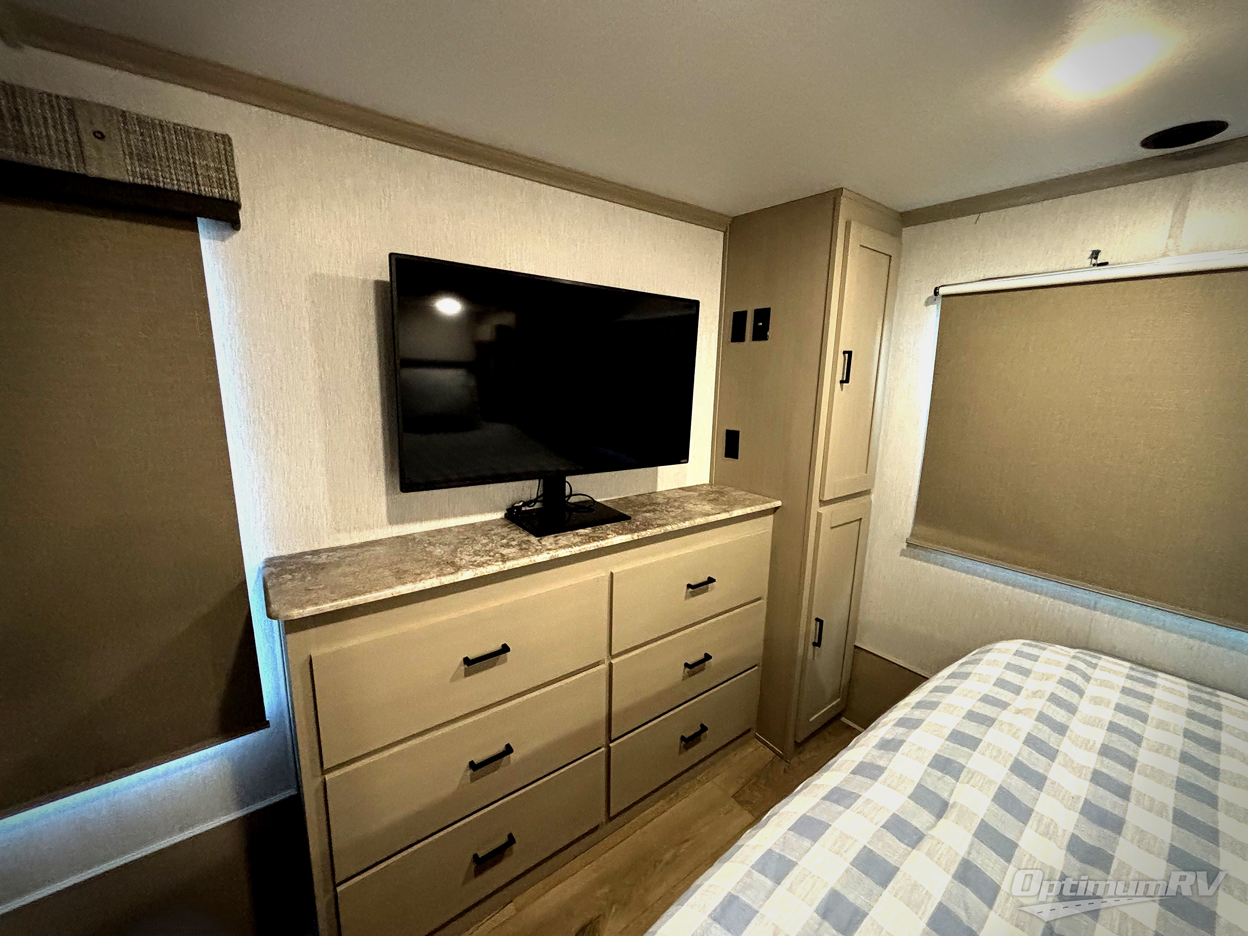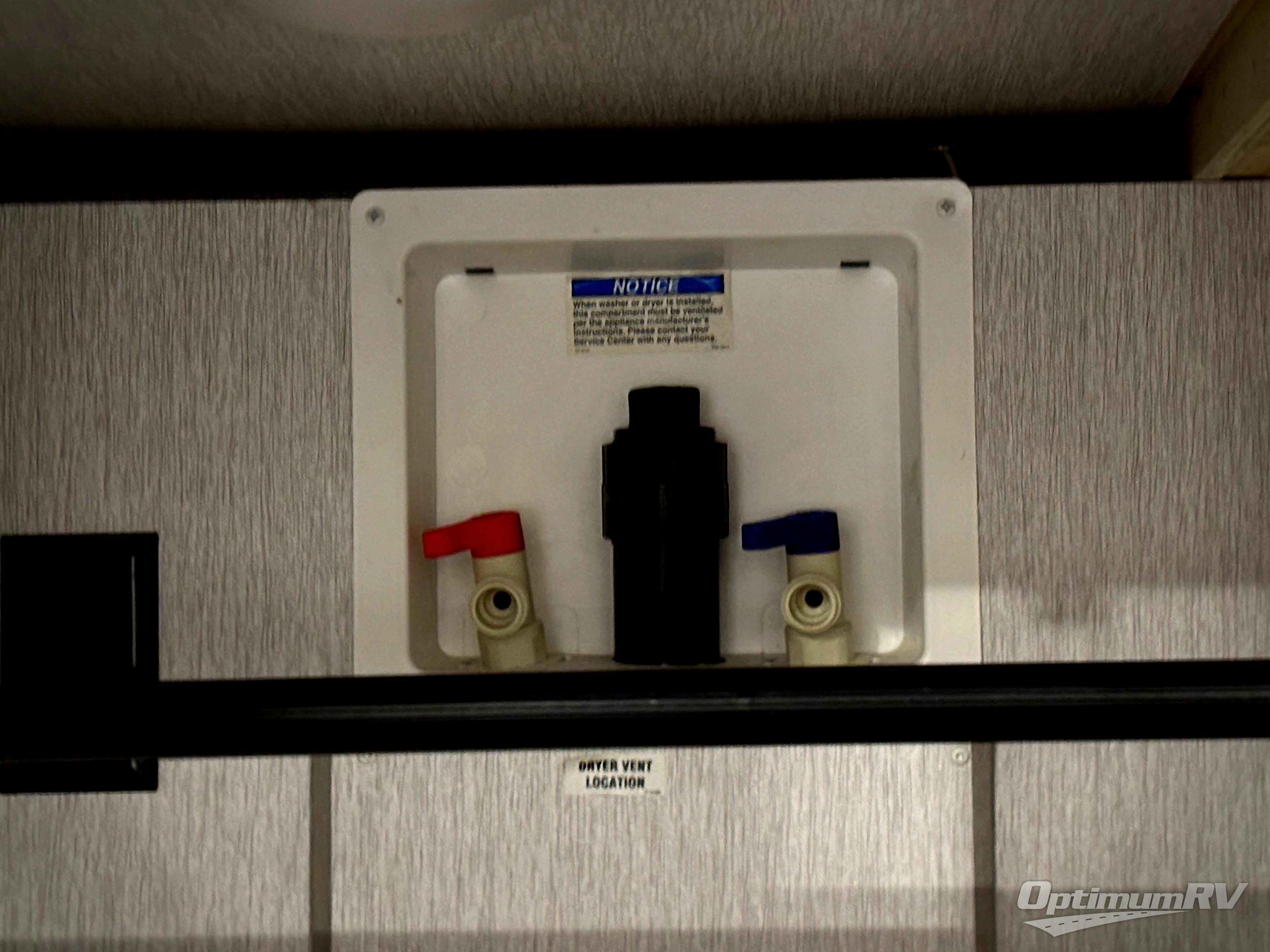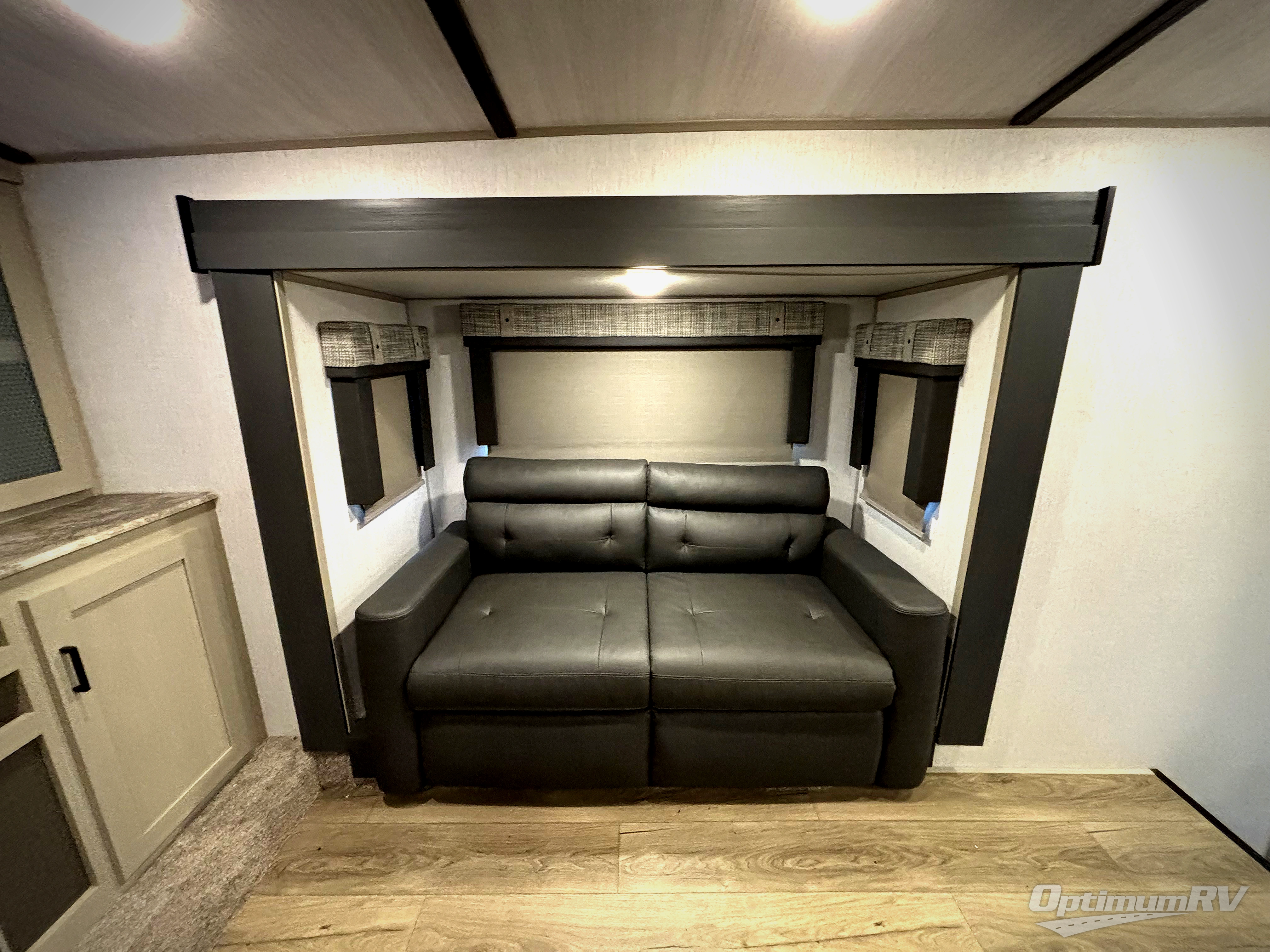 This fifth wheel is decked out in features you're going to love from the front separate living area to the Texas-sized exterior pass-through storage area! The two tri-fold sofas can convert into sleeping space and the theater seating is the perfect place to relax while you watch your favorite movie on the 50" LED TV. The kitchen island not only makes meal prepping easy, but cleaning up just as easy with the large sink. Everyone will enjoy getting ready each morning in the full bathroom with the residential walk-in shower and a vanity sink next to it. The rear private bedroom has everything you will need to feel right at home with the custom king bed, the wardrobe that is prepped to add the optional washer and dryer, and the large panoramic window on the rear wall to let in some morning sunlight. Plus, there are stairs just outside the bedroom that lead up to the loft with two bunk mats and storage areas!