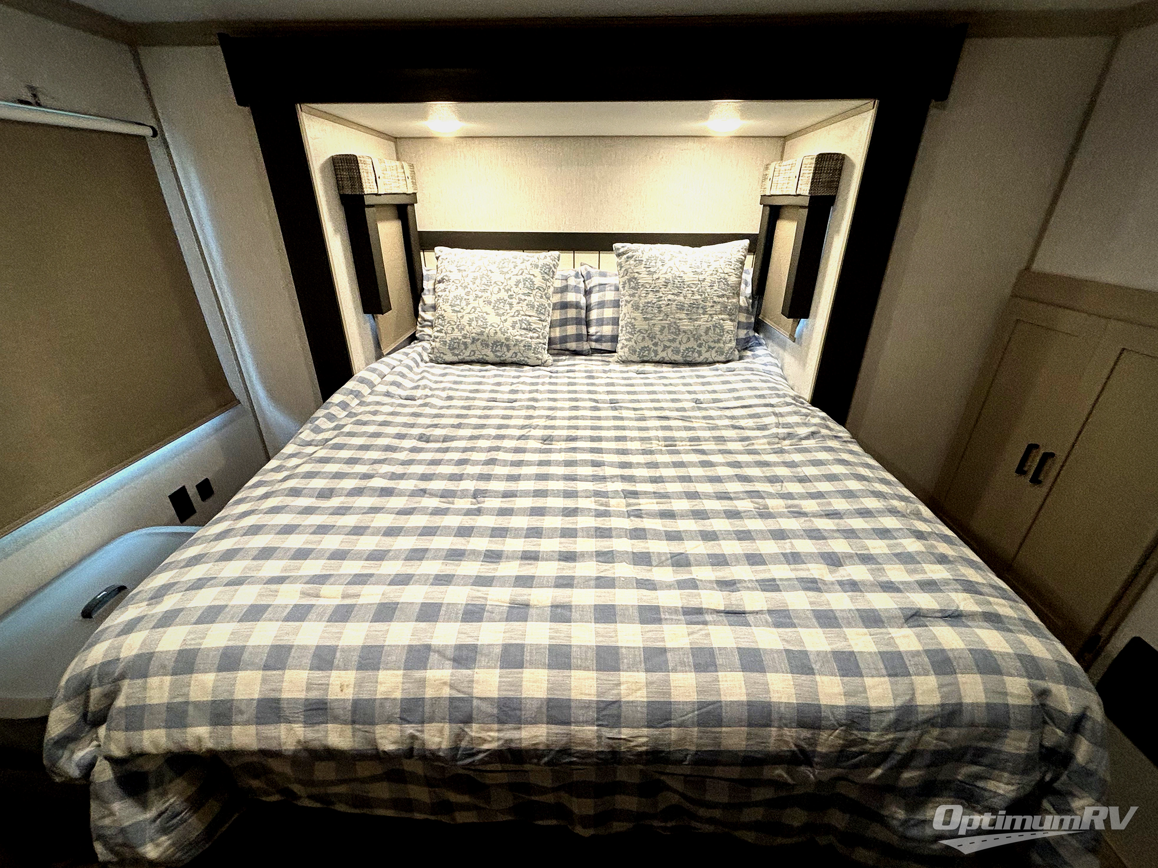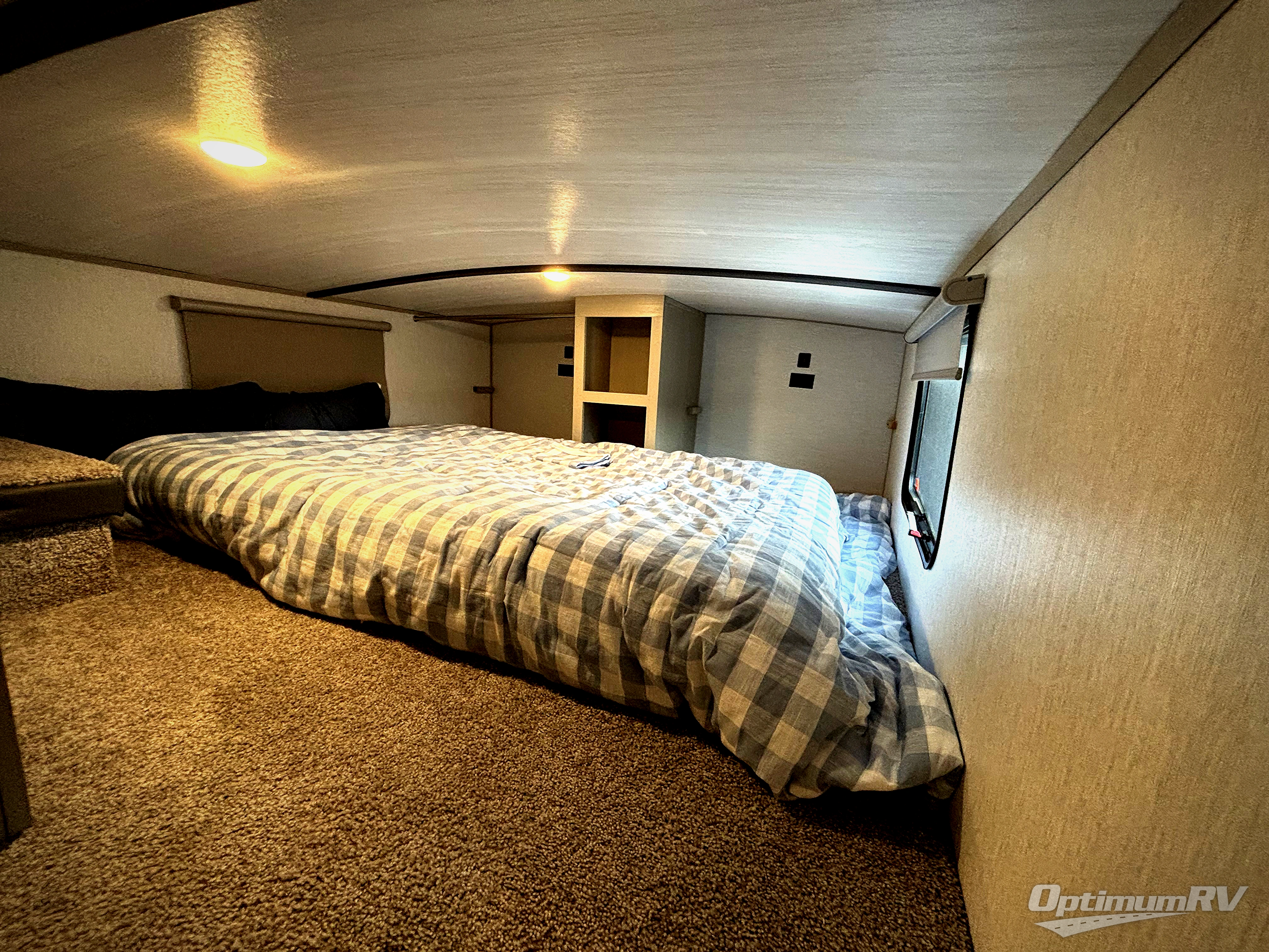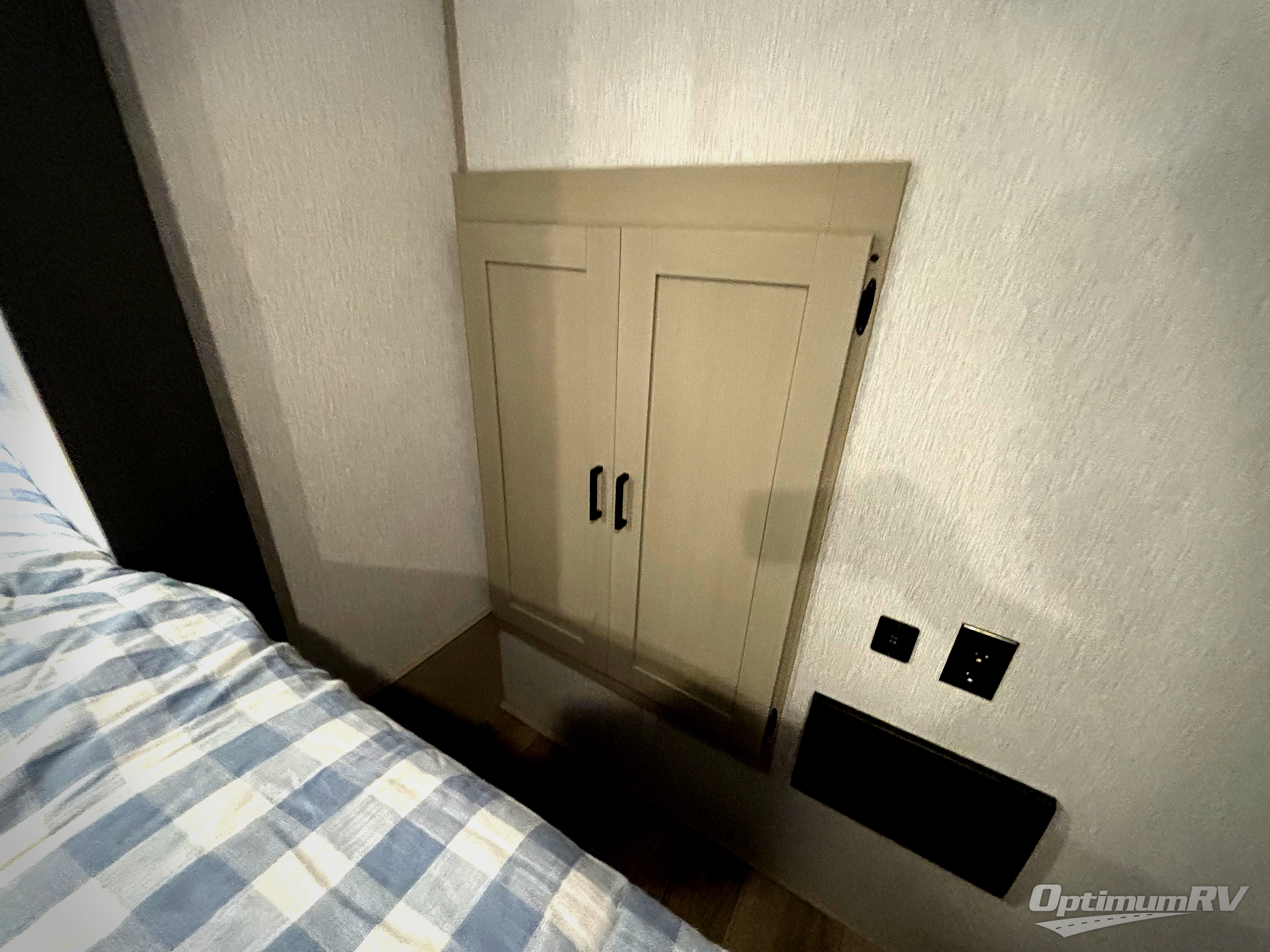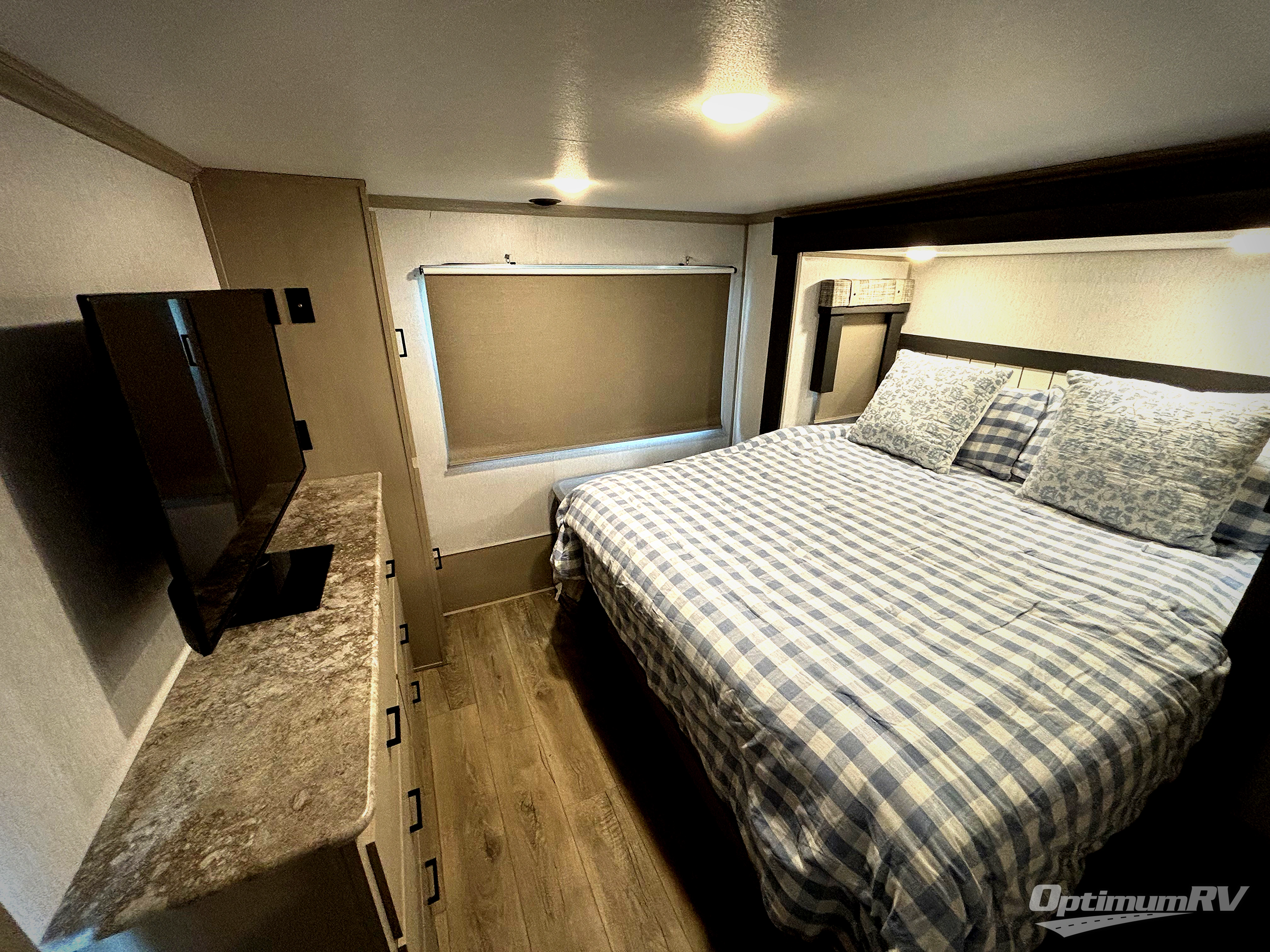 This fifth wheel is decked out in features you're going to love from the front separate living area to the Texas-sized exterior pass-through storage area! The two tri-fold sofas can convert into sleeping space and the theater seating is the perfect place to relax while you watch your favorite movie on the 50" LED TV. The kitchen island not only makes meal prepping easy, but cleaning up just as easy with the large sink. Everyone will enjoy getting ready each morning in the full bathroom with the residential walk-in shower and a vanity sink next to it. The rear private bedroom has everything you will need to feel right at home with the custom king bed, the wardrobe that is prepped to add the optional washer and dryer, and the large panoramic window on the rear wall to let in some morning sunlight. Plus, there are stairs just outside the bedroom that lead up to the loft with two bunk mats and storage areas!