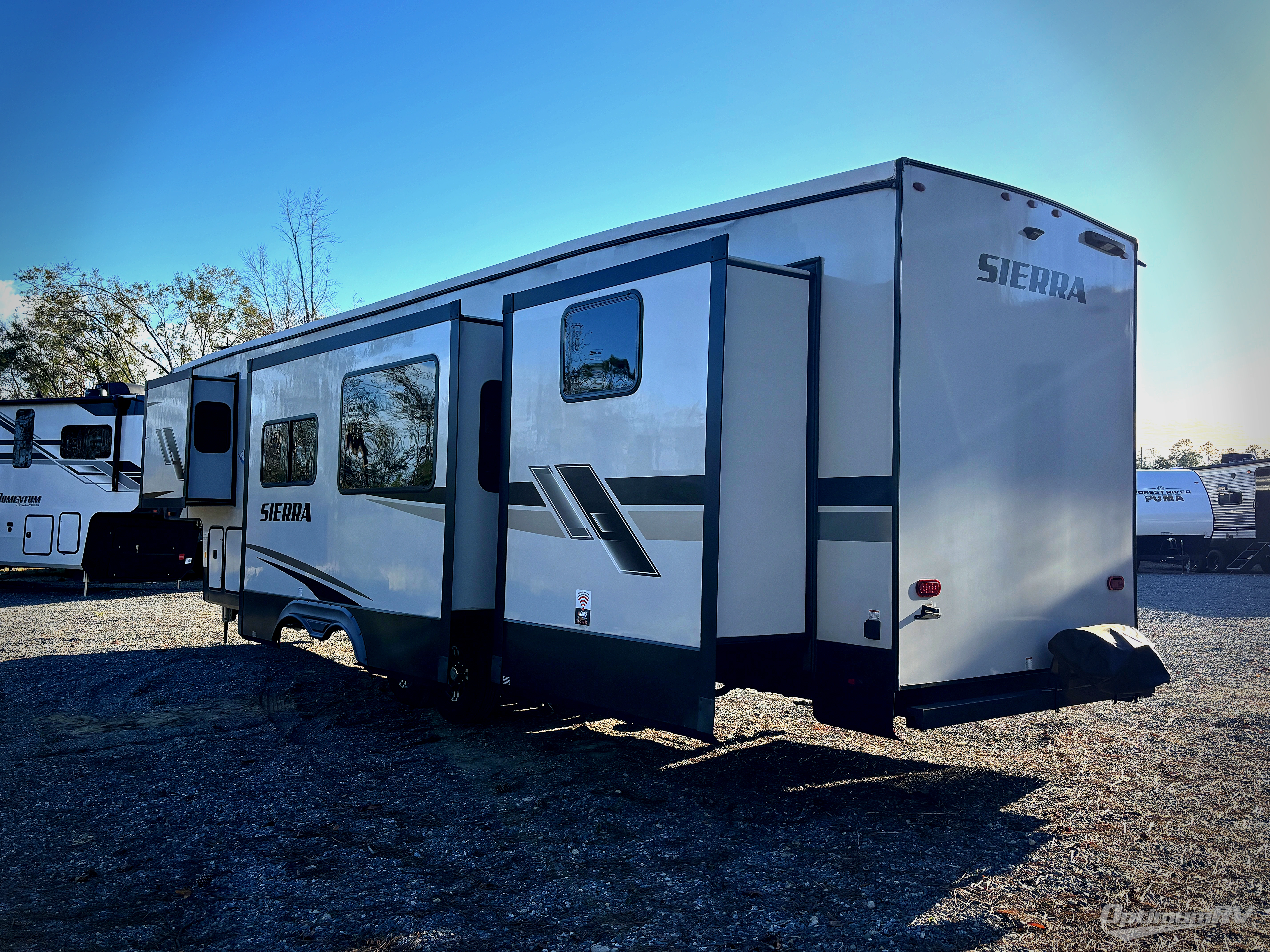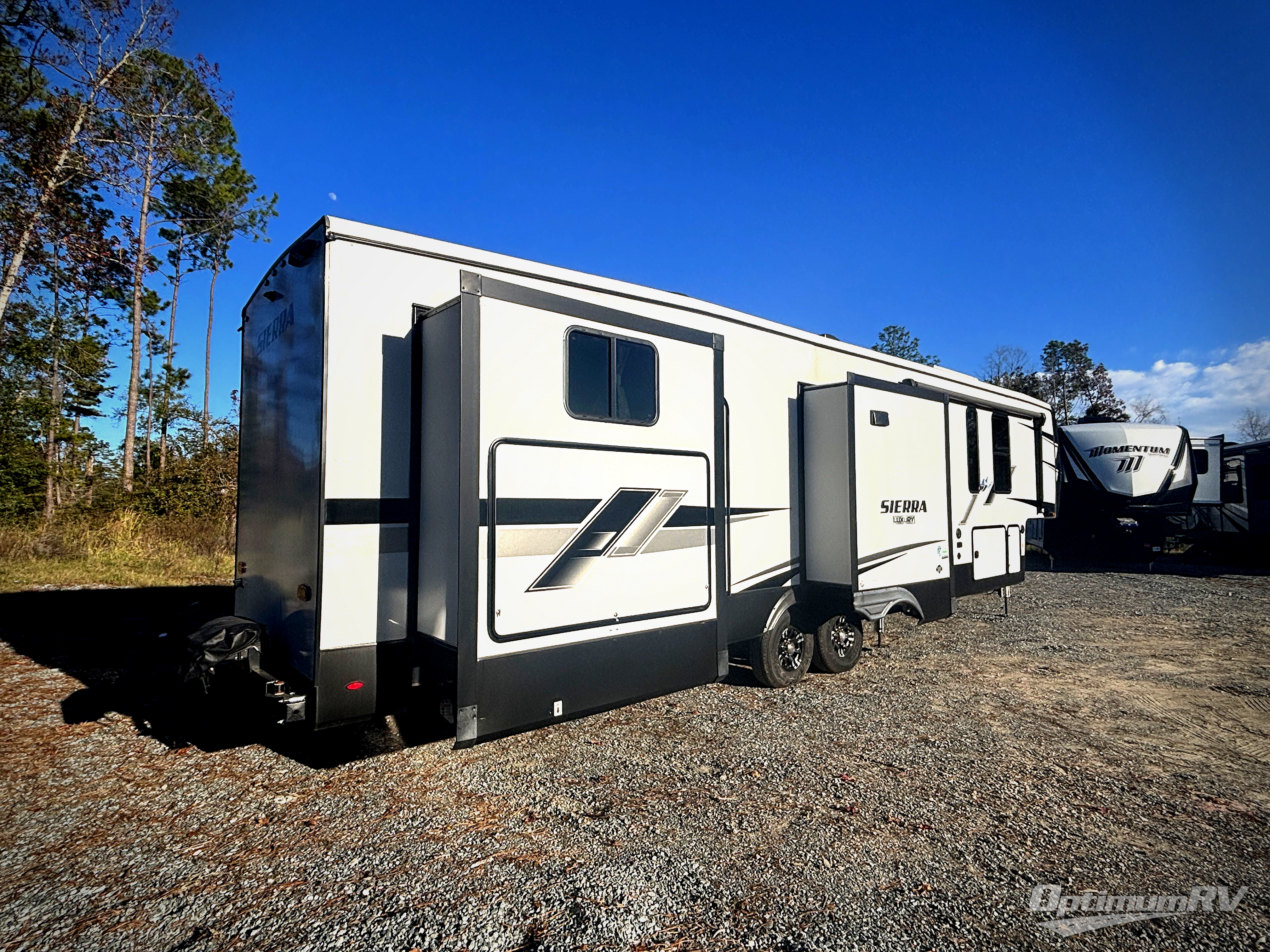 Are you looking to add a little glamour to your camping life? The Forest River Sierra Luxury fifth wheels are luxury units that bring all the fun. These models have an Underbelly Armor, a friction-hinge entry door, an exterior docking station, a high-gloss gel-coat fiberglass exterior, a six-point hydraulic leveling system, and high-efficiency radiant foil for the roof and floor. The interior is stylish and modern with its stainless steel appliances, decorative backsplash, rustic wood plank linoleum, handmade cabinetry, crown molding over the kitchen cabinets, and recessed residential lighting. There is a satellite and cable hookup as well as a King Wi-Fi extender system, and the premium sound bar with built-in flush-mounted DVD player will be great to have when you want to watch a movie.