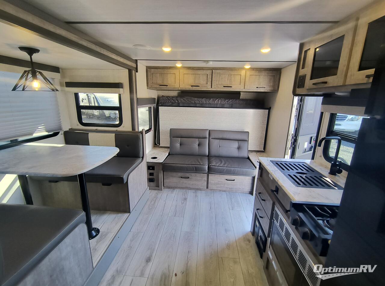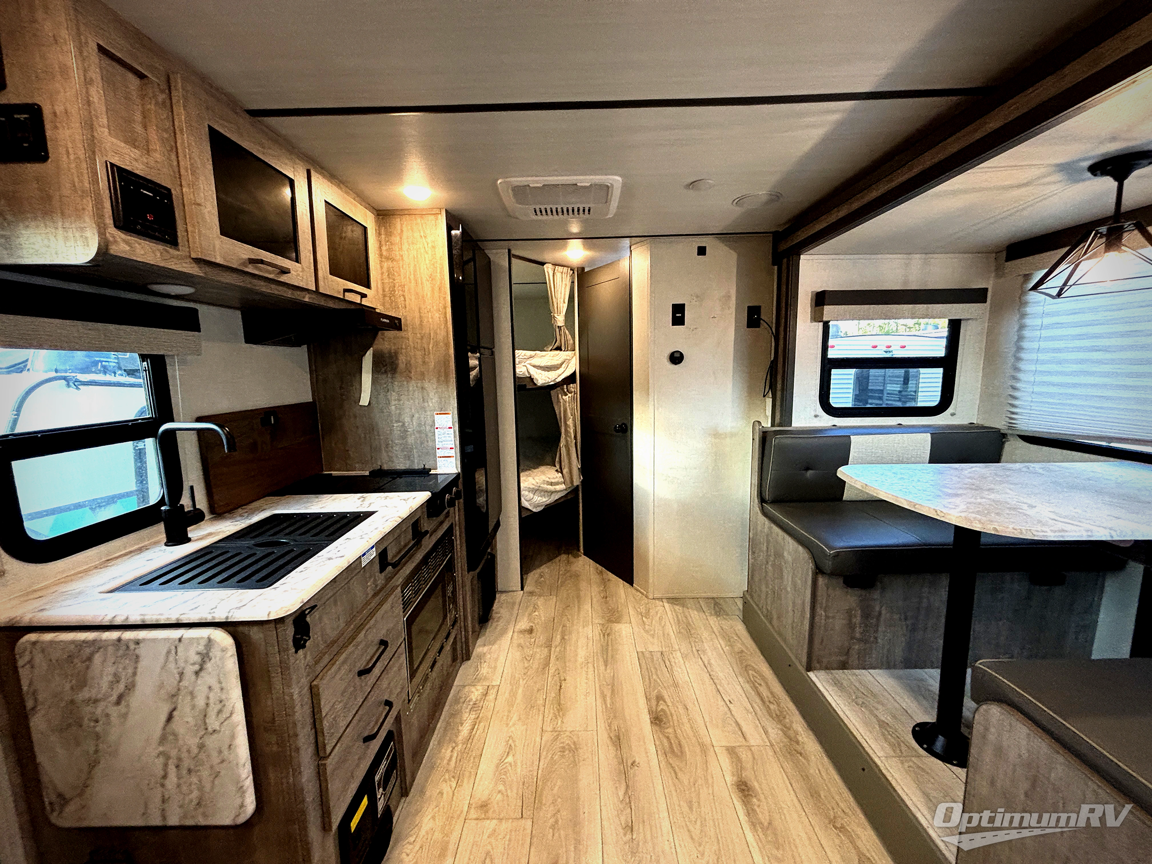 Experiencing the camping lifestyle just got easier with this travel trailer in tow! The outdoor kitchen includes a gas griddle, a sink and a refrigerator with a side shelf, plus there is a two burner cooktop inside if the weather isn't cooperating. There is a dinette slide where you can play a game of cards at, and the HD LED TV will allow you to keep up on your favorite shows. The kids or your guests can make themselves comfortable on the oversized bunks that include Teddy Bear bunk bedding for added comfort. This model also includes a front queen-size Murphy bed with two end tables to set your books or phone at, plus there is overhead storage for your valuables.