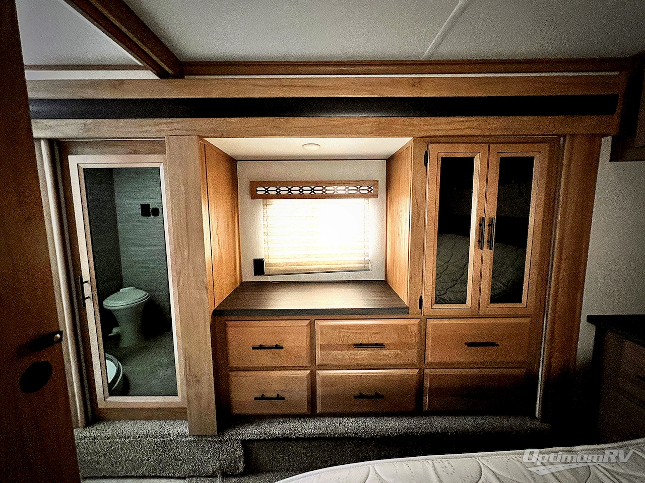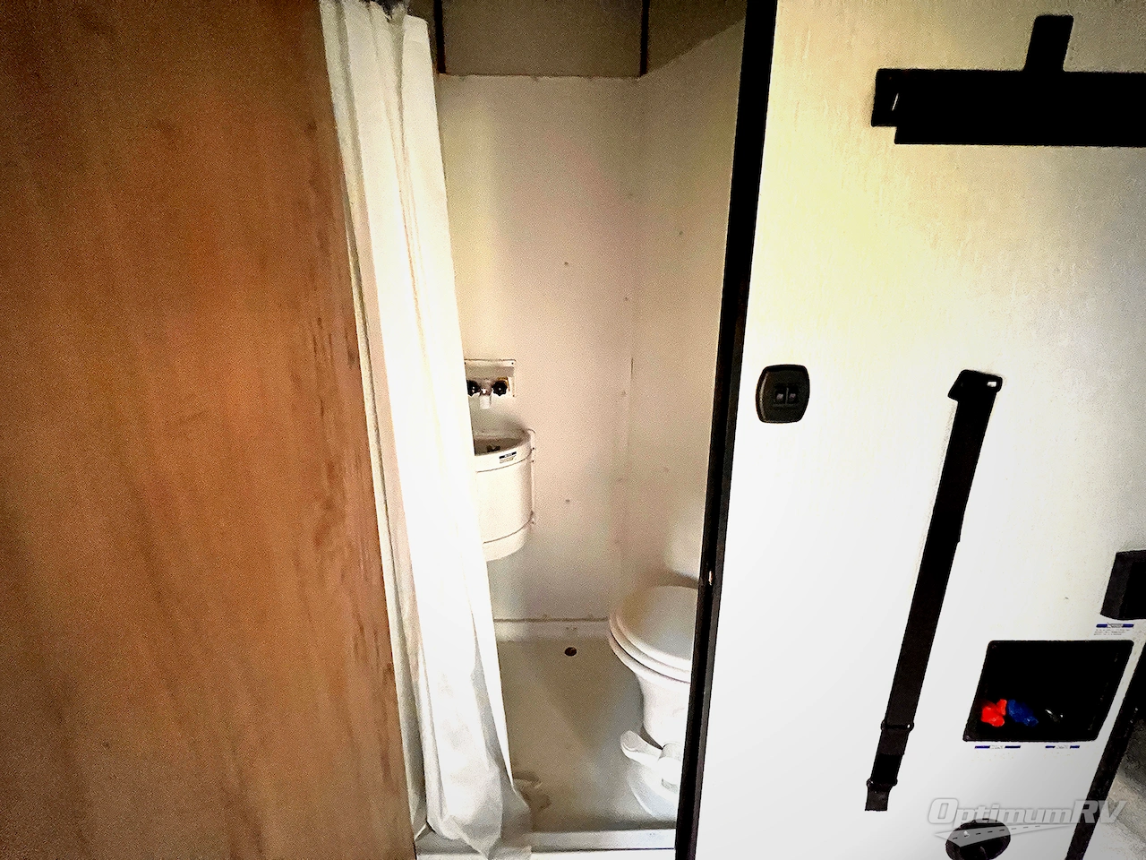 The 15' 6" garage area of this fifth wheel toy hauler has enough space for you to bring along your favorite off-road toys! The garage area also has opposing flip-up sofas with a table in between and a raised queen bed above, plus a loft, a half bathroom, and an area prepped for an optional washer and dryer. There is plenty of walking around space in the central combined living/kitchen area thanks to the large slide out sofa with recliners, as well as the refrigerator and three burner cooktop slide. The front dual entry bathroom has a radius shower for you to freshen up in each morning and an entrance into a private bedroom with king bed and lots of storage!