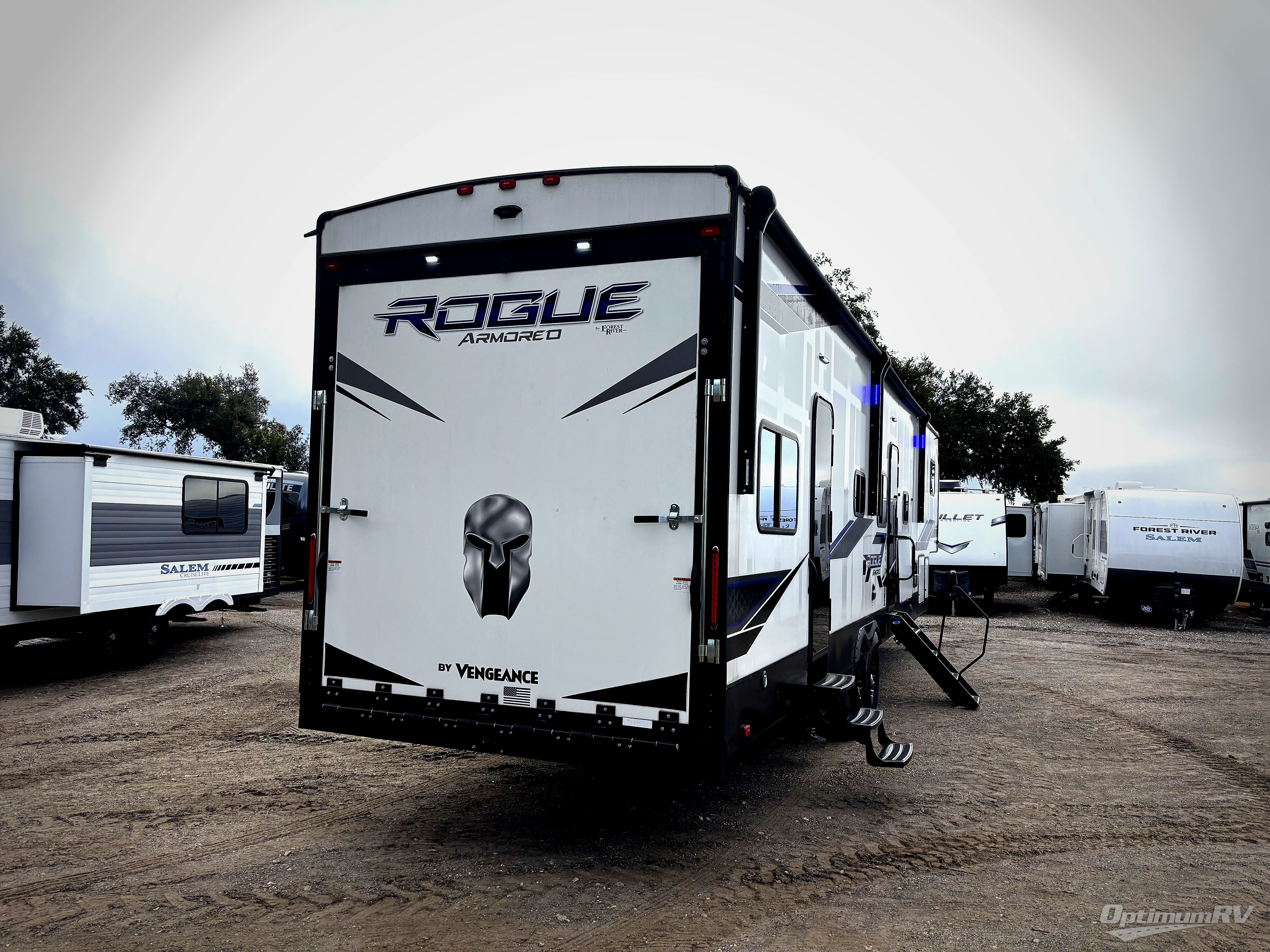 Every one of these Forest River Vengeance Rogue Armored fifth wheel toy haulers come with the features you want most at an affordable price tag! The DUR-A-POXY cargo floor has 5,000 lb. tie downs to ensure your toys will arrive safely without damaging the flooring, plus the 8' ramp door makes it easy to load them. A 15,000 BTU air conditioner will keep you cool even on the hottest summer days. An enclosed and heated underbelly keeps your unit's vitals protected and a central docking station makes life a little easier. The Rogue Armored package comes with a six point leveling system, a comfort plus adjustable powered king bed system, and a ramp door patio system. You can be sure to find one that fits your needs!