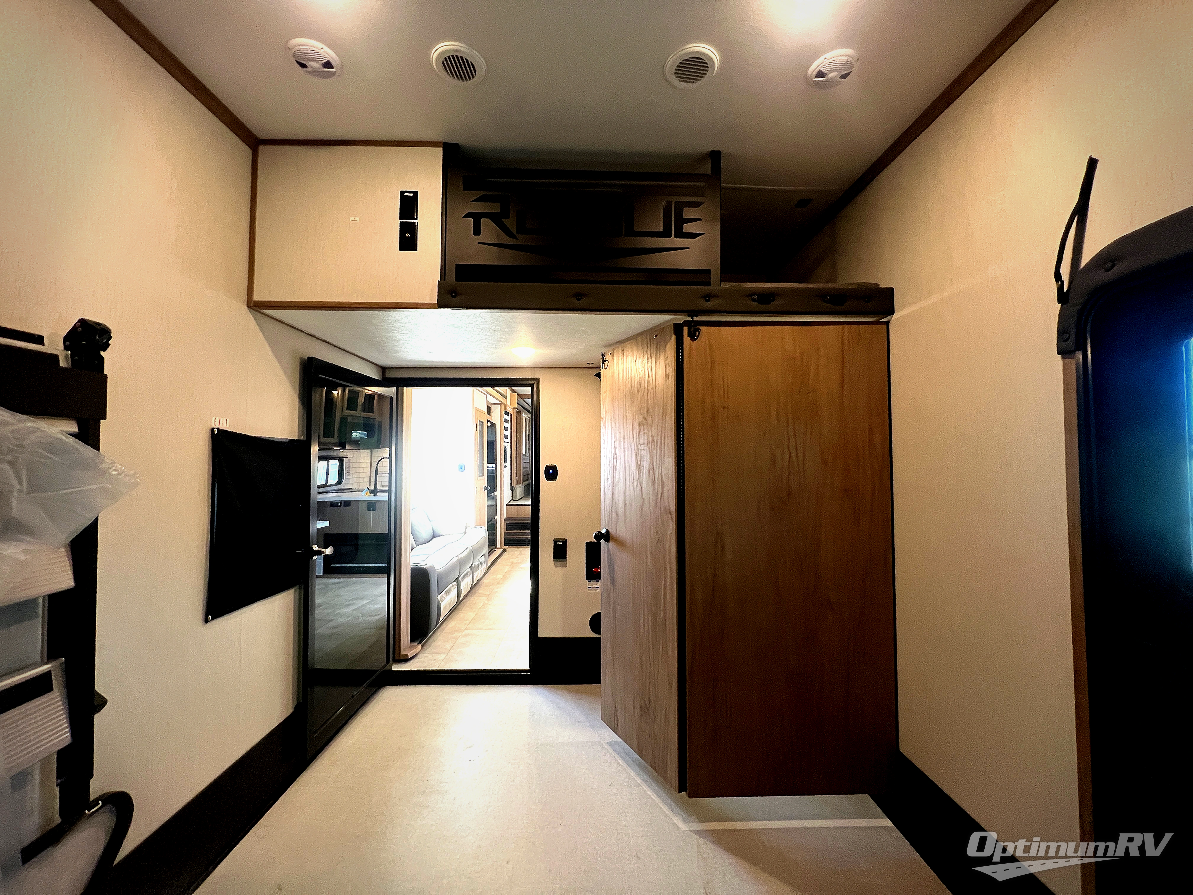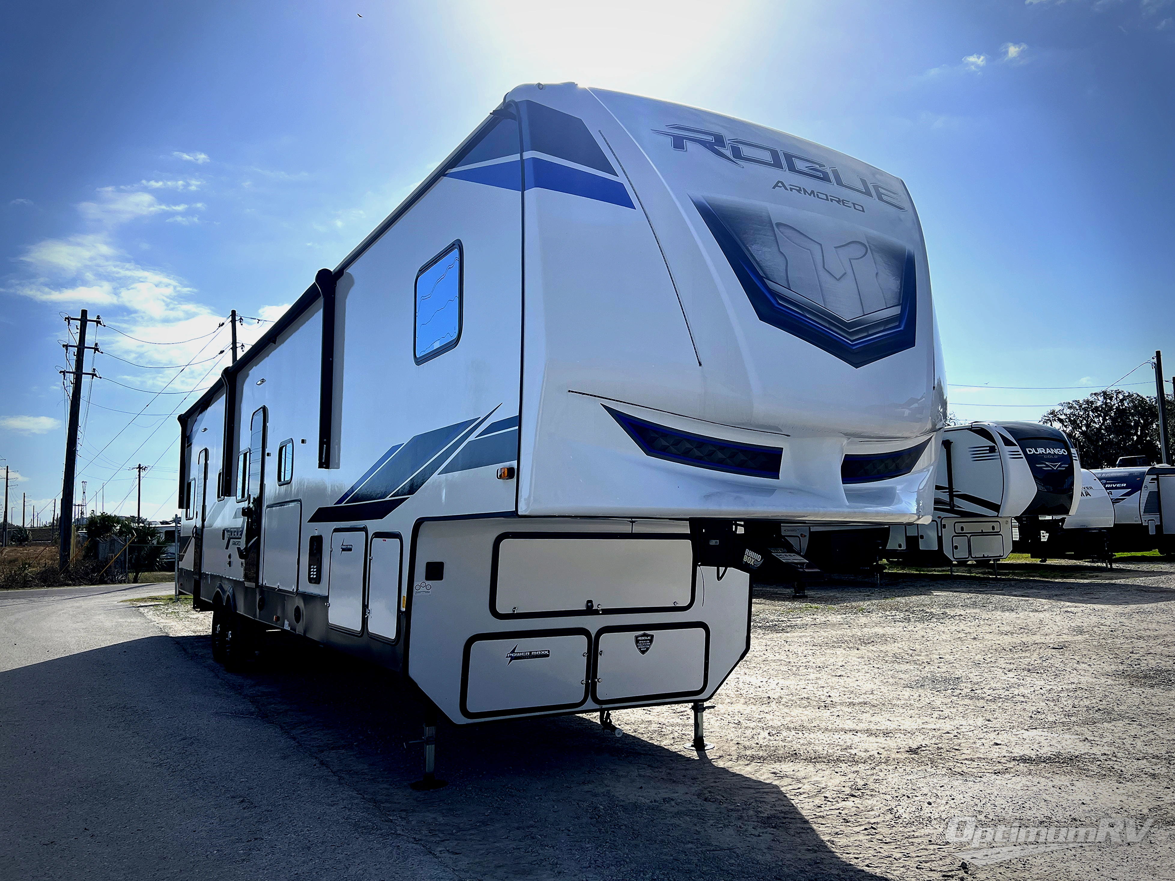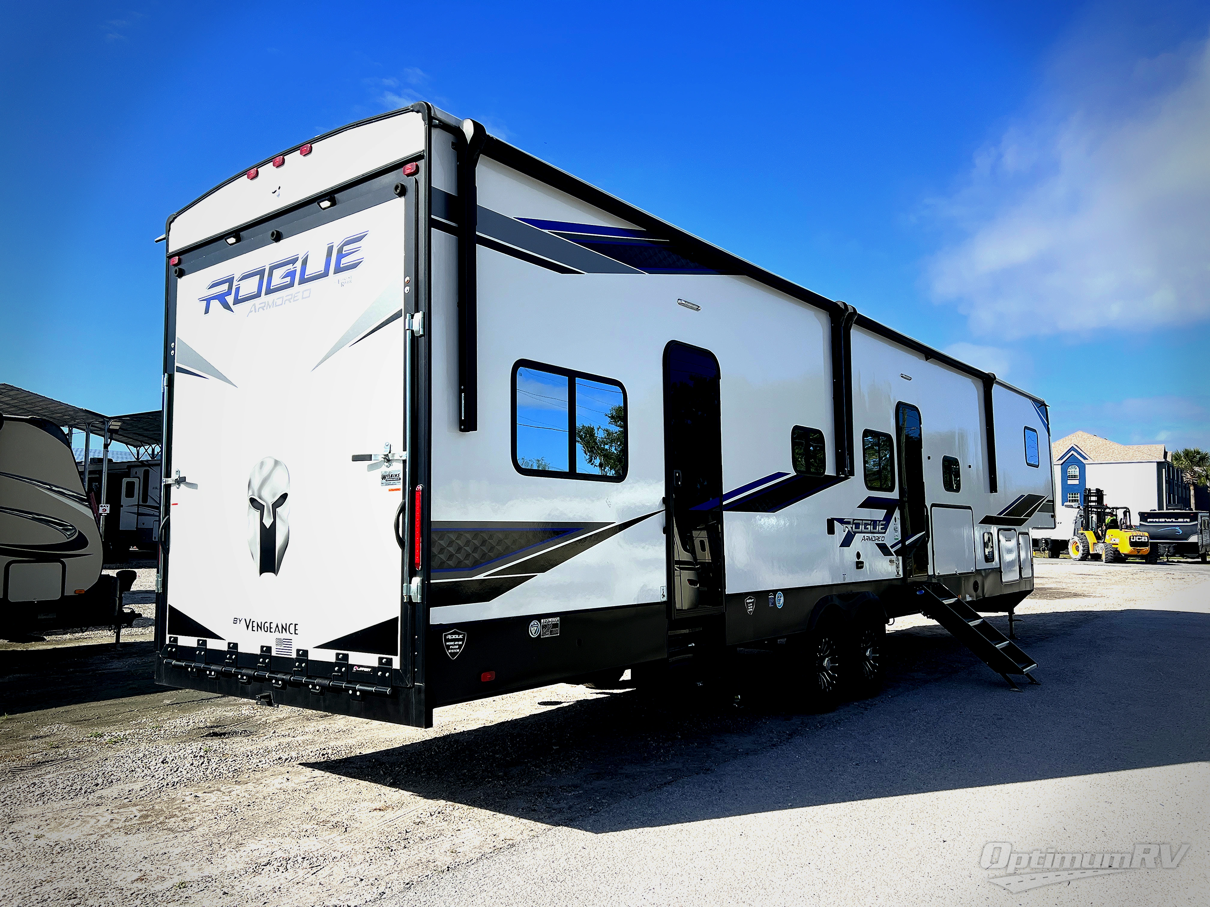 Every one of these Forest River Vengeance Rogue Armored fifth wheel toy haulers come with the features you want most at an affordable price tag! The DUR-A-POXY cargo floor has 5,000 lb. tie downs to ensure your toys will arrive safely without damaging the flooring, plus the 8' ramp door makes it easy to load them. A 15,000 BTU air conditioner will keep you cool even on the hottest summer days. An enclosed and heated underbelly keeps your unit's vitals protected and a central docking station makes life a little easier. The Rogue Armored package comes with a six point leveling system, a comfort plus adjustable powered king bed system, and a ramp door patio system. You can be sure to find one that fits your needs!