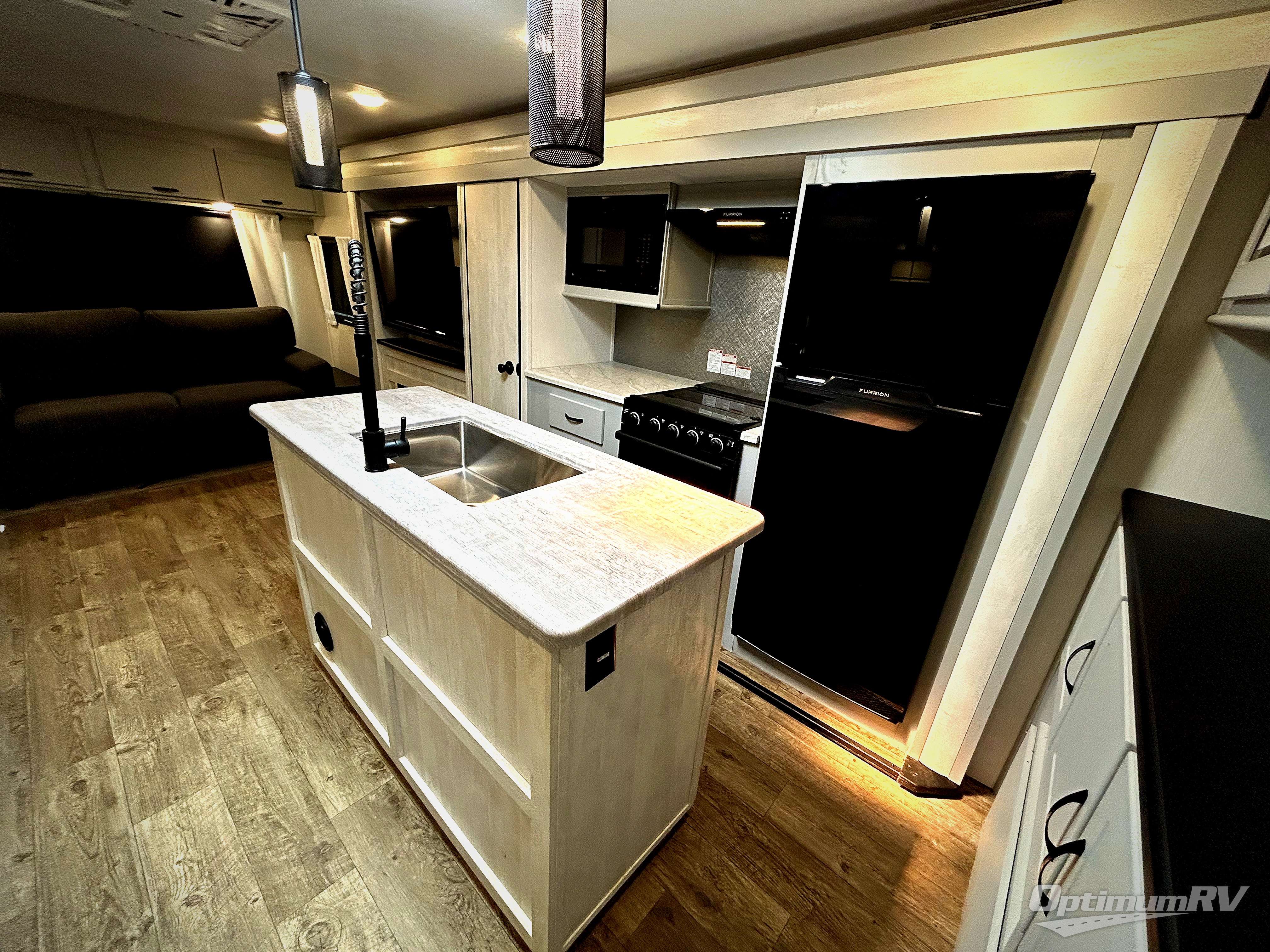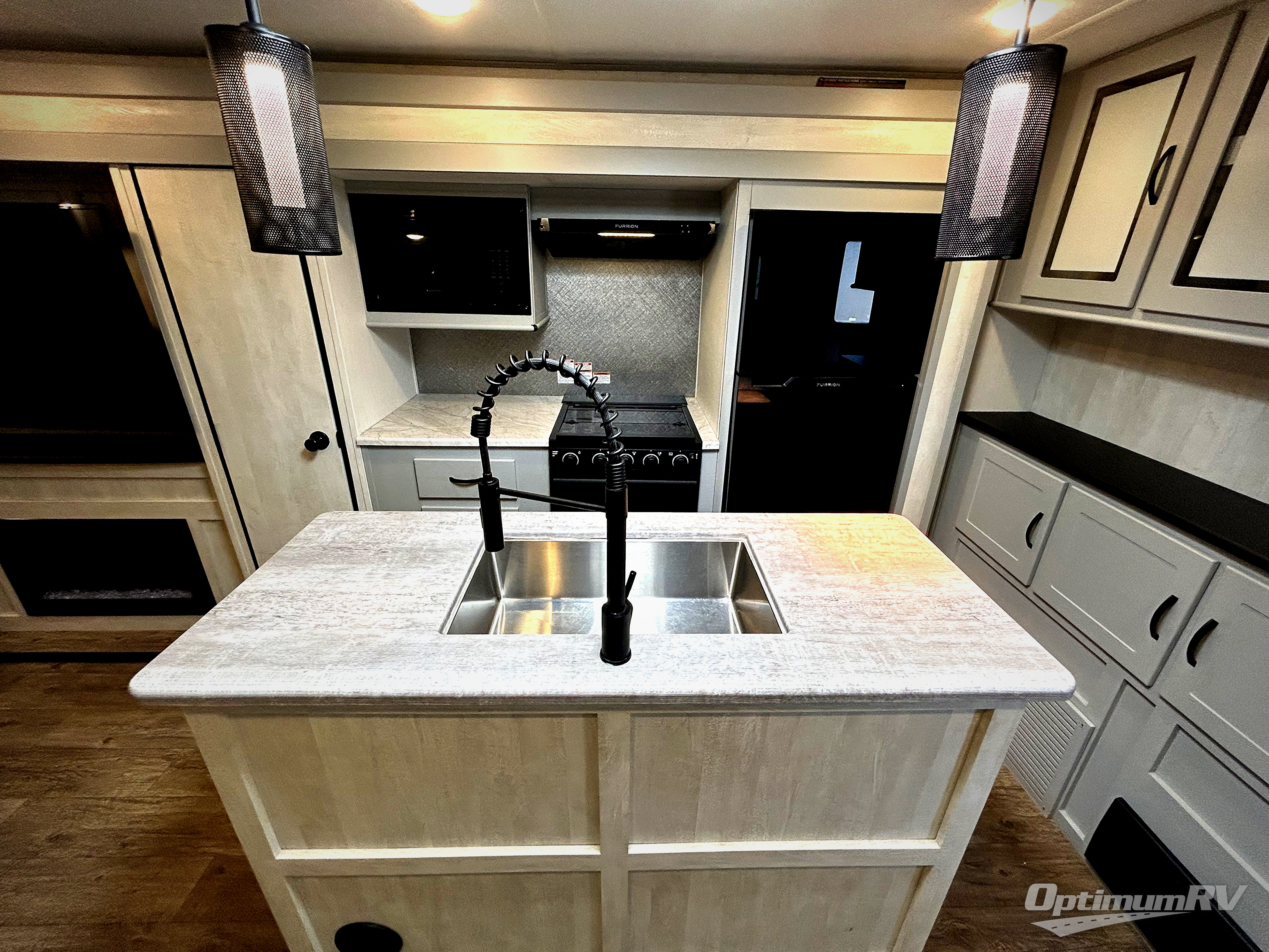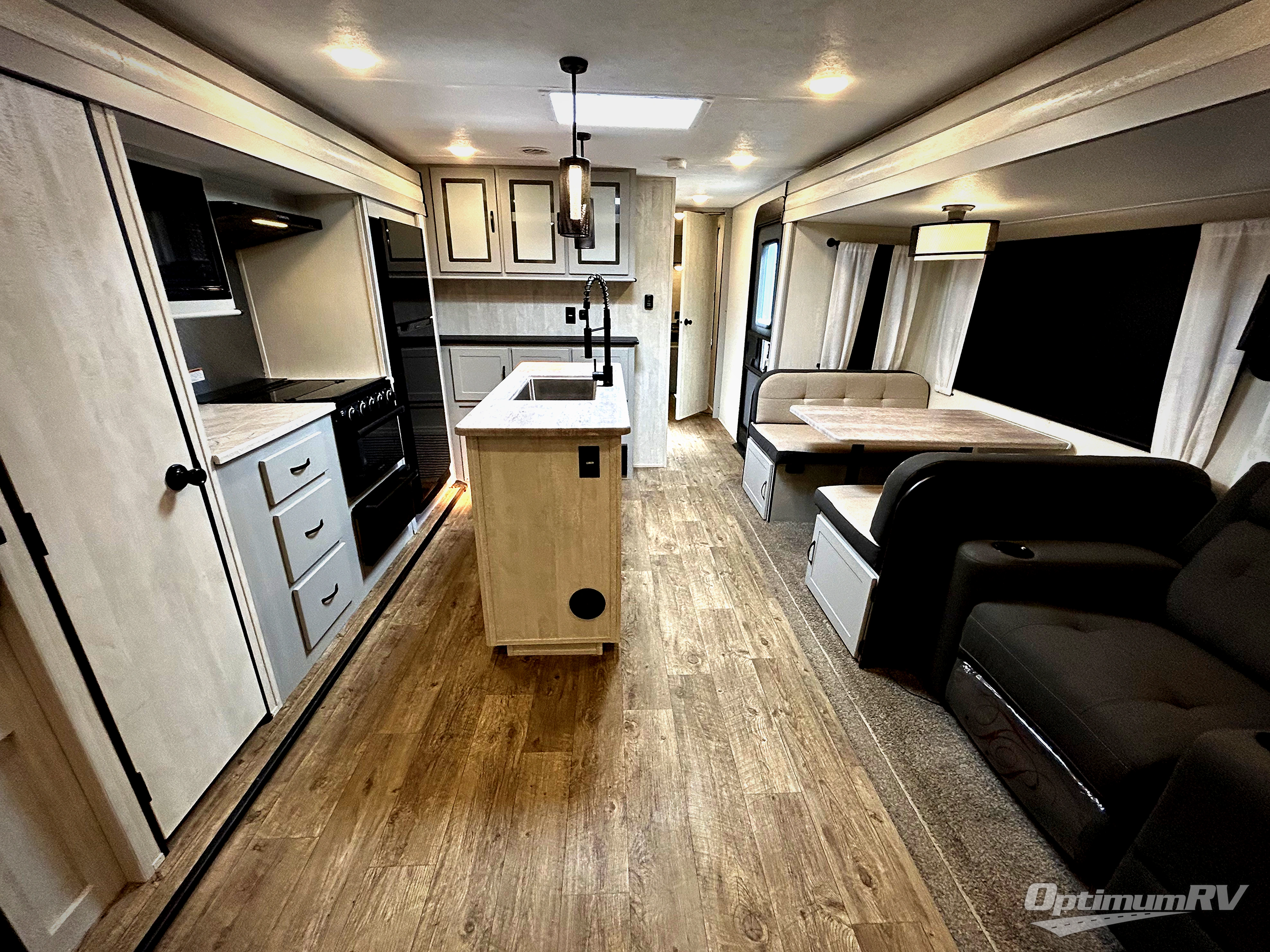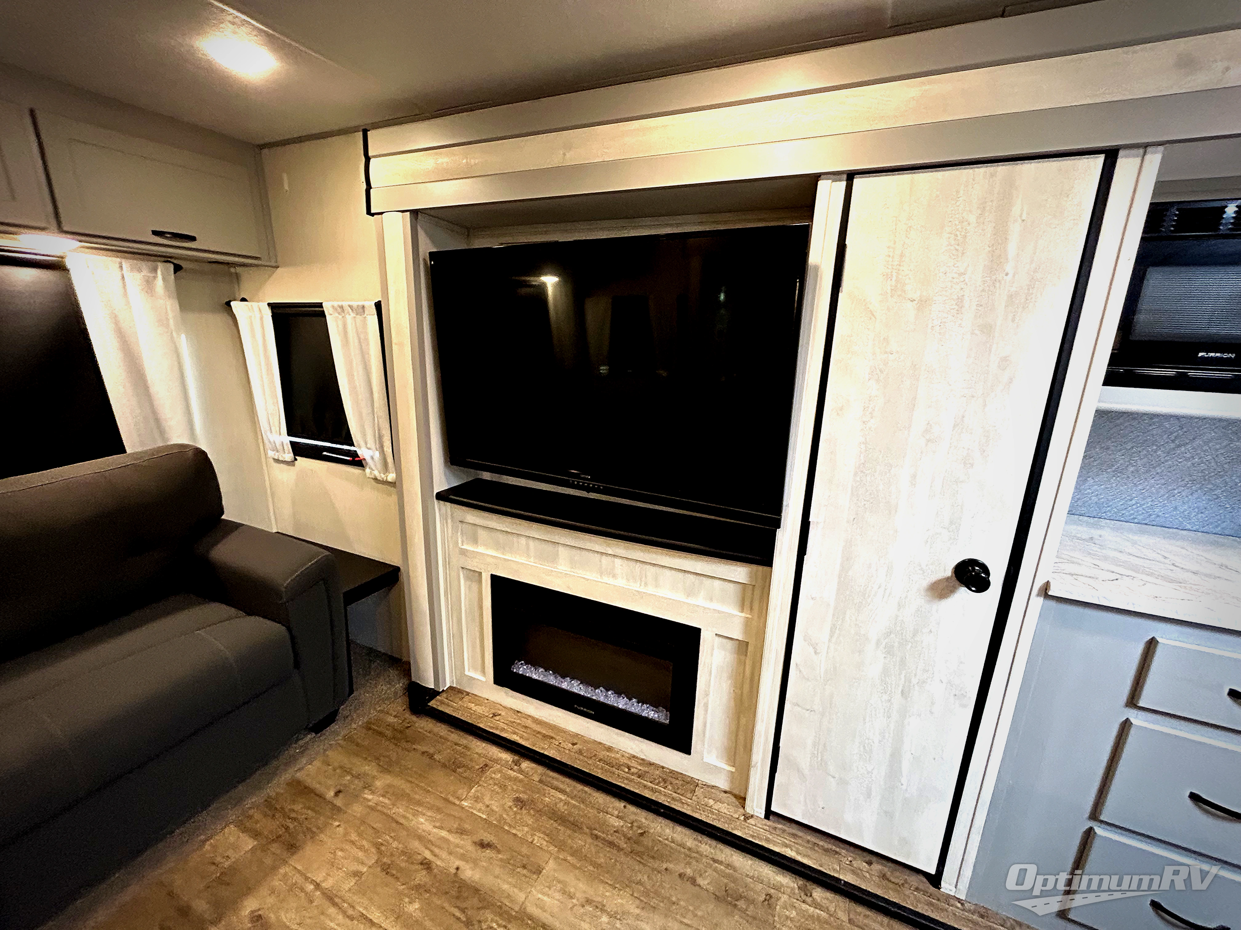 This travel trailer allows you to enjoy the Great Outdoors without having to give up your creature comforts. The dual opposing slides provide the chef space to work around the kitchen island, and there is plenty of seating space for your guests on the dual recliners, the sleeper sofa, and the booth dinette. The fireplace and LCD TV will be perfect for those rainy days, and there is even a living area skylight to let natural light in. This model also includes Sure-Step entry steps, a large pass-through storage, plus two power awnings with LED lights so you can spend more time outdoors with friends and family!