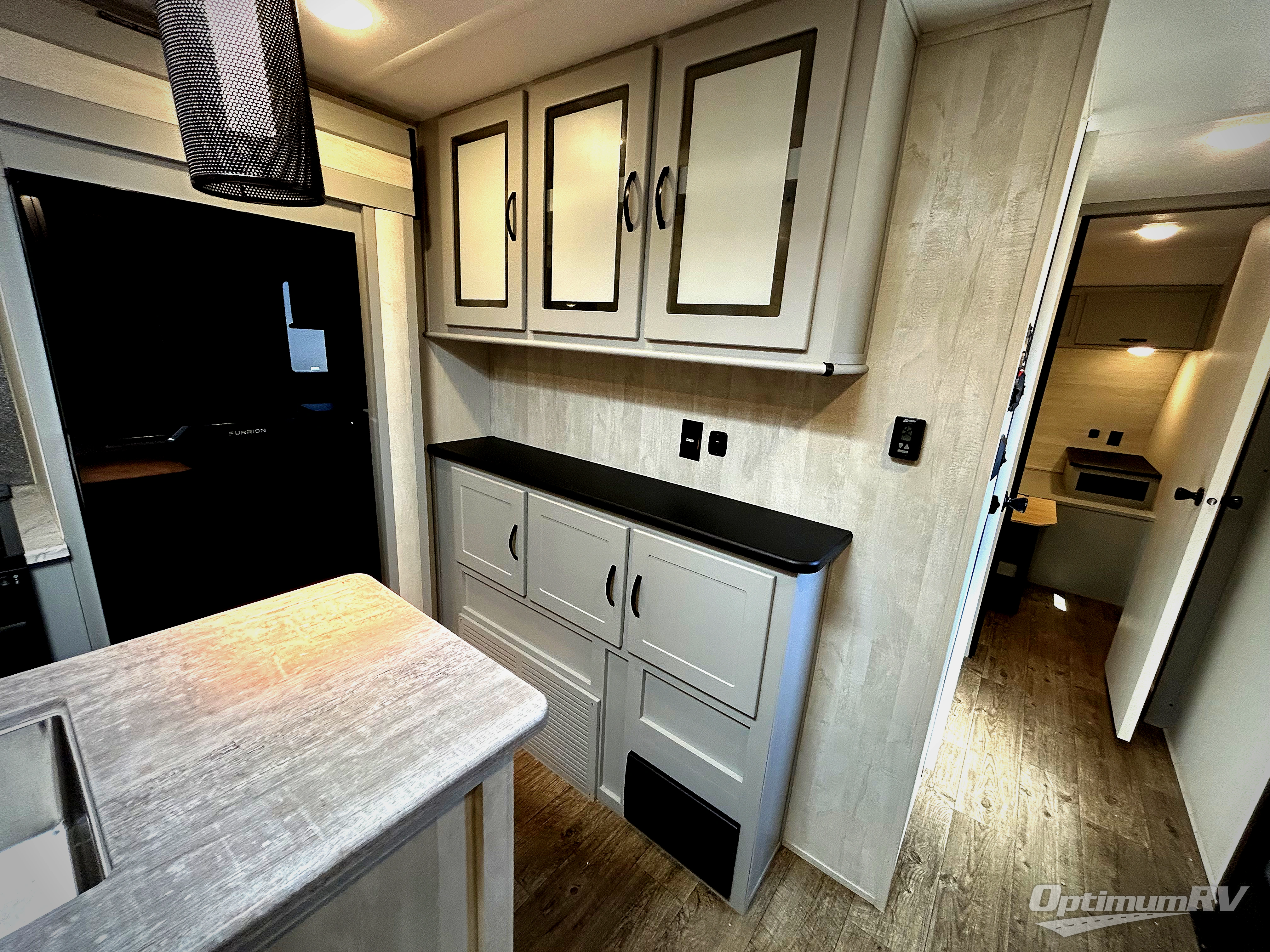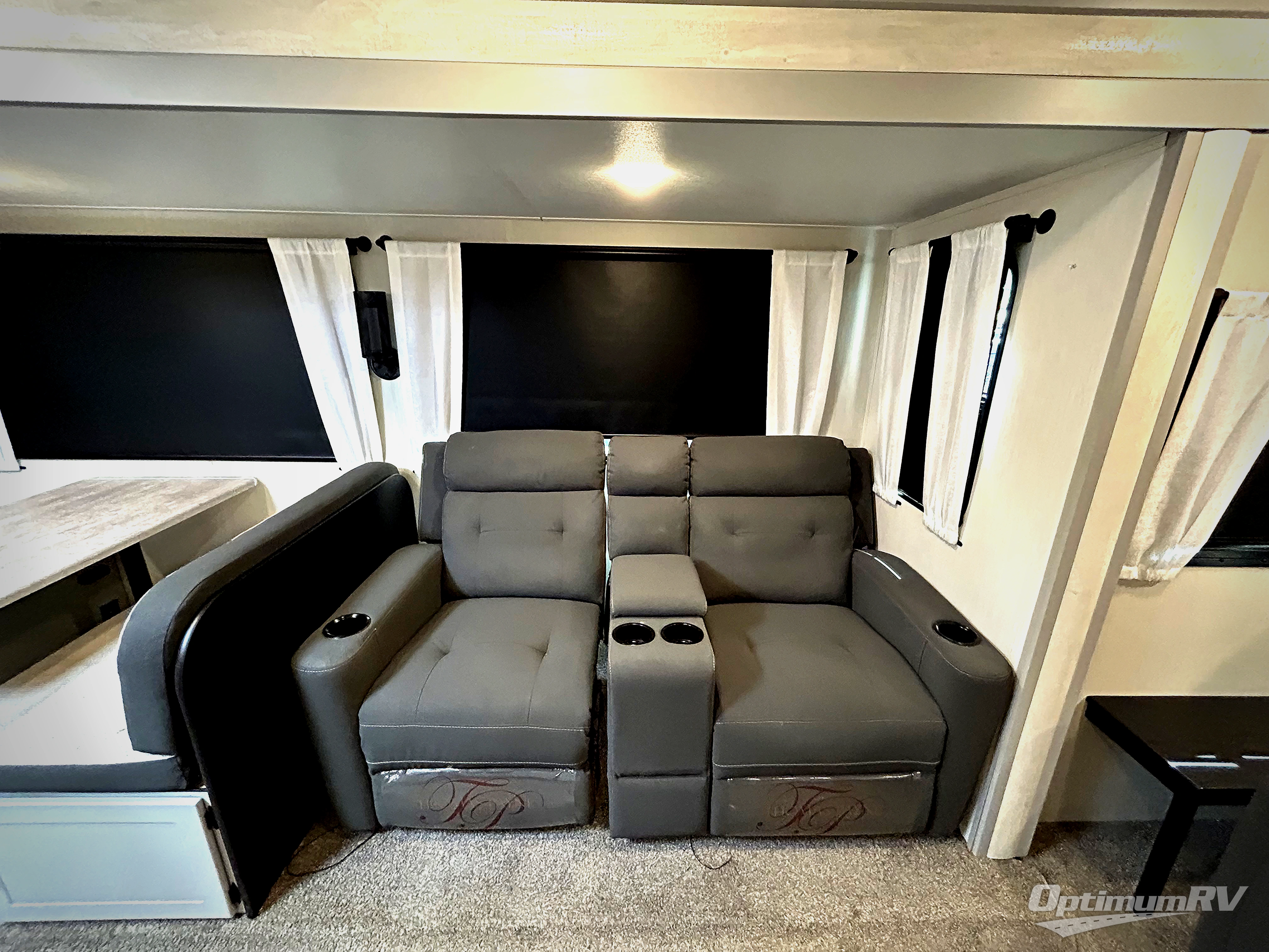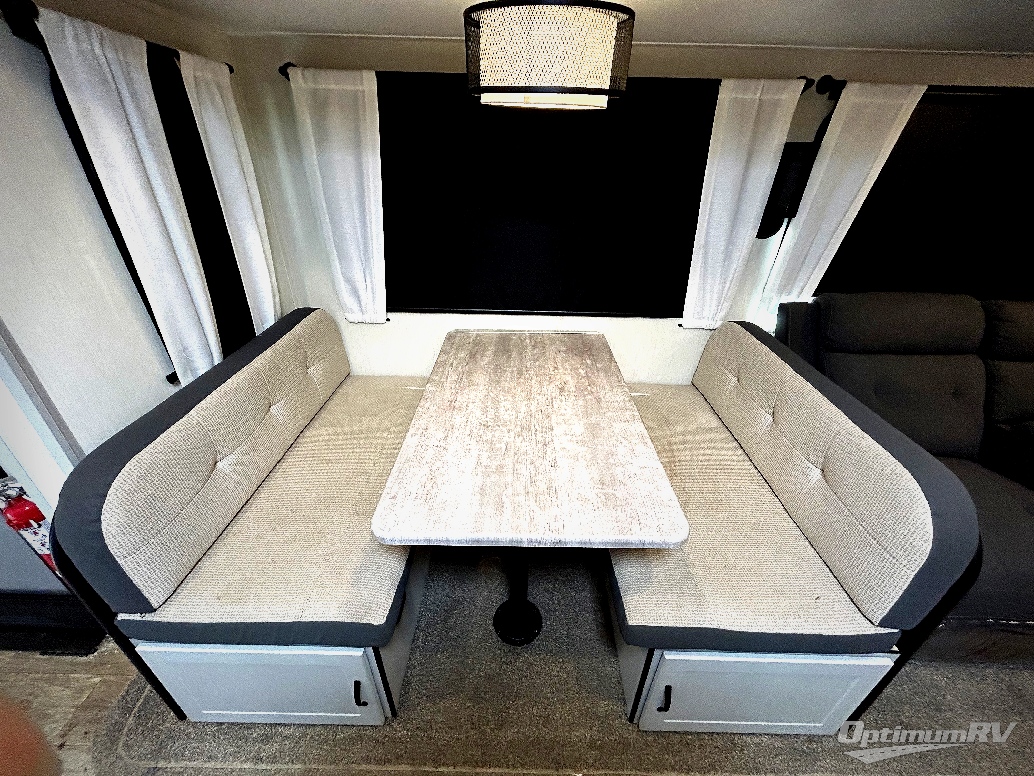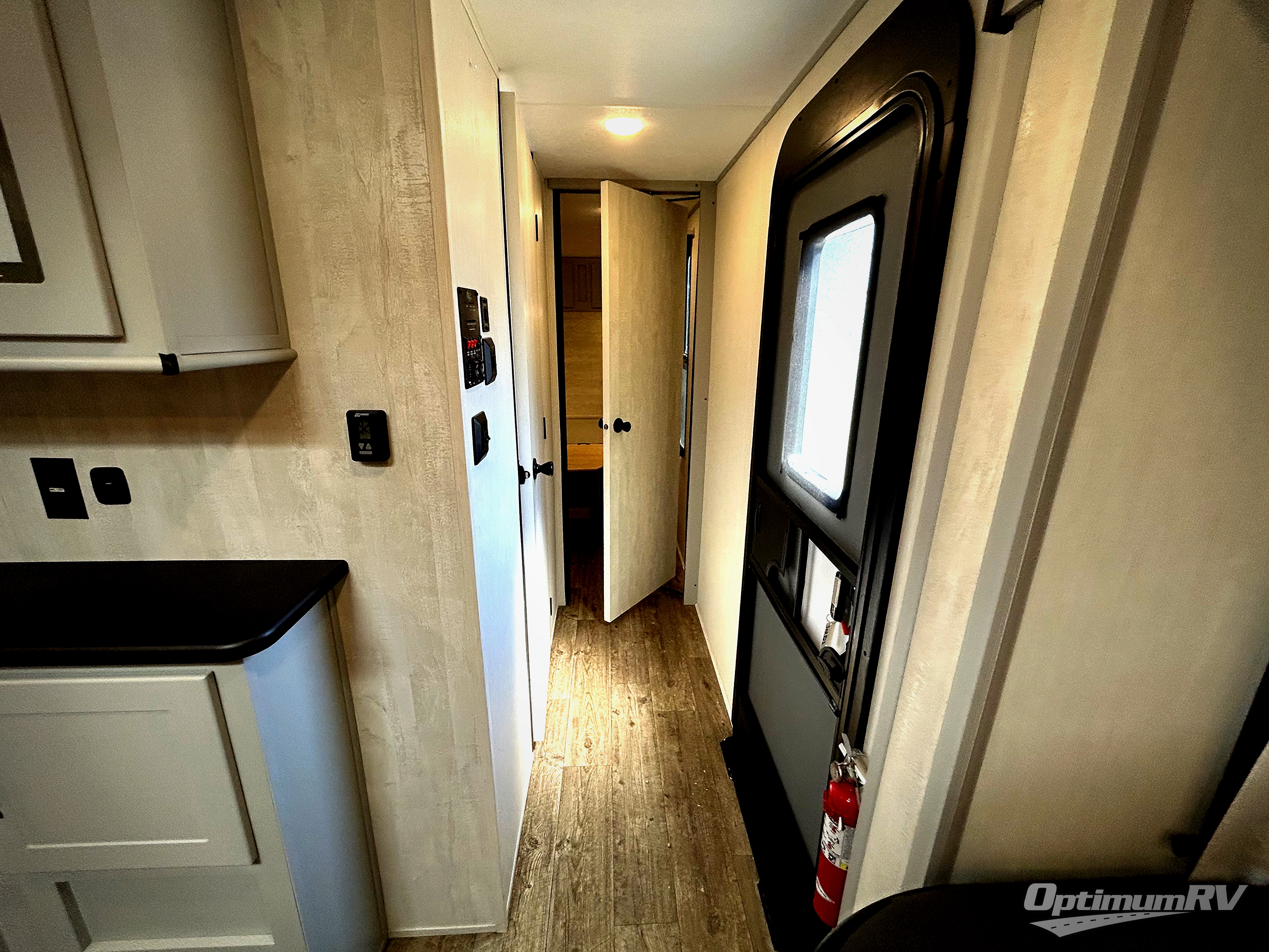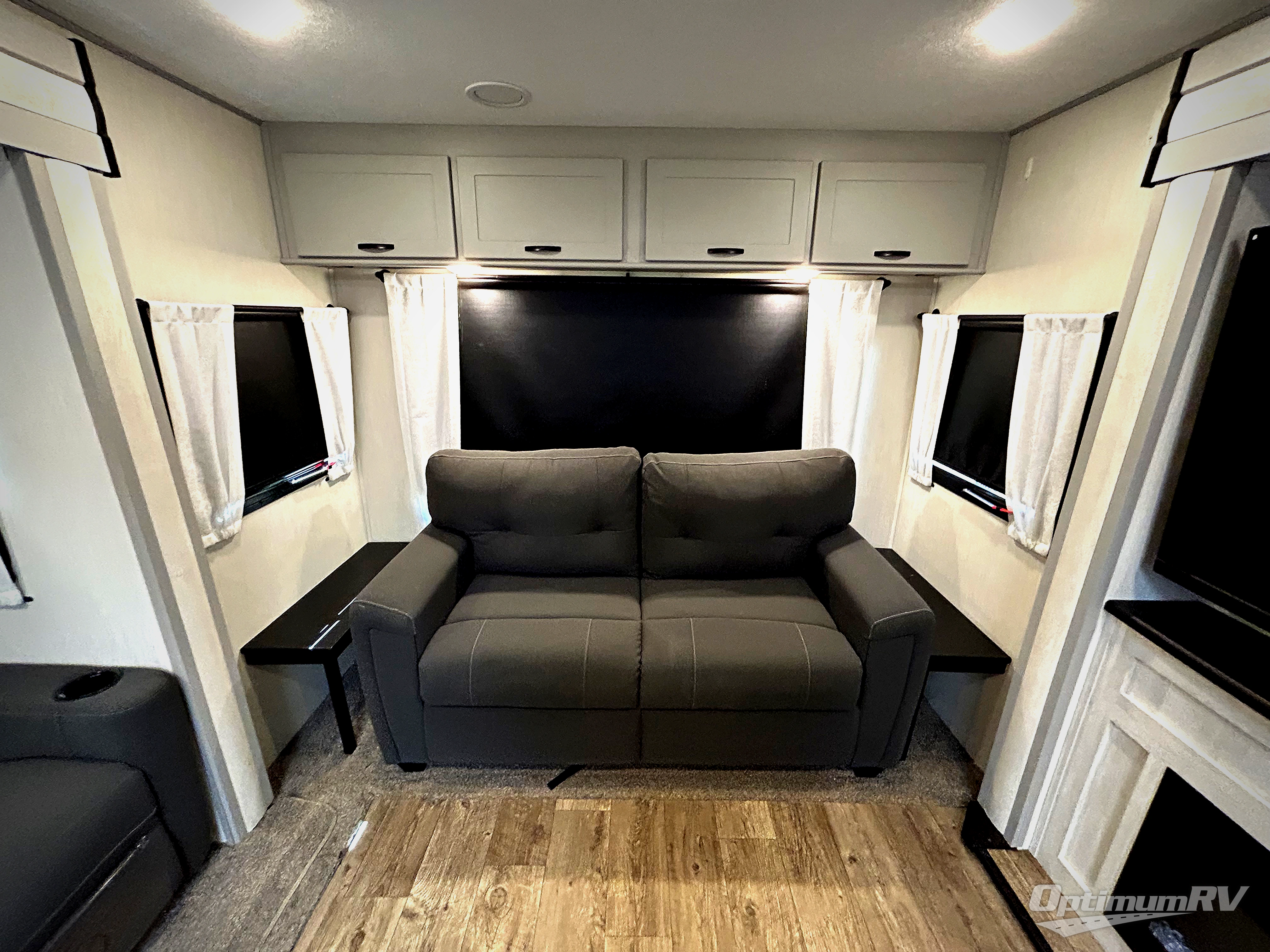 This travel trailer allows you to enjoy the Great Outdoors without having to give up your creature comforts. The dual opposing slides provide the chef space to work around the kitchen island, and there is plenty of seating space for your guests on the dual recliners, the sleeper sofa, and the booth dinette. The fireplace and LCD TV will be perfect for those rainy days, and there is even a living area skylight to let natural light in. This model also includes Sure-Step entry steps, a large pass-through storage, plus two power awnings with LED lights so you can spend more time outdoors with friends and family!