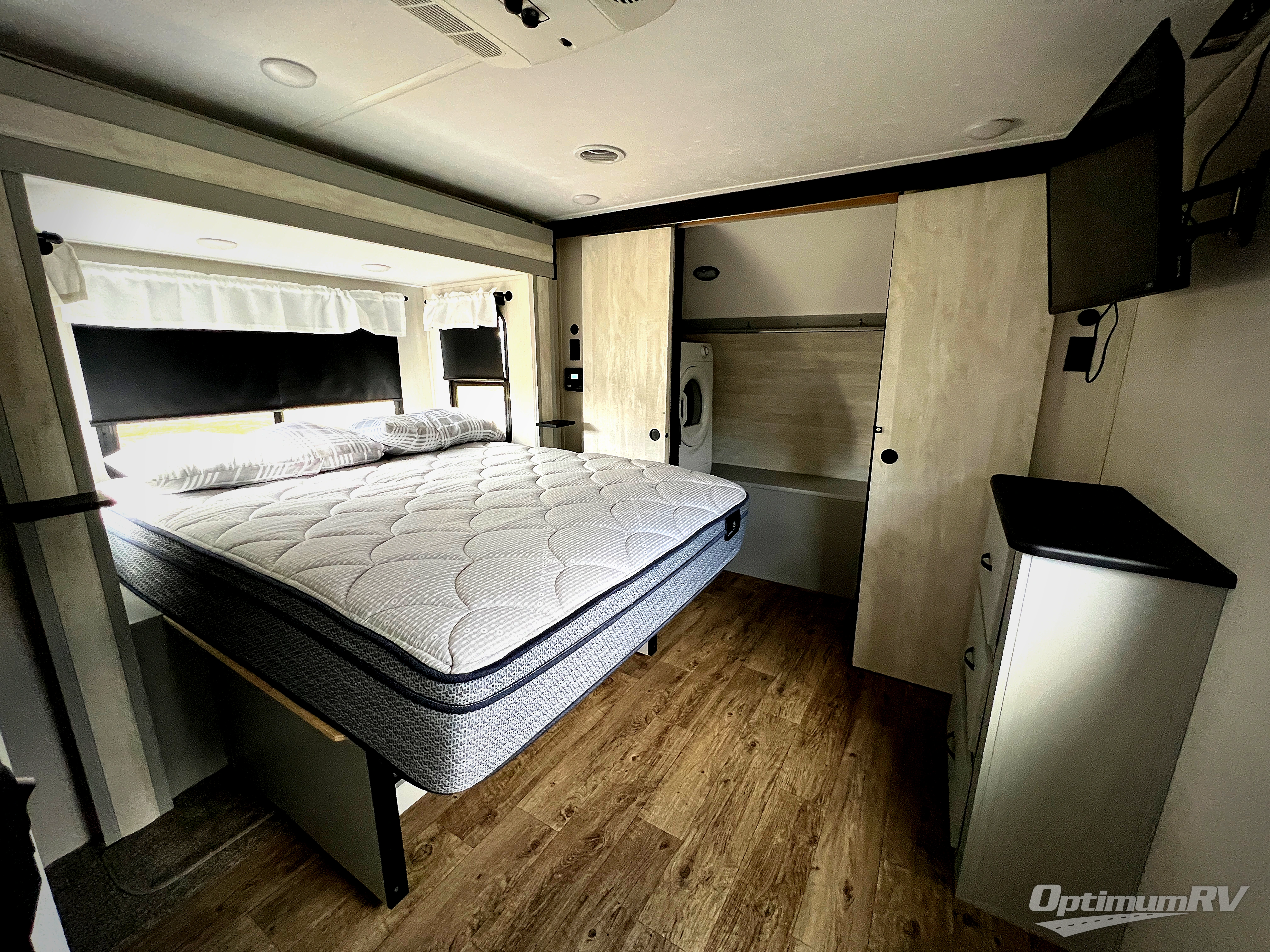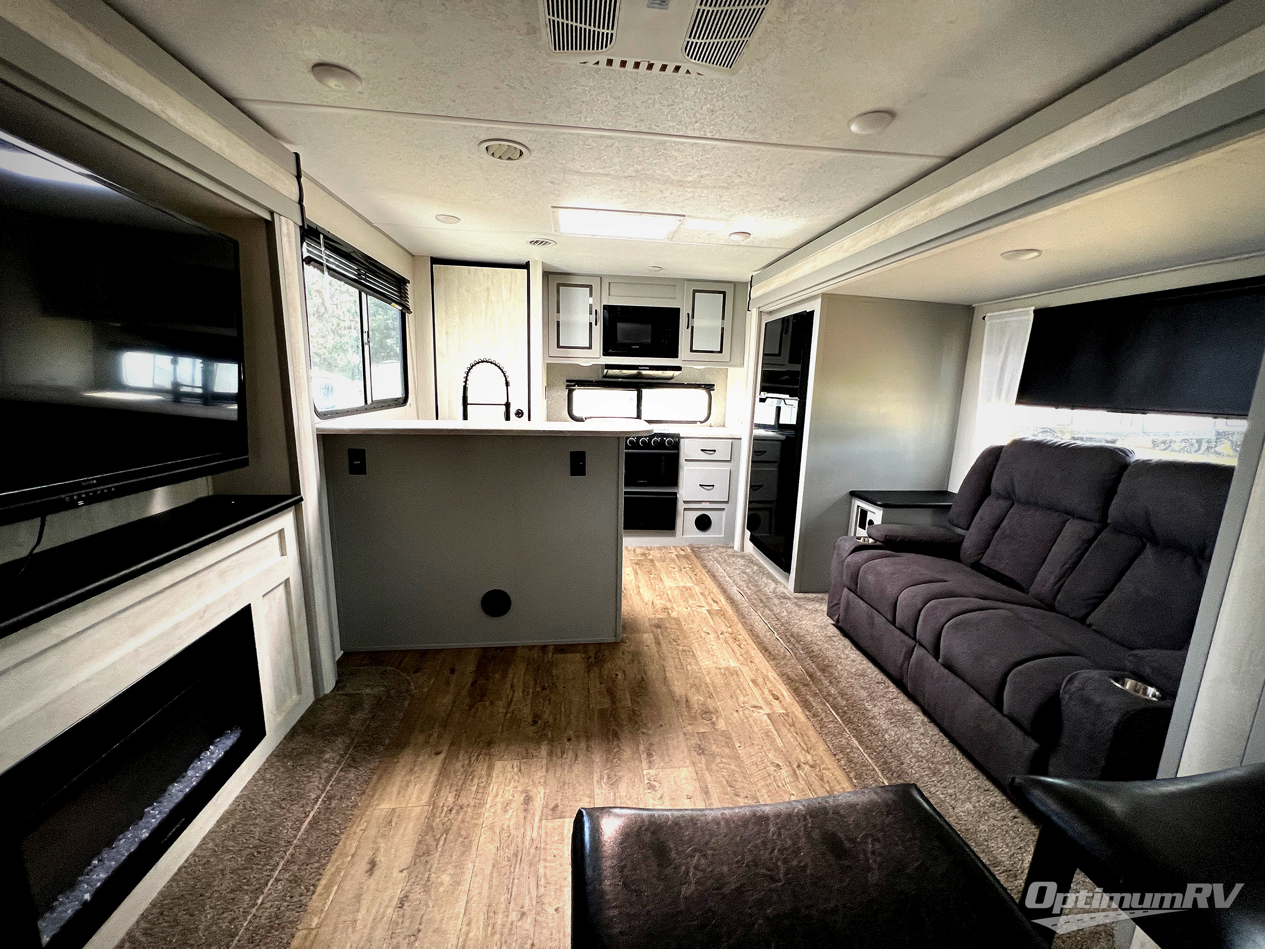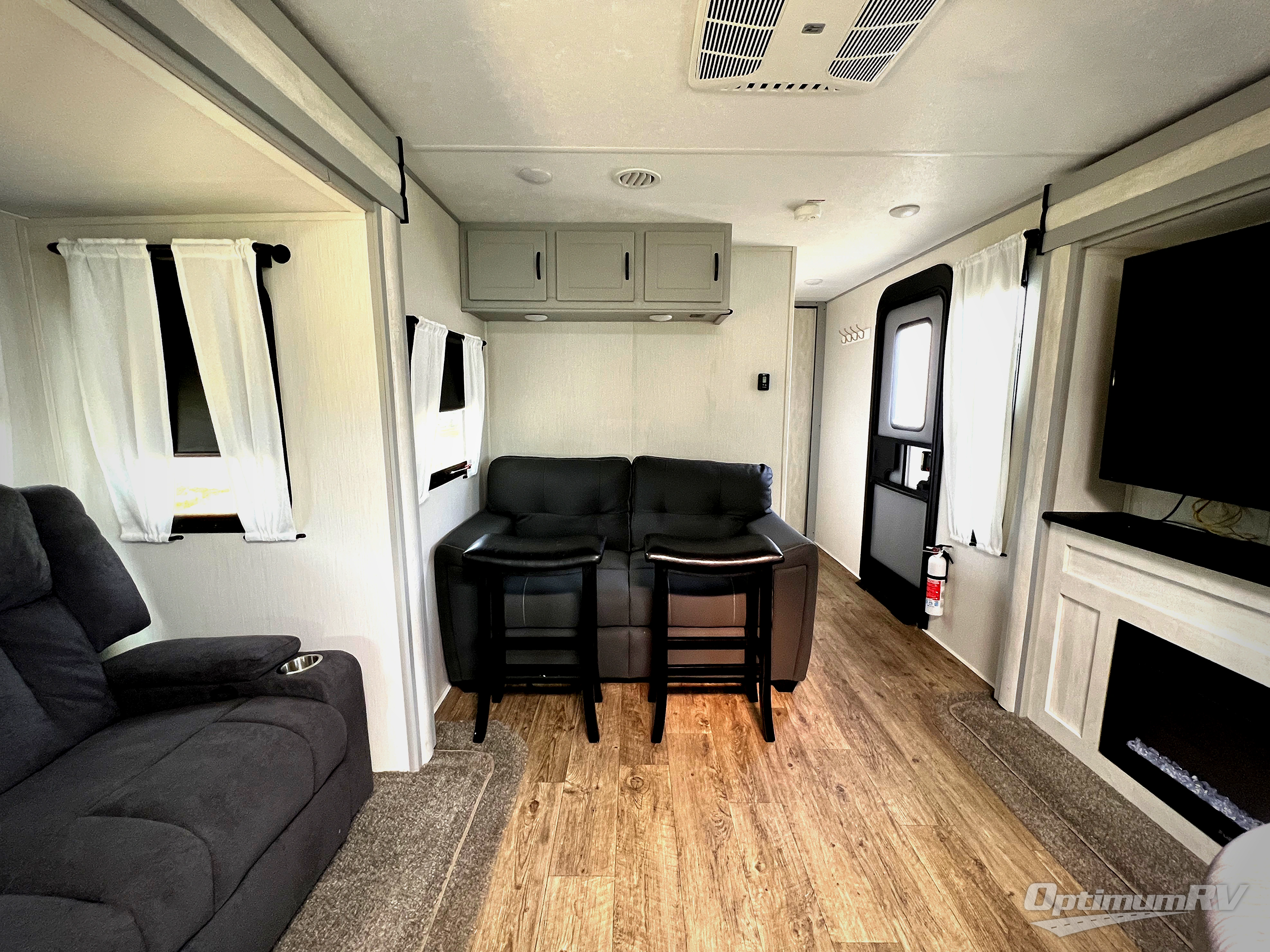 There is no going back to your tent-camping days after touring this travel trailer. The rear kitchen is any chef's dream with its walk-in pantry, residential refrigerator, plus a bar with stools where the kids can enjoy coloring. You will find comfortable seating space on the dual chairs and tri-fold sofa, and the fireplace and 50" TV with storage will feel just like home. The full bath will allow everyone space to clean up each day, and the front private bedroom will be your own oasis away from it all. Here, you will enjoy a slide out queen bed, a dresser where you can add a TV if you choose, plus a front walk-in closet so you can bring along all your favorite outfits!