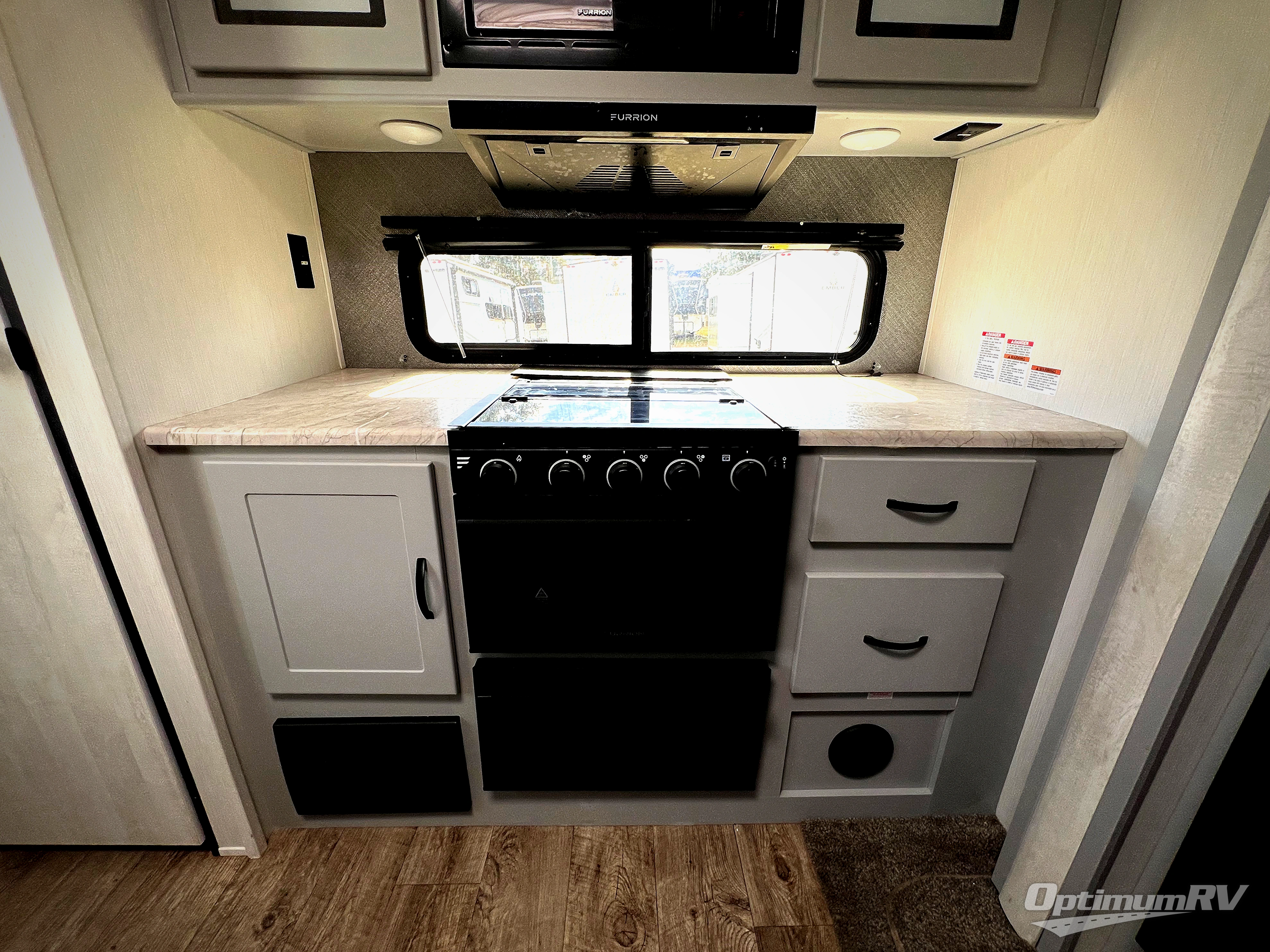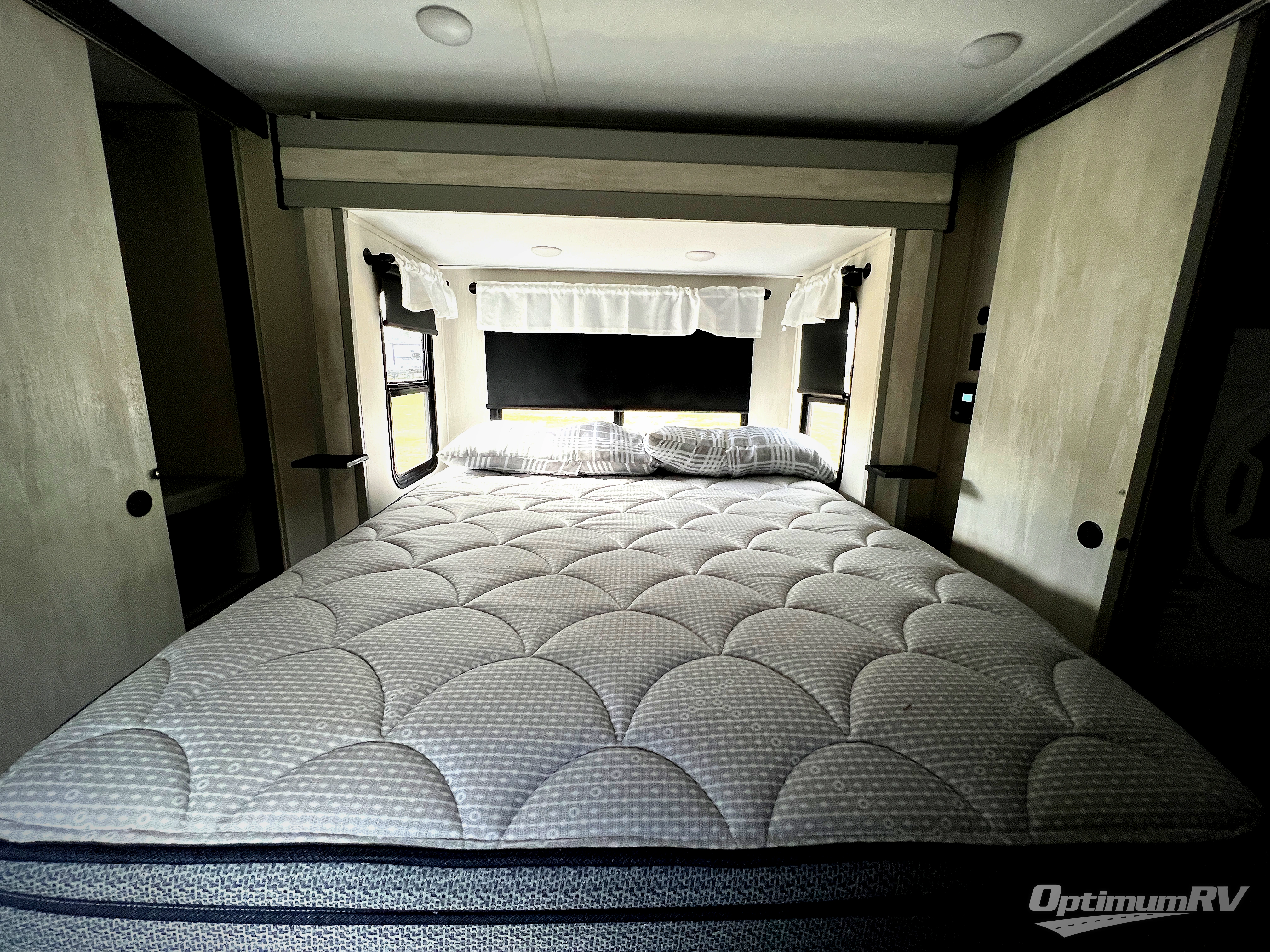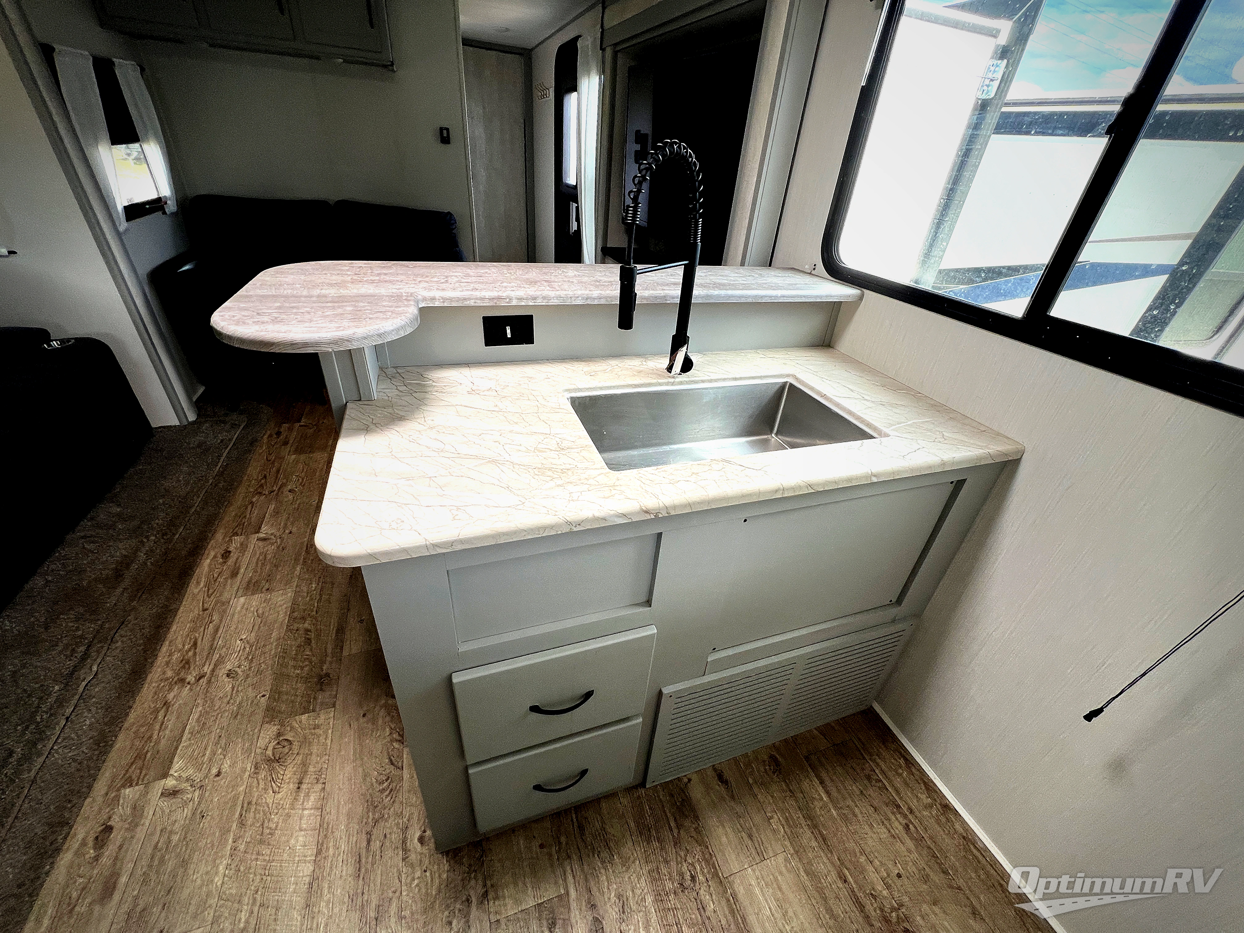 There is no going back to your tent-camping days after touring this travel trailer. The rear kitchen is any chef's dream with its walk-in pantry, residential refrigerator, plus a bar with stools where the kids can enjoy coloring. You will find comfortable seating space on the dual chairs and tri-fold sofa, and the fireplace and 50" TV with storage will feel just like home. The full bath will allow everyone space to clean up each day, and the front private bedroom will be your own oasis away from it all. Here, you will enjoy a slide out queen bed, a dresser where you can add a TV if you choose, plus a front walk-in closet so you can bring along all your favorite outfits!