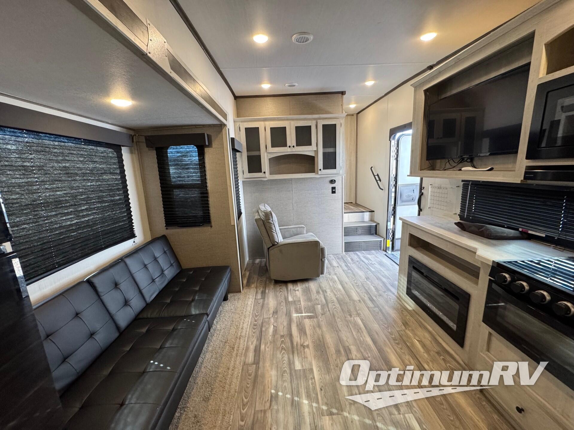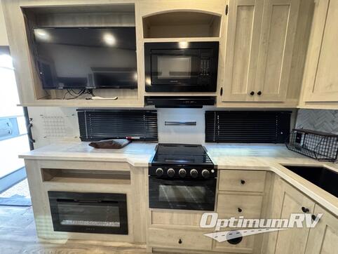 This fifth wheel offers plenty of room for a big group to get away together! With a front bedroom with a king bed, plus a rear bunk room with three bunks and a unique storage unit, everyone will have their own space. A central living area and kitchen provides a gathering space that everyone will love. The kitchen has a range, microwave, and refrigerator so you can cook as easily as at home. A dinette booth with cornhole boards and sofa will be comfortable places to relax by the electric fireplace!