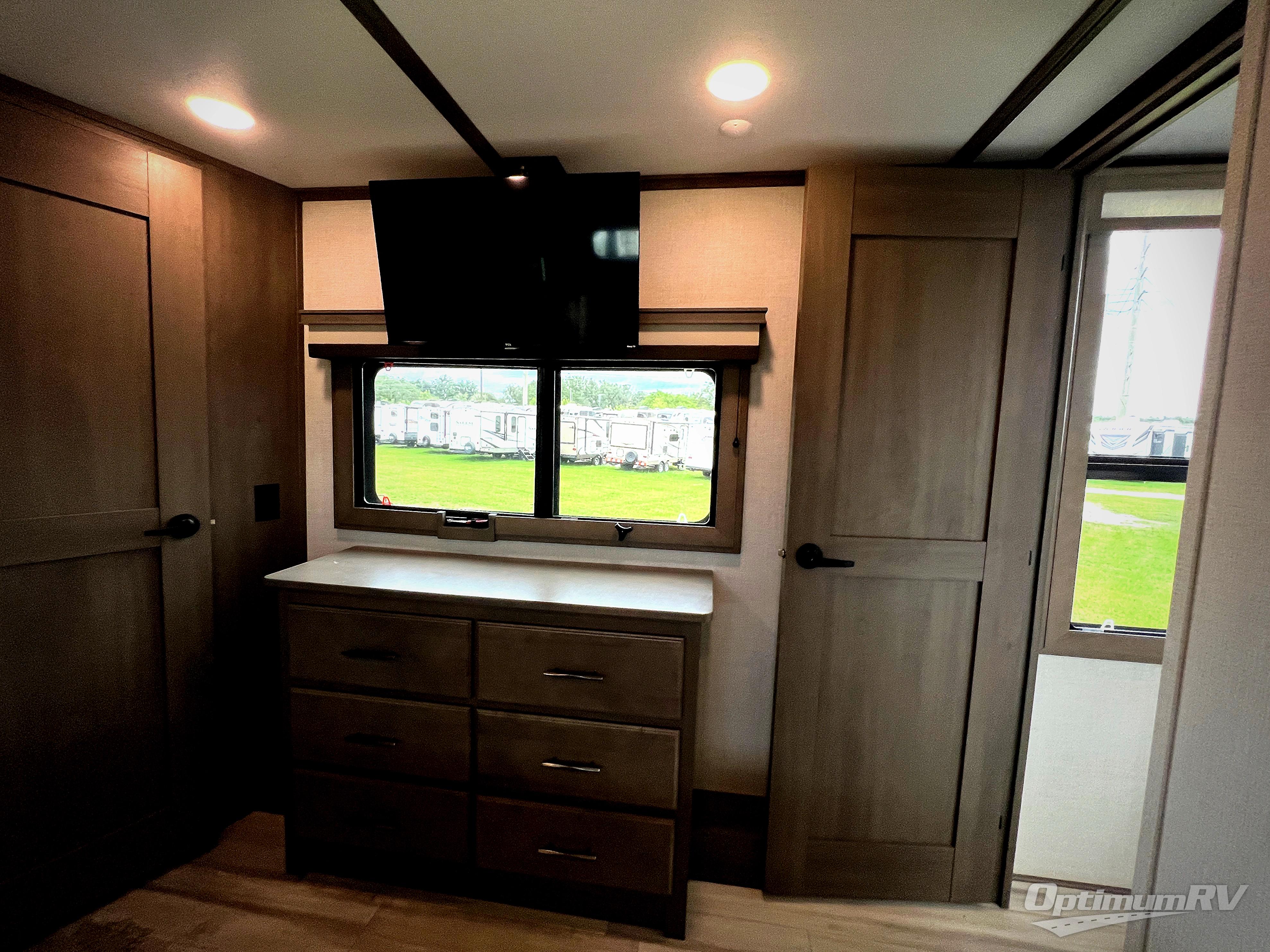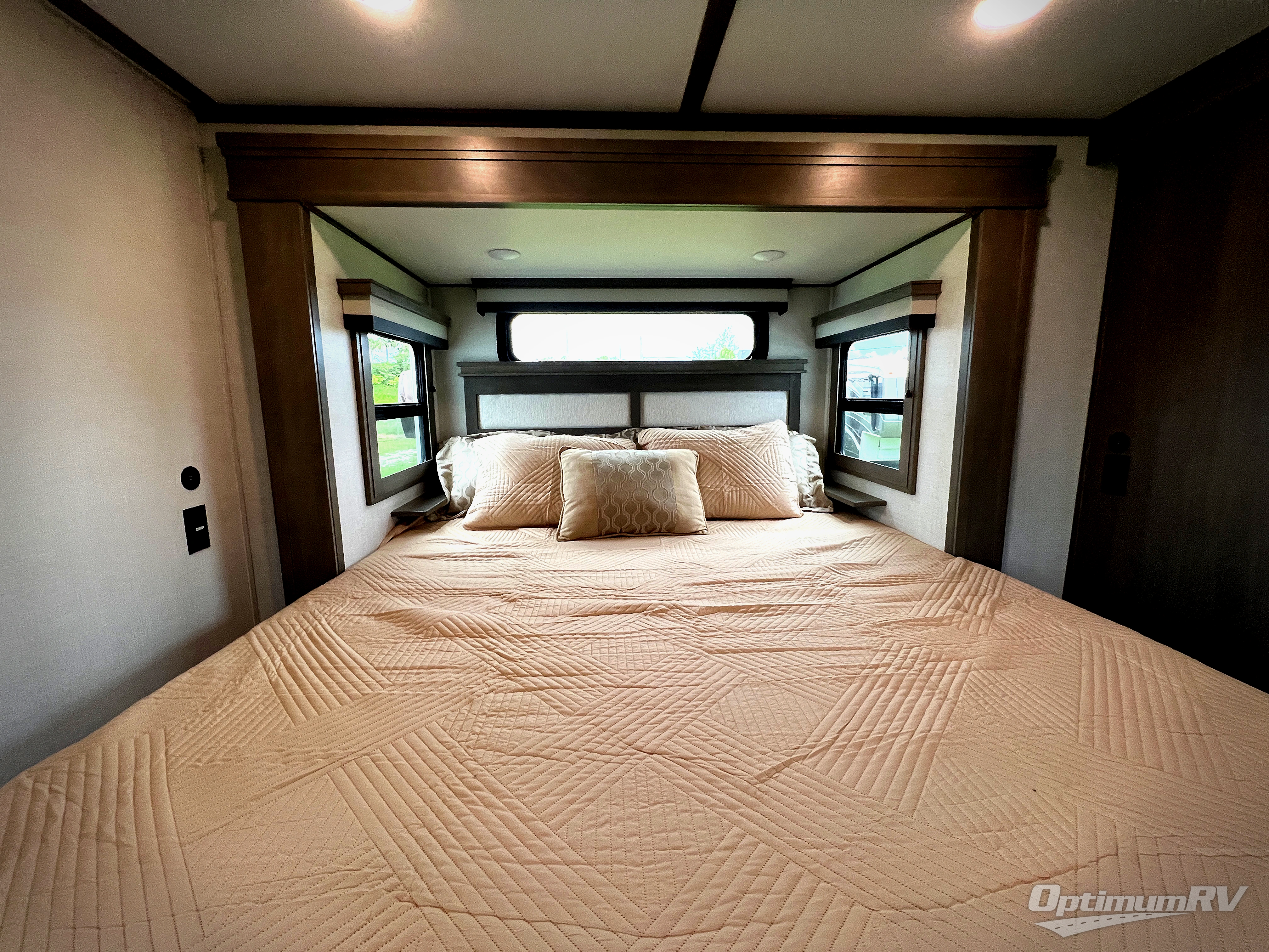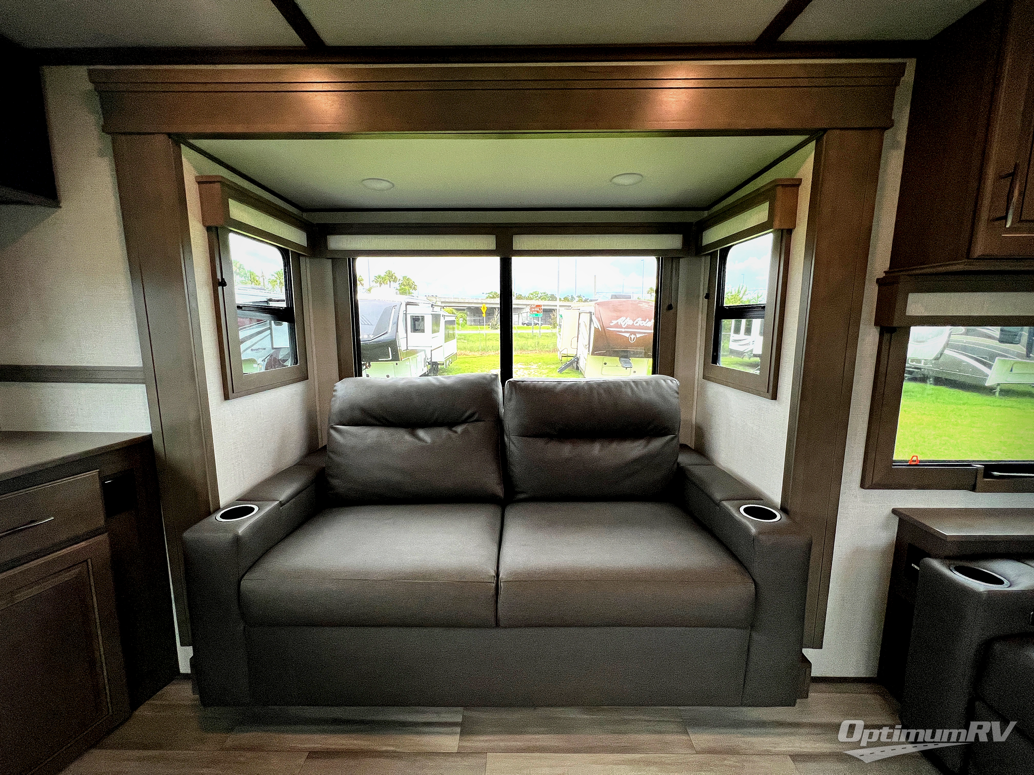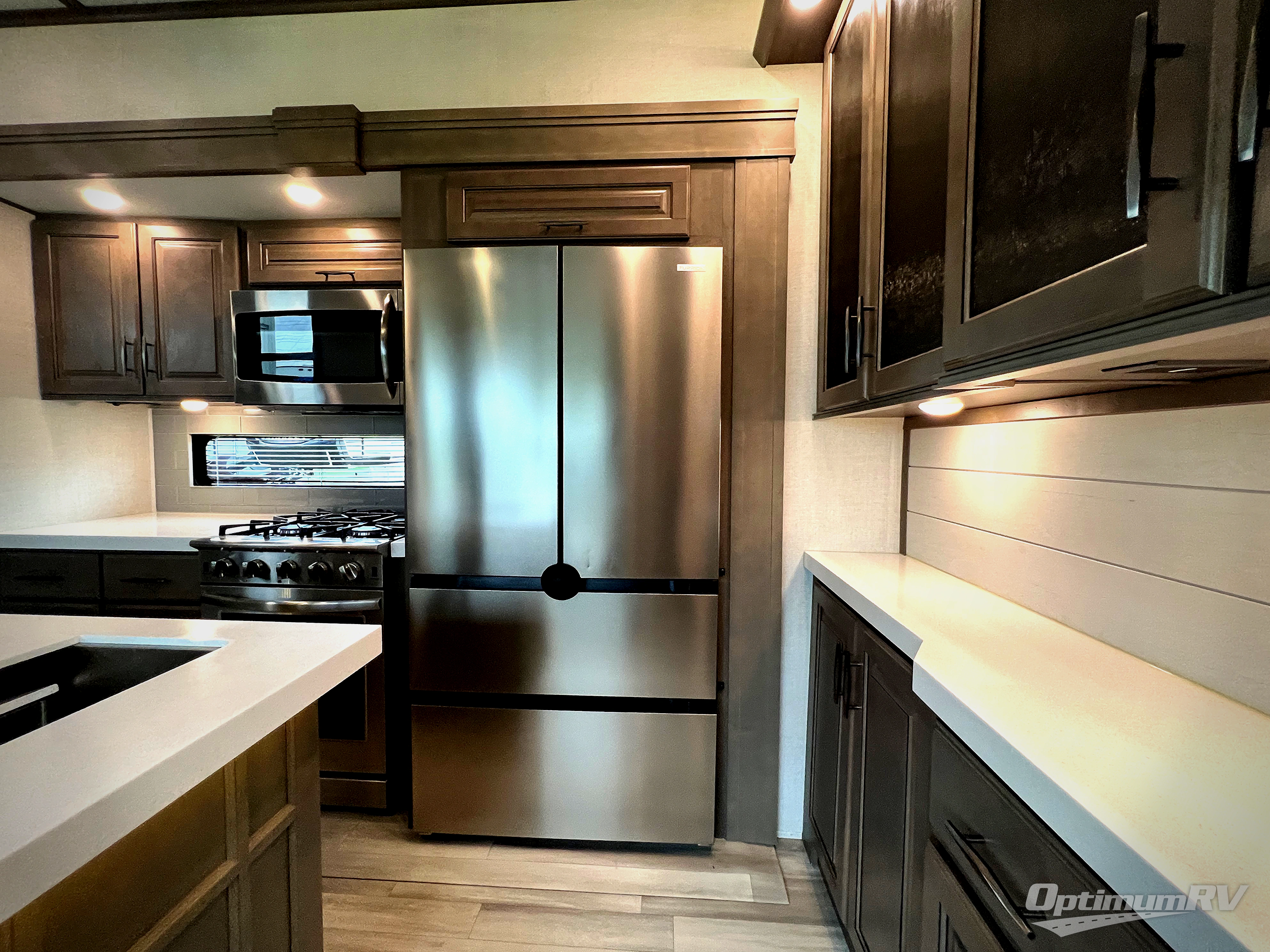 Each minute spent in this spacious fifth wheel will feel just like home! The rear living area includes a rear entertainment center with an LED Smart TV and fireplace, overhead cabinets, theater seating, plus two tri-fold sofas for your guests to sleep on. You will have the front private bedroom all to yourselves with a queen bed slide out that can be switched out for an optional king bed, and the front closet provides all the space you need to store your belongings. This model includes a spacious full bath with a flip-up teak seat, a shower skylight, plus dual bath sinks for ultimate convenience. The chef of your group will love the middle kitchen with its convenient island including double sink, residential cooktop and 24" oven, 20 cu. ft. refrigerator, and free-standing dinette plus a hutch and buffet for storage. Head outdoors to find a 16' power awning with LED lights and middle pass through along with rear storage including a sliding tray, and you might want to add the optional pull-out kitchen.