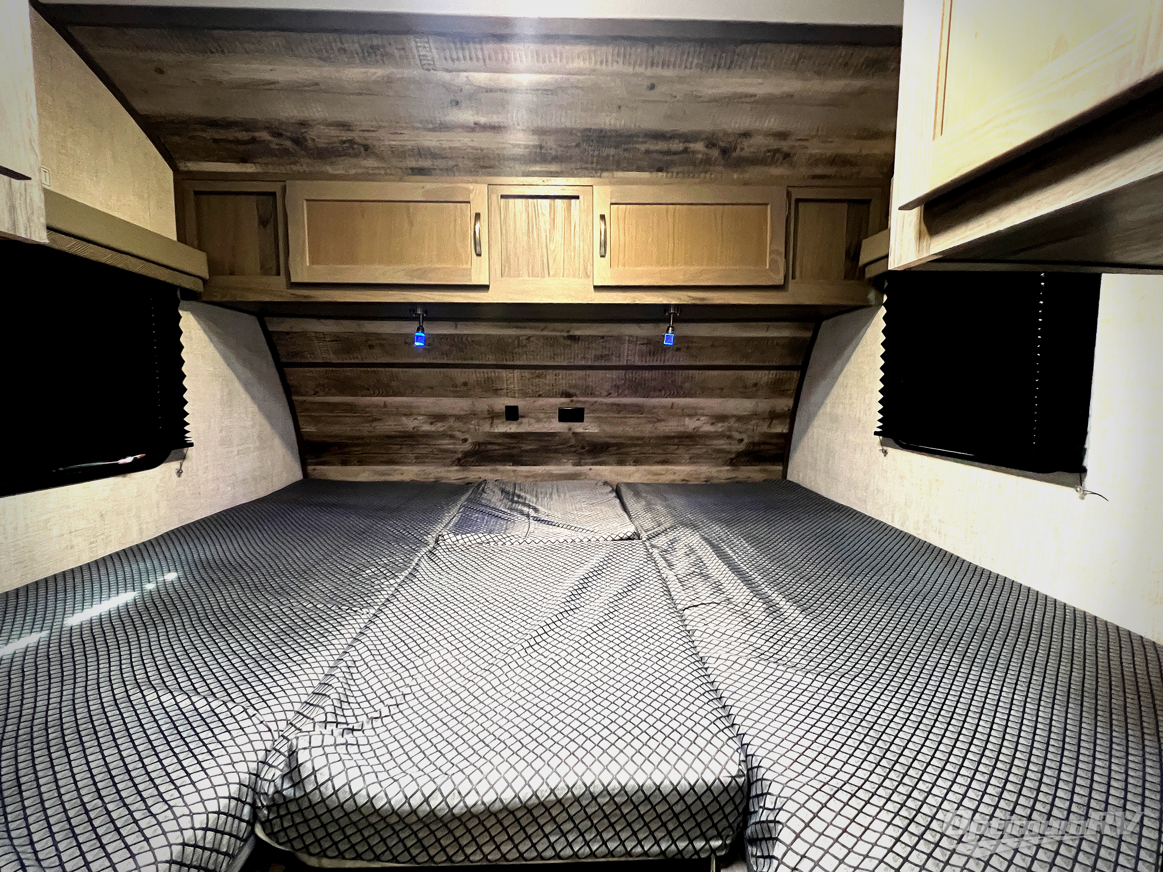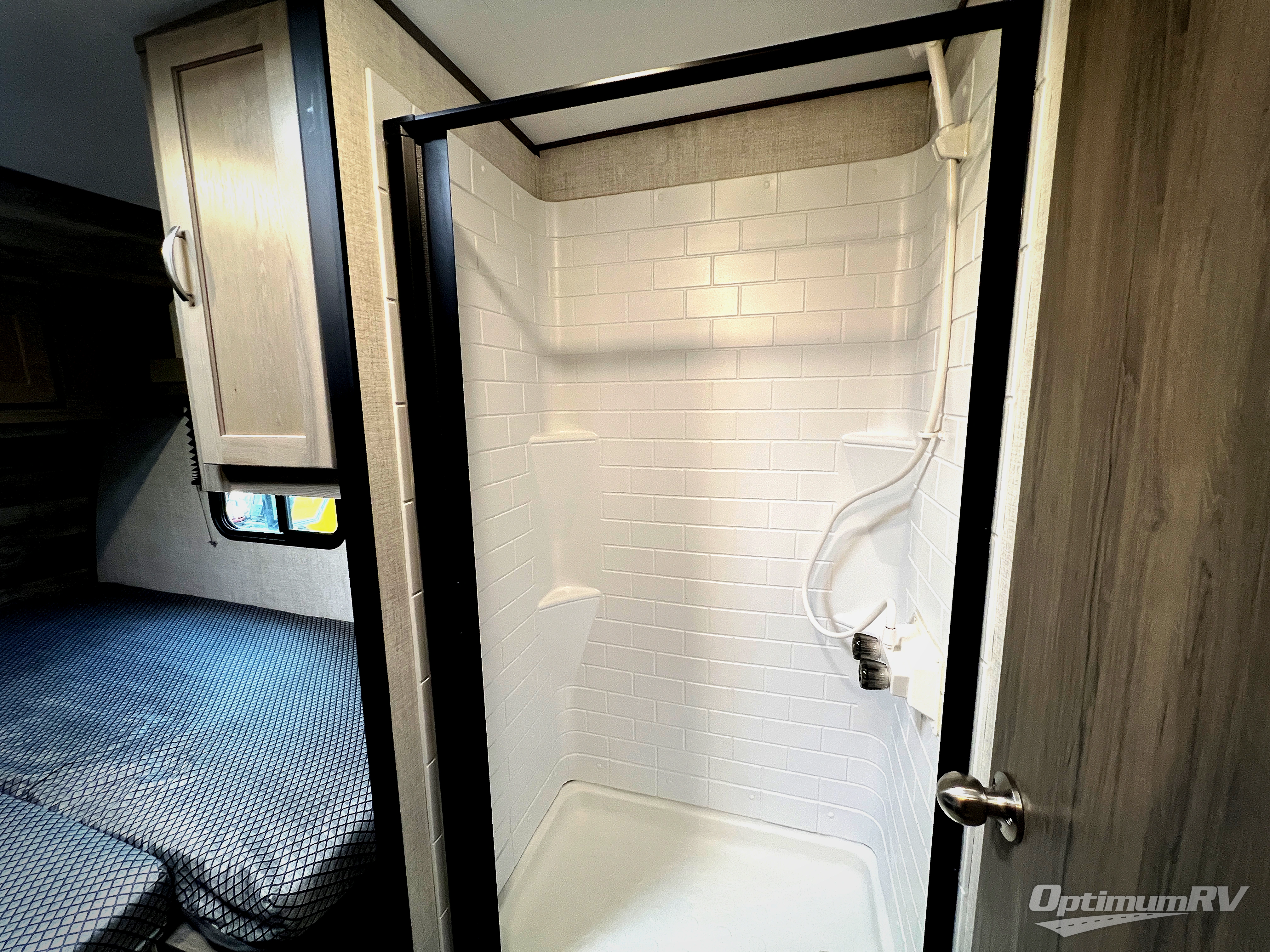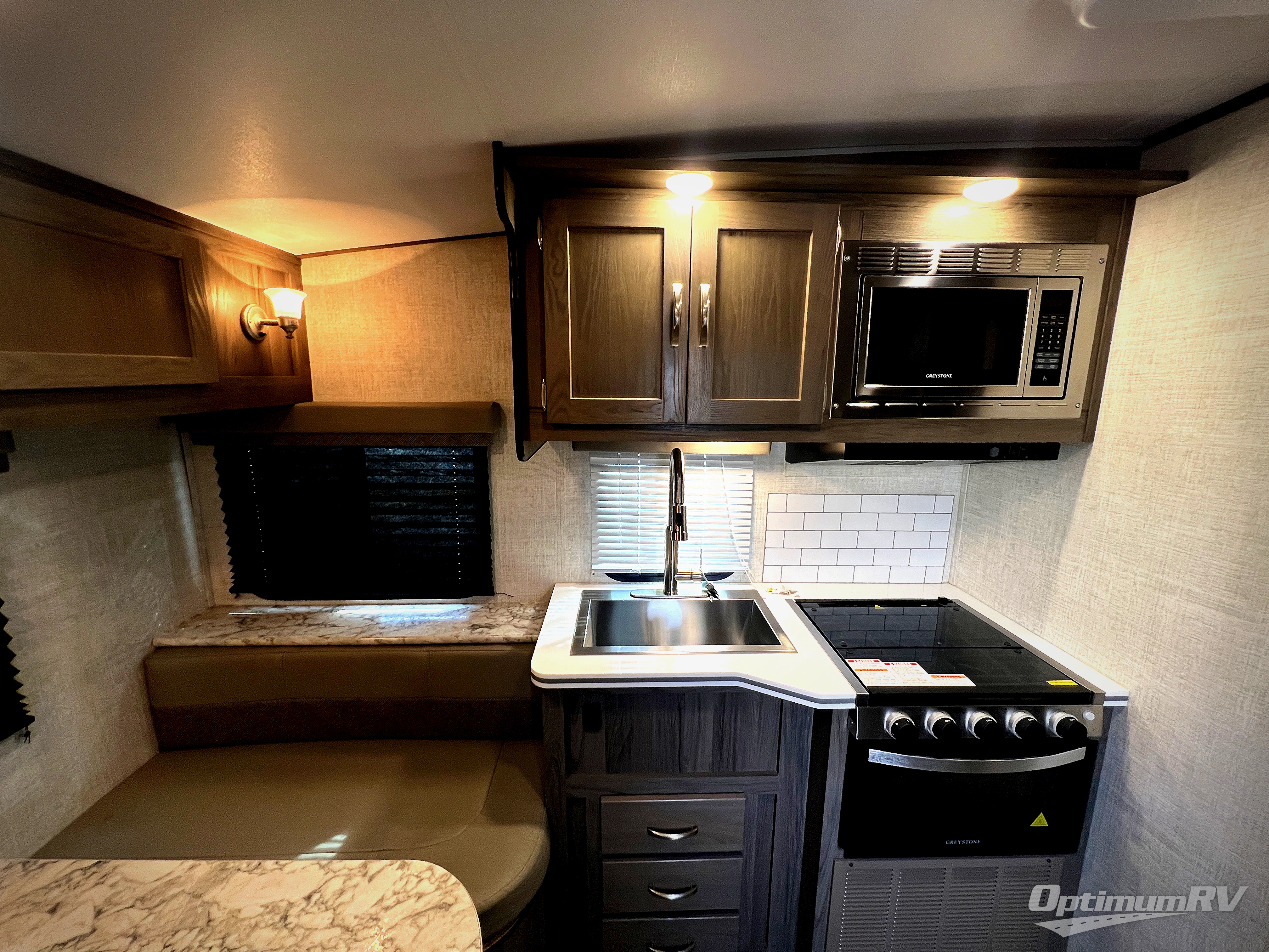 Enjoy the comforts of home while at the campsite in this travel trailer! Up front there are two twin beds with an insert for a king bed. The separated bathroom makes it easy for one to freshen up in the shower while another washes up for dinner in the private toilet and sink room right across the hall. The rear booth dinette is great for enjoying a meal, playing a card game, and even transforming into an extra sleeping space. The flat floor entry helps to keep you from tripping when entering or exiting. The microwave above the two burner cooktop is just waiting for you to pop the perfect bag of popcorn on movie night!