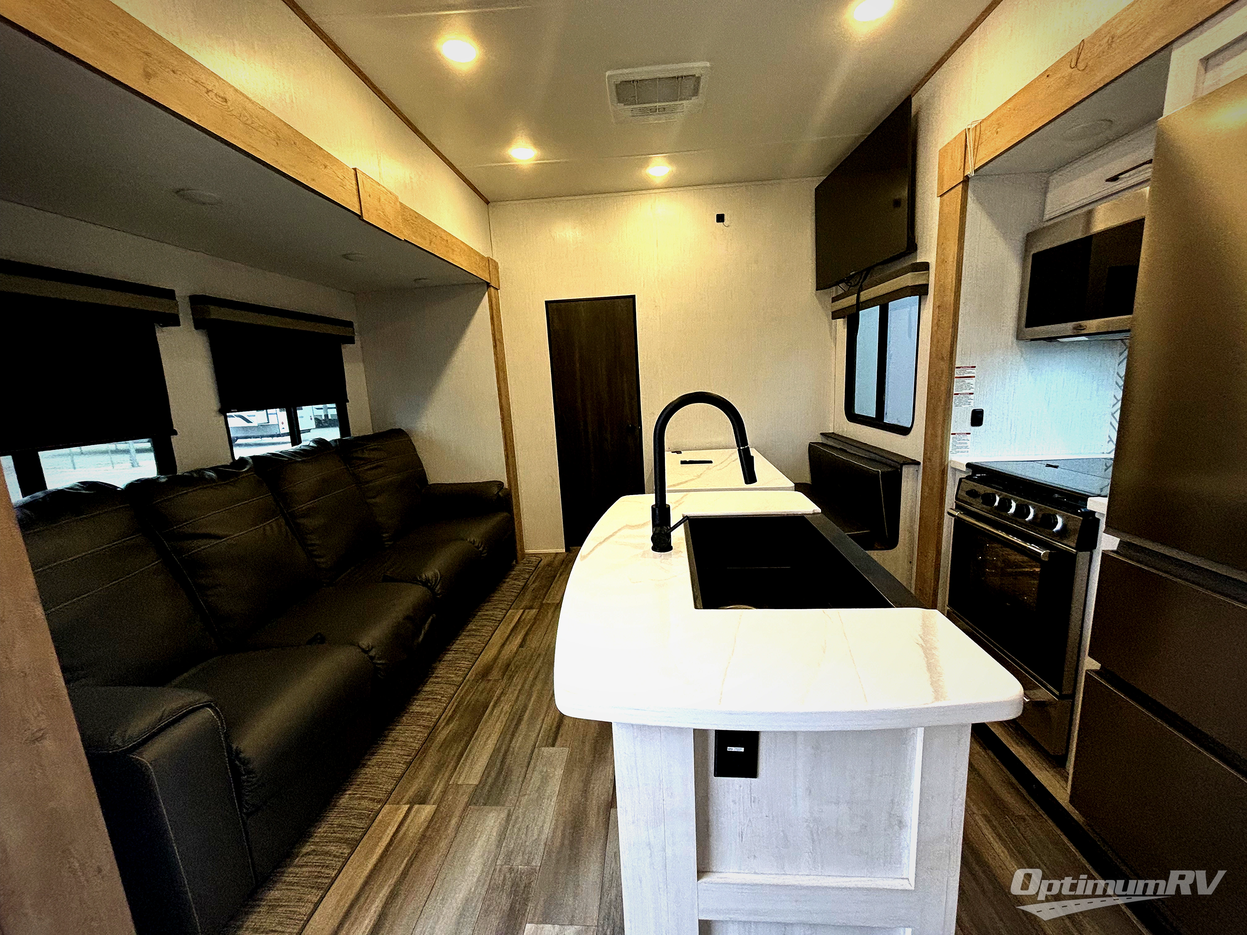 Each Bighorn Traveler fifth wheel by Heartland is constructed with lightweight Azdel laminated sidewalls, a walkable roof, and a heated and enclosed underbelly for an added layer of protection. The MORryde strut-assisted "Step Above" folding aluminum treat entry staircase will provide stability when entering your fifth wheel, and the MORryde CRE3000 rubber suspension will ensure smooth towing, especially on tougher terrain. Your electronics are welcome here with dual wireless charging ports and dual Bluetooth speaker ports in each model, and the "Barefoot Friendly" carpet-free flooring is both kid and pet-friendly. Some of the residential comforts you'll find in the Bighorn Traveler are the real wood drawer construction, the recessed LED ceiling lighting, and the in-house milled and finished solid surface countertops throughout!