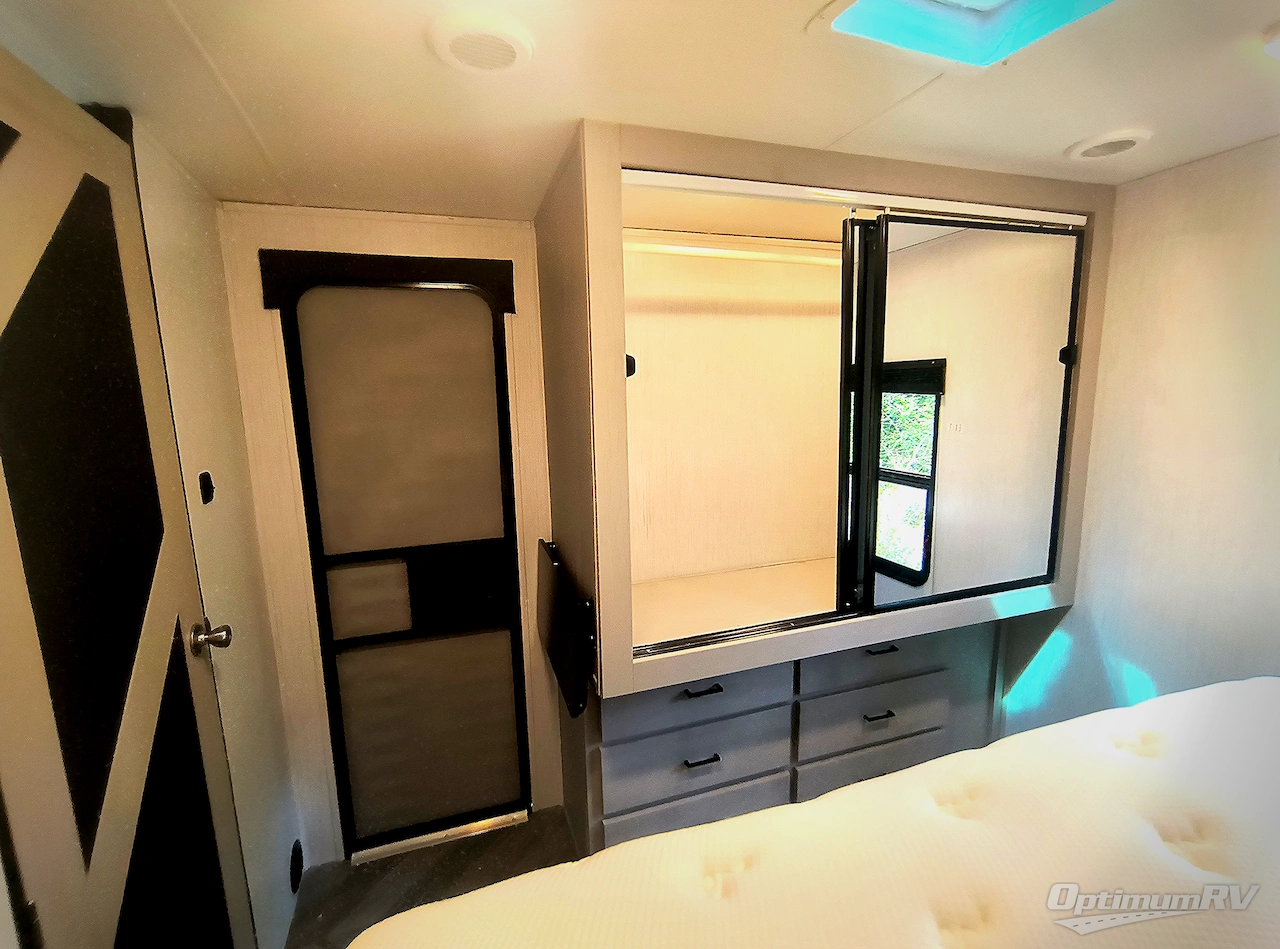 Dual entry doors in this travel trailer will allow you to enter in through the main living area/kitchen, or the rear master bedroom. You will love having a king bed to rest on each night, a wardrobe and closet to store your clothes, and a dual entry bath. After you've spent the day outdoors hiking or biking, plan to spend your evening relaxing on the sofa or playing a game at the booth dinette. The front kitchen includes plenty of counter space, two pantries, plus a three burner cooktop to cook meals on.