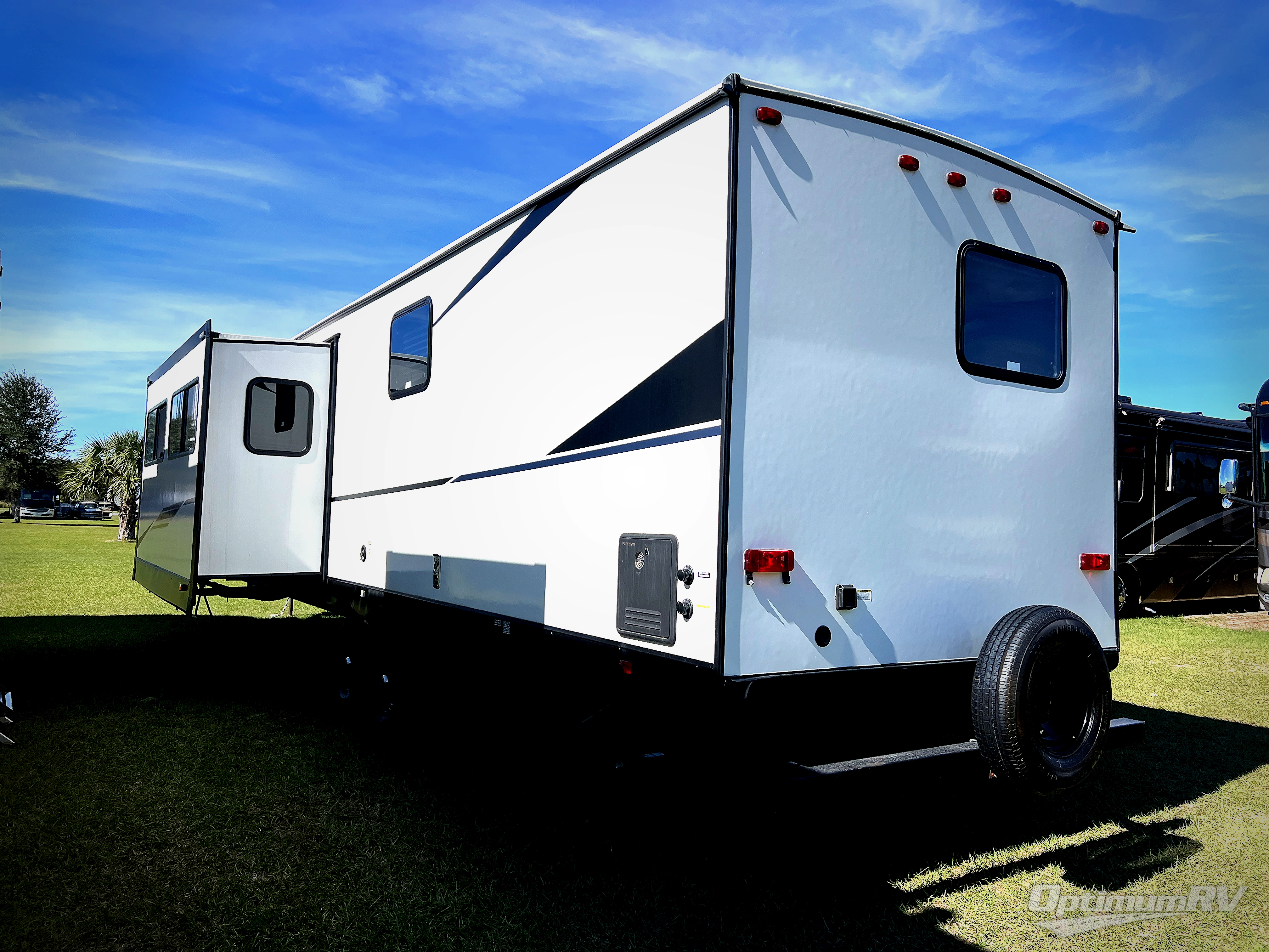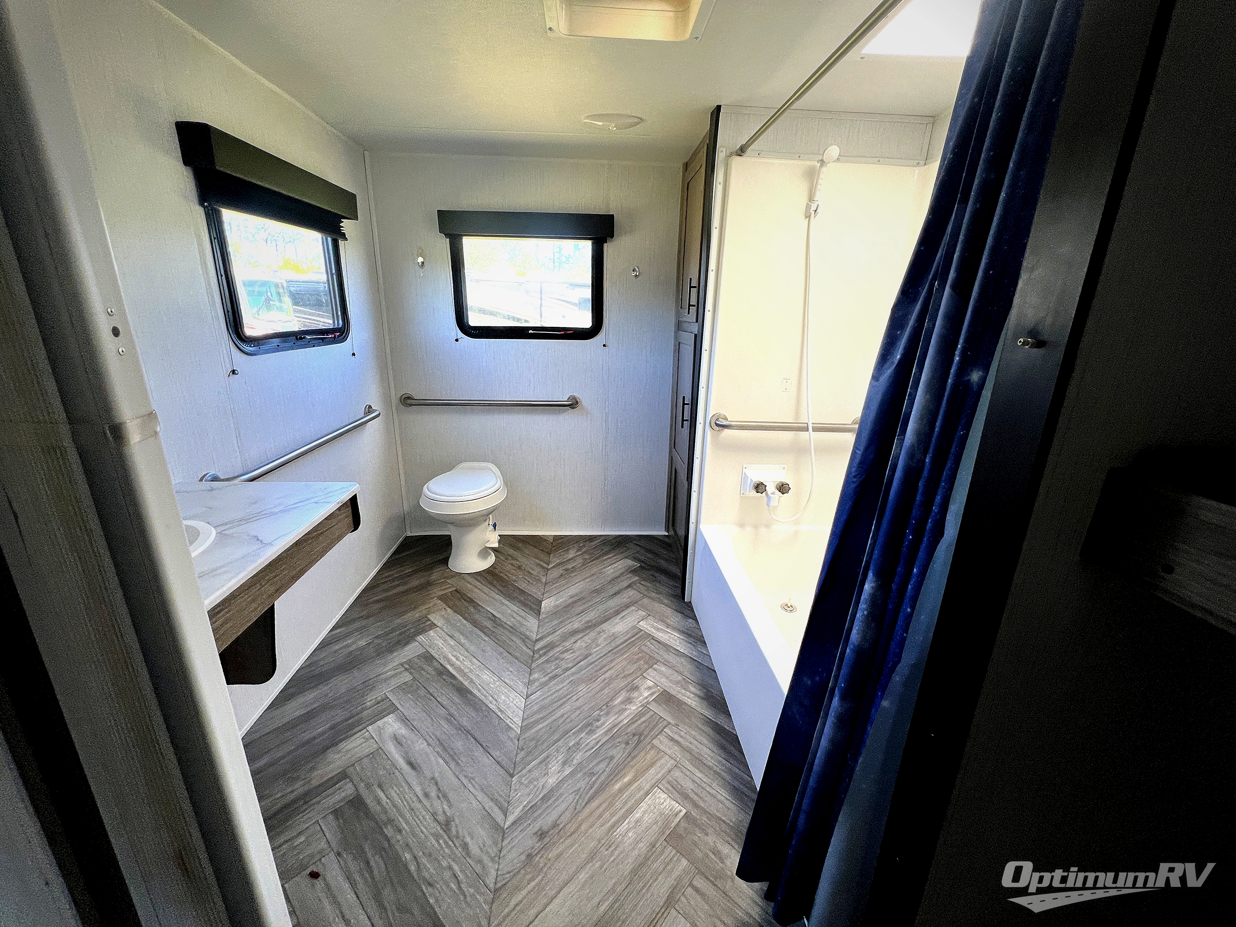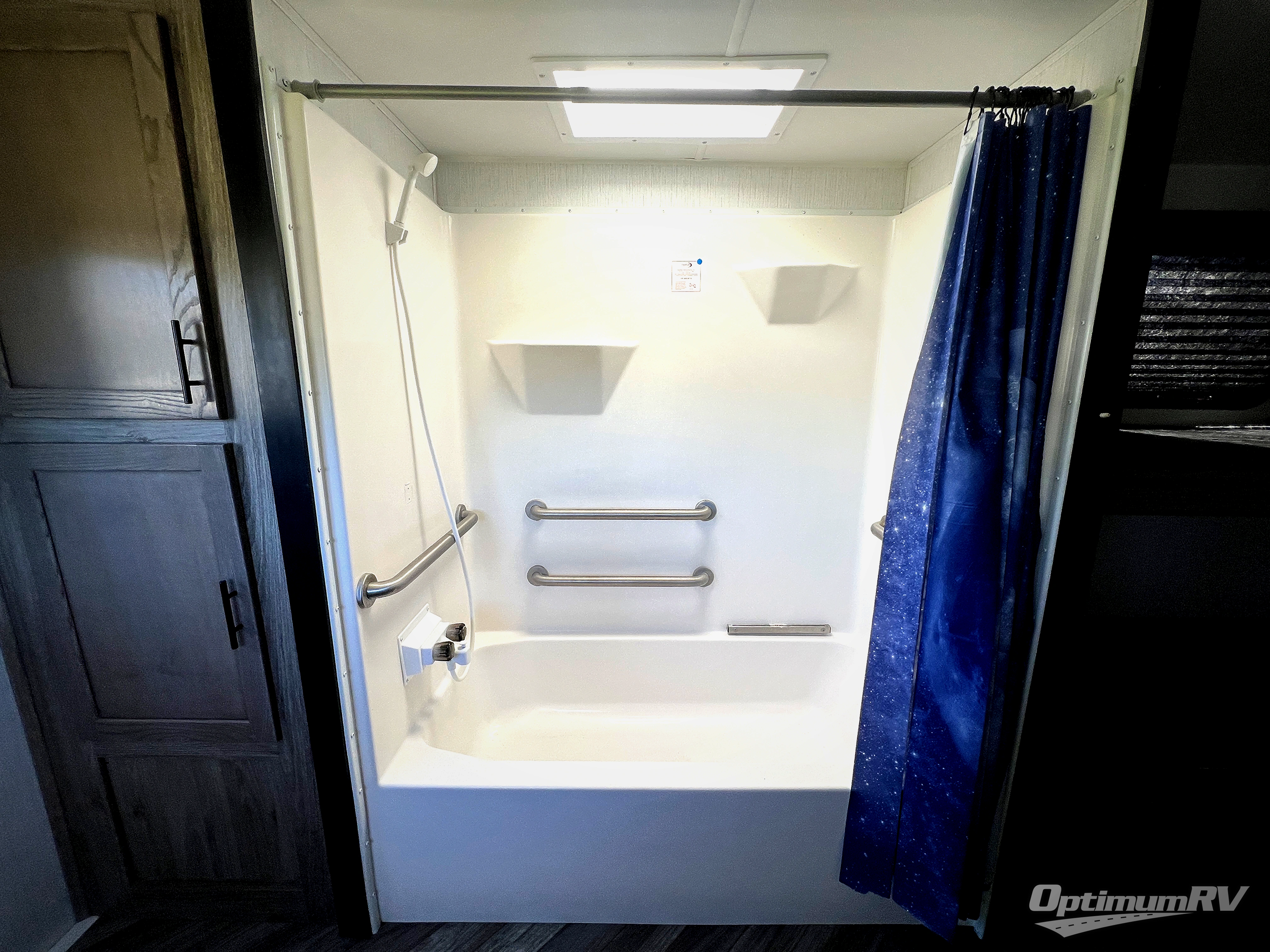 Dual entry and a spacious rear bath makes vacationing fun! The kiddos can sleep on the set of twin bunk beds and you can choose the queen bed up front, plus the sofa and dinette slide also provides sleeping space when converted. The chef can whip up their best meals using the three burner cooktop and everyone can enjoy dining together at the booth dinette where you can later enjoy a game of cards. If you're not big into card games, relax on the sofa while you enjoy a cold drink stored in the 10 cu. ft. stainless steel refrigerator. Freshen up each day in the spacious rear bathroom with ABS tub/shower surround and a skylight above it!