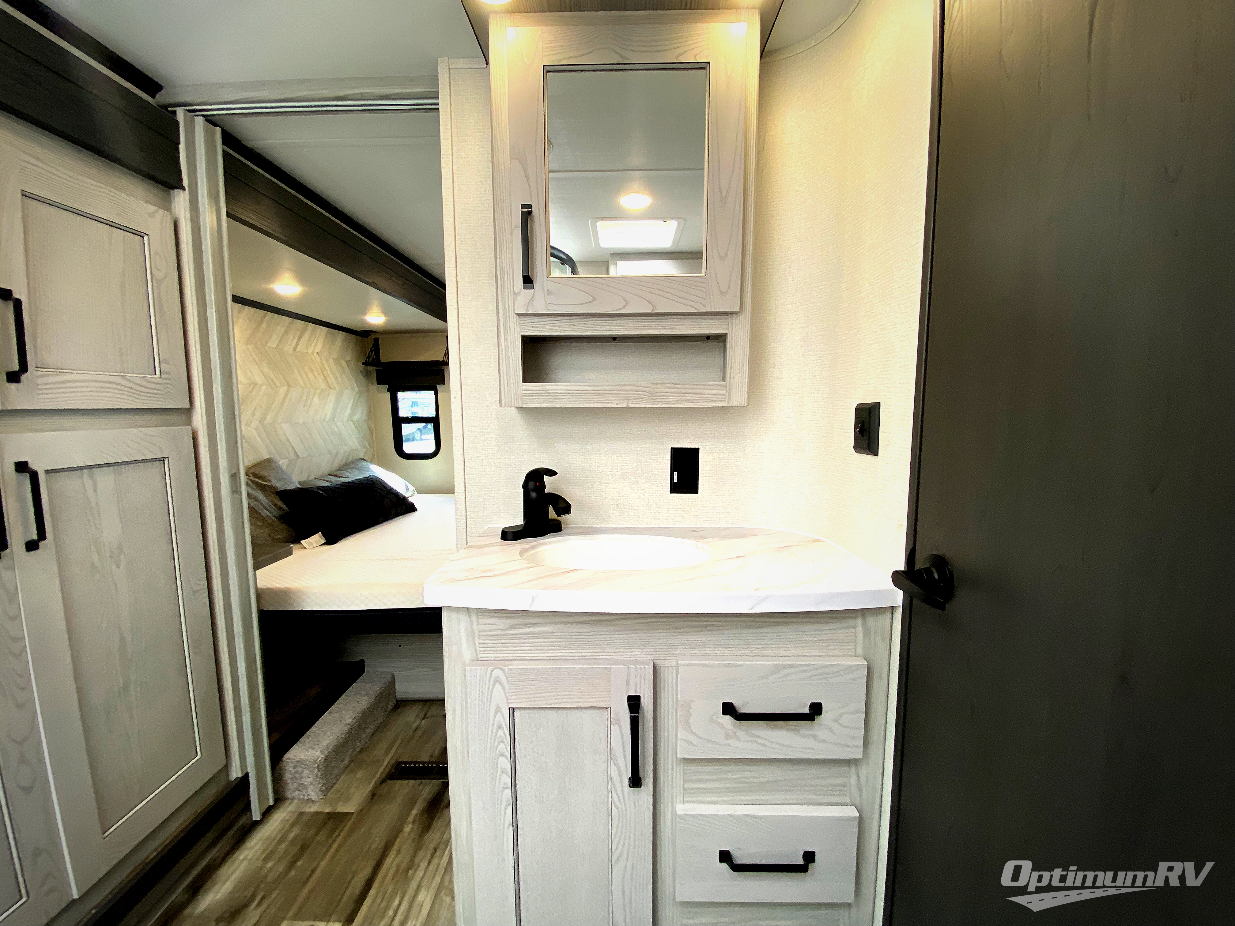 This couples coach will have you excited about traveling to all of your favorite places, and new locations too! The triple slide unit features an open concept living/dining area with dual opposing slides at the very back featuring a hide-a-bed sofa along the curbside, and an eating space opposite with a booth dinette or choose the optional free-standing table and chairs. Power theater seats will be a comfortable place to kick back for a movie, and you will love the all-new entertainment center design featuring a fireplace, Smart TV, and back-lit overhead cabinets. In the evening, head up to your private retreat with a spacious bath including dual entry doors from the hall at the top of the stairs or from within the private bedroom. Get cleaned up in the large radius shower with seat and snuggle up in a king bed slide. The bedroom slide also features a large wardrobe that has been prepped for a washer/dryer if you choose to add the convenience. You will find plenty more storage spaces for your clothing and belongings in the two dressers or dual wardrobes along the full front wall. Another bonus with this unit is the outdoor kitchen which gives you a choice to cook inside or out!