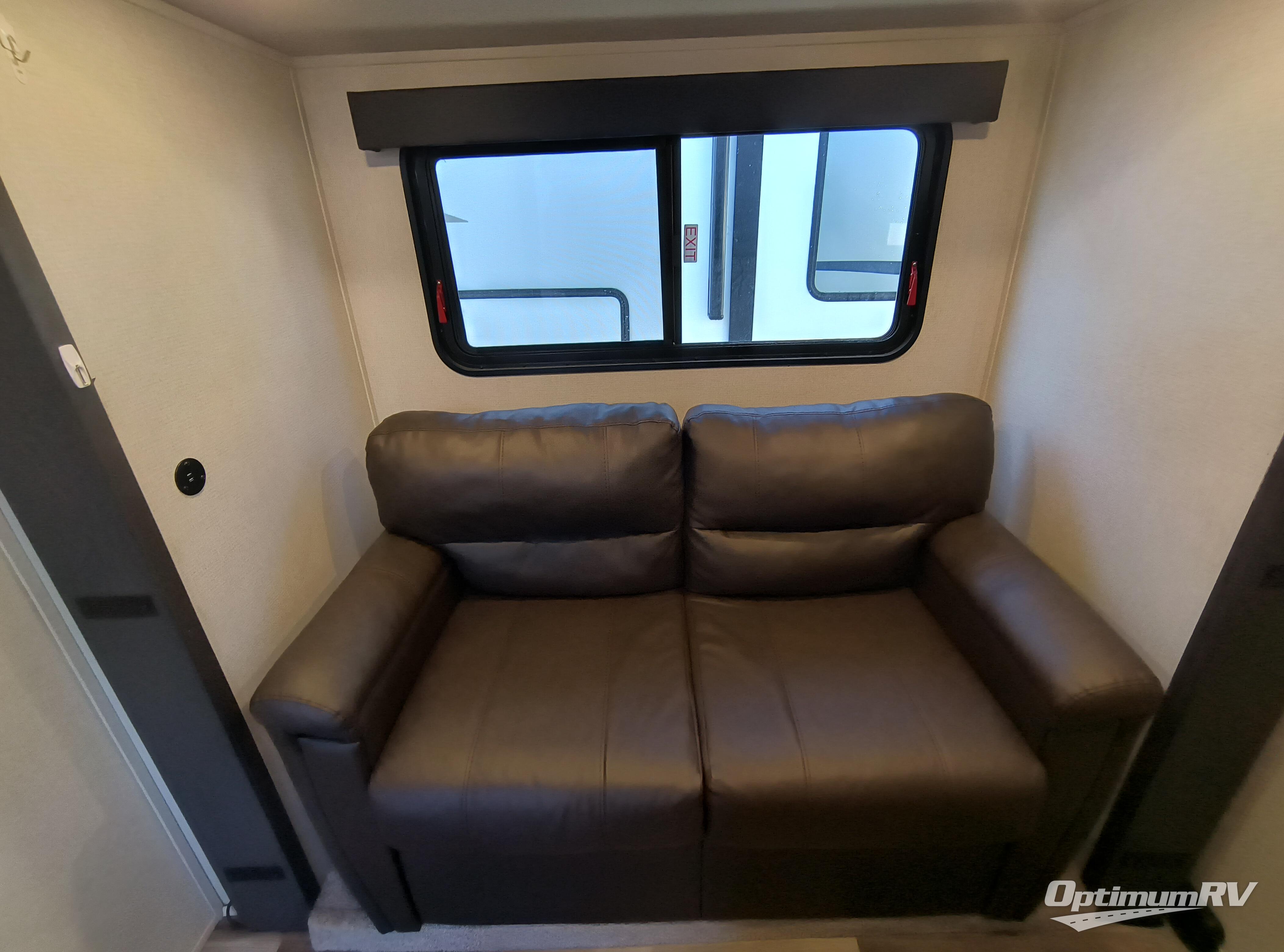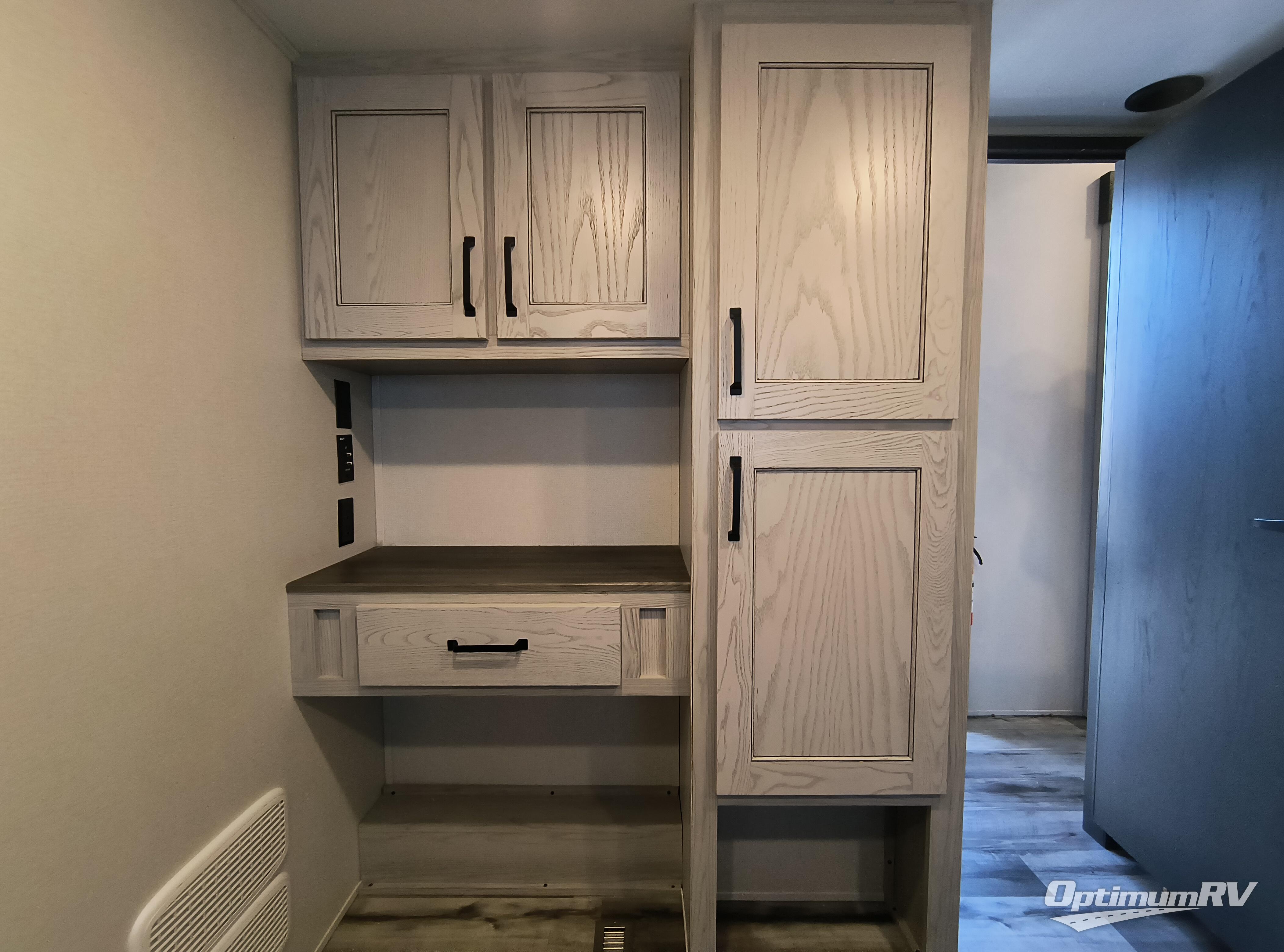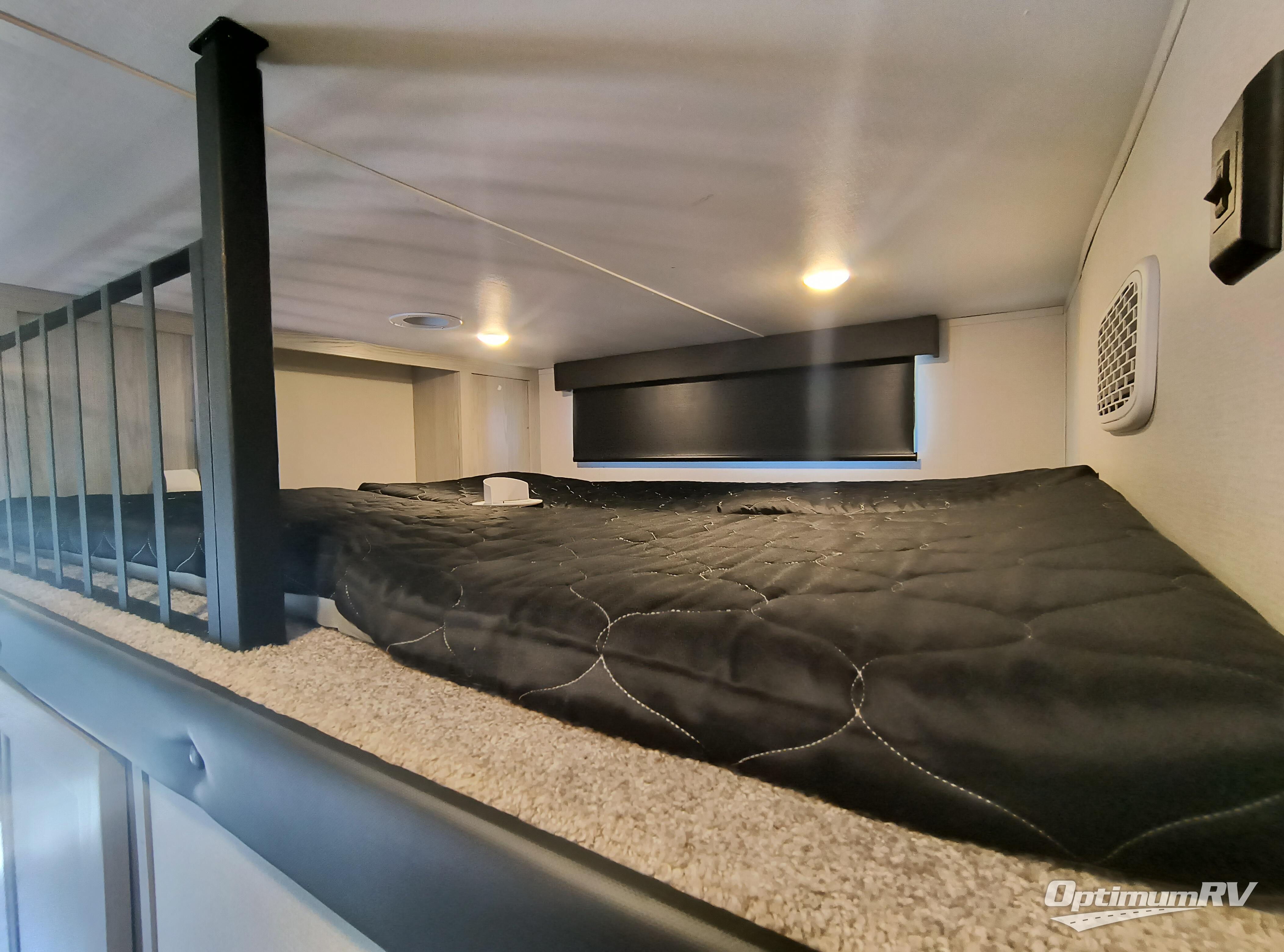 Just one look at this Montana High Country fifth wheel will impress you! There is an extra middle room that can be used for many different purposes, like an office, a guest bedroom, a craft room, or a hangout room. The hide-a-bed sofa sits on a slide for more space in this room, and there is a desk that can be used to get some work done. Above this room is a loft, so you have even more sleeping space. You also have a hide-a-bed sofa in the living area, and the king-size bed in the front private bedroom has storage underneath. The power theater seating sits across from the fireplace and 50" LCD TV for nighttime entertainment, and the kitchen island has a countertop extension for more prep space.