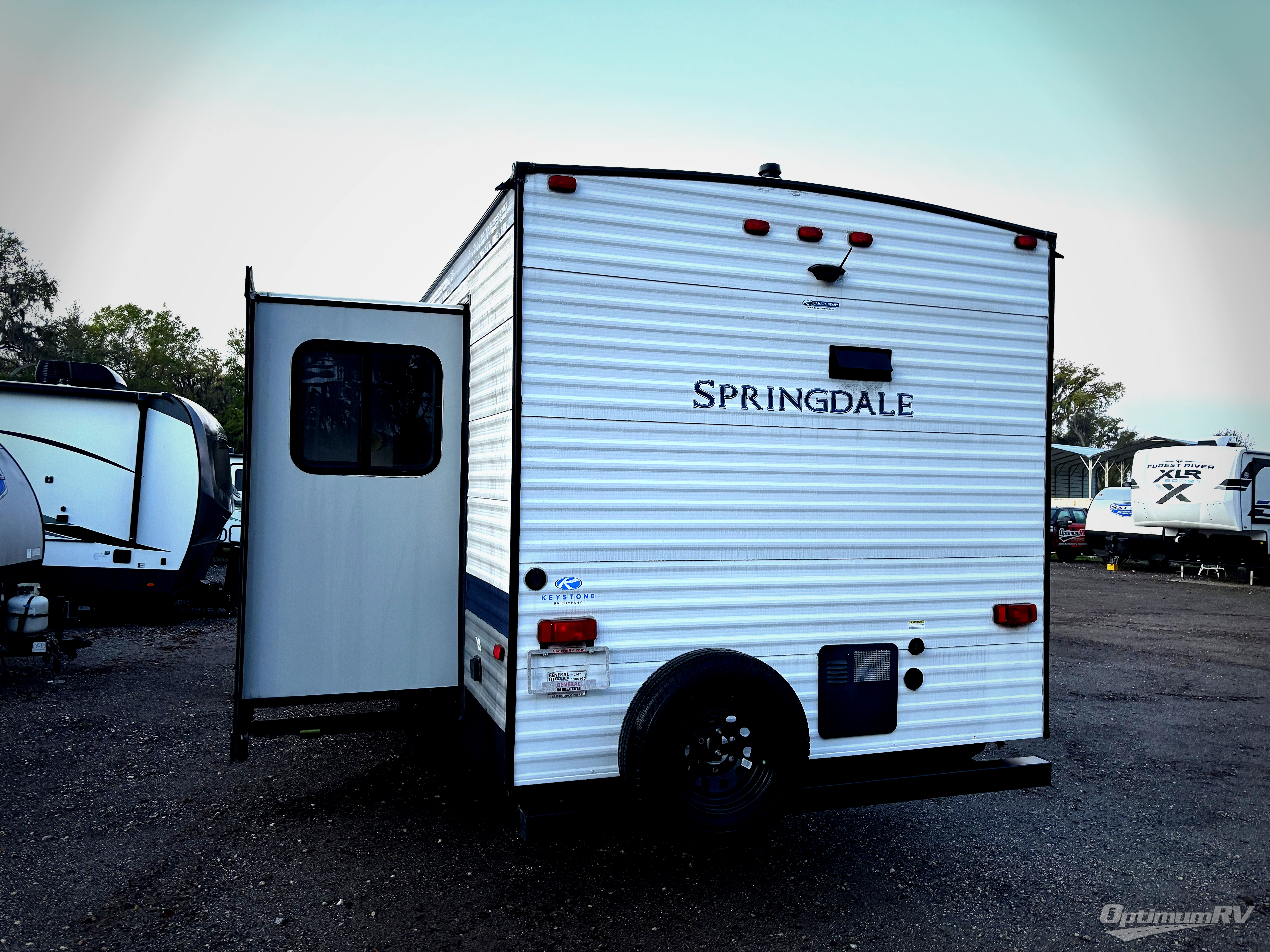 With any Keystone Springdale travel trailer, you will have a friction hinge entry door with sturdy MORryde StepAbove steps, a pass-through storage compartment for your outdoor gear, and reliable Dexter E-Z Lube axles to maneuver your Springdale down the road and into the campsites. Some of the Keystone Exclusives provide 12V color-coded wiring with easy-to-trace circuits which is better than conventional RV wiring allowing a faster diagnosis for quicker repairs, and the streamlined heat distribution that uses in-floor heat vents for more efficiency for uninterrupted air flow. Also included, the Blade high performance air flow system that delivers 30% more air flow. The interior gives you pressed kitchen countertops, pleated night shades, and designer upholstered window valances for easy care and style, and more depending on the Springdale you choose!