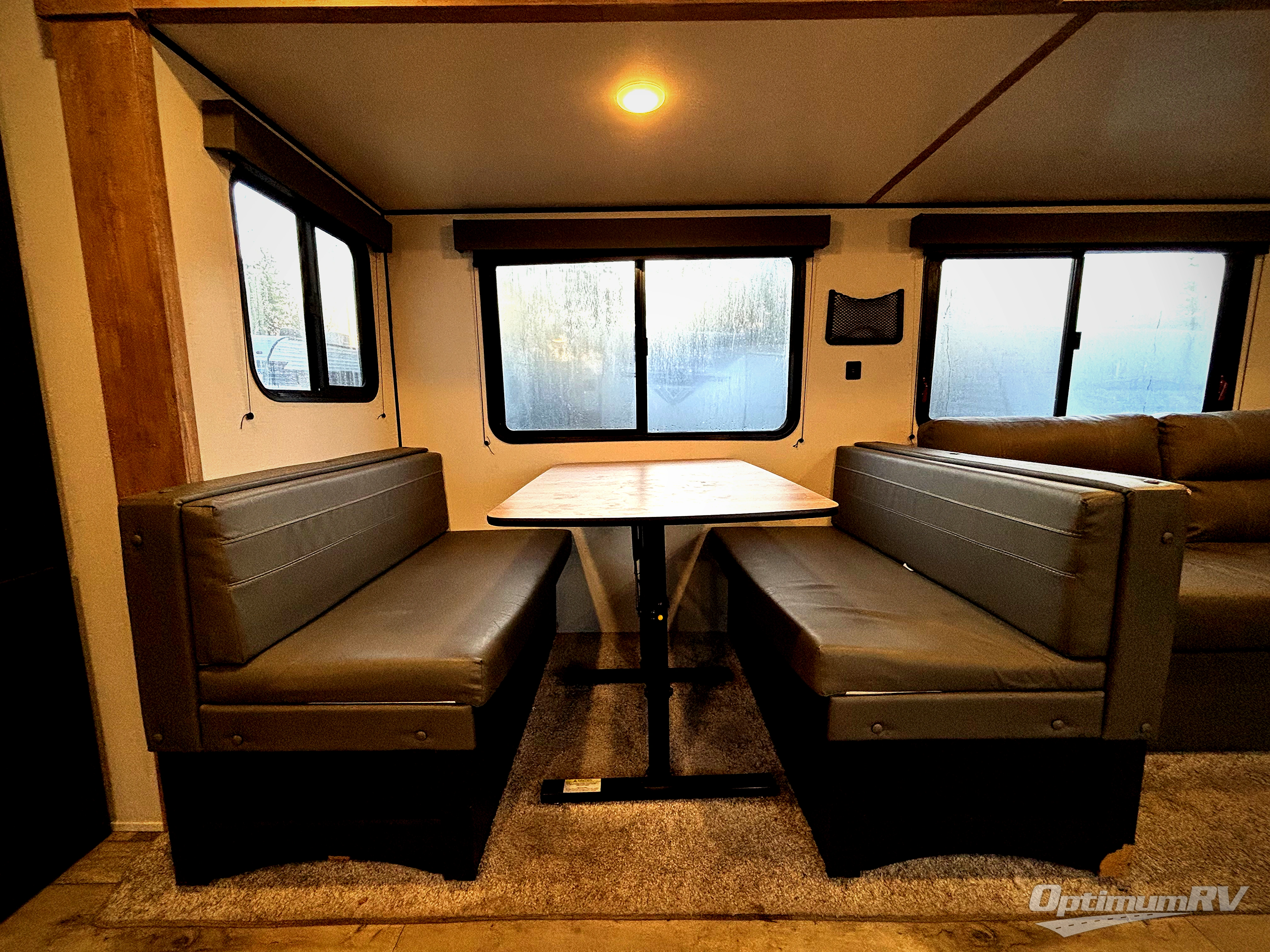The rear kitchen in this Springdale travel trailer is great because of the U-shaped countertop which gives you plenty of room for prepping your meals and cleaning up as well as all the appliances and the pantry. There are a few seating choices throughout where you can relax, play games, or eat meals, like the two recliners with a table in between to place your drinks and keys, the tri-fold sleeper sofa, and the Do-More dinette. The private bedroom up front has a queen bed which is perfect for a good night's rest, and storage on each side plus above the head of the bed.