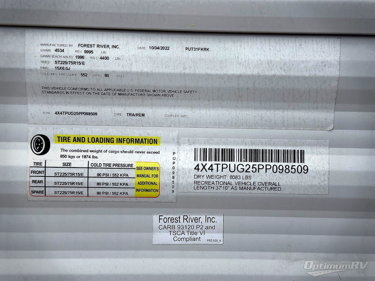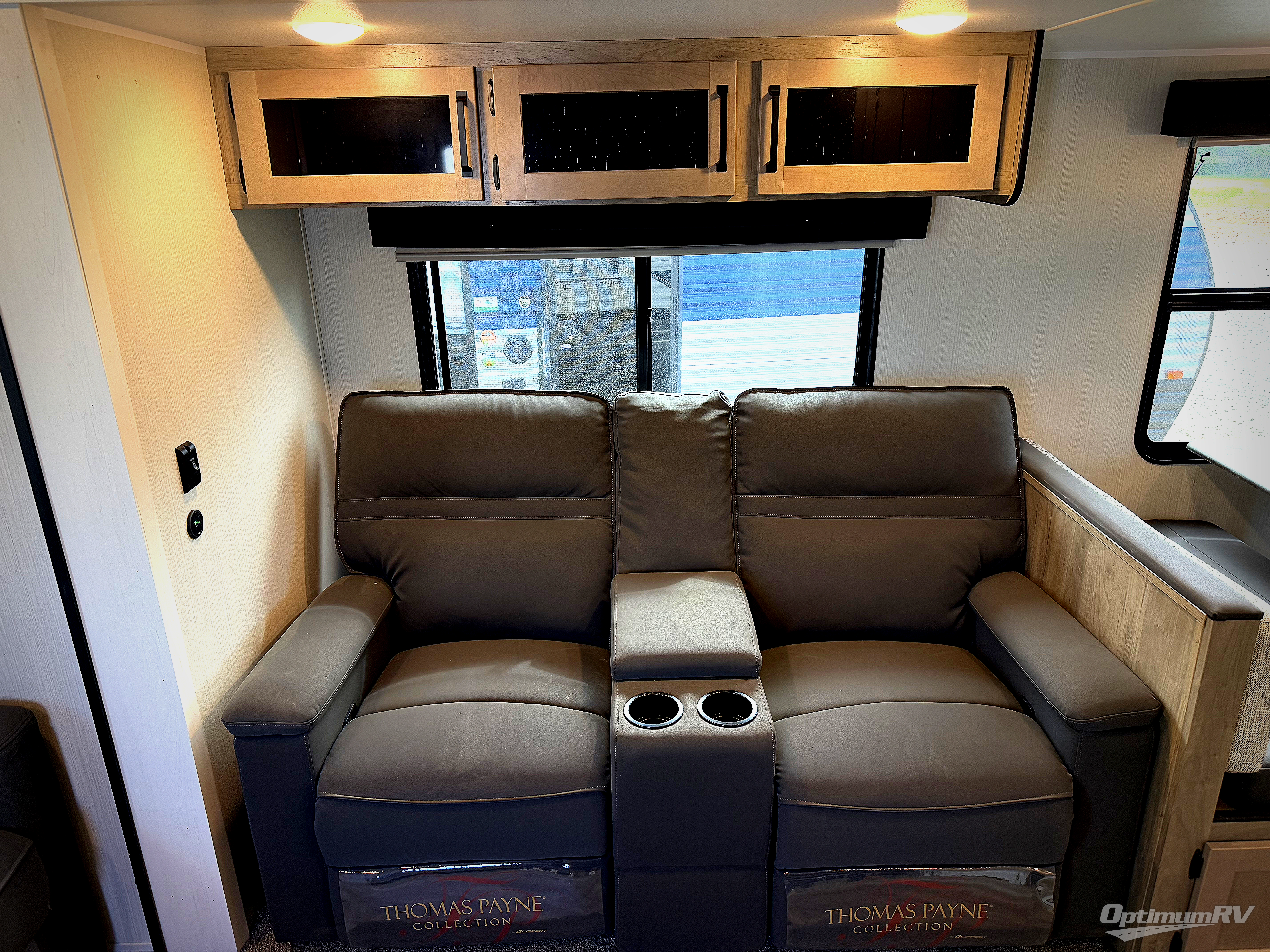 Experience a home away from home with this travel trailer! The front kitchen has everything you will need to prepare your best meals and you can enjoy them at the booth dinette. The rear private bedroom has a 72" x 80" king bed slide across from a dresser, a wardrobe, and a closet next to it that is prepped to add an optional washer and dryer. Freshen up in the full bathroom with the 34" x 34" radius shower and then enjoy a cup of coffee relaxing in one of the two recliners or on the sofa!