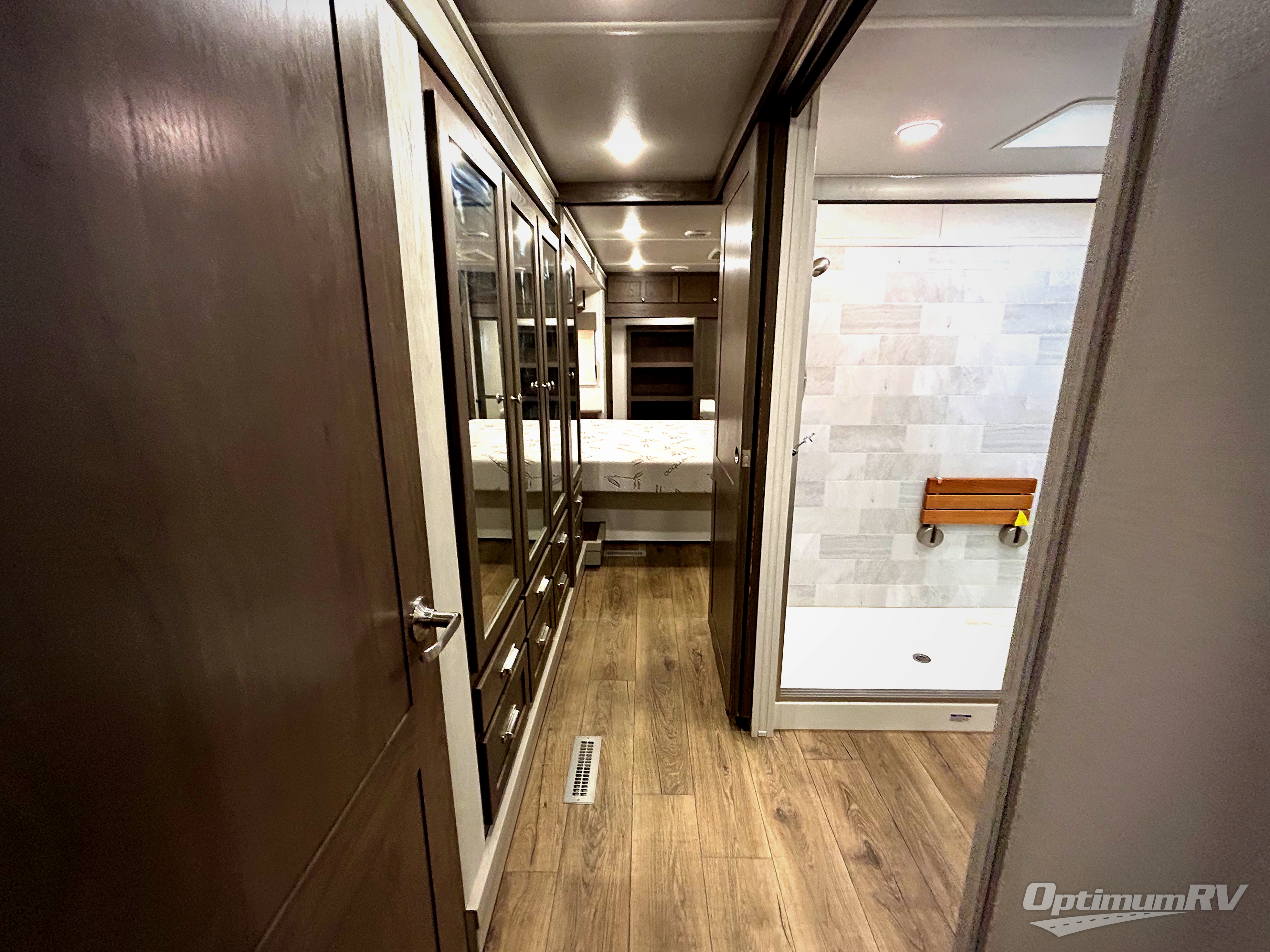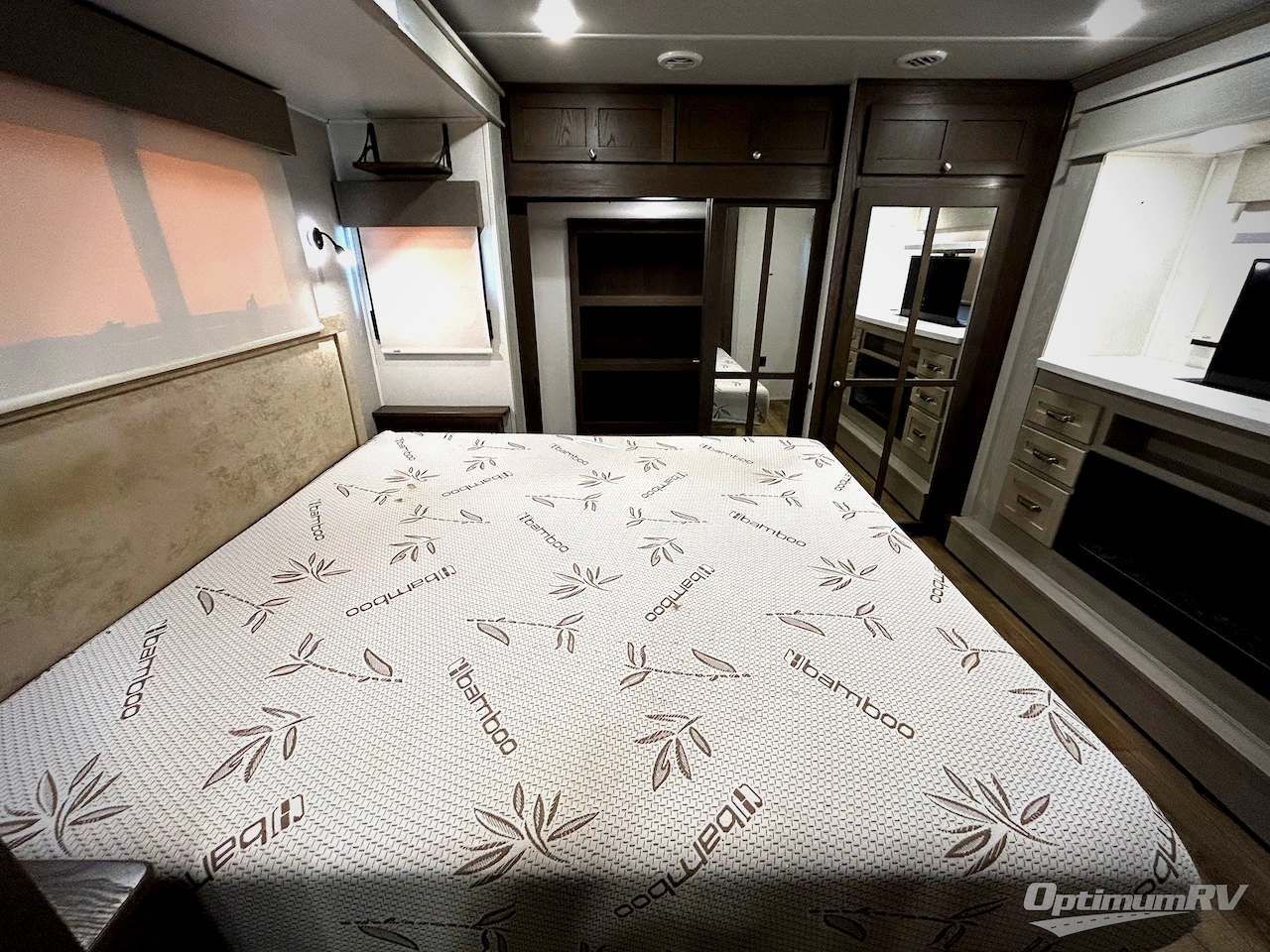 This is the biggest fifth wheel in the River Ranch lineup with four slide outs and an 42' 7" exterior length. Your crew can relax in the rear living area on the 88" split tri-fold sofa or 65" theater seat across from the fireplace and 50" TV. There is also a free-standing table with chairs where you can dine at, plus a kitchen island for more counter space in the kitchen. There is a spacious full bath where you can freshen up each day, and the front private bedroom will provide you with your own space in the evenings. Here, you'll find a king bed and wardrobe slide, a full-length closet, and washer/dryer prep with a removable shelf for more storage space. There is even a 32" pop-up TV in the bedroom for late night movies in bed!