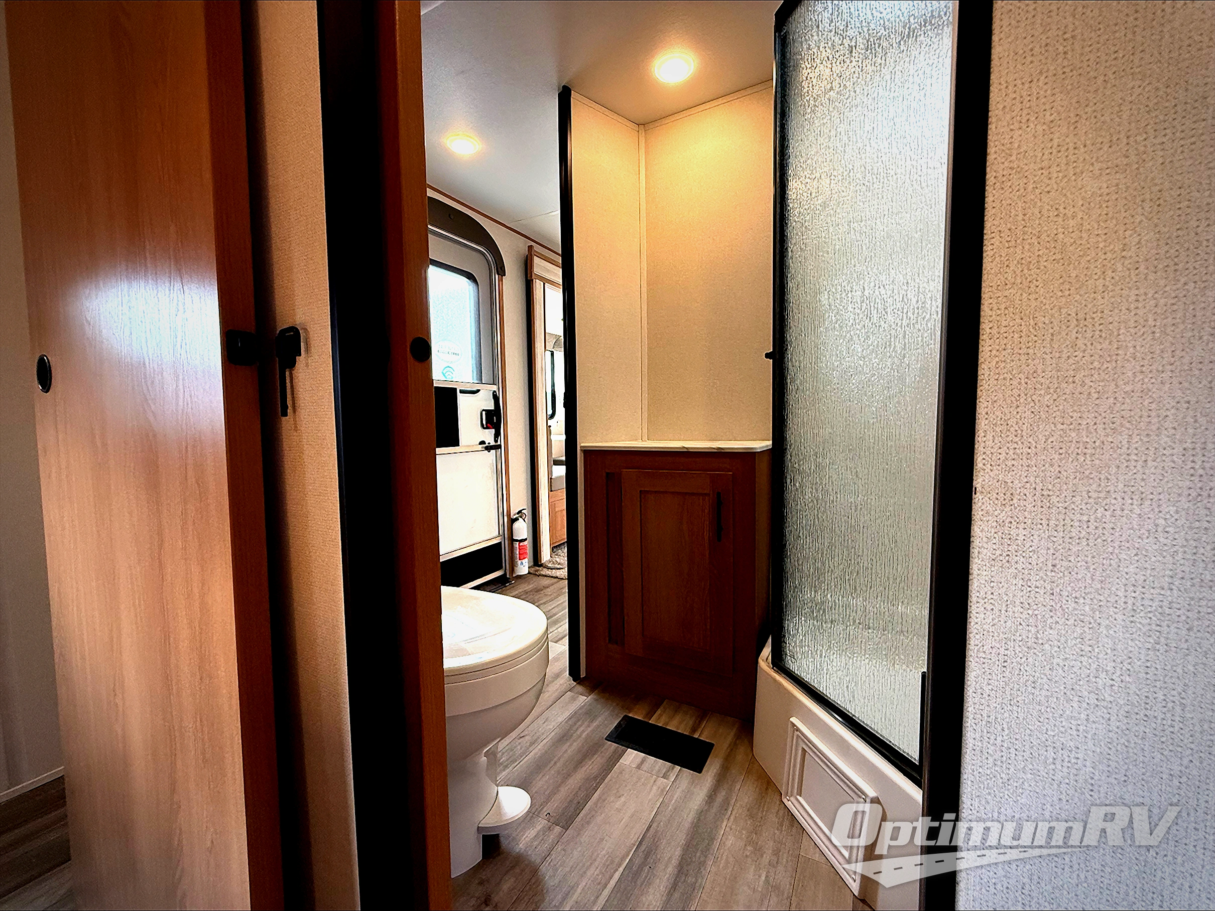 A couple or family will enjoy all the space in the main living and kitchen area, and the privacy in the front bedroom. As you spend each night sleeping on the queen-size bed in the master suite, you will appreciate the convenience of discreetly entering the full bathroom with a neo-angled shower without waking up your guests who are sleeping on the sofa or booth dinette. Because there have been two opposing slides included in the central living area, there is plenty of space to prep dinner or wash dishes on the kitchen island.