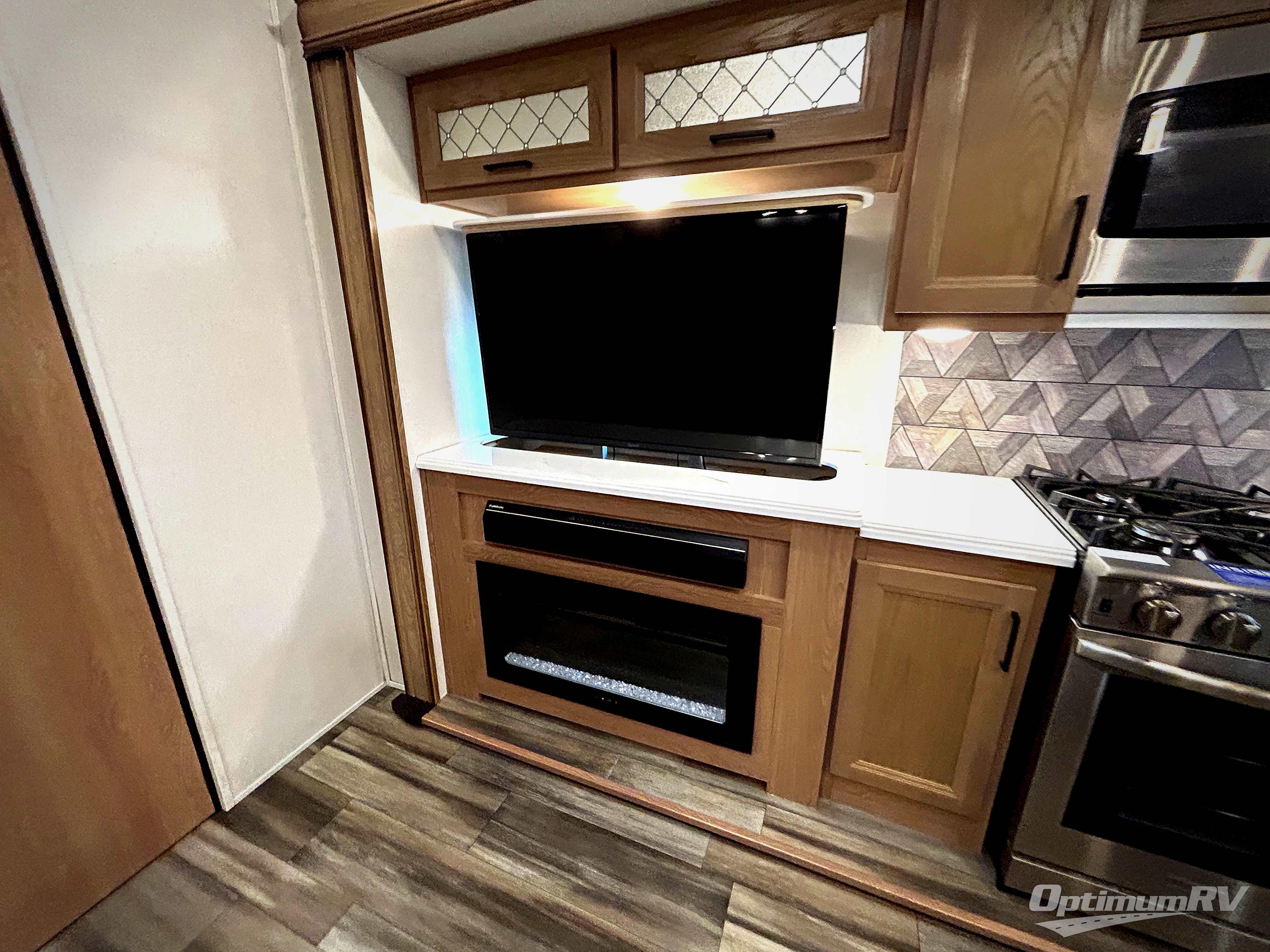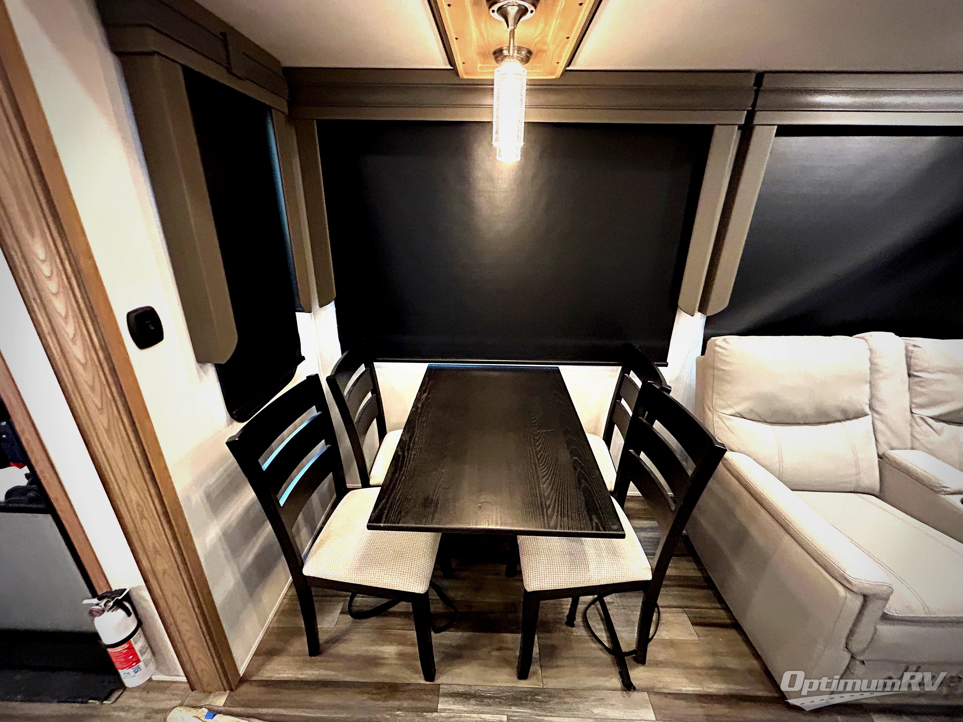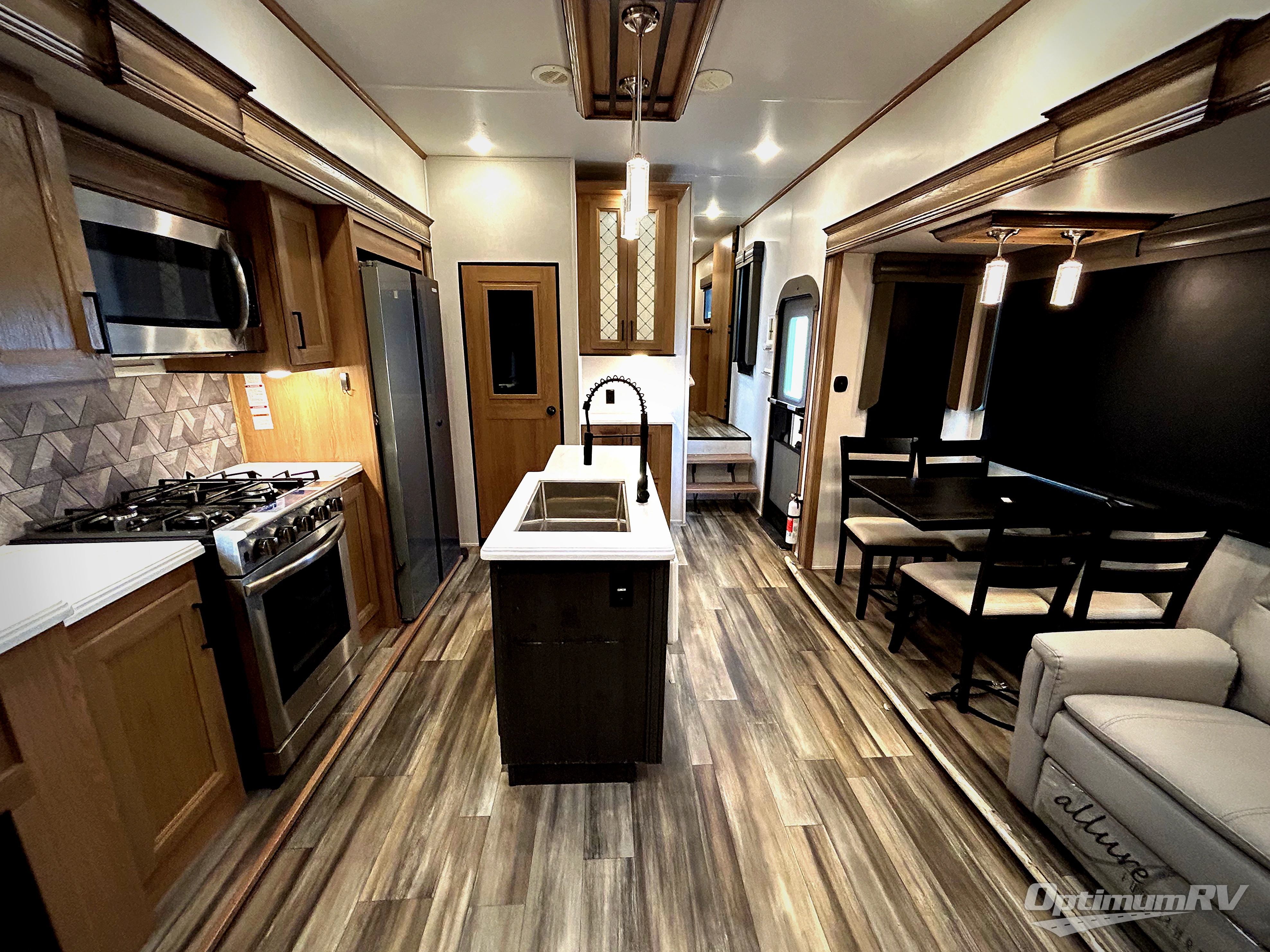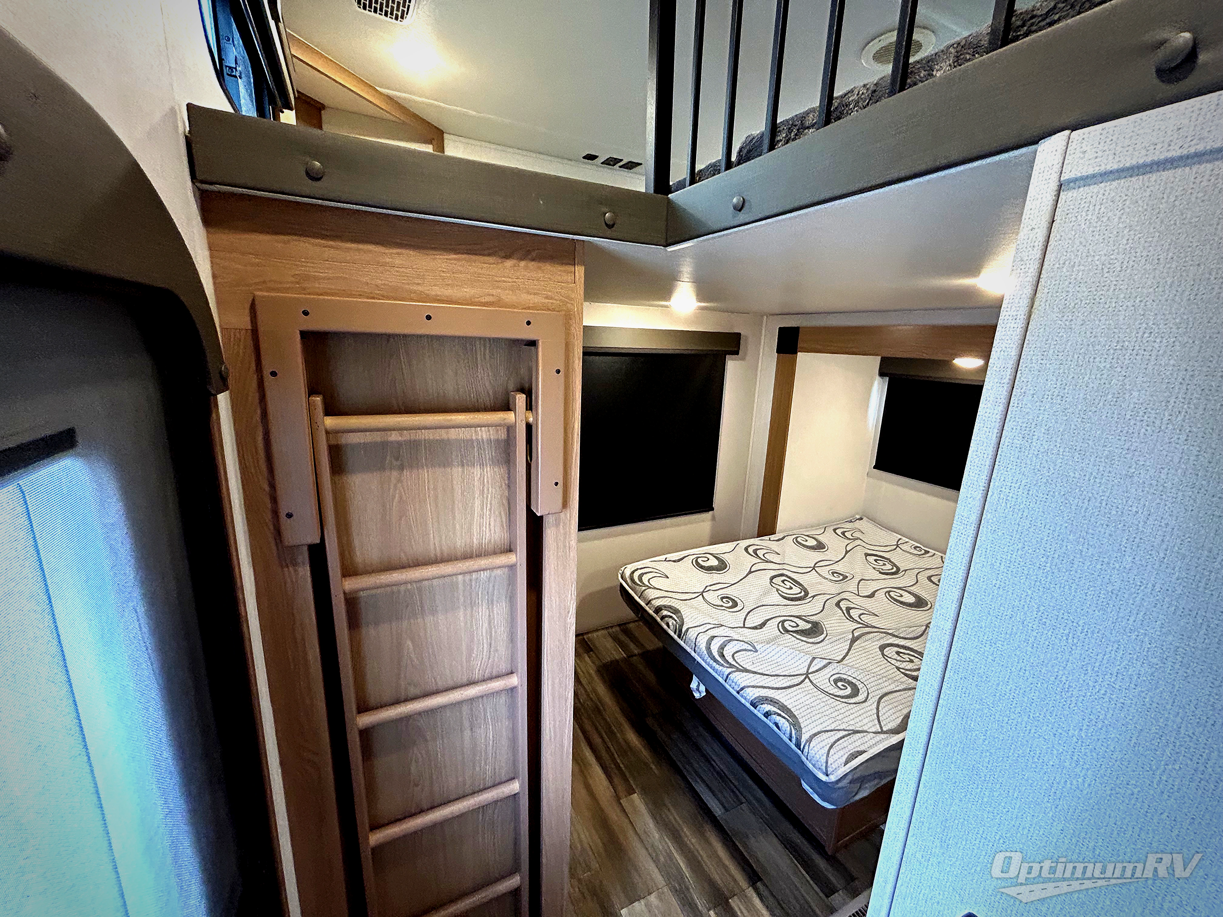 The whole family will have a fun time camping in this fifth wheel! The rear private bedroom has a 54" x 74" full bed with a loft above that has a 60" x 80" bunk mat and wardrobe, plus you can access the dual entry half bathroom from below. The 65" theater seating is directly across from the entertainment center with a 50" LED pop-up TV and a fireplace for a relaxing evening indoors. The kitchen has a four burner Furrion residential cooktop, a 15 cu. ft. residential refrigerator, and a 30" microwave to prepare your best meals, as well as a free standing dinette to enjoy them at and a walk-in pantry to store everyone's favorite snacks. The front private bedroom has a 72" x 80" king bed slide across from a dresser with TV prep, a front wardrobe with shelves and is prepped to add an optional washer and dryer to have clean clothes on extended trips.
