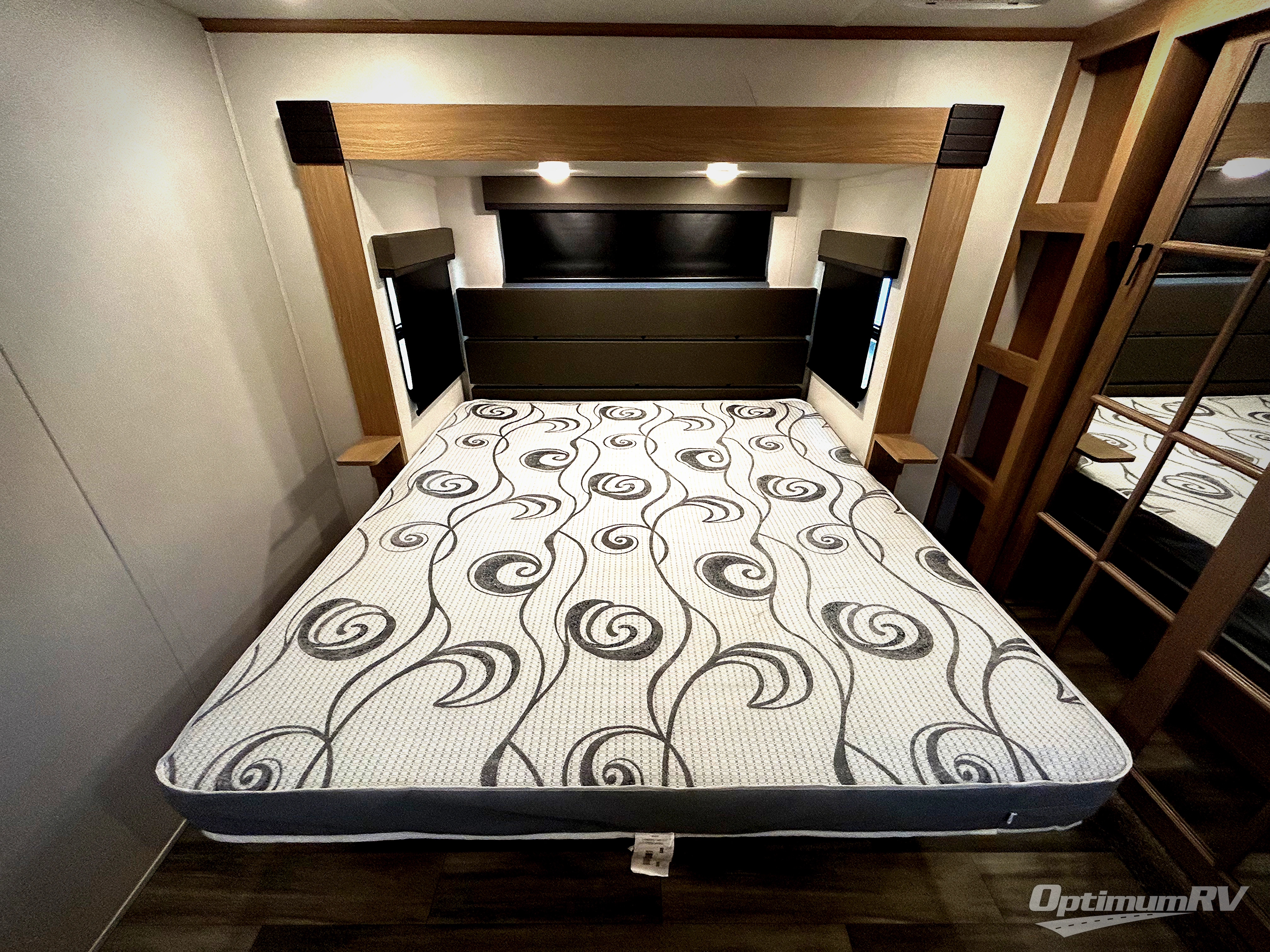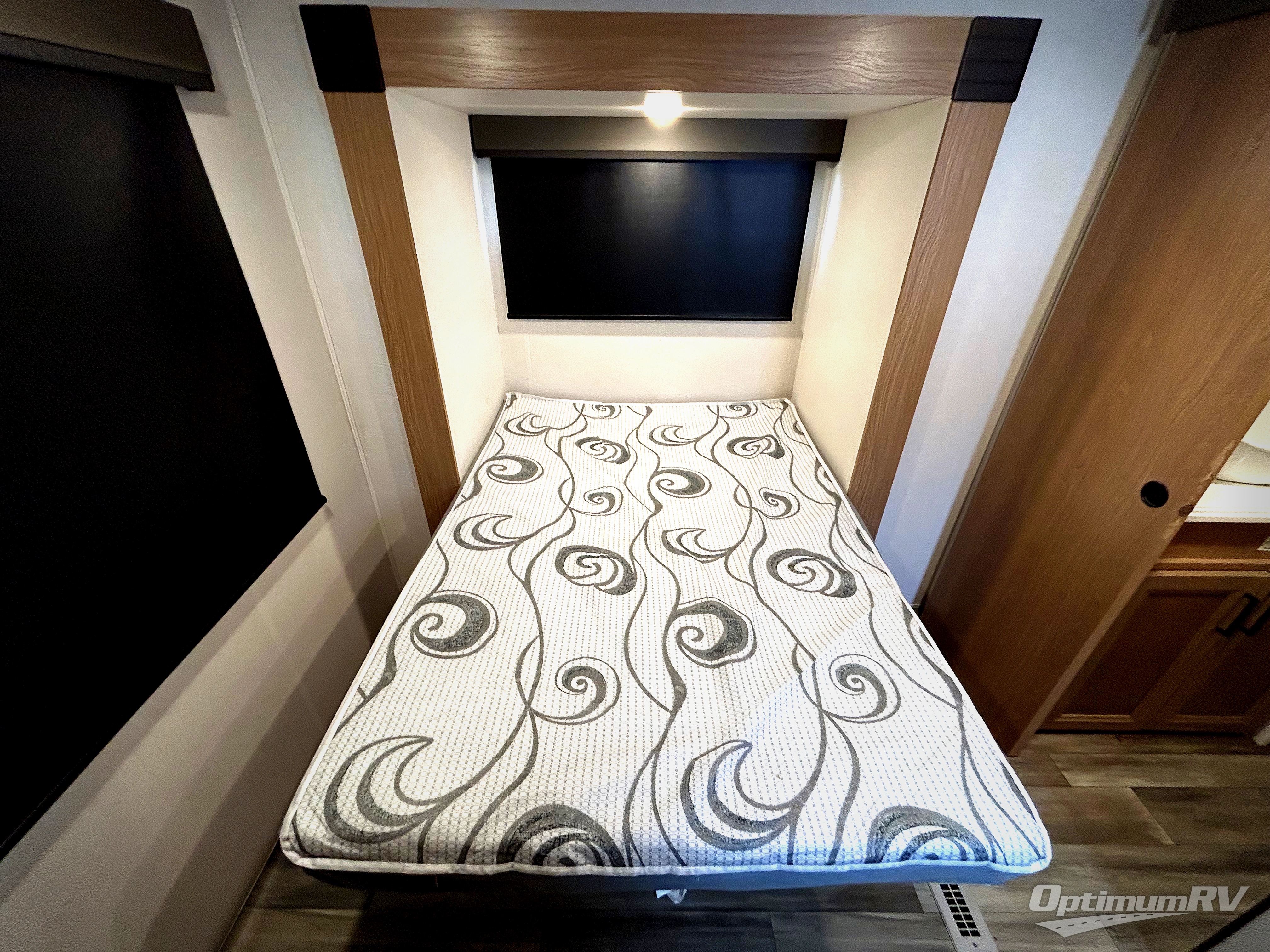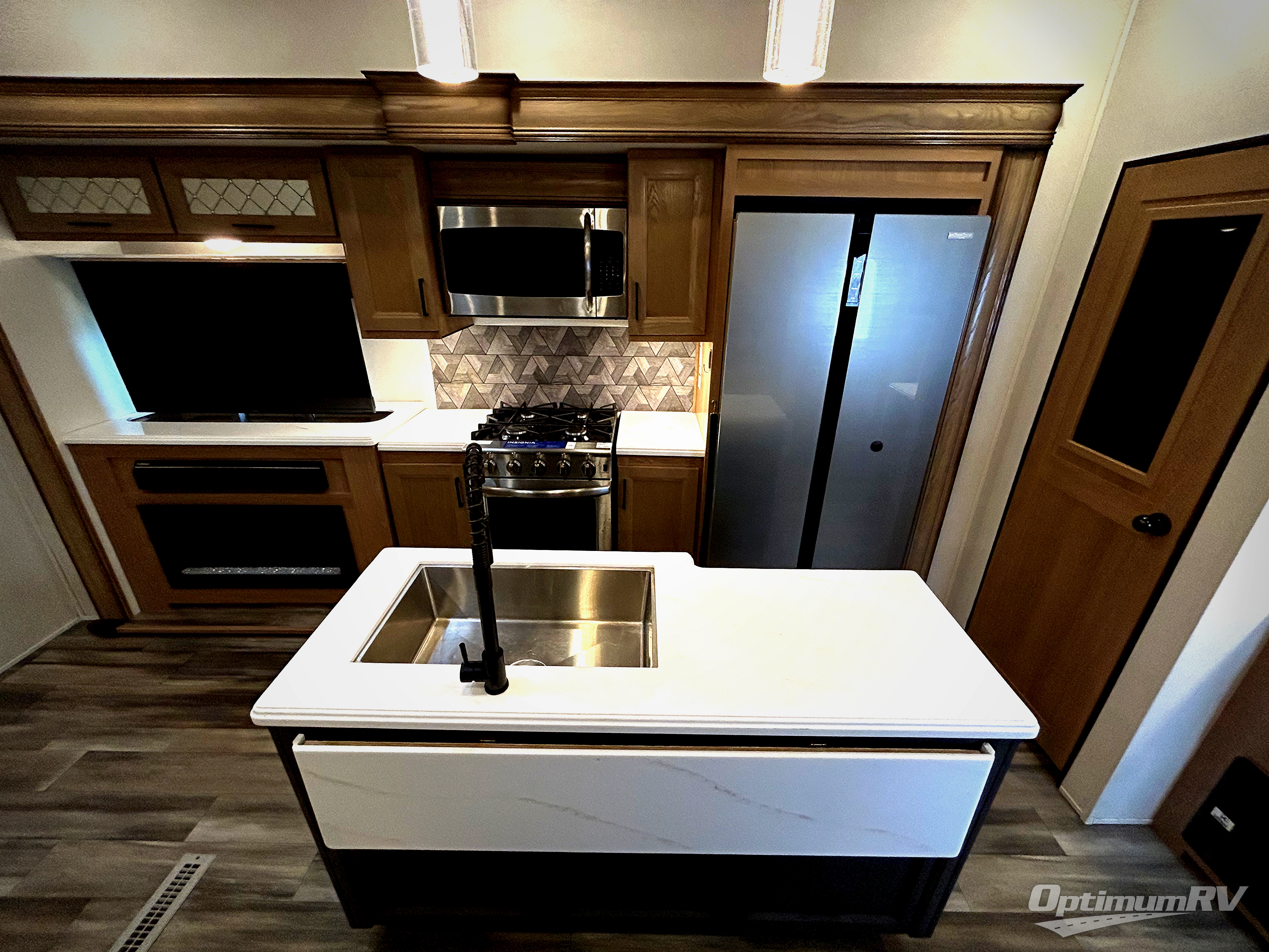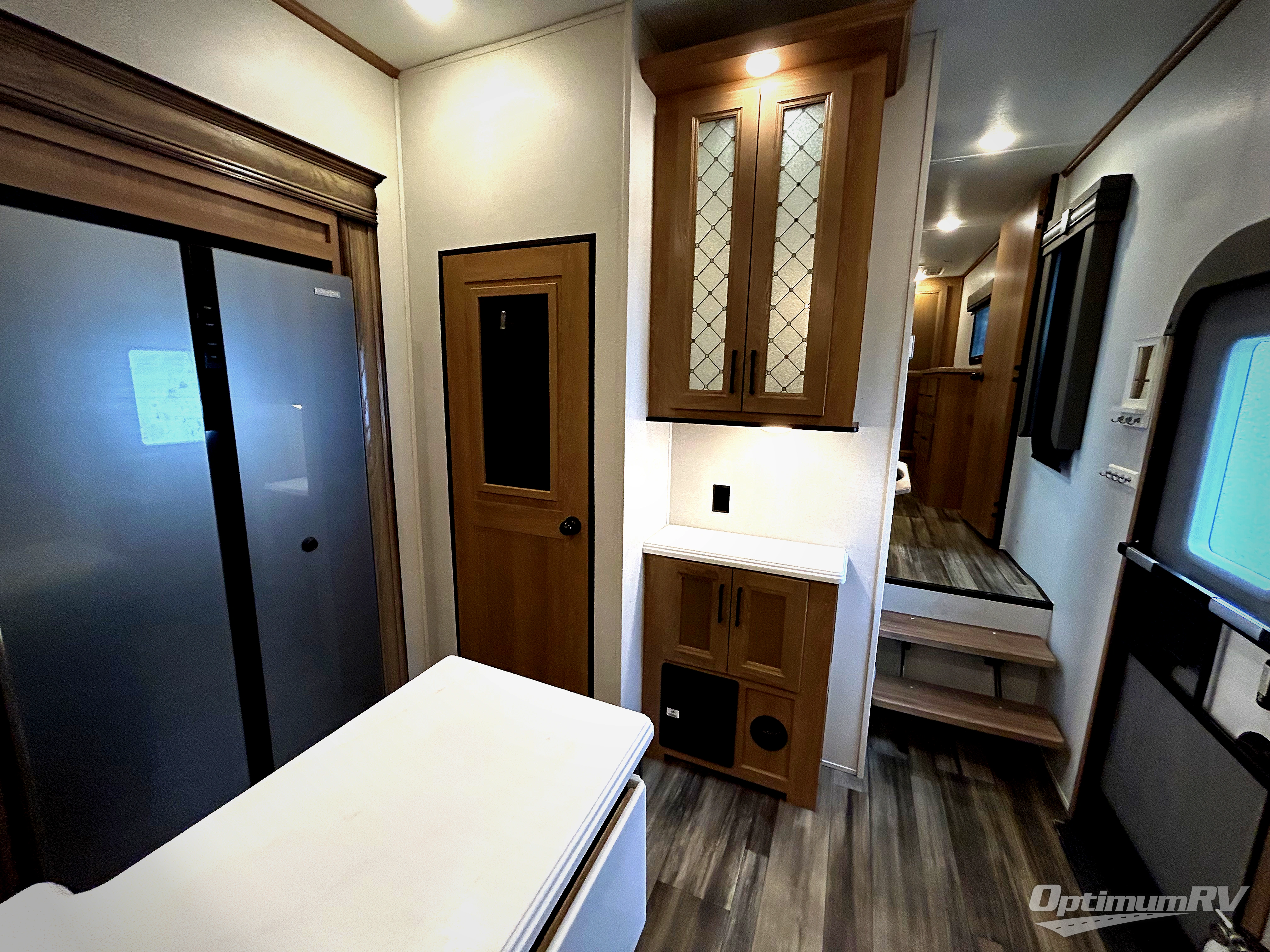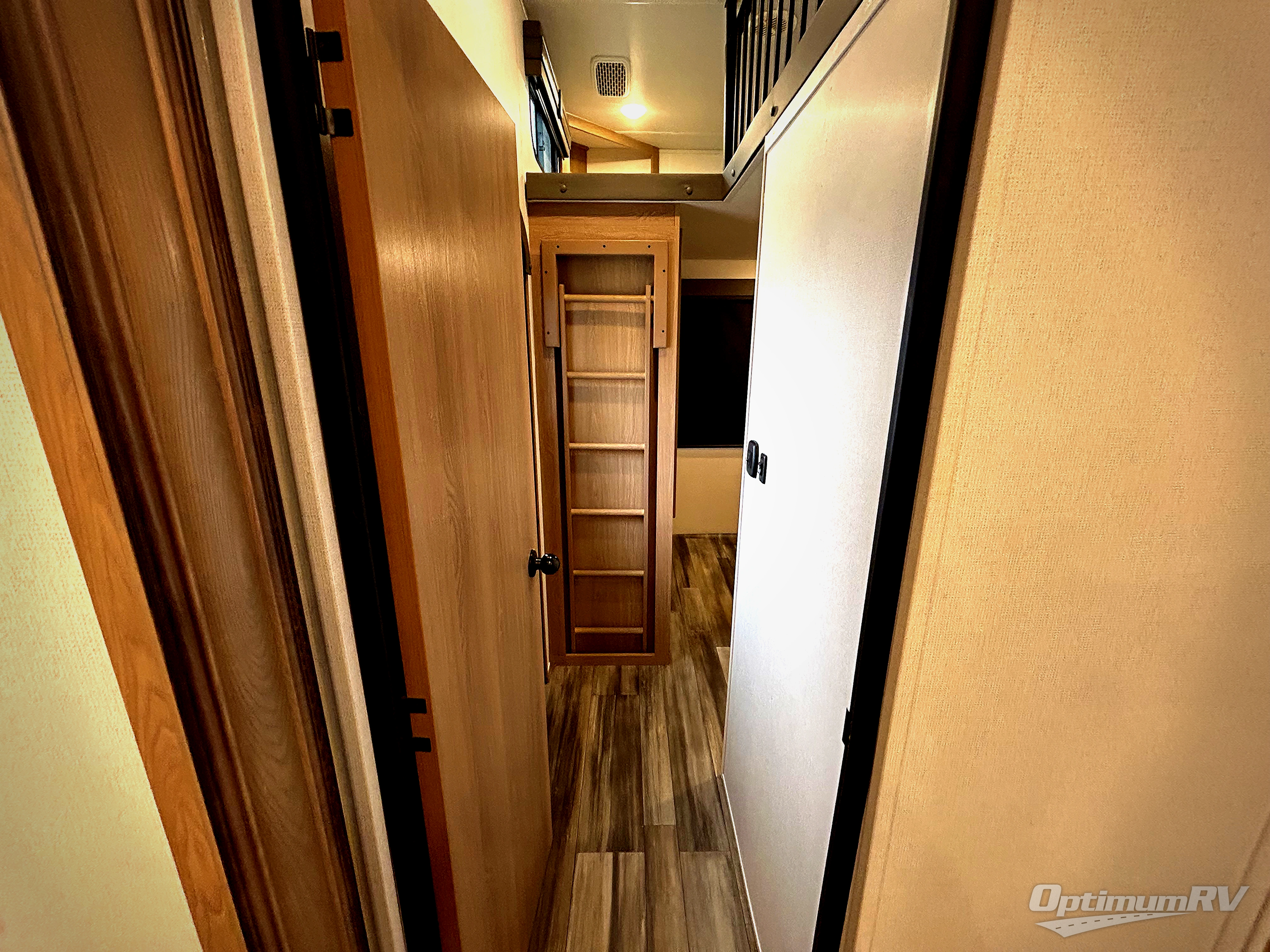 The whole family will have a fun time camping in this fifth wheel! The rear private bedroom has a 54" x 74" full bed with a loft above that has a 60" x 80" bunk mat and wardrobe, plus you can access the dual entry half bathroom from below. The 65" theater seating is directly across from the entertainment center with a 50" LED pop-up TV and a fireplace for a relaxing evening indoors. The kitchen has a four burner Furrion residential cooktop, a 15 cu. ft. residential refrigerator, and a 30" microwave to prepare your best meals, as well as a free standing dinette to enjoy them at and a walk-in pantry to store everyone's favorite snacks. The front private bedroom has a 72" x 80" king bed slide across from a dresser with TV prep, a front wardrobe with shelves and is prepped to add an optional washer and dryer to have clean clothes on extended trips.