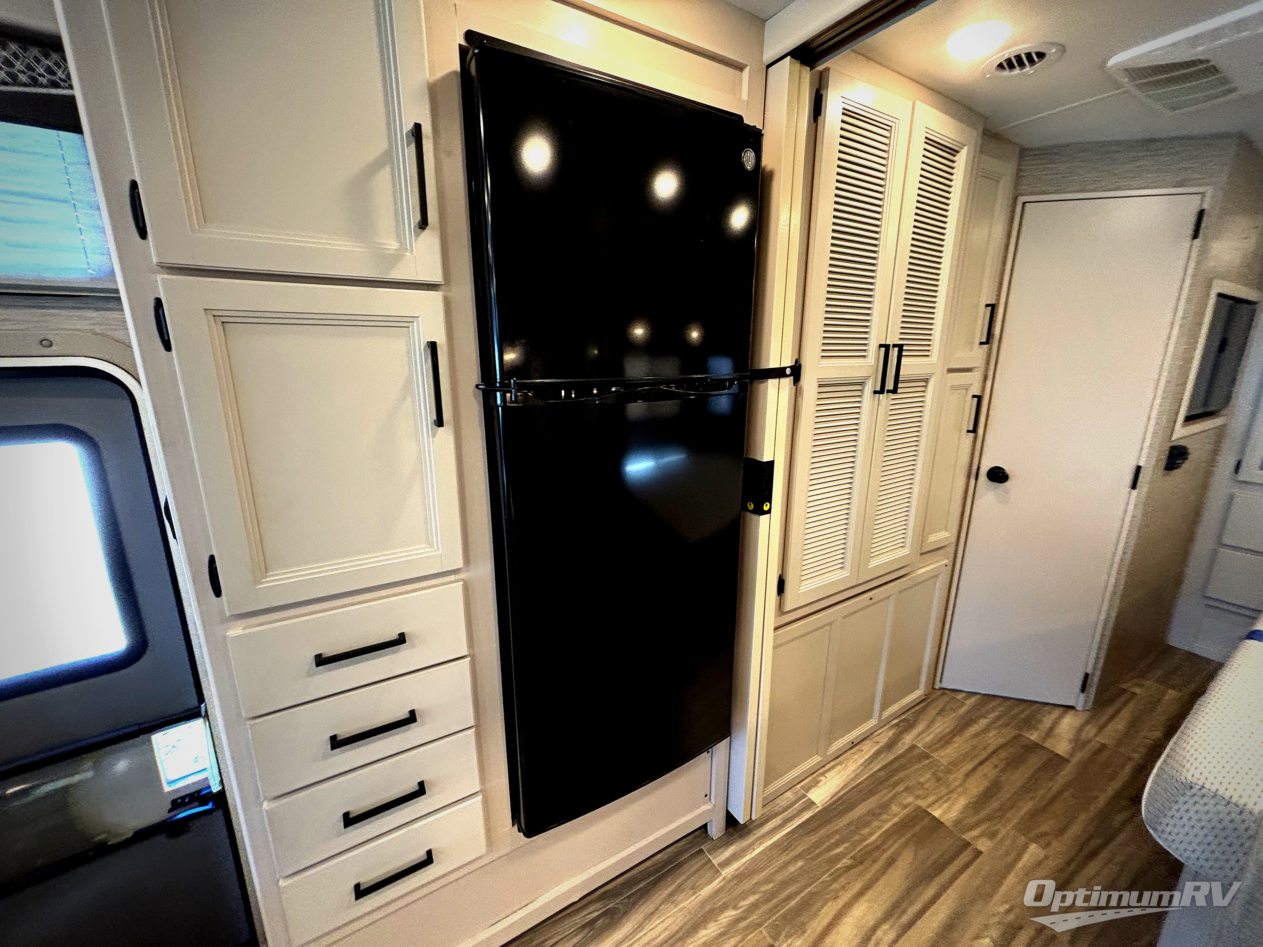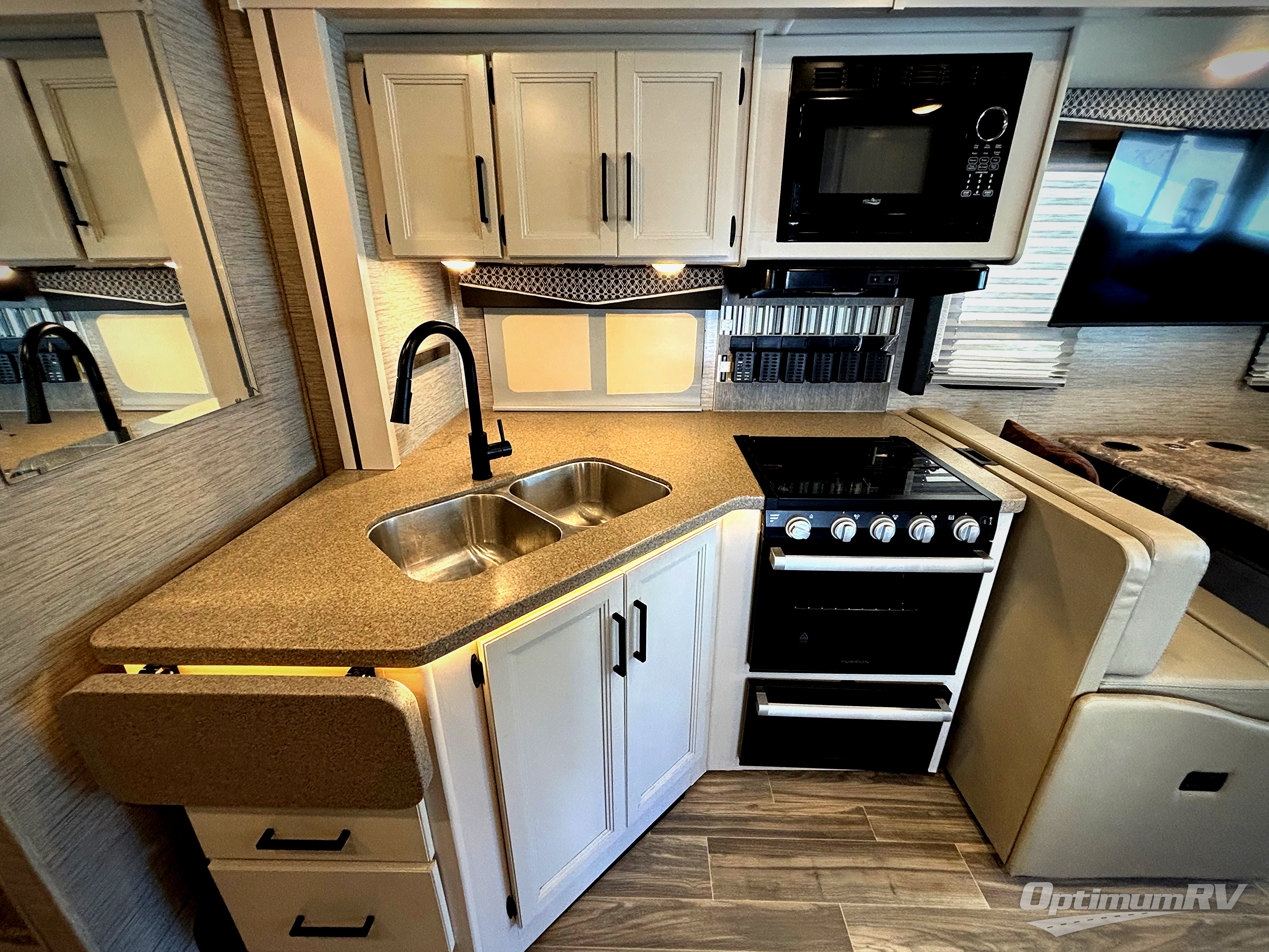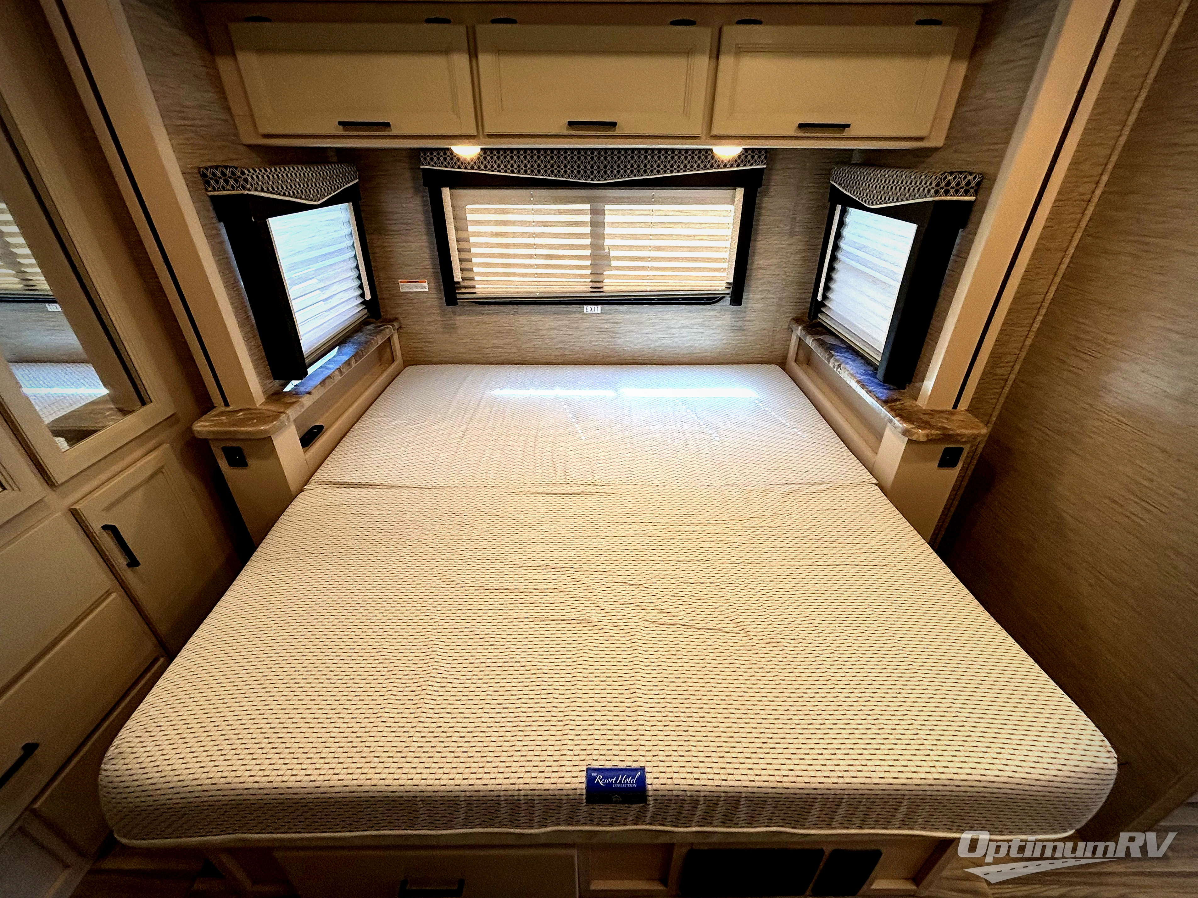 The A.C.E Class A gas motorhome is constructed with a welded tubular steel floor, vacu-bond laminated roof, walls and floor with block foam insulation, and a premium one-piece exterior roof for a coach made to last. You will love the pet-friendly features, like the Bird's Eye window, the Pet-Link multi-purpose tie-down and the Pull-Out Kibble Station with an FDS approved pet bowl liner. Each model includes an Onan RV QG 4,000 gas generator, a Winegard ConnecT Wi-Fi extender +4G, and are pre-wired for solar charging. Some of the other convenient amenities you will find on the A.C.E are frameless windows, a basement pass-through storage, and an exterior LP connection. Head inside to find residential vinyl flooring, pressed laminate countertops, glass tile backsplash in the kitchen, and a designer headboard, bedspread and pillow shams in the bedroom for all-around comfort!
