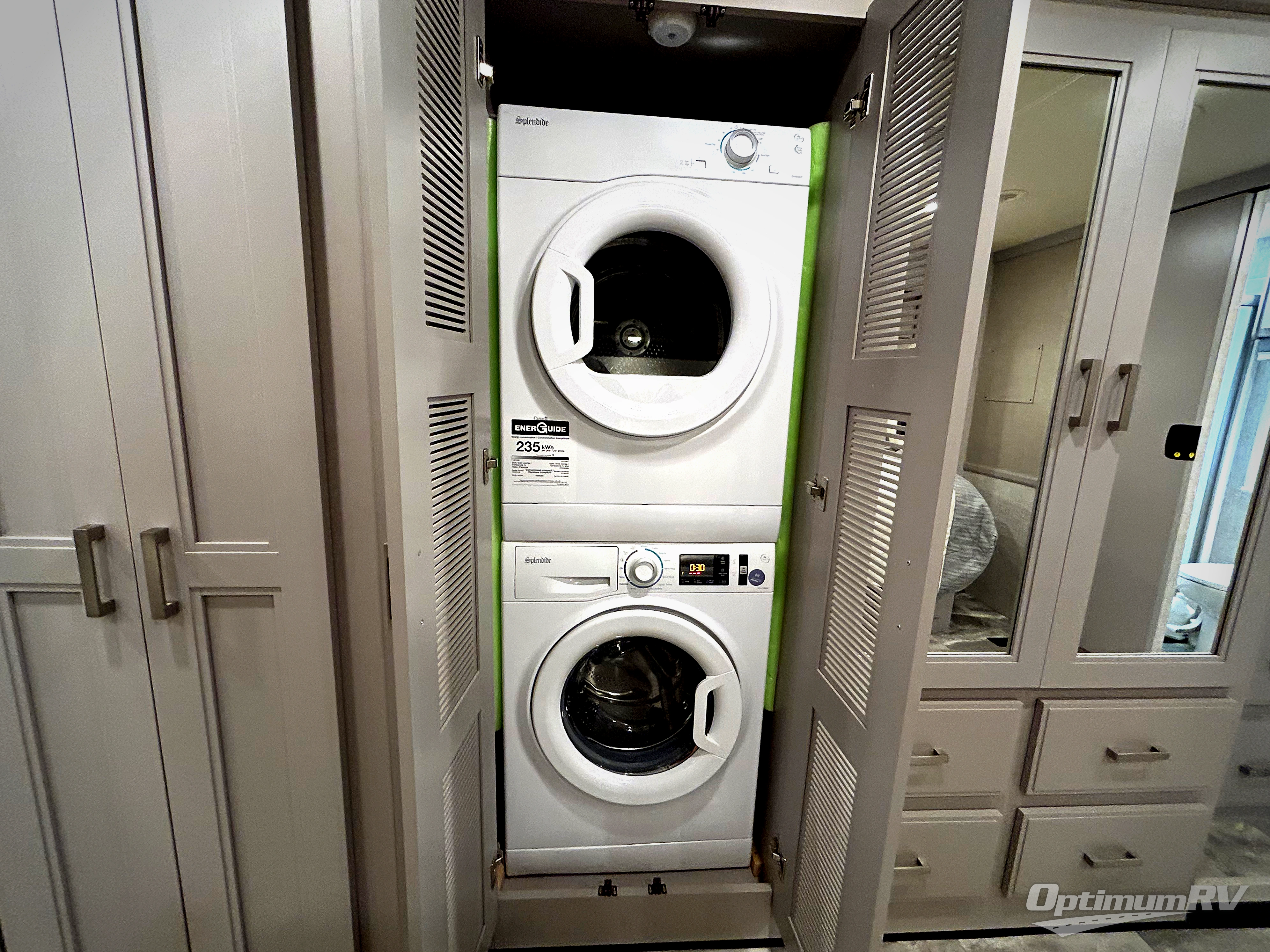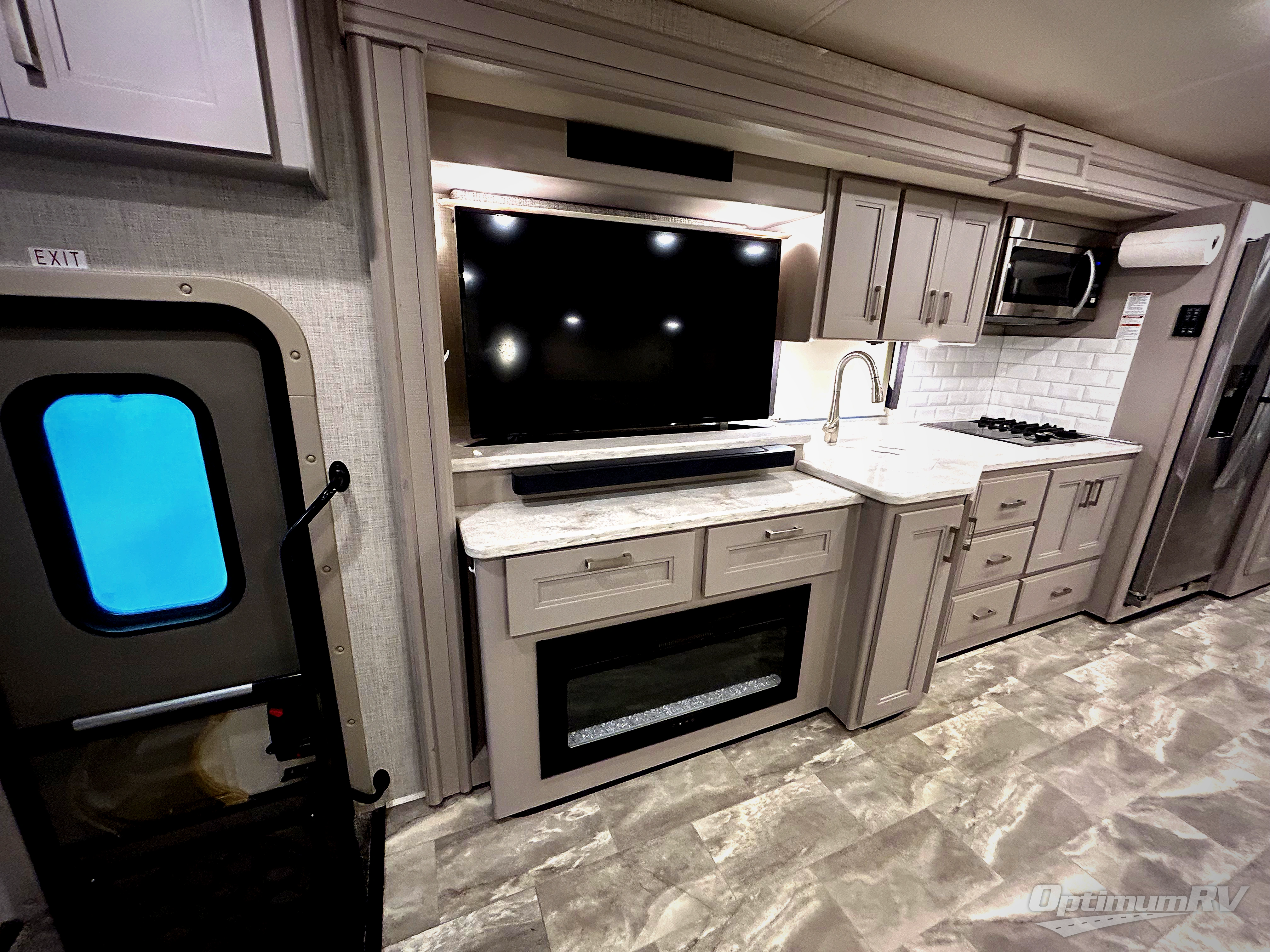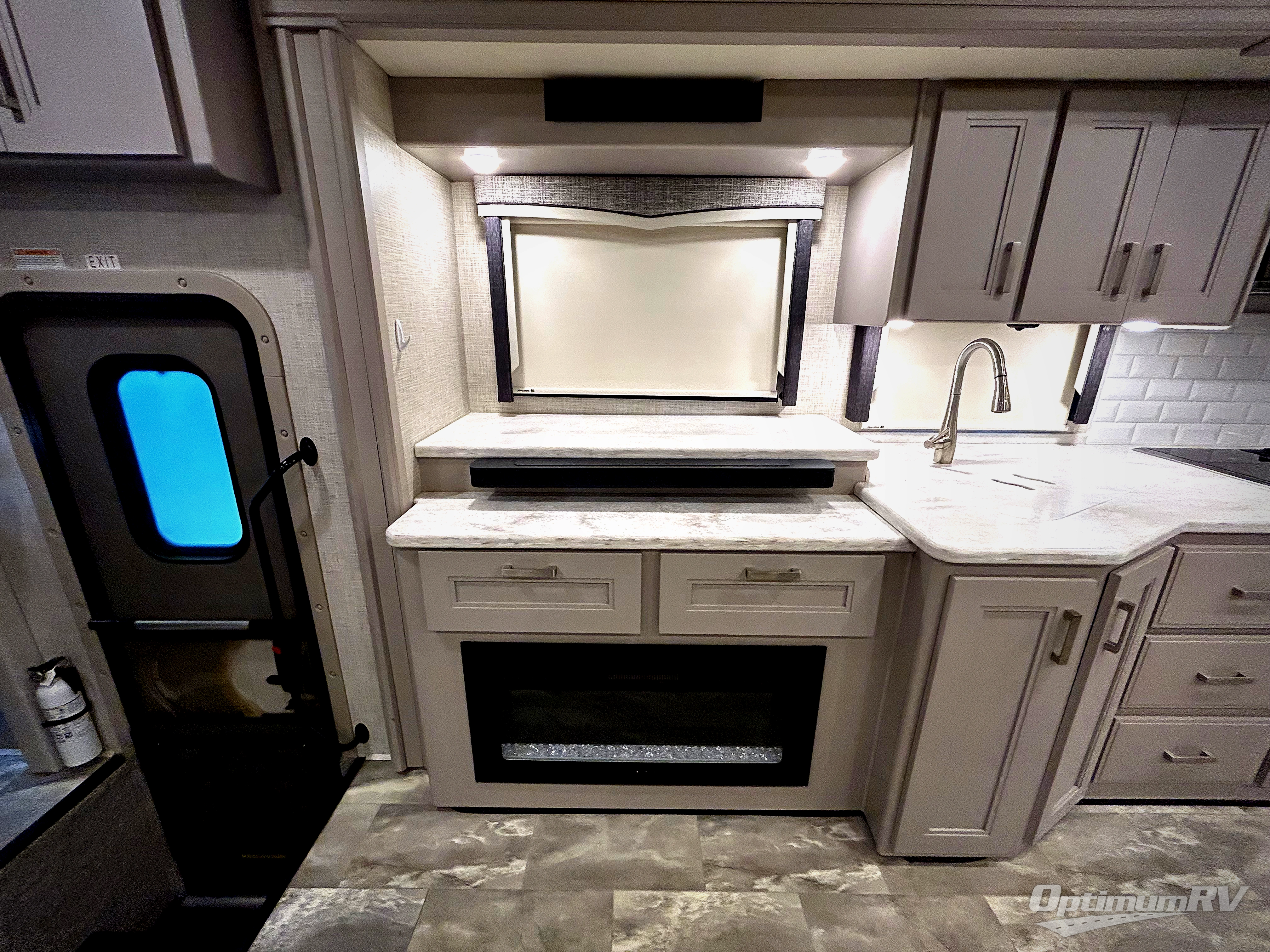 This motorhome features a full-wall slide, plus two additional slides for maximum space and comfort. You can sleep seven people thanks to the drop-down overhead bunk, the king bed slide out, and the furniture in the main living area. The fireplace and retractable 50" TV will make it feel a little more like home, and the residential kitchen is any chef's dream. Since this model includes a bath and a half, your guests won't have to wait in line, and you'll find plenty of storage space throughout for everyone's belongings.