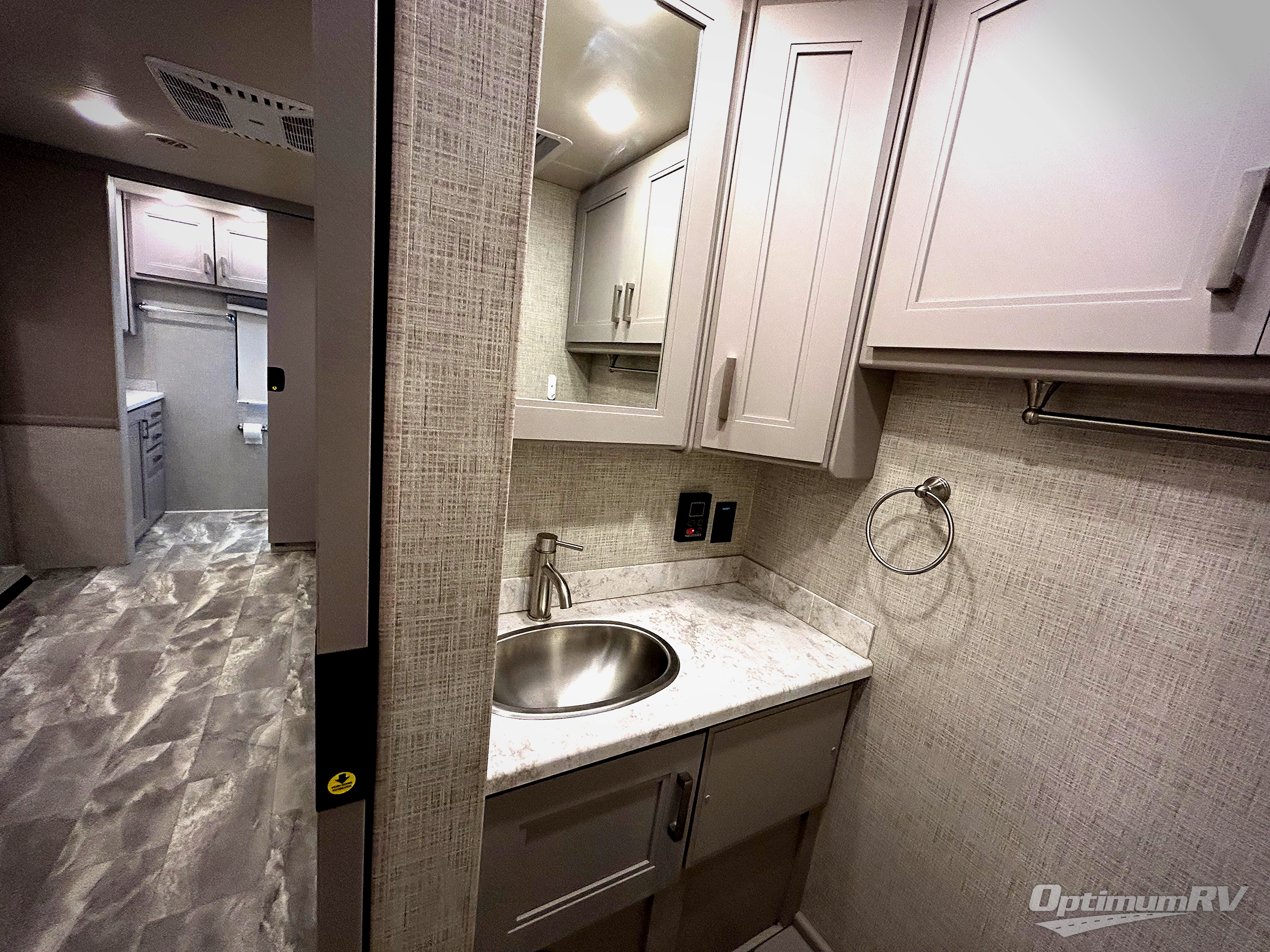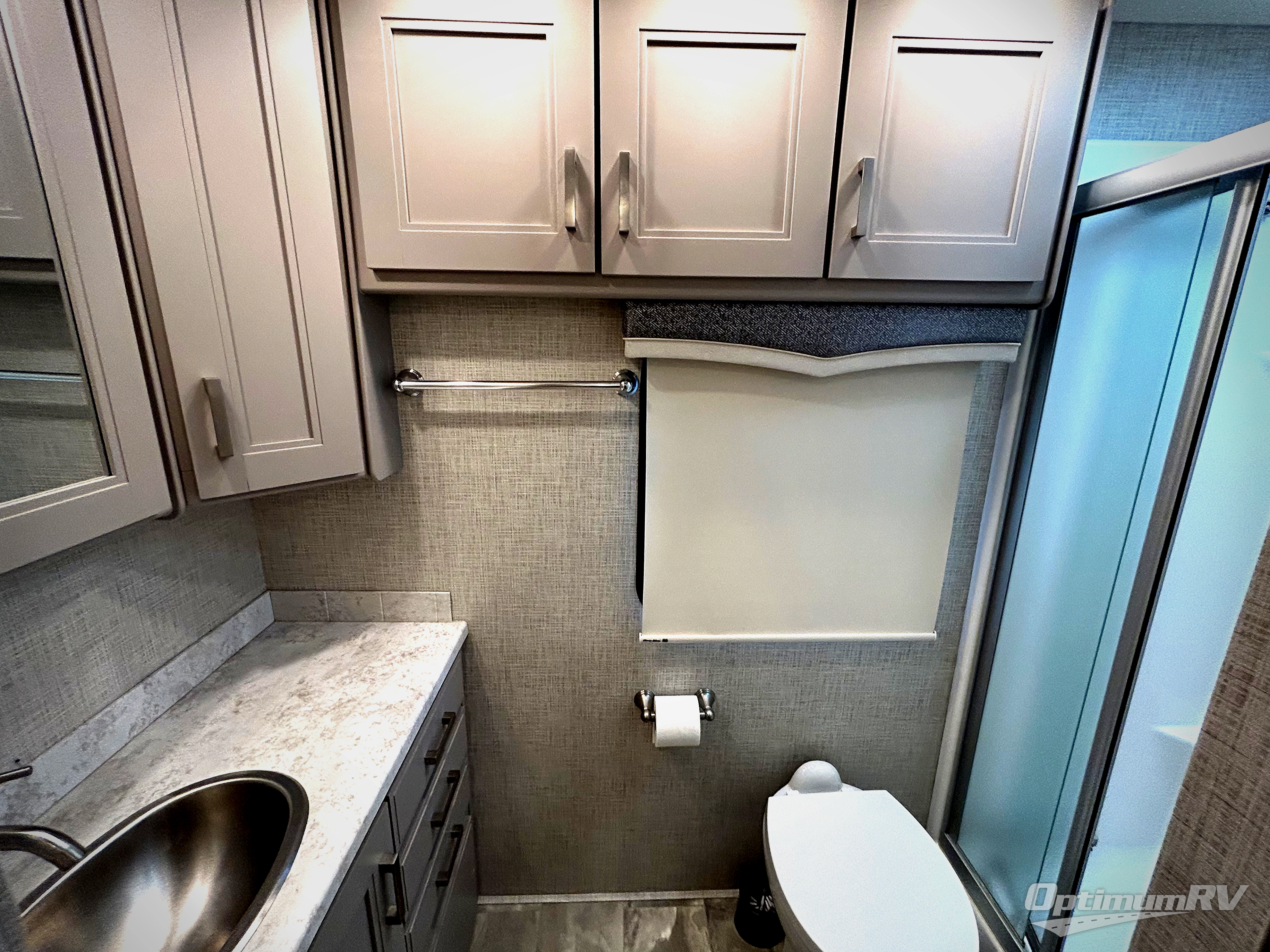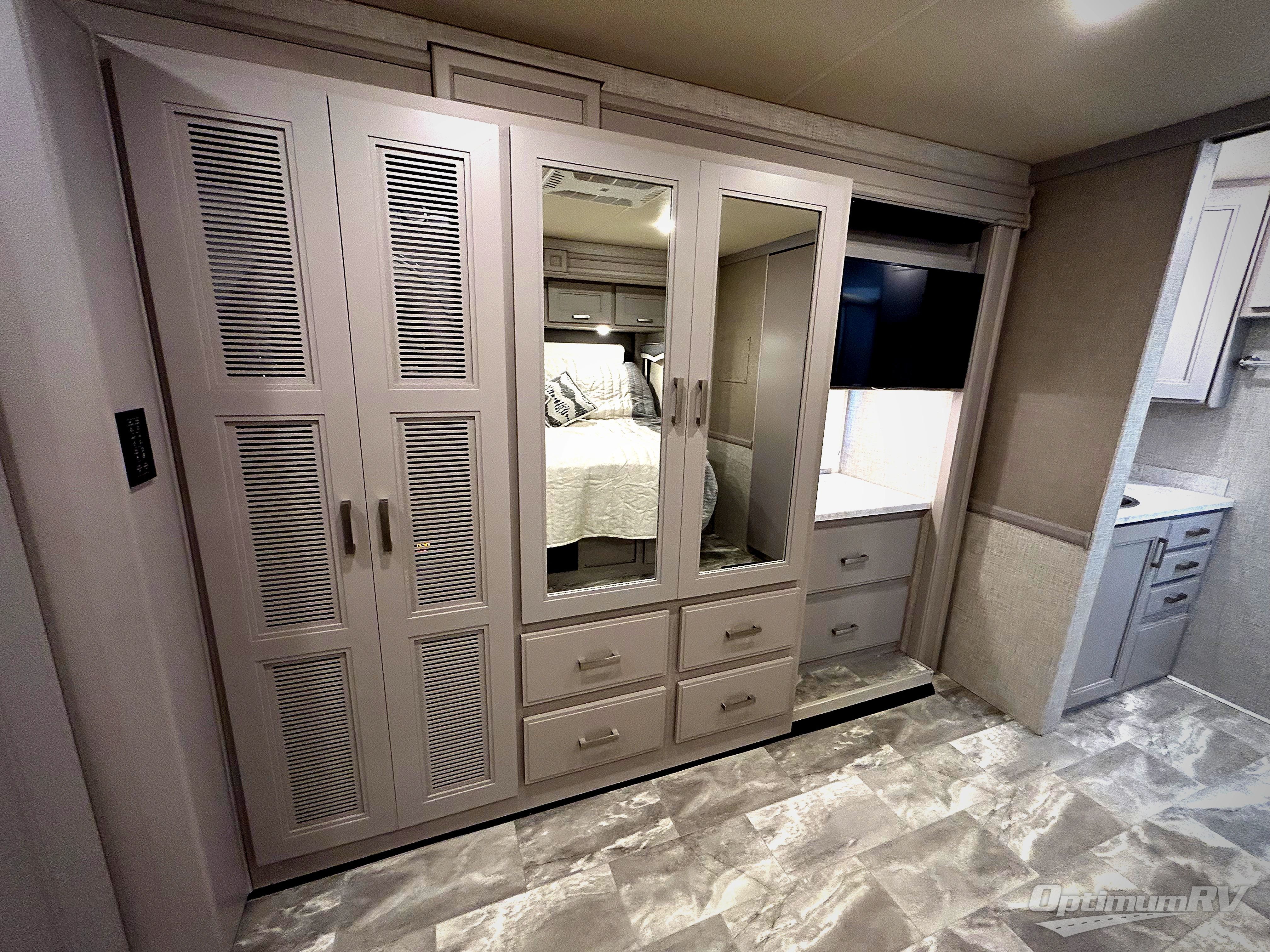 This motorhome features a full-wall slide, plus two additional slides for maximum space and comfort. You can sleep seven people thanks to the drop-down overhead bunk, the king bed slide out, and the furniture in the main living area. The fireplace and retractable 50" TV will make it feel a little more like home, and the residential kitchen is any chef's dream. Since this model includes a bath and a half, your guests won't have to wait in line, and you'll find plenty of storage space throughout for everyone's belongings.