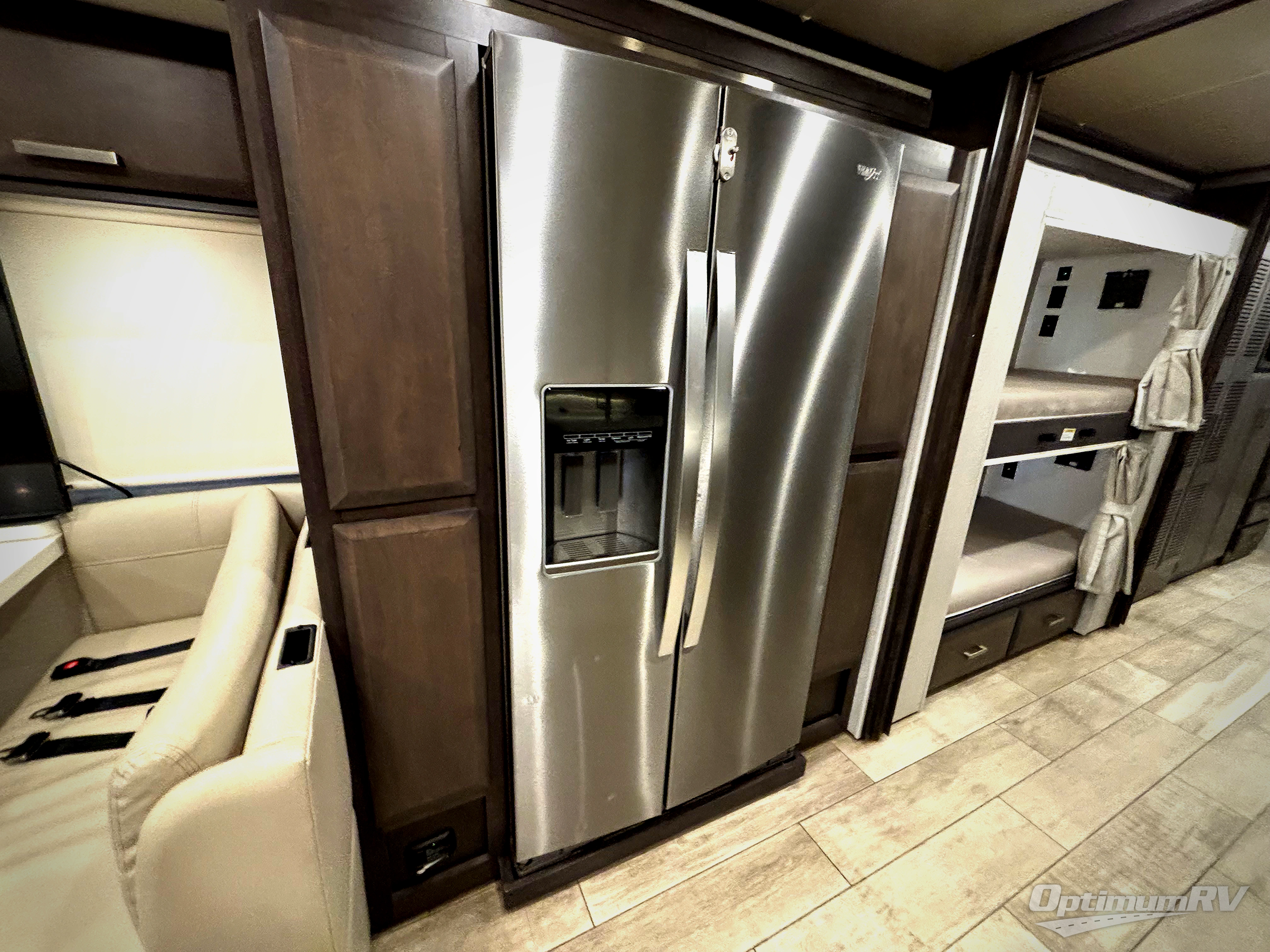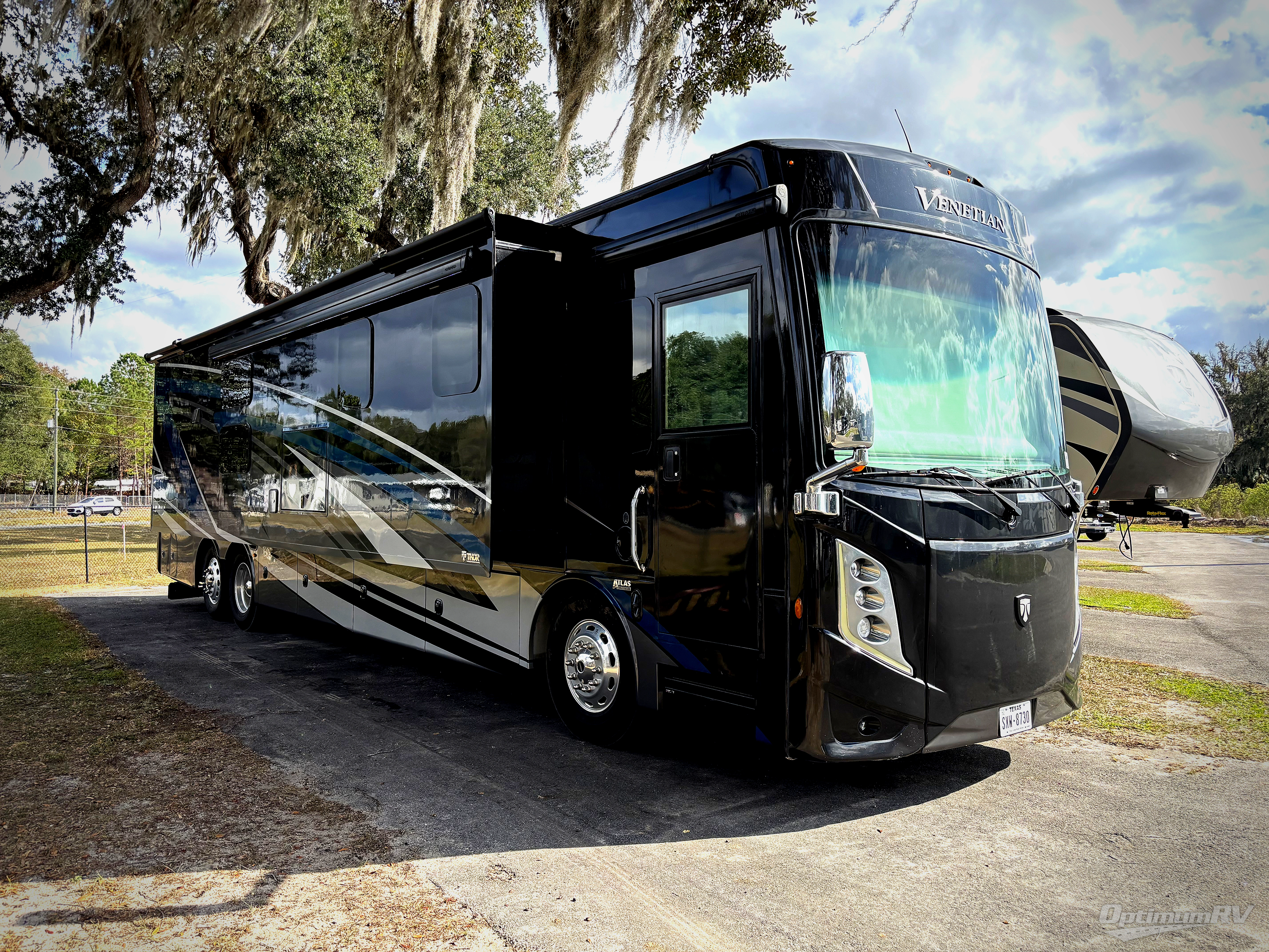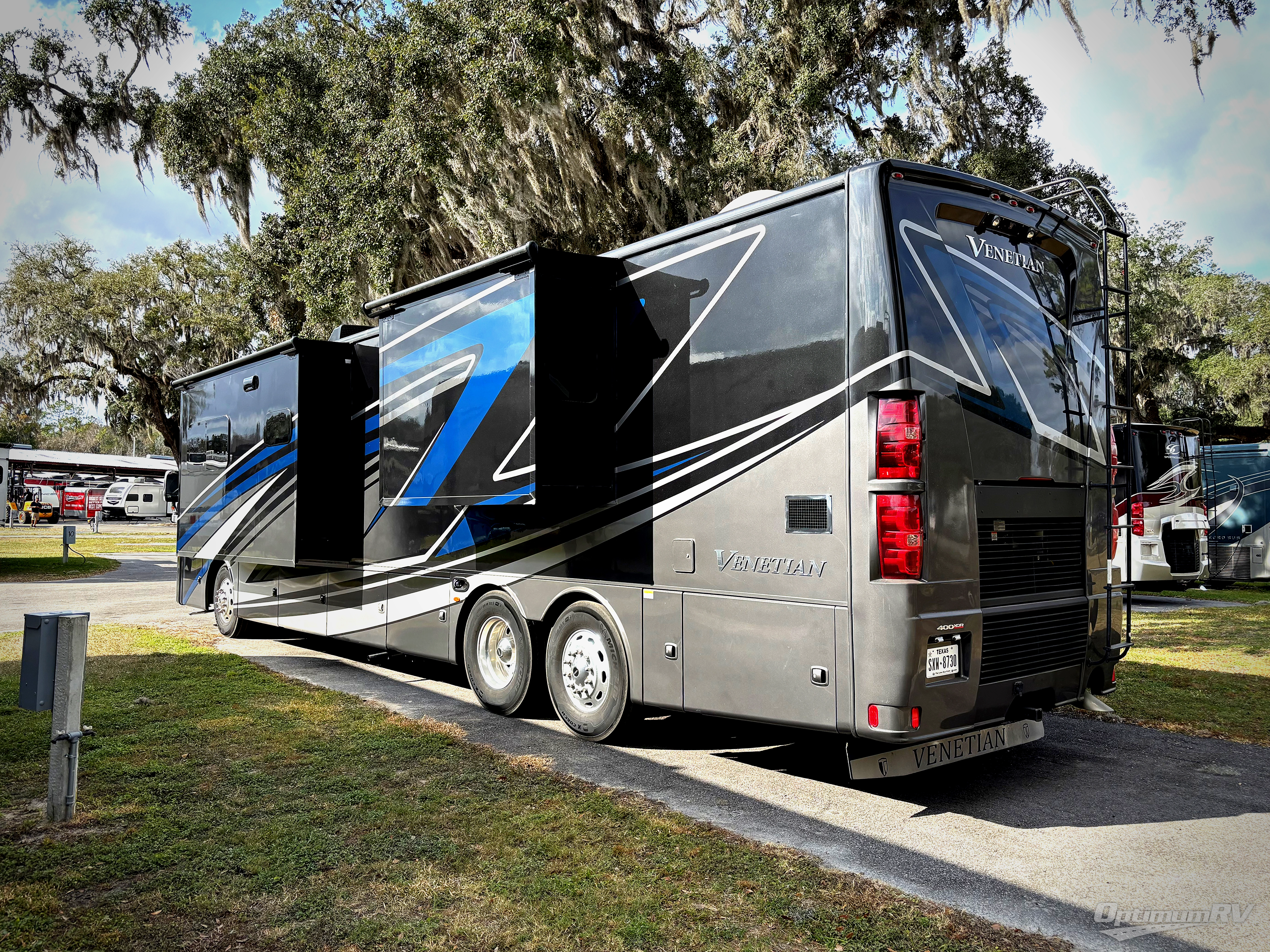 This Venetian Class A diesel motorhome has a high amount of luxury with two full bathrooms! One of those bathrooms is even included back in a master suite for you to enjoy, and this bathroom contains a dual-sink vanity to help you both get ready with ease. You'll have quite a lot of sleeping space too with the inclining king bed, 27" x 74" bunk beds, 80" sofa, 90" Dream Dinette, and 48" x 74" drop-down bunk above the cab. On top of that, you have the storage space and entertainment needed for all of those people with the two linen closets, a bedroom closet and dresser, two kitchen pantries, a residential refrigerator, and four LED HDTVs.