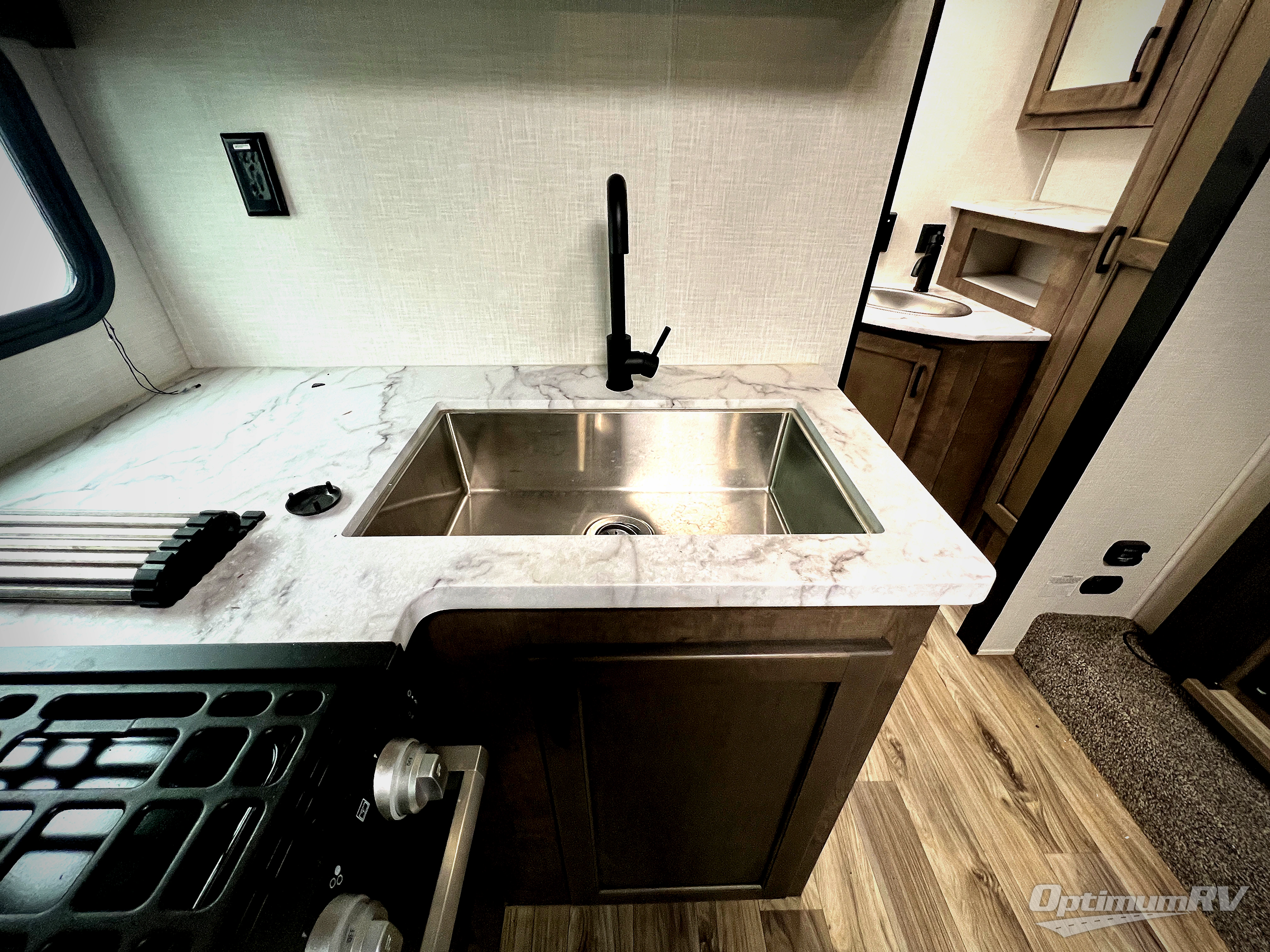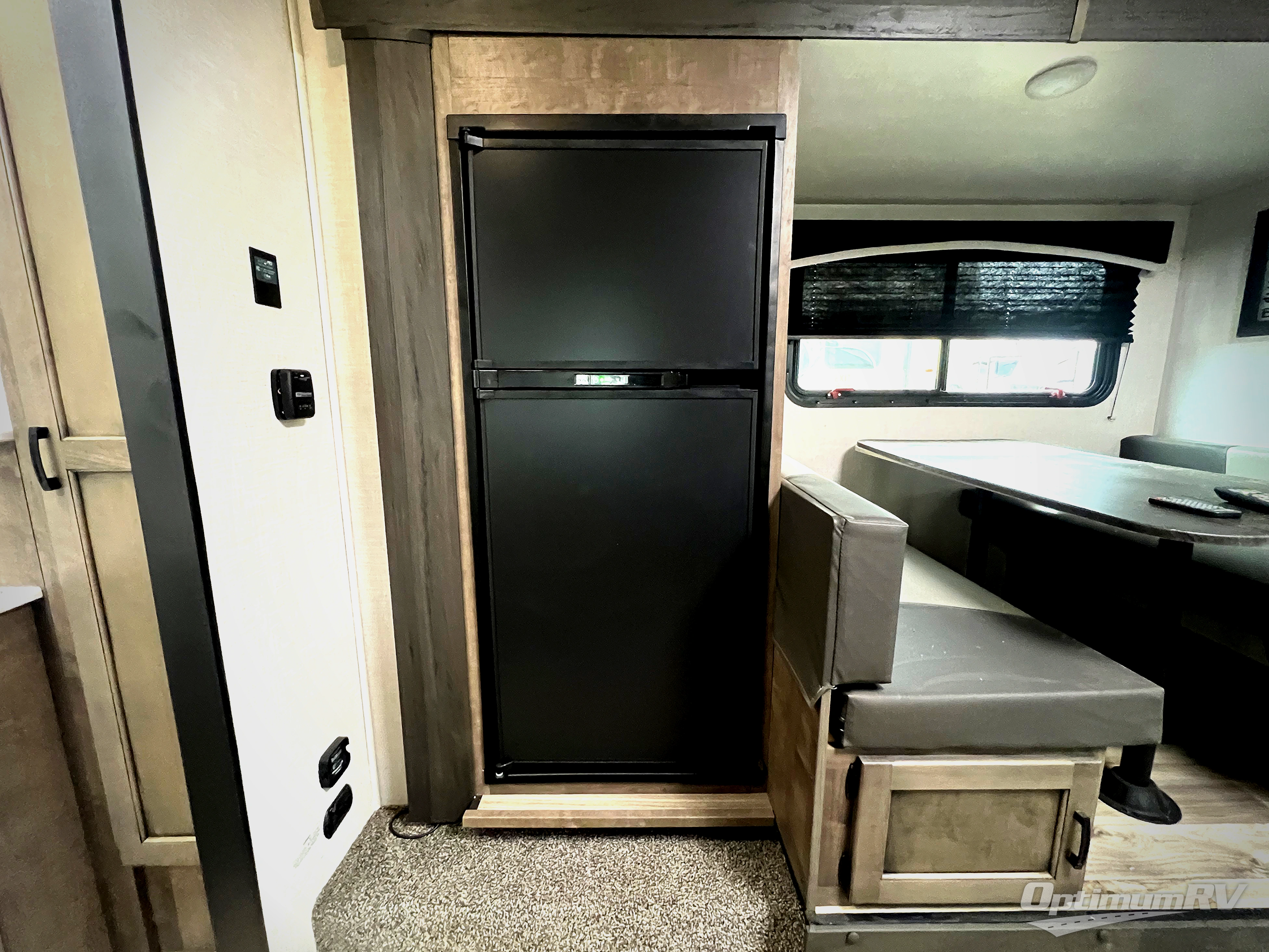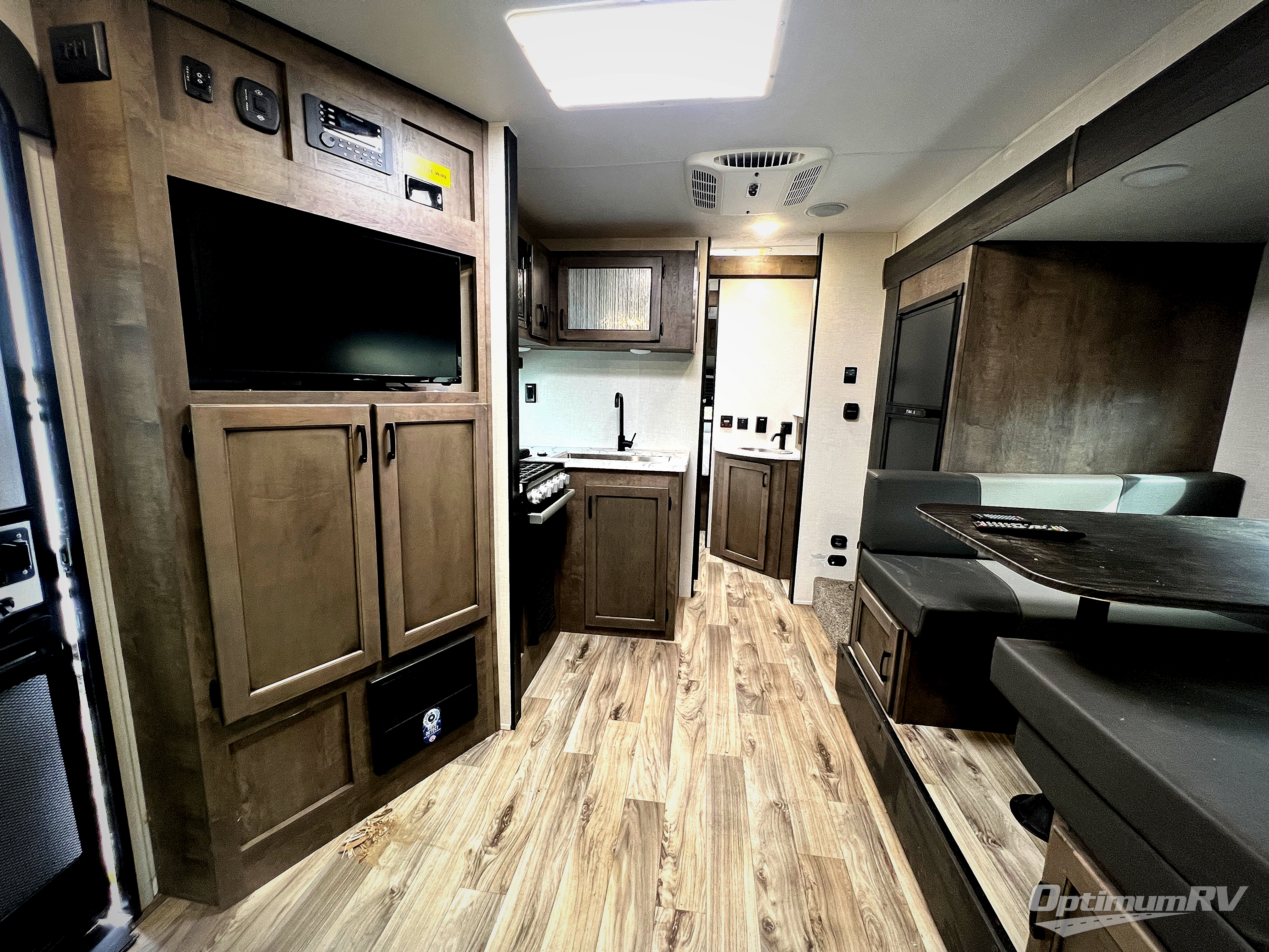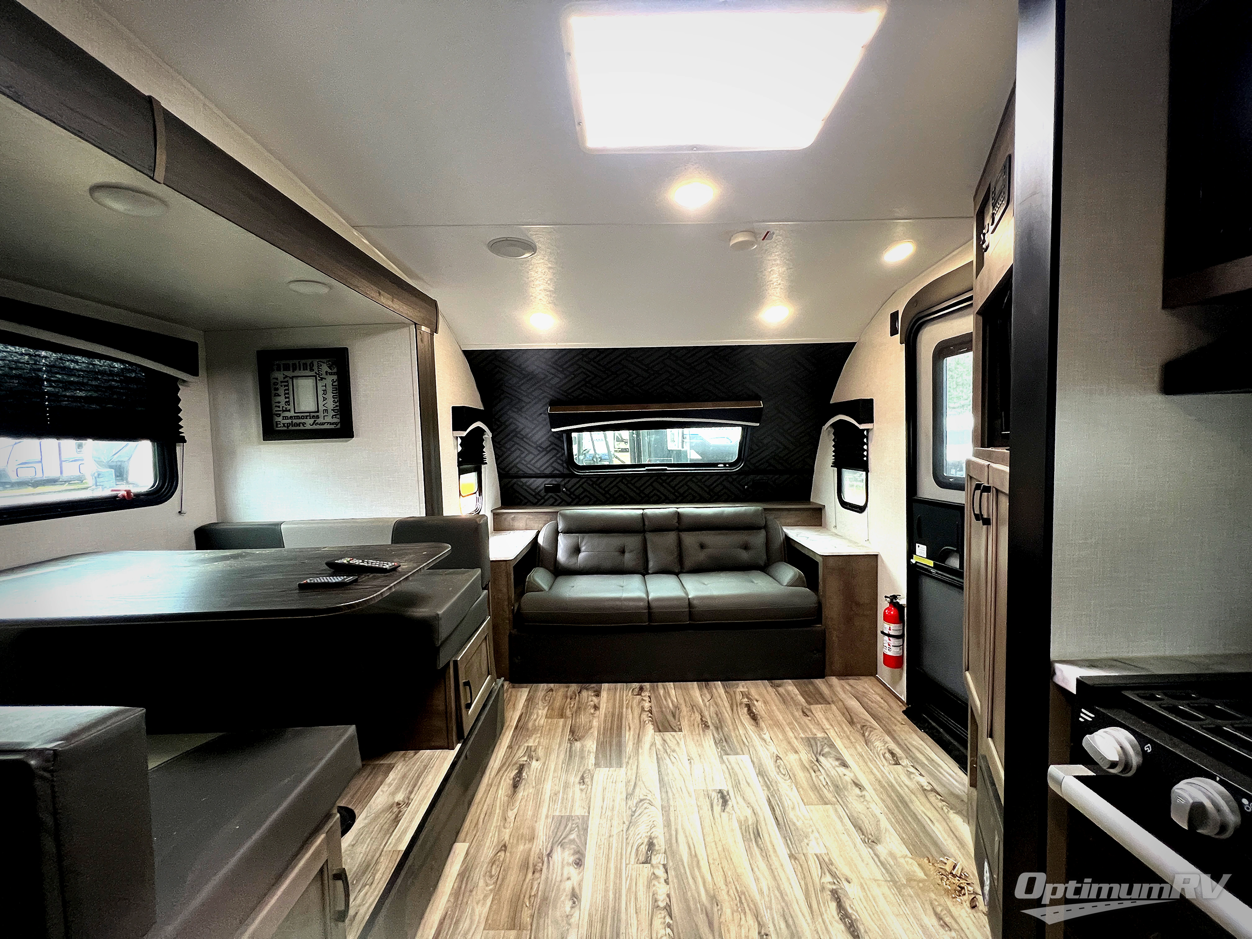 You will enjoy relaxing outside and inside with a 17' power awning that provides an outdoor living area protected from the elements, just add your camping chairs that are stowed away in the rear pass-through storage with motion-activated light, and the interior provides a 64" jiffy sofa up front and a booth dinette. Both of these furnishings offer sleeping space for family and friends when you are ready to call it a night. The L-shaped counter in the kitchen area provides a large sink and a three-burner range, and the 8 cu. ft. refrigerator is within the slide out. Easily access the walk-through bath from this area as well as the rear private bedroom which offers an RV queen bed, dual wardrobes, windows and StorMore bedside nightstands with a 110V outlet and USB charging.