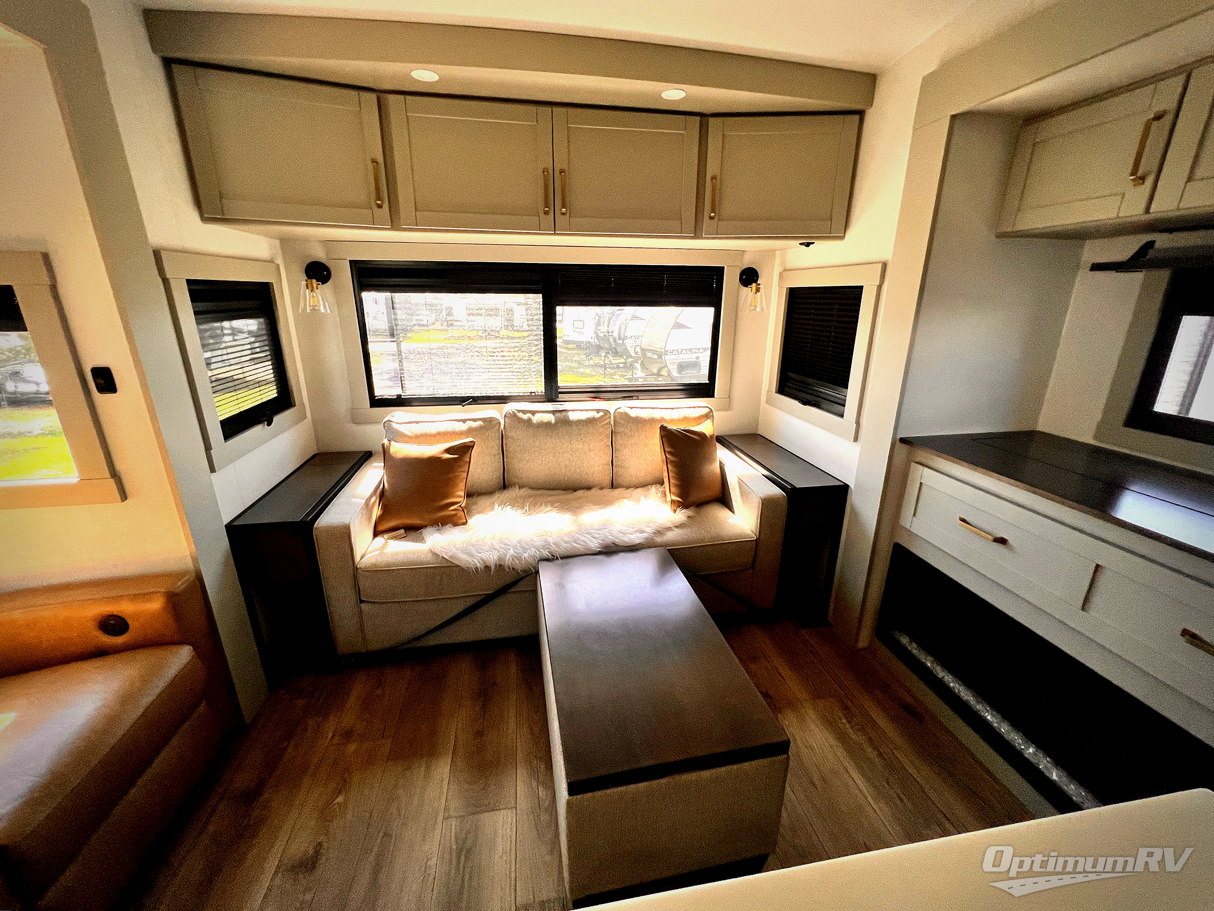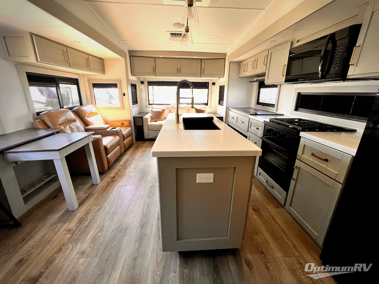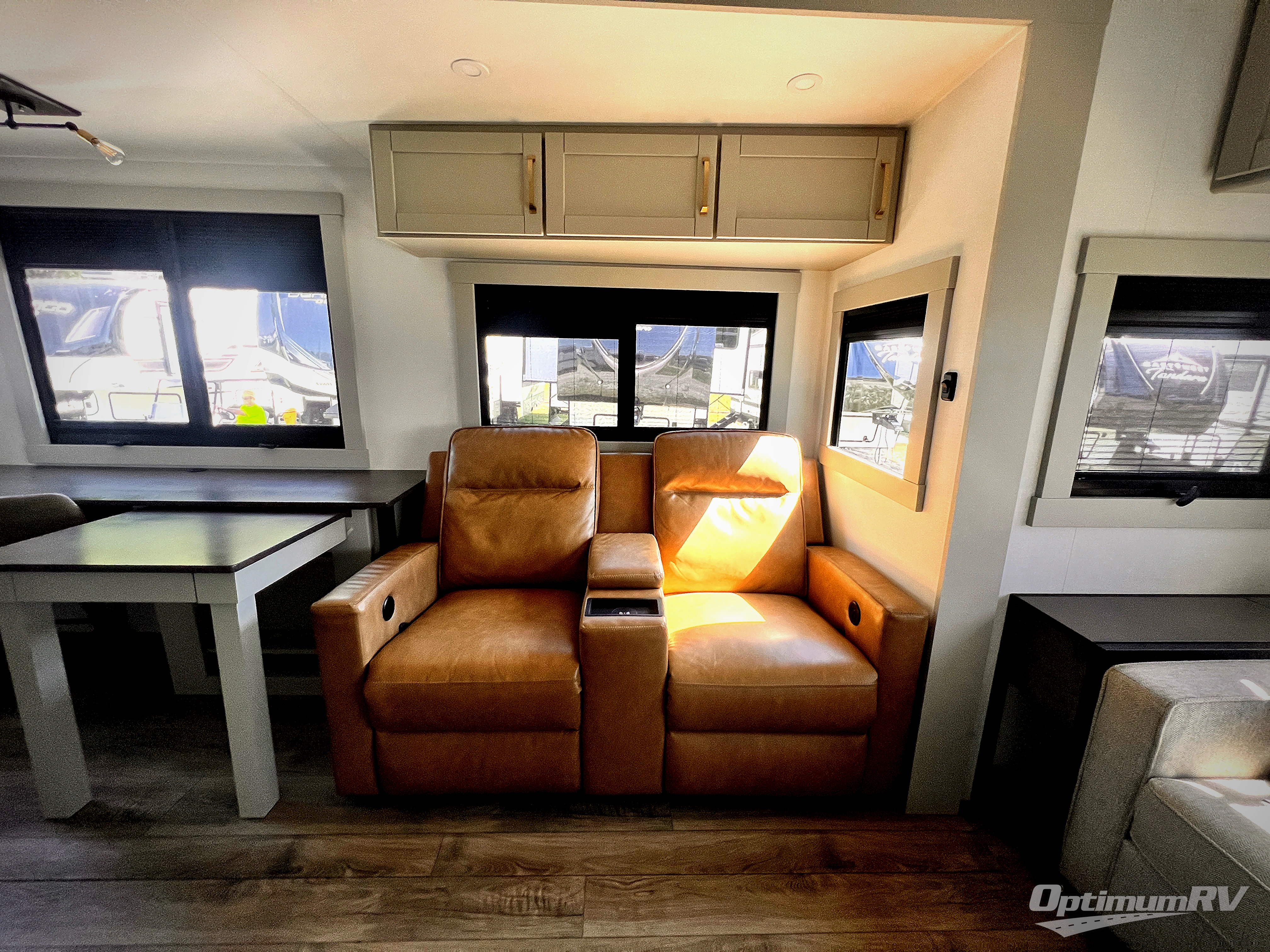 When you want travel accommodations to feel just like home! This Model Z luxury fifth wheel is bright and modern on the inside, with loads of amenities that will have you dreaming of your next trip! Enter and find a spacious combined living/kitchen space thanks to dual opposing slides. There is ample seating with a free standing dinette that includes a built-in utensil drawer, 62" theater seating, and a 72" tri-fold sofa along the rear wall. You can easily relax and enjoy the 50" Smart telescoping TV with a cozy fireplace below. The kitchen offers all that you need to prepare and cook meals just like home with a 16 cu. ft. refrigerator for your perishables, a 30" microwave oven, and three burner range top and oven. You will love the integrated spice rack, and the kitchen island all outfitted with dog bowls and double pull out trash bins with an integrated Stow & Go paper towel holder. There is also an 84" pantry with adjustable shelves for all of your canned and dry goods. Head up the steps to a private master suite with king bed slide. You can opt for the queen bed if you like. A sliding dresser top features hidden storage which is perfect for jewelry and other personal belongings. The front wardrobe features mirrored doors and the corner closet has been prepped for a stackable washer and dryer if you choose to add that option. Relax and enjoy a large bath featuring a linen cabinet, a 30" x 42" shower, and vanity with sink, plus medicine cabinet. You will also appreciate having dual showers on the outside of this unit, and a rear baggage door and mid-coach pass-through storage.