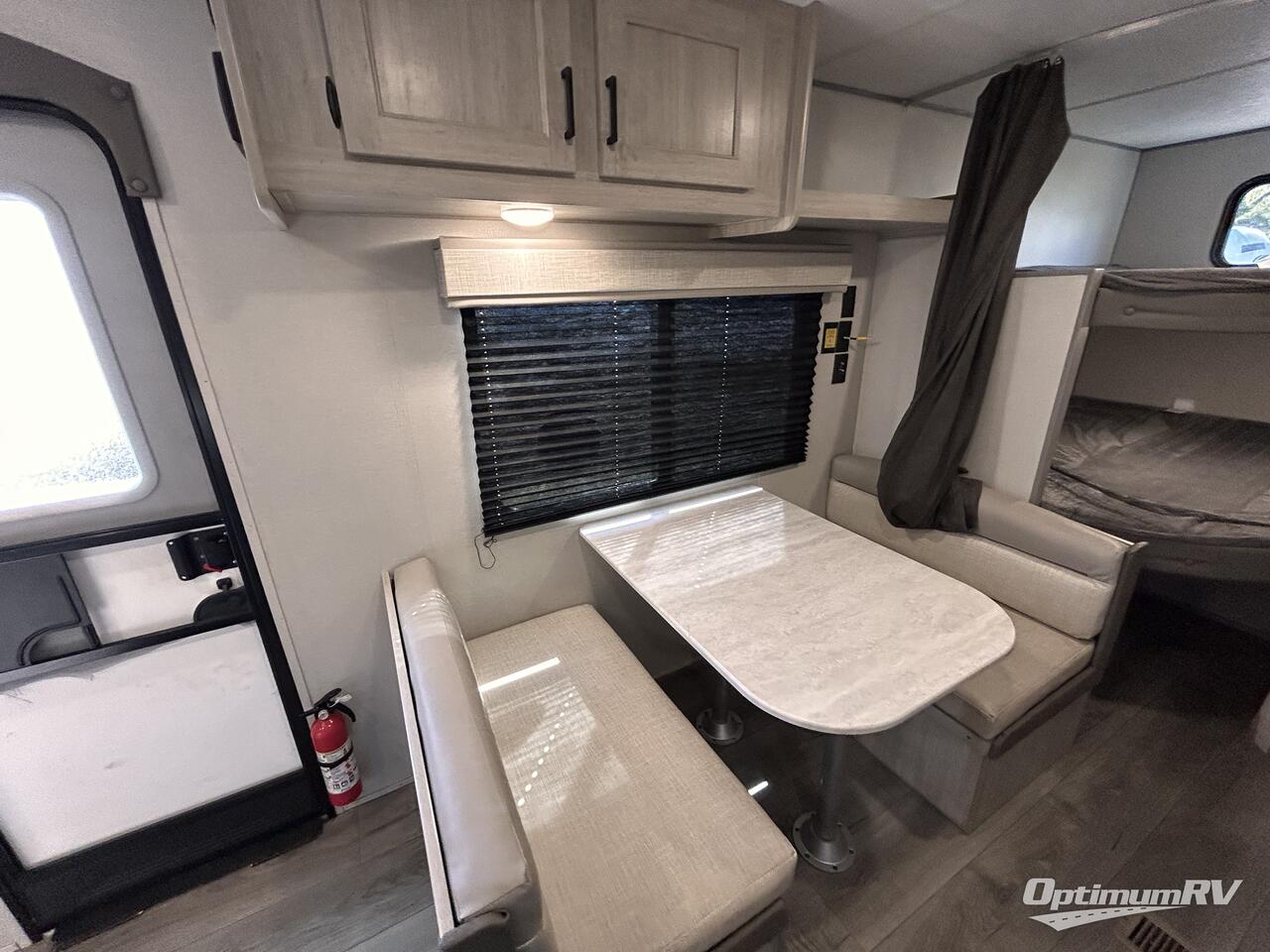 You get to choose to sit at the sofa or at the booth dinette when you are relaxing inside. There is a shelf with storage totes above the sofa for your belongings, and an additional overhead cabinet above the dinette for games. Maybe you want to rest on your own queen bed in the front semi-private bedroom before you make a meal in the kitchen or take a hike through the trails around the lake. The 15' electric awning with multi-color LED lights and a remote offers an outdoor living area where you can visit with other RVers. The kids will love their own double-size bunks that they can share with a friend or two, and the full bathroom is nearby as an added convenience.