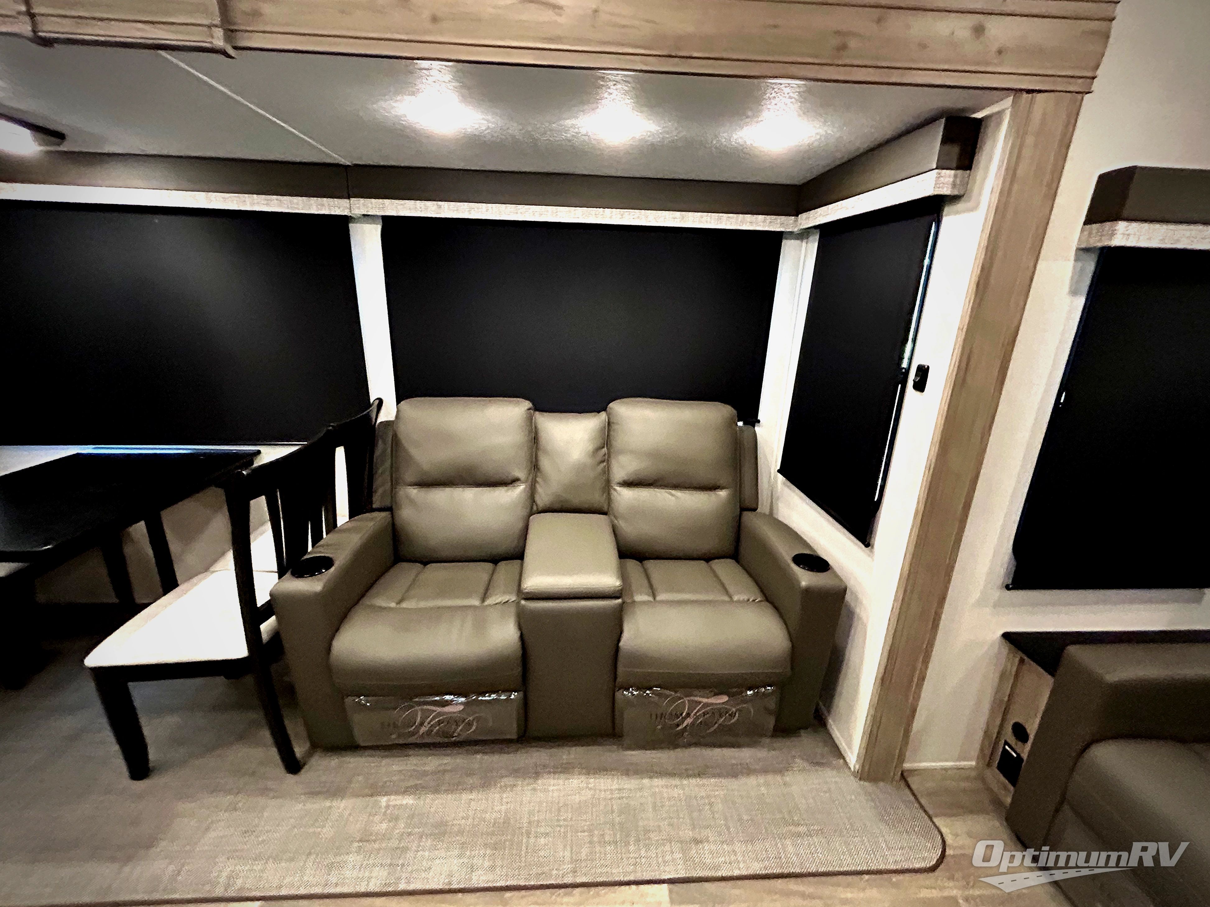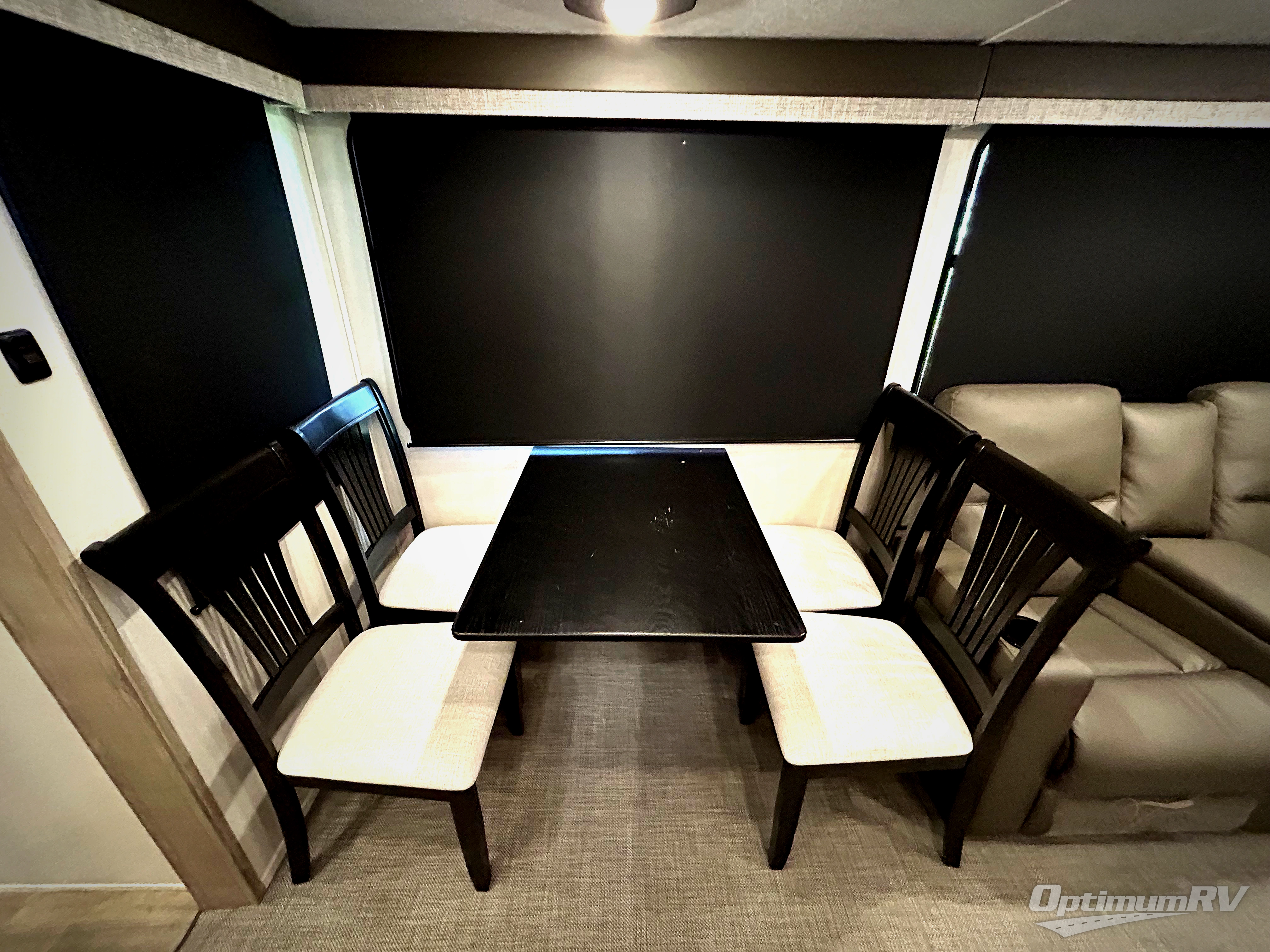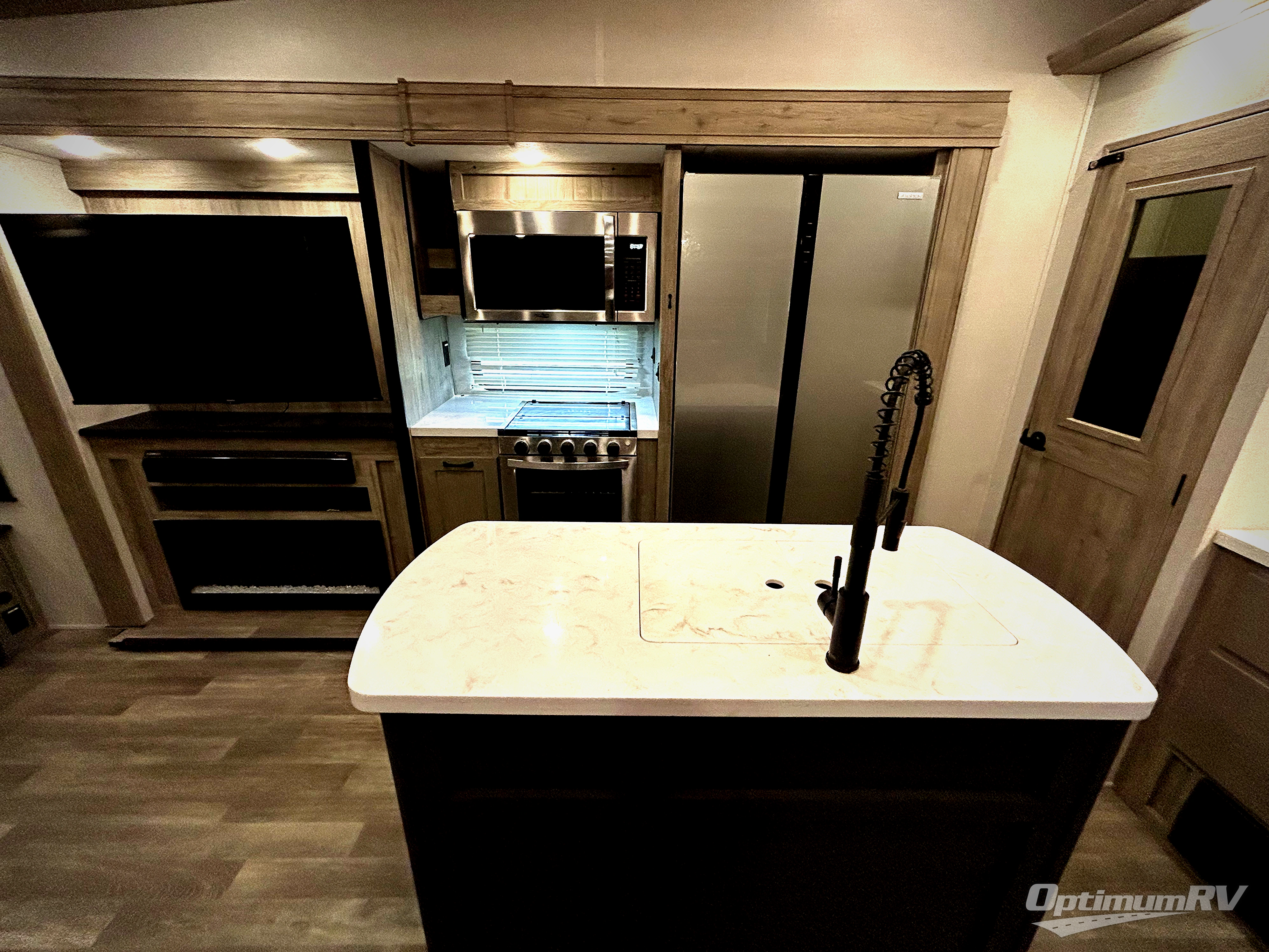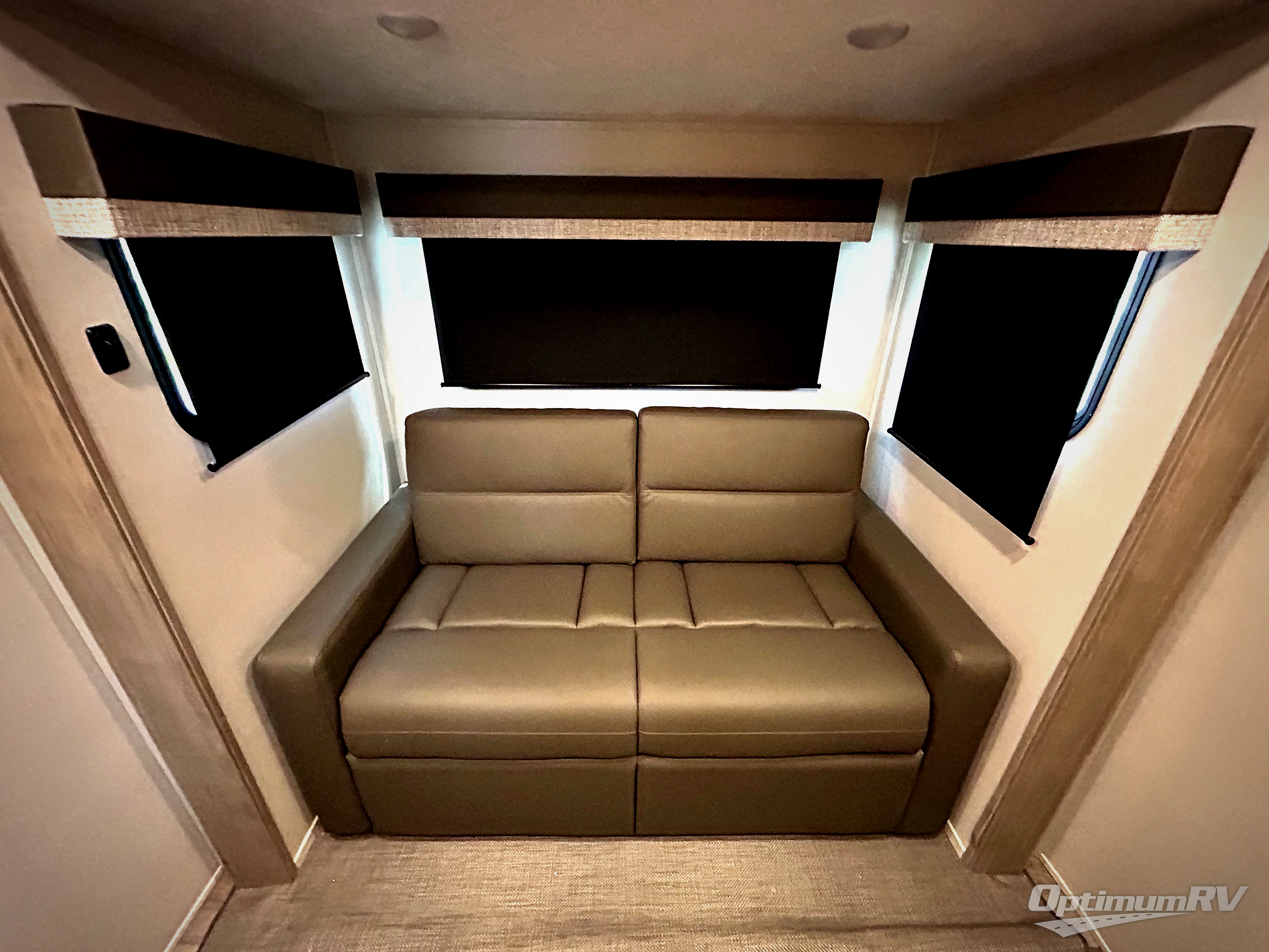 Spend your days at the lake and your evenings relaxing in this fifth wheel with four slide outs for tons of space. Your guests can claim the middle den to themselves that includes a tri-fold hide-a-bed sofa with a removable table, a wardrobe for their things, plus a loft above for the little ones. The chef of your crew will appreciate the kitchen island for extra counter space, and there are stainless steel appliances for added luxury. After dinner is cleaned up, relax on the theatre seating or on the rear tri-fold hide-a-bed sofa, or you may just want to be outside with the power to enjoy the evening air. This model also includes a front private bedroom with a king bed slide out, a dresser, plus a large wardrobe with washer and dryer prep. You may just decide to go full-time in this fifth wheel!