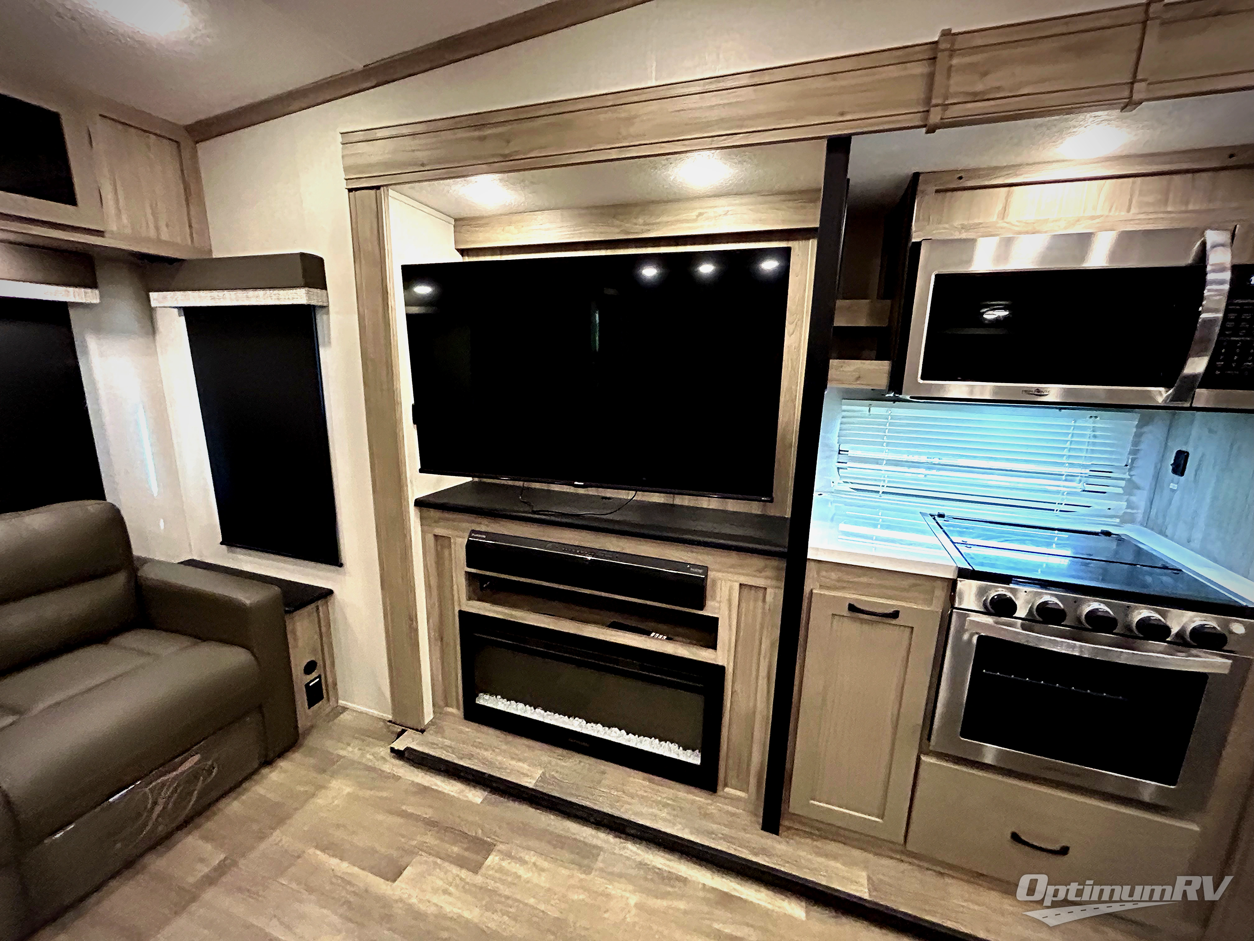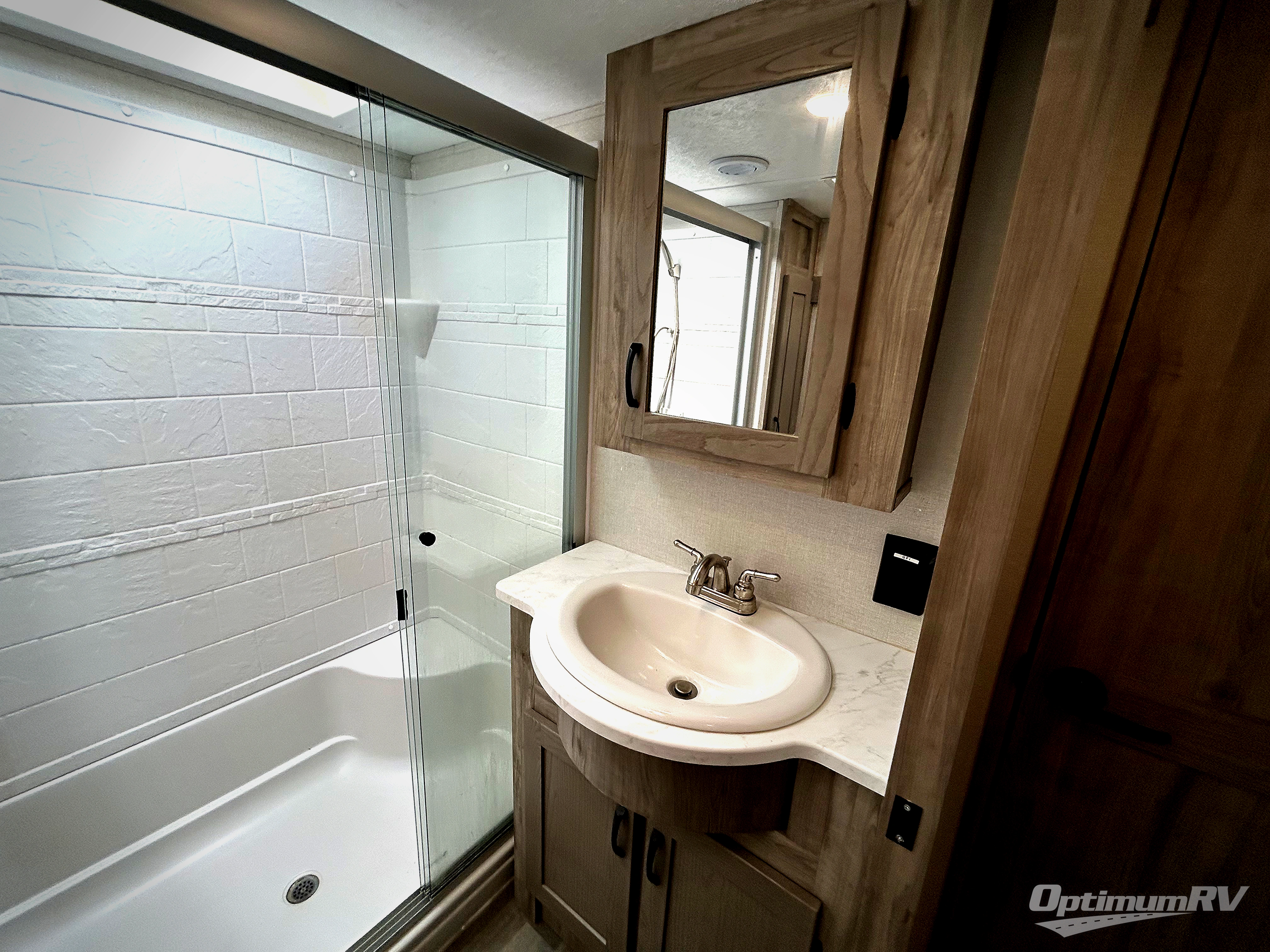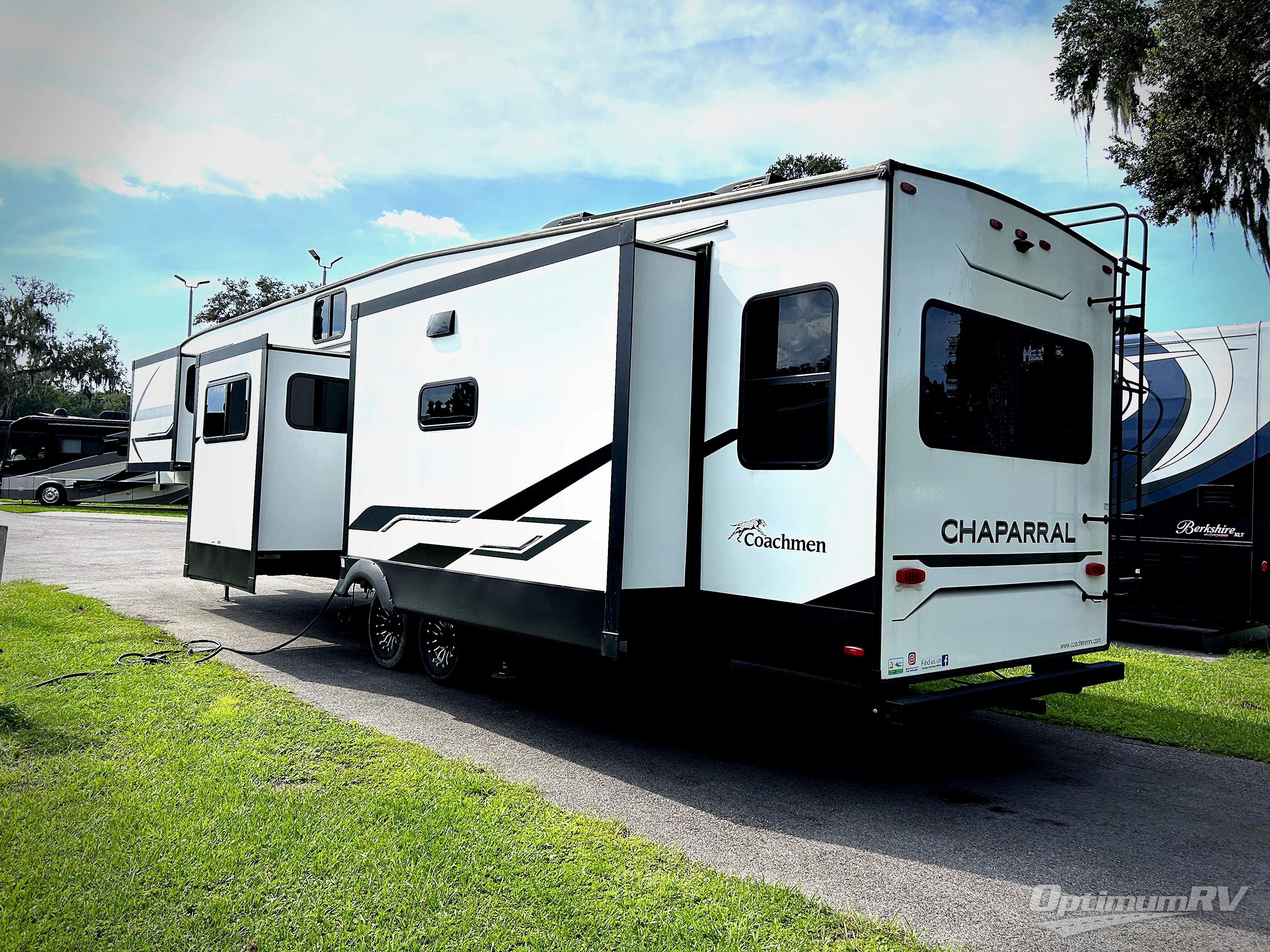 Each Chaparral mid-profile fifth wheel by Coachmen is designed with residential features, loads of storage space, and roomy bedroom suites to make you feel right at home. The durable construction means you can enjoy your RV for years to come. There's 6X double Azdel aluminum cage sidewall system, Weather Shield+ technology, and Tri-Tex powder coated frame technology that will allow you to camp year around. Each model includes a Winegard Air 360 HDTV/radio dome antenna and an AM/FM stereo with Bluetooth and USB ports to keep you entertained, plus roller night shades and a modern electric fireplace to make your space cozy. There is also a large transom window in the kitchen, a modern high-rise faucet, LED motion sensor lights in the bathroom, plus a full-size shower with glass doors and a seat. Now that's what I call luxury! Choose a Chaparral fifth wheel today!