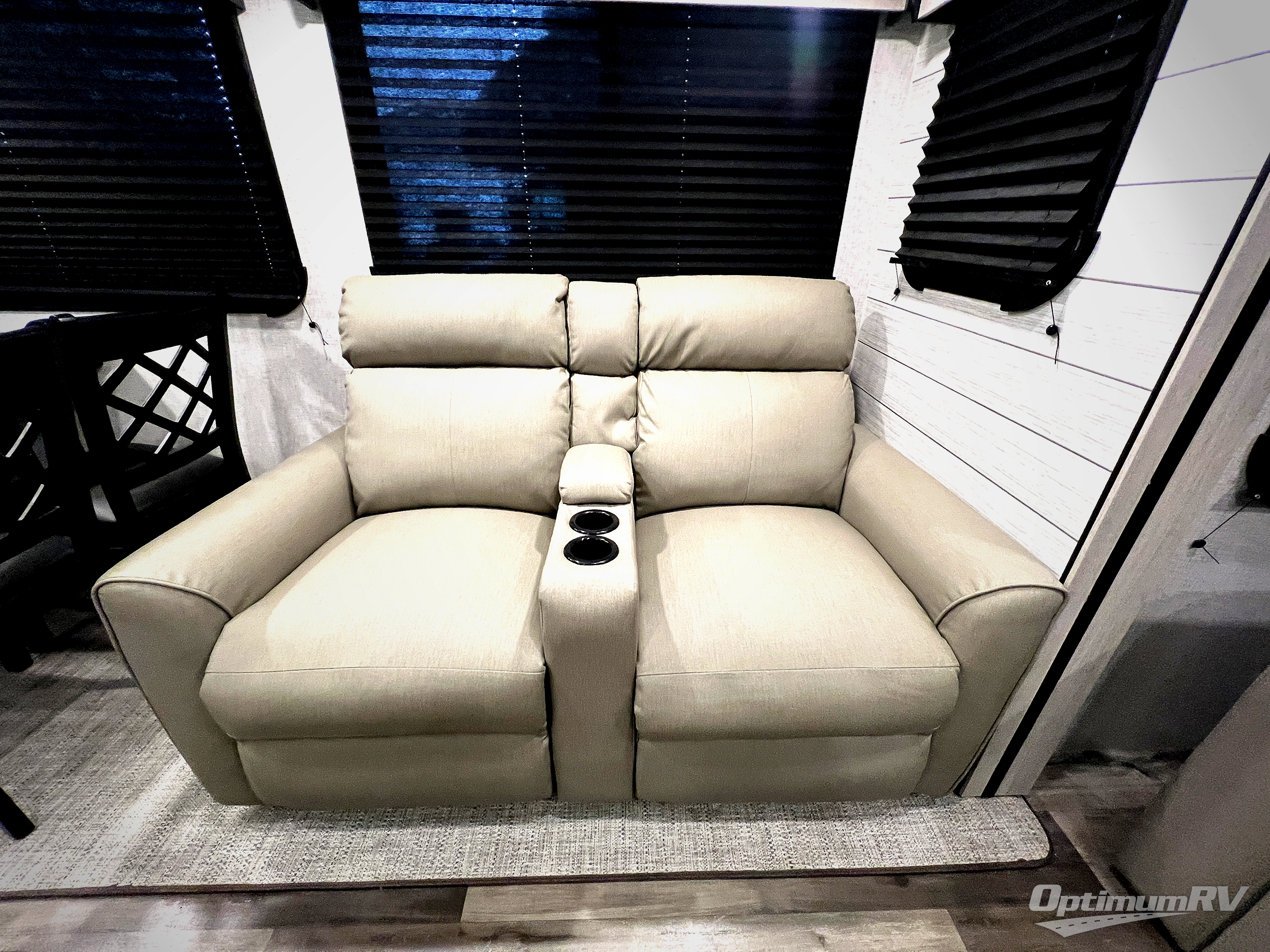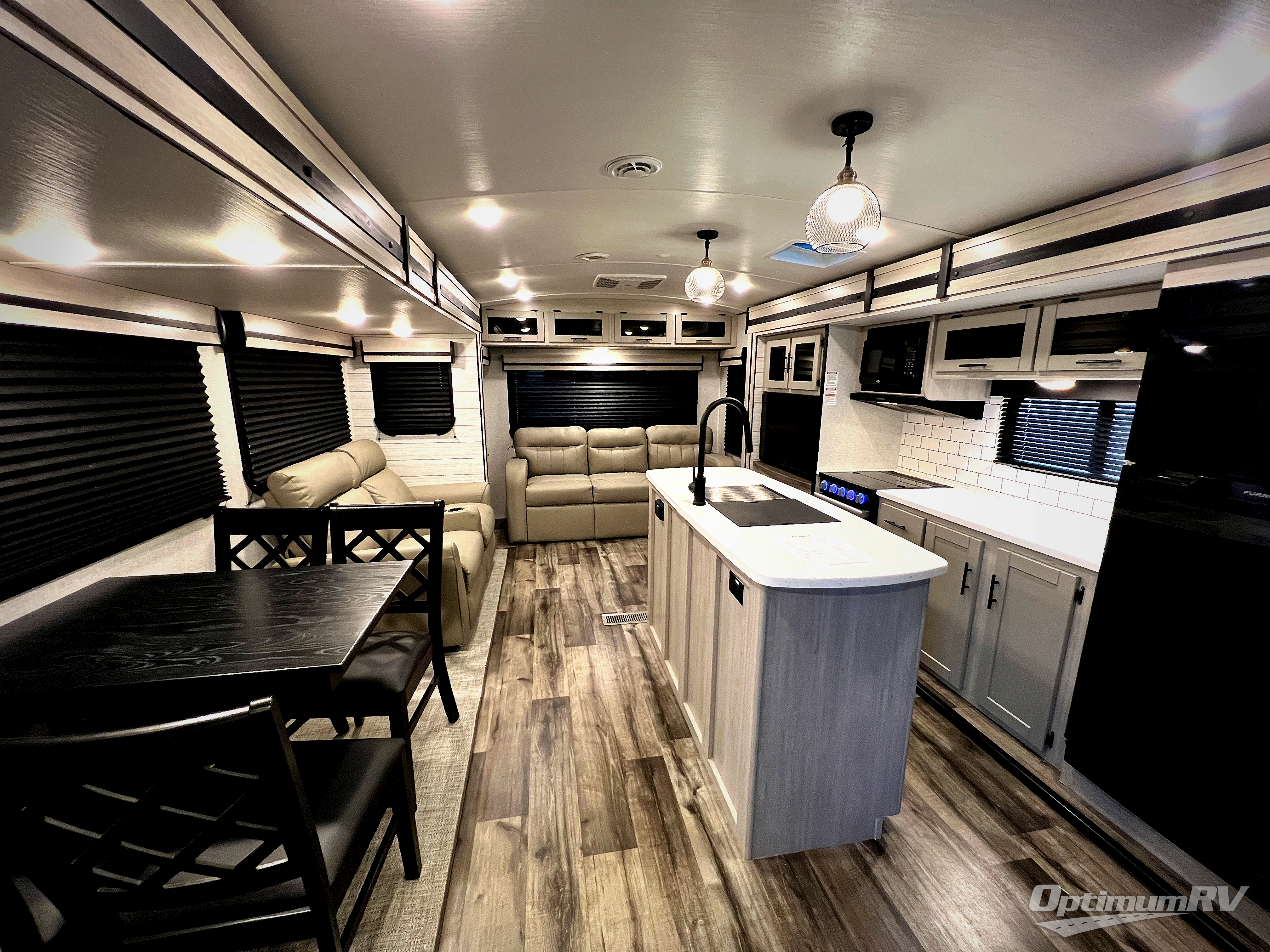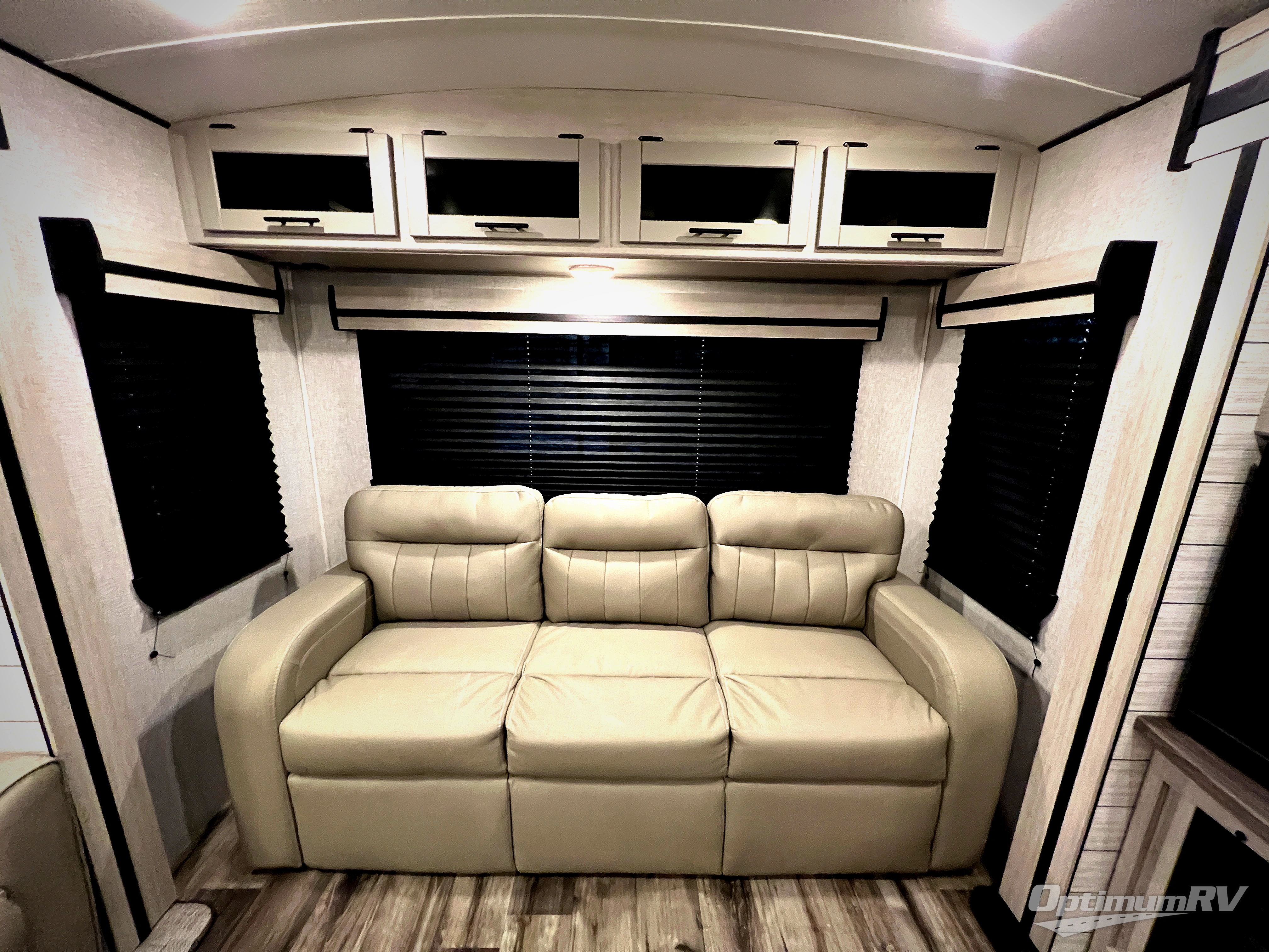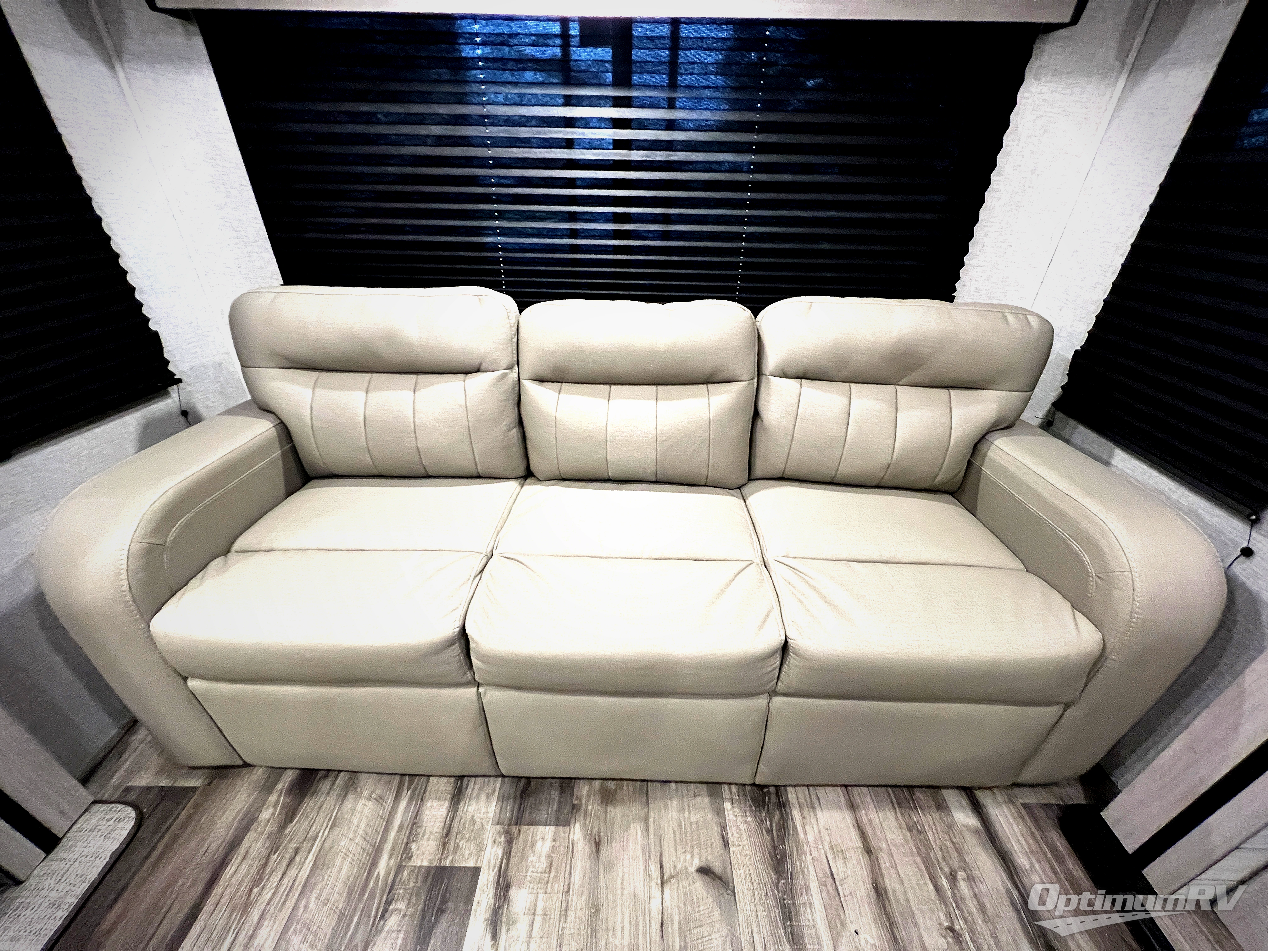 This spacious travel trailer is beaming with luxurious features you are sure to love. The dual opposing slides in the main living area open up the whole space, plus there is a third slide out in the front master suite. The chef of the family will appreciate the kitchen island for additional counter space, and there is a large pantry for all your non-perishables. This space has also been prepped to add an optional washer and dryer if you choose. Your family will find plenty of seating space on the rear 82" tri-fold sofa, the XL booth dinette, and the theater seating. The dual entry bath creates a front master bedroom, and you'll find plenty of storage space here, including a chest of drawers and a large front shelf!