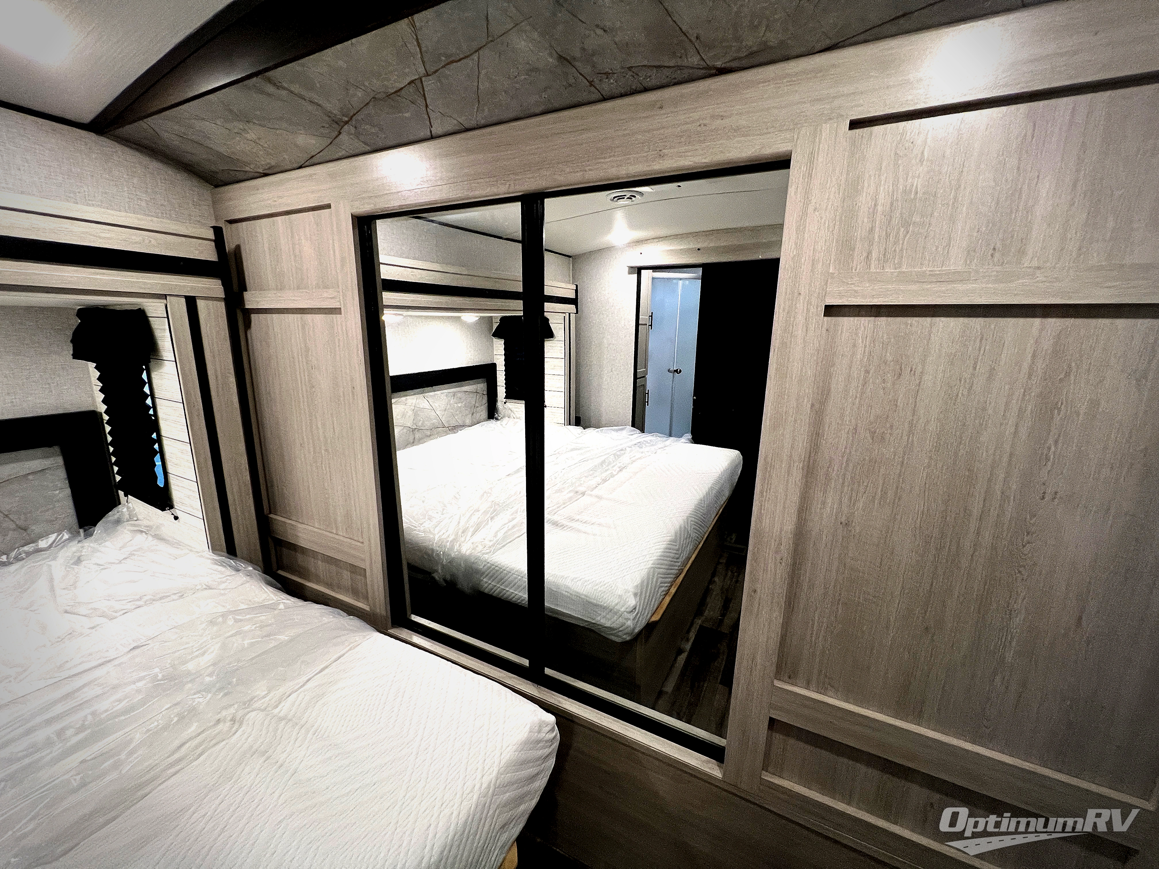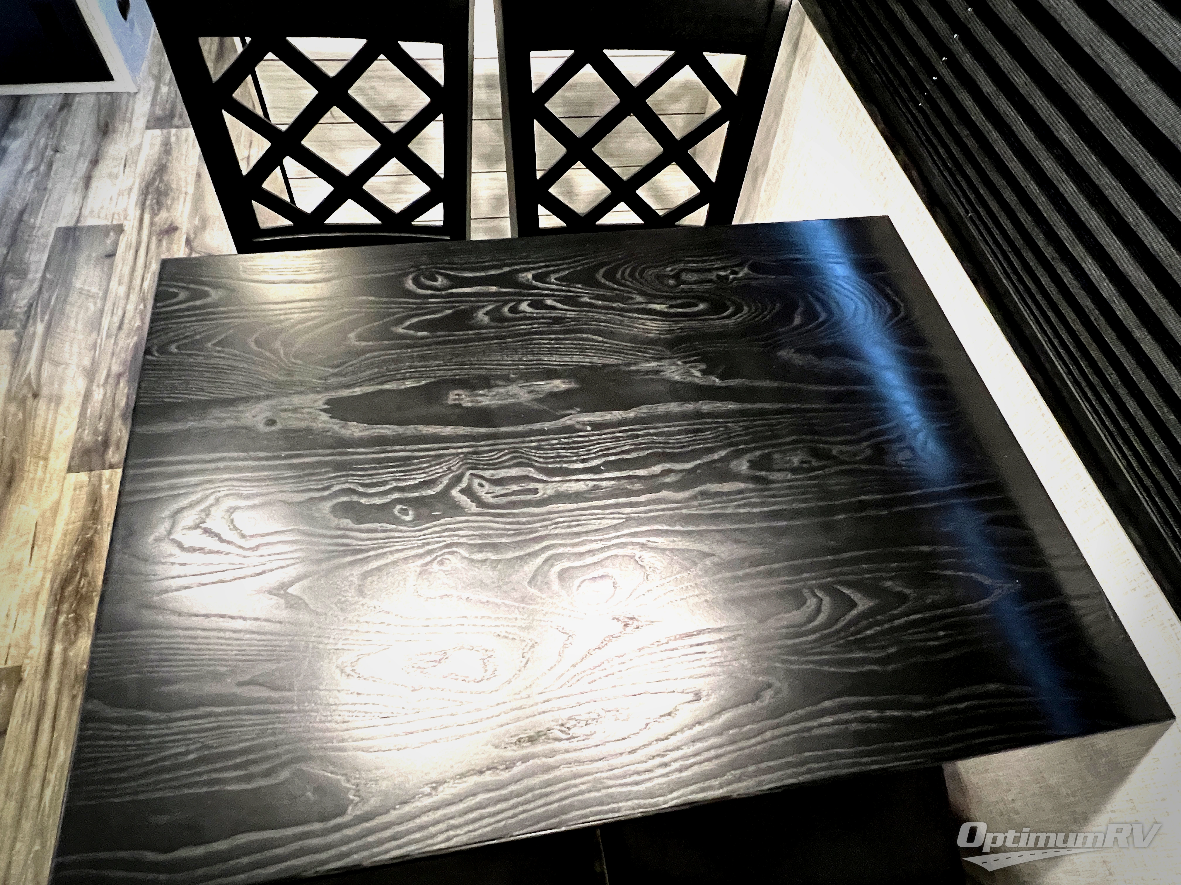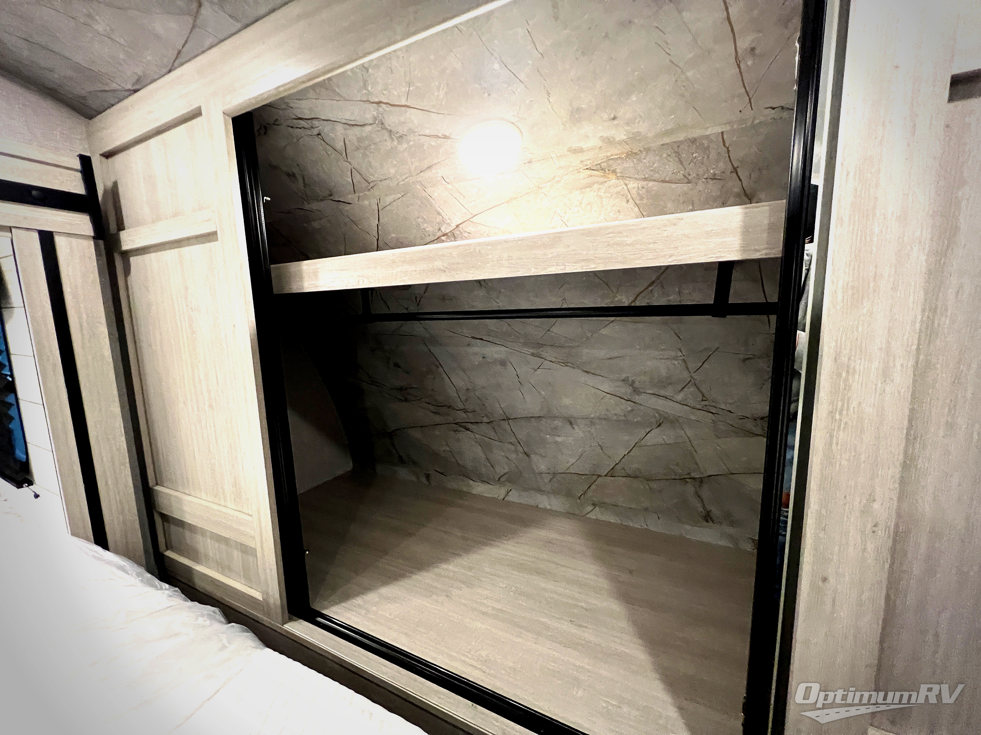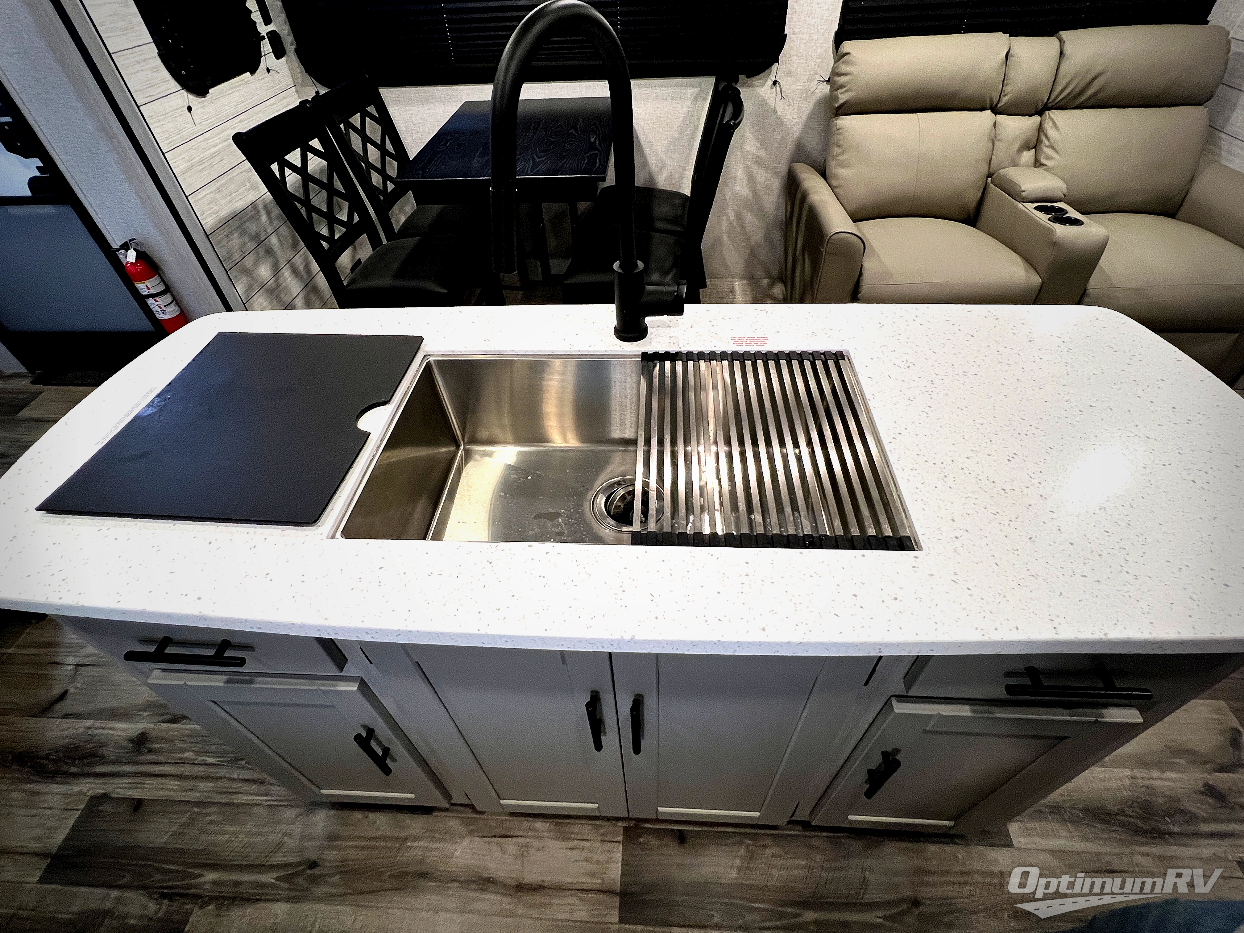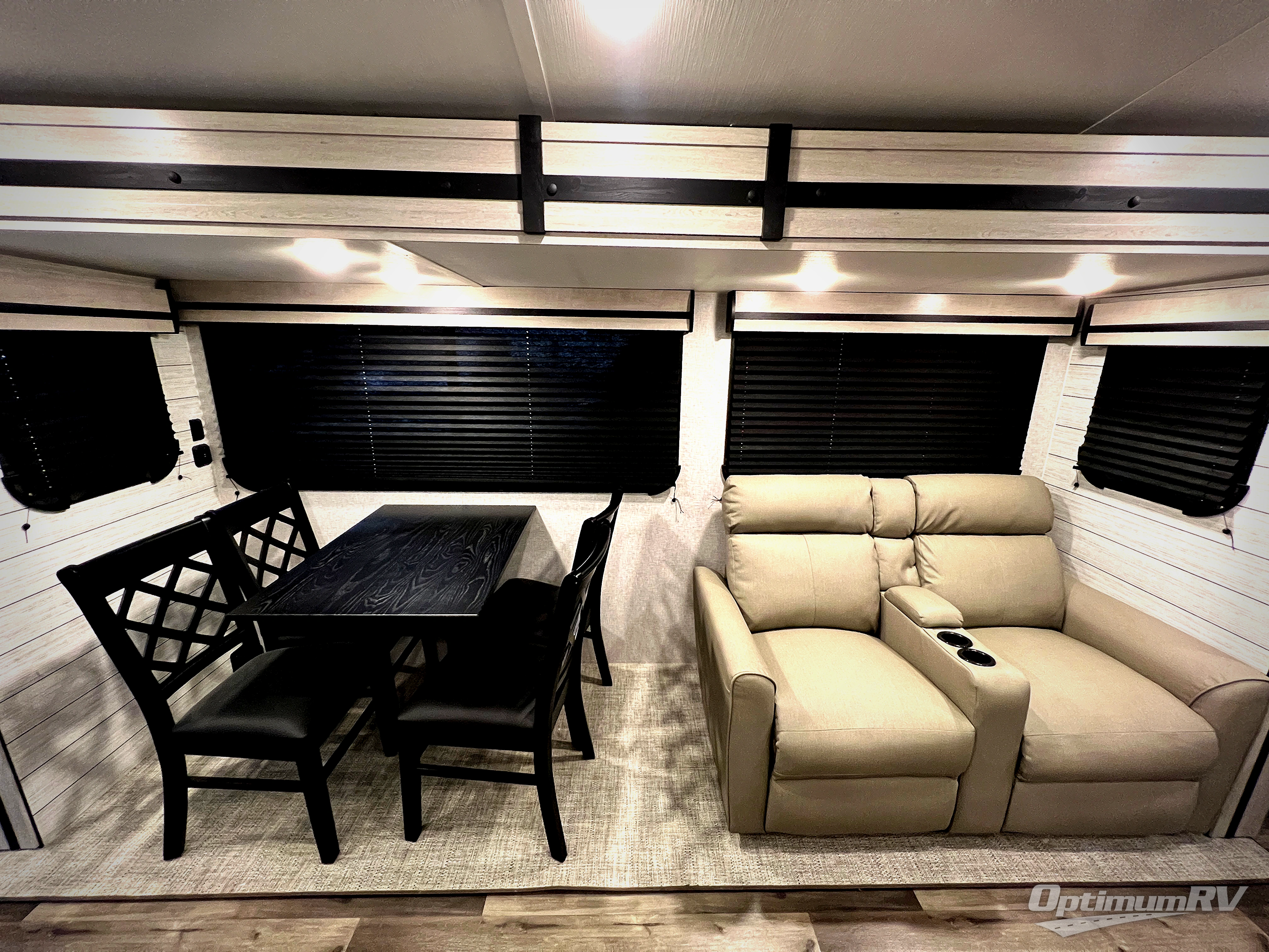 This spacious travel trailer is beaming with luxurious features you are sure to love. The dual opposing slides in the main living area open up the whole space, plus there is a third slide out in the front master suite. The chef of the family will appreciate the kitchen island for additional counter space, and there is a large pantry for all your non-perishables. This space has also been prepped to add an optional washer and dryer if you choose. Your family will find plenty of seating space on the rear 82" tri-fold sofa, the XL booth dinette, and the theater seating. The dual entry bath creates a front master bedroom, and you'll find plenty of storage space here, including a chest of drawers and a large front shelf!