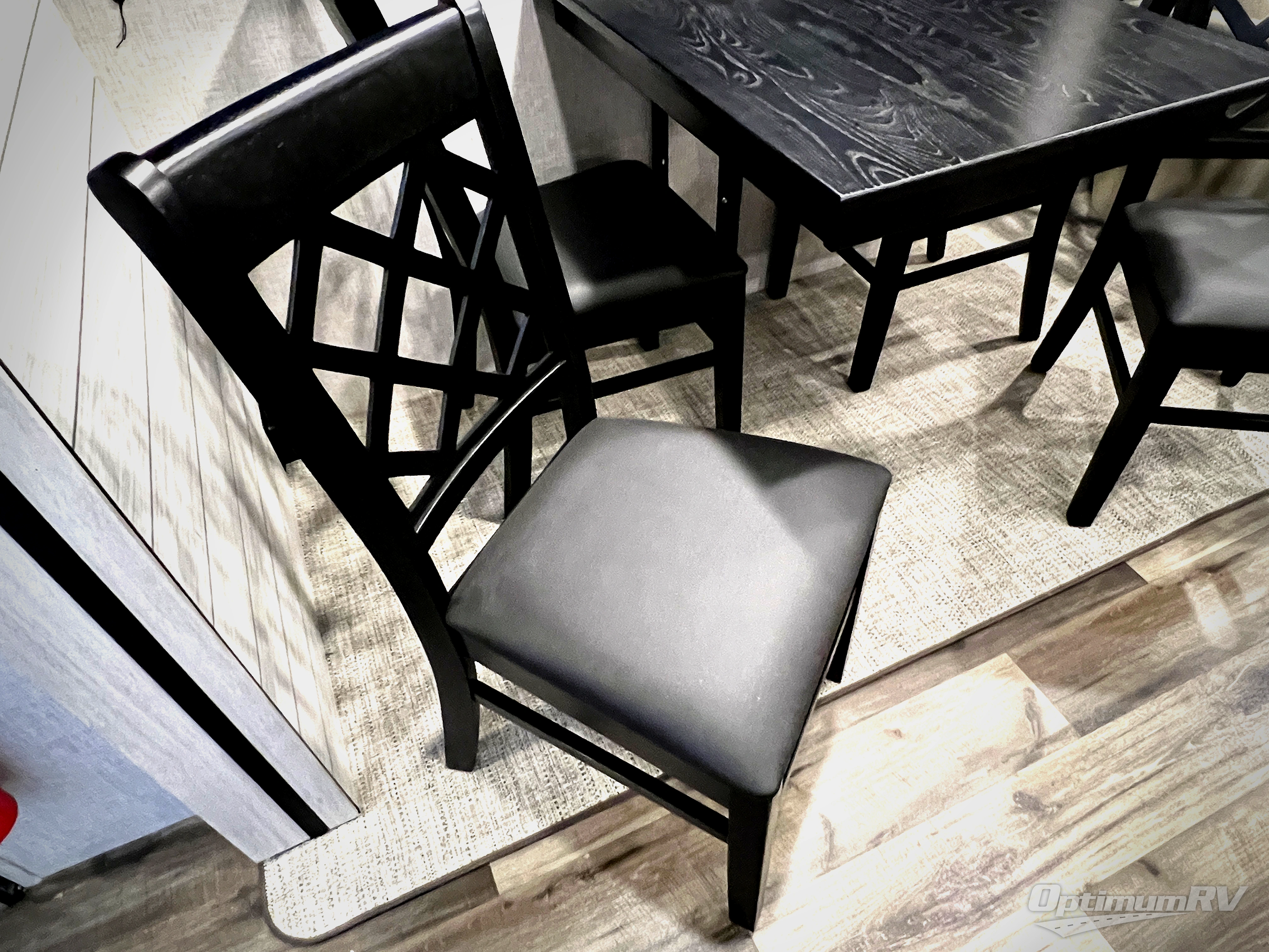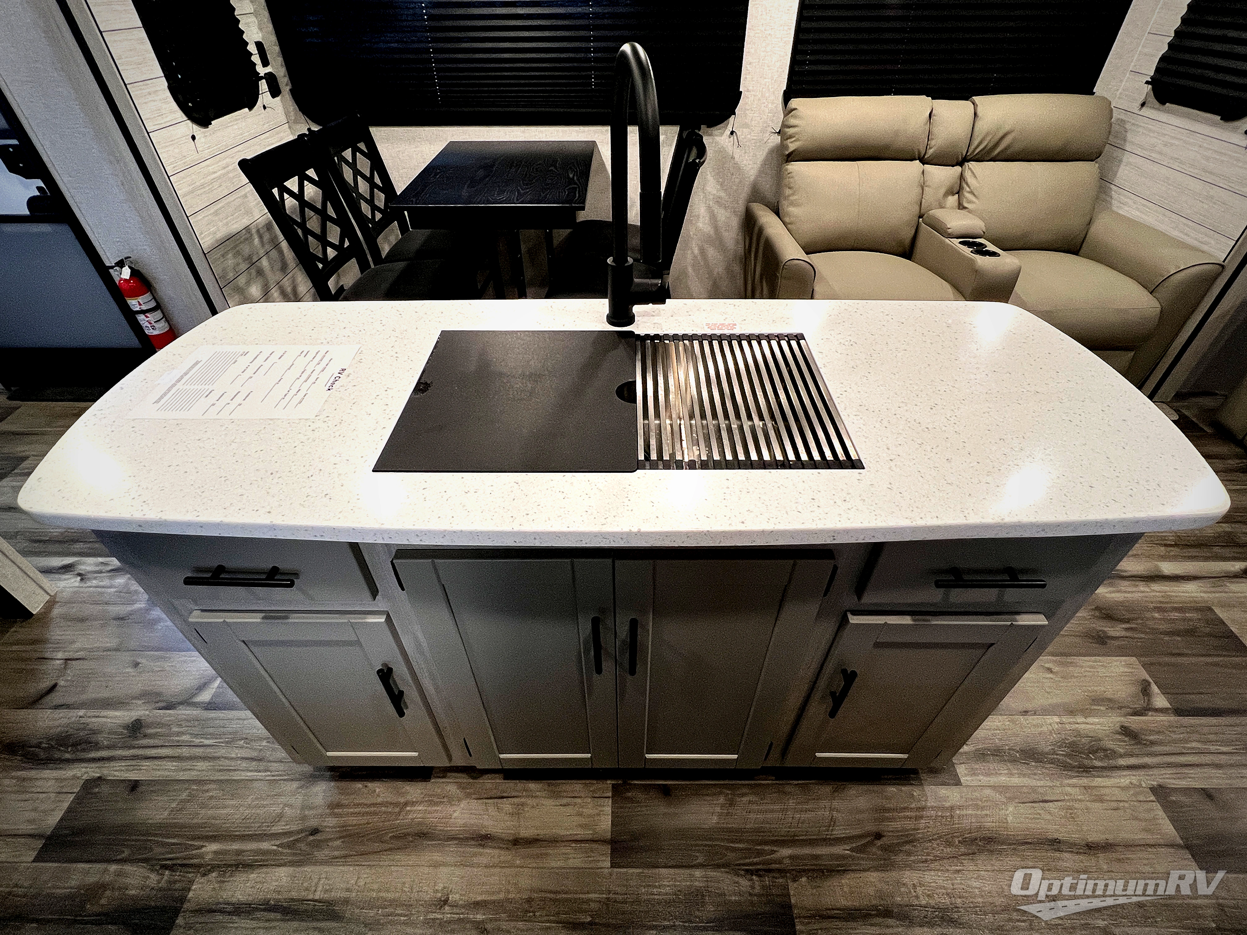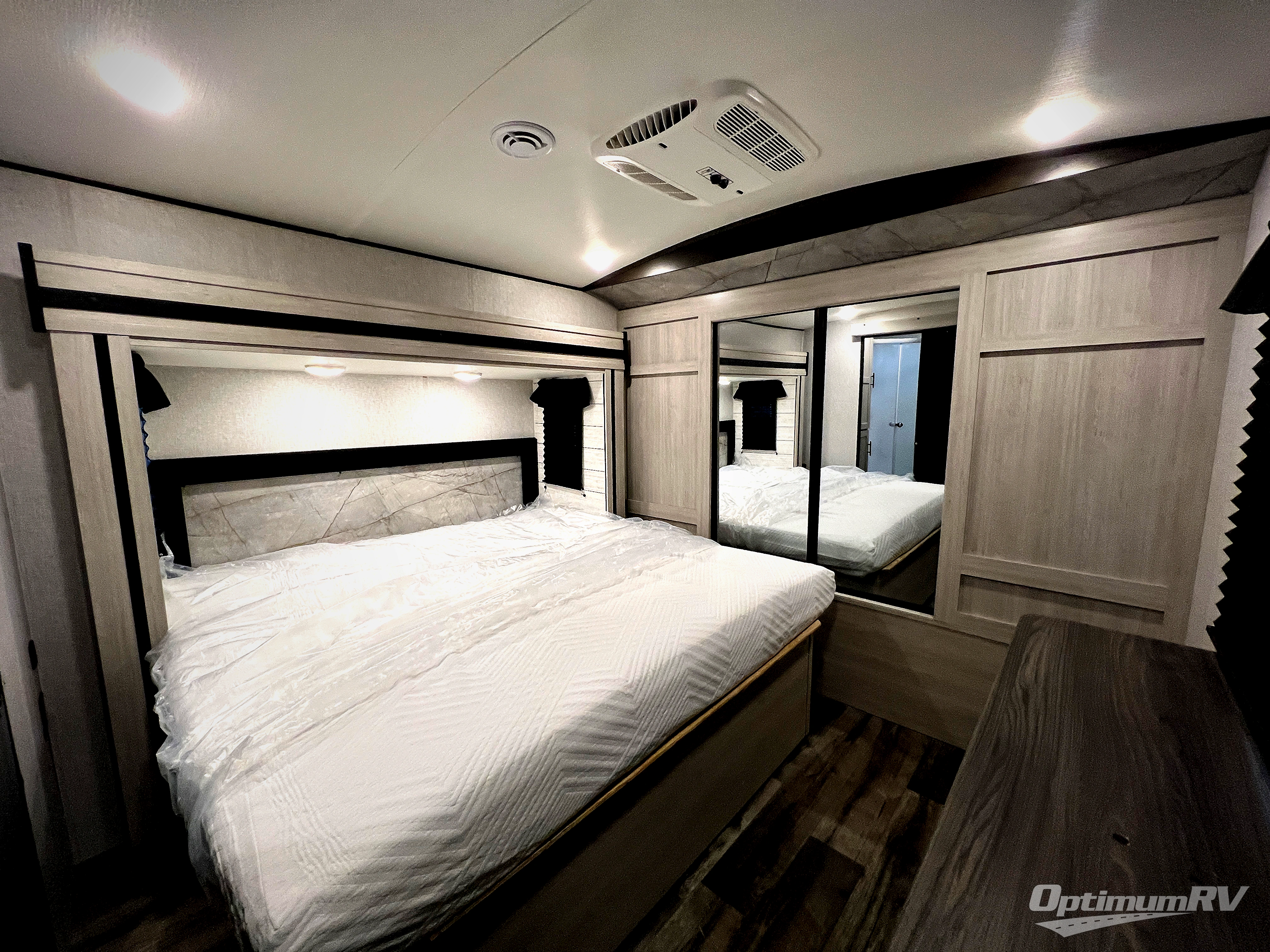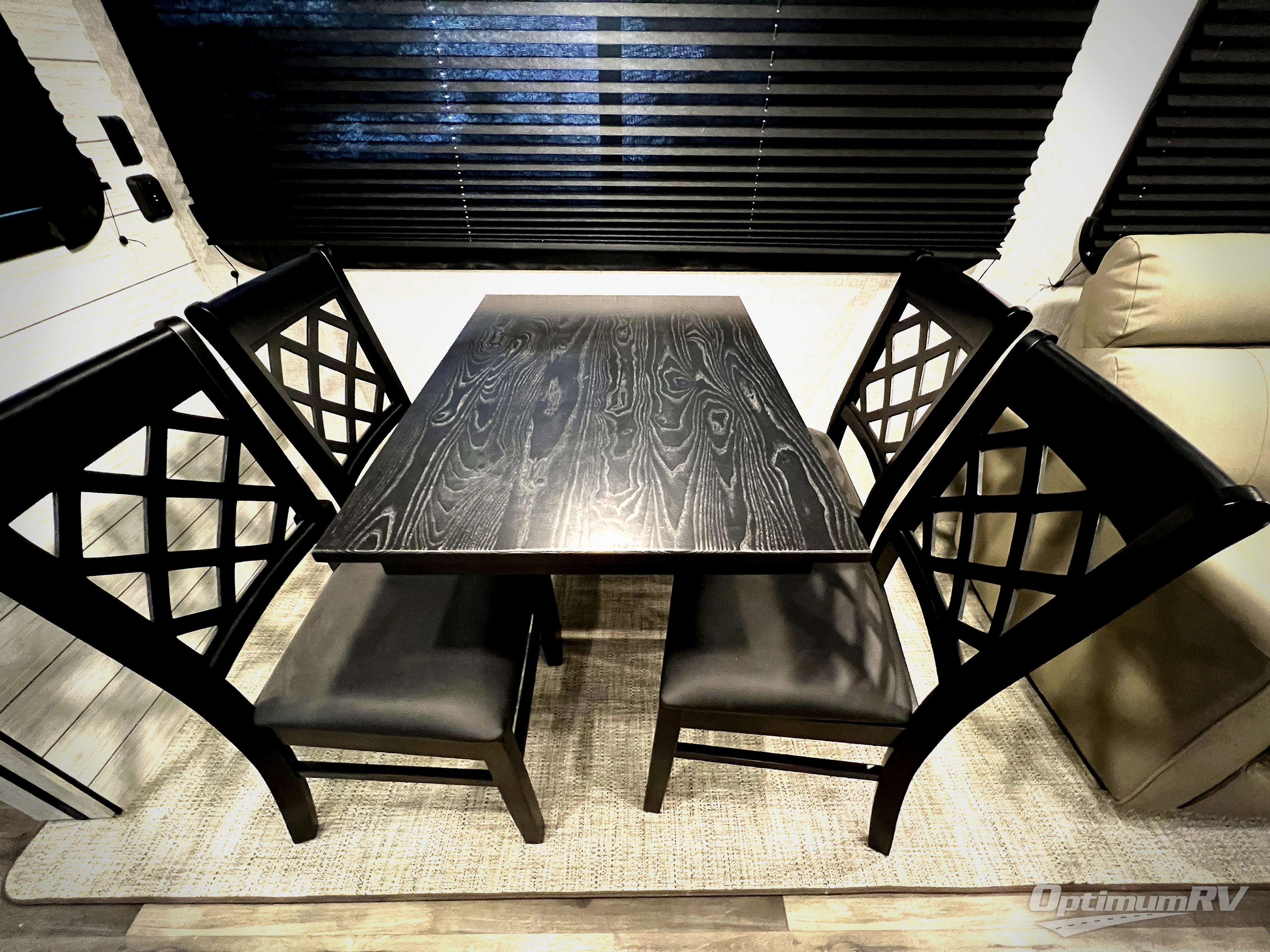 This spacious travel trailer is beaming with luxurious features you are sure to love. The dual opposing slides in the main living area open up the whole space, plus there is a third slide out in the front master suite. The chef of the family will appreciate the kitchen island for additional counter space, and there is a large pantry for all your non-perishables. This space has also been prepped to add an optional washer and dryer if you choose. Your family will find plenty of seating space on the rear 82" tri-fold sofa, the XL booth dinette, and the theater seating. The dual entry bath creates a front master bedroom, and you'll find plenty of storage space here, including a chest of drawers and a large front shelf!
