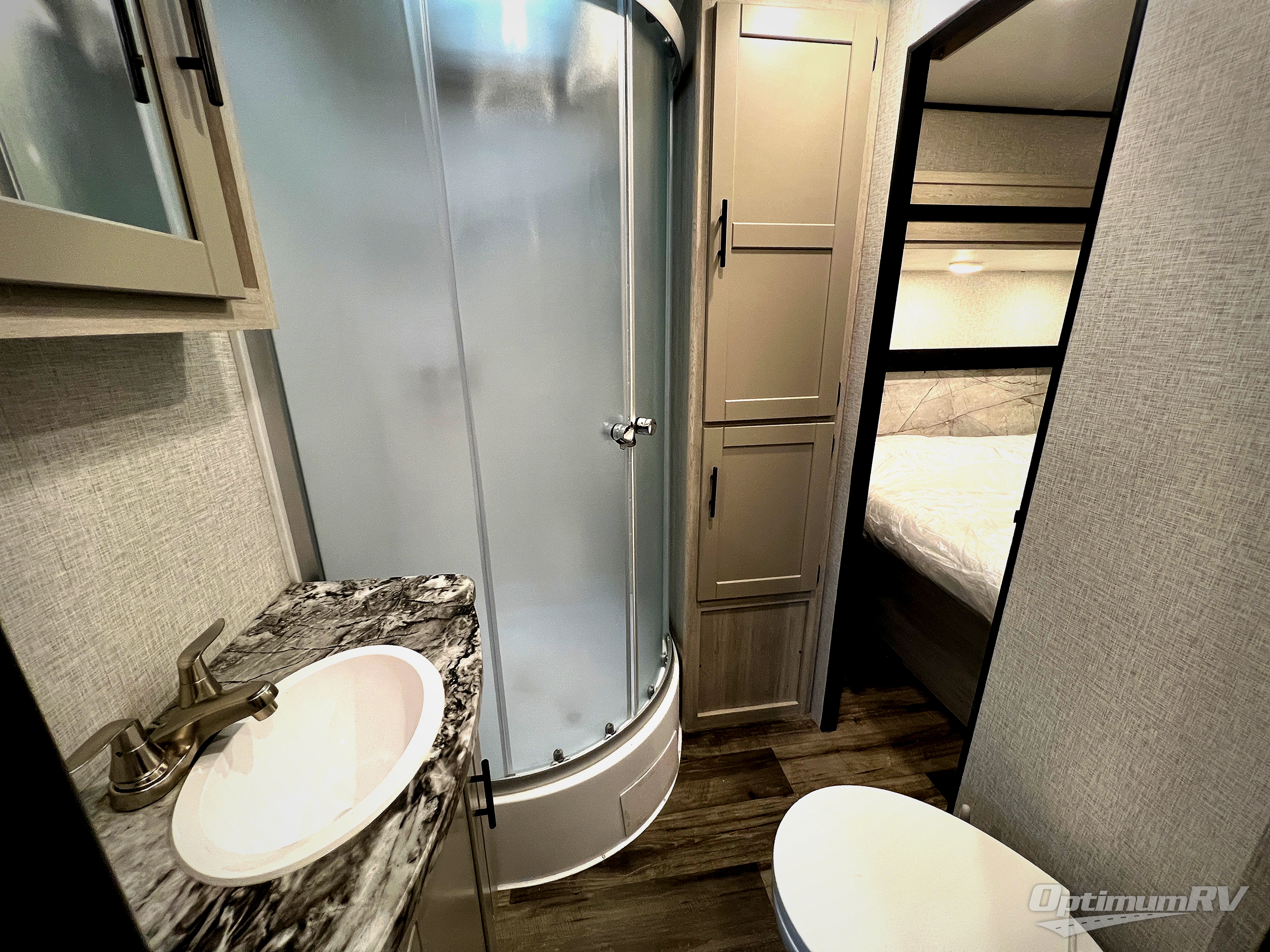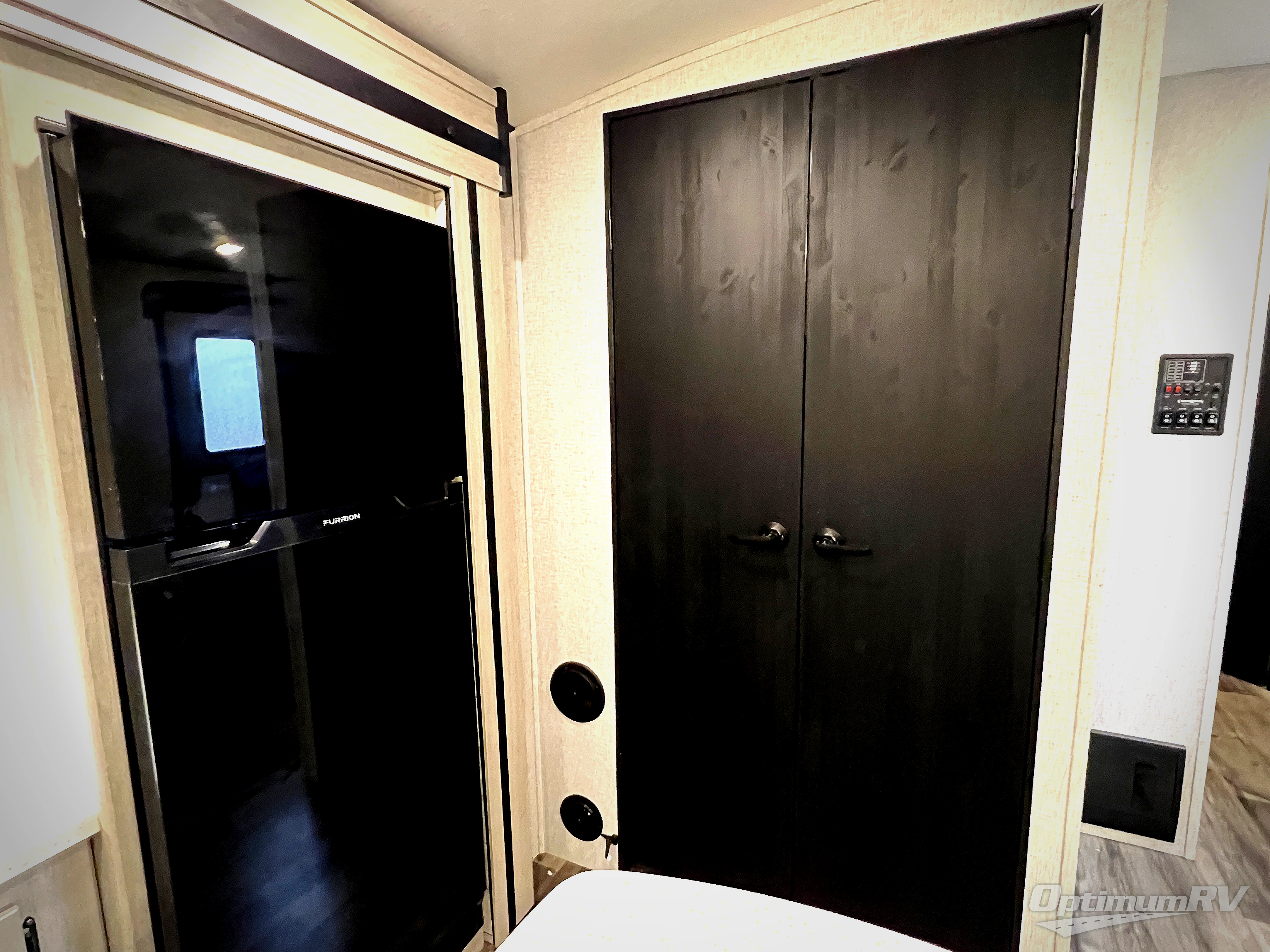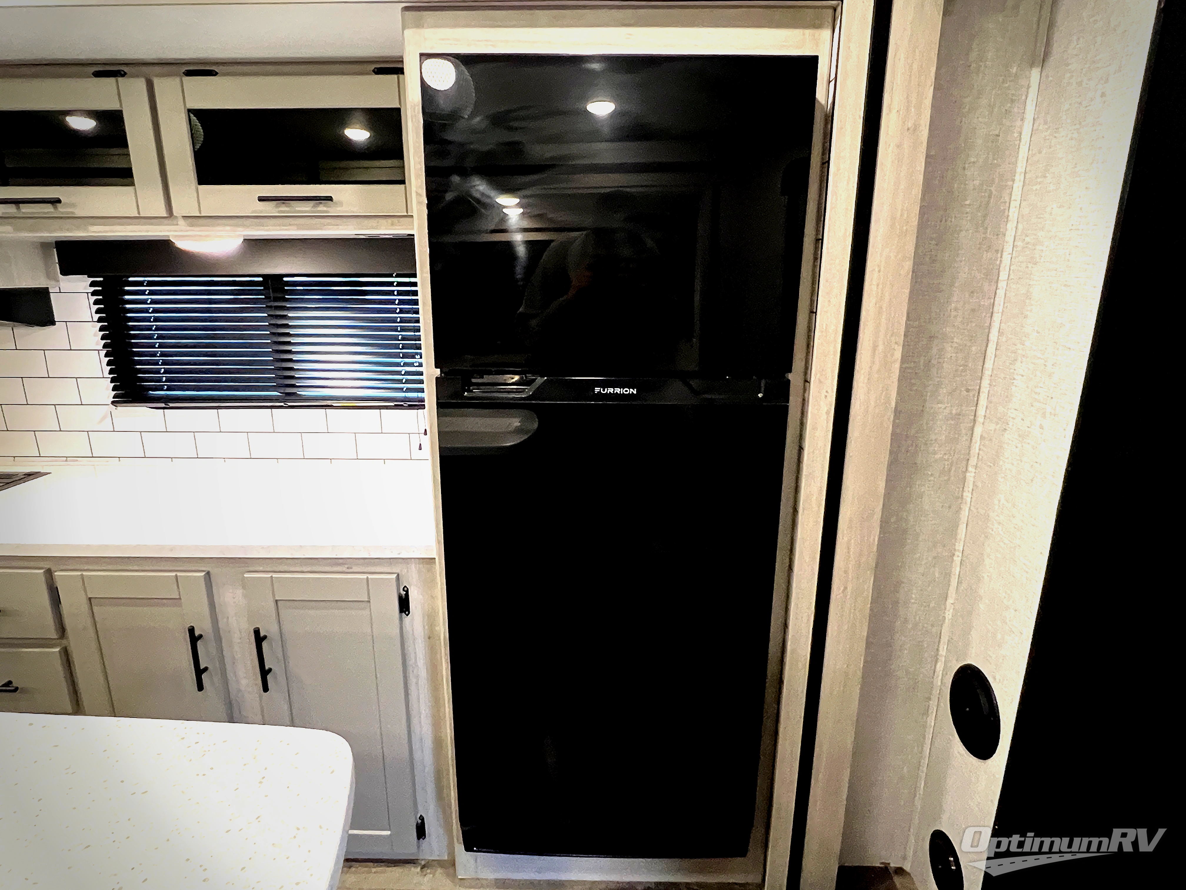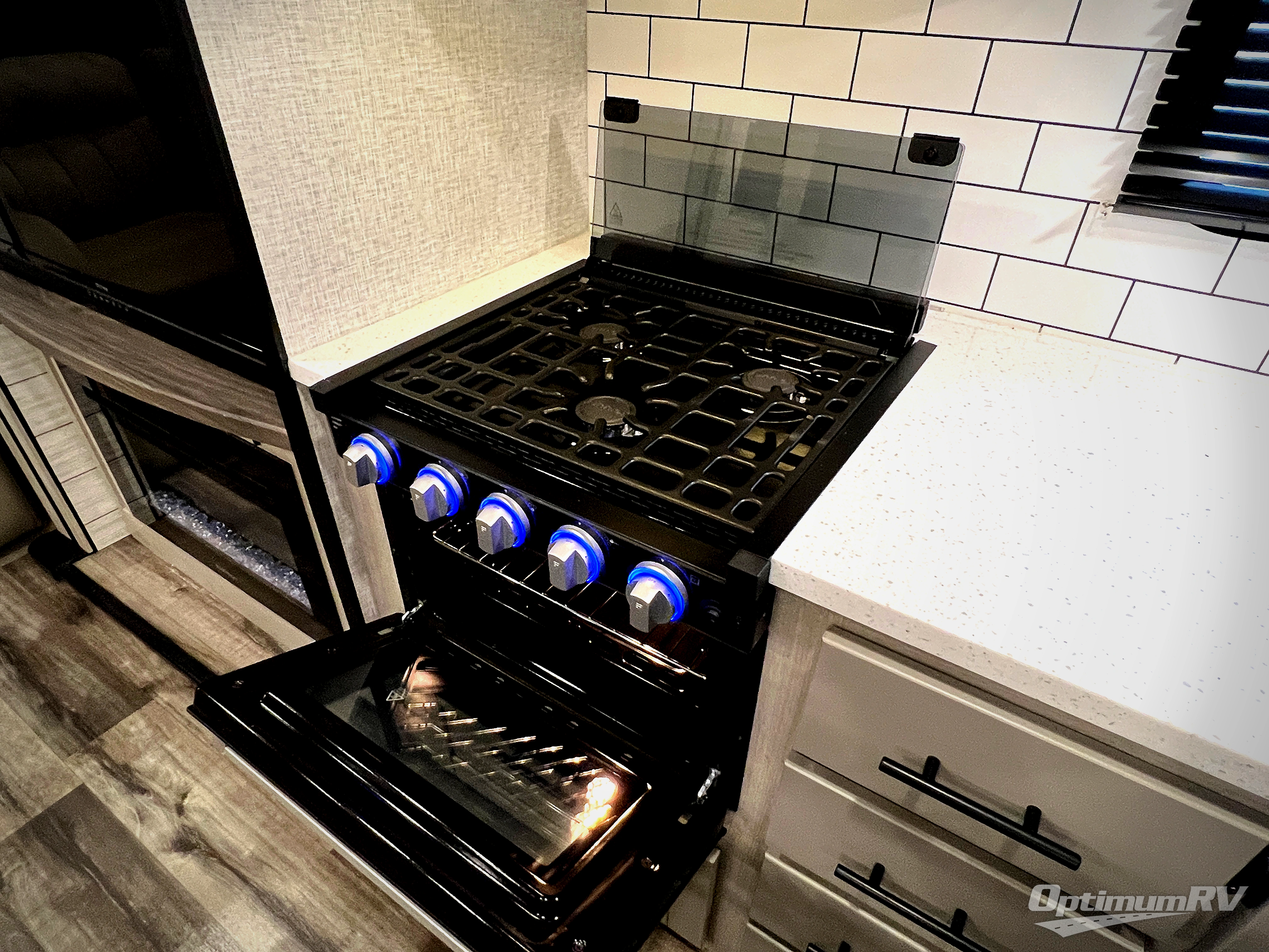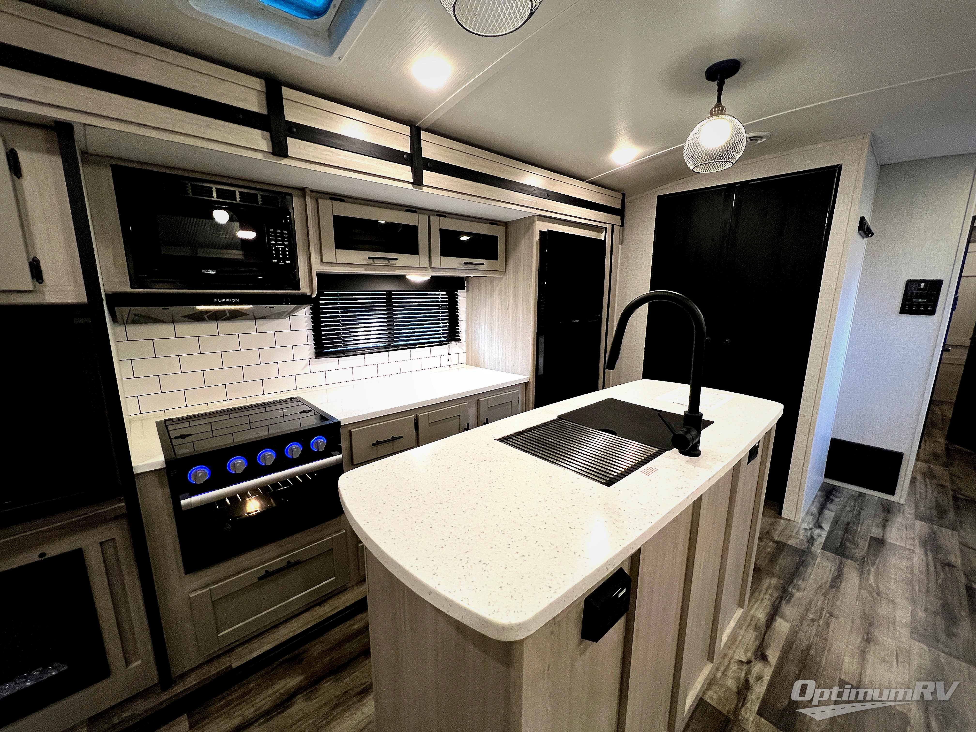 This spacious travel trailer is beaming with luxurious features you are sure to love. The dual opposing slides in the main living area open up the whole space, plus there is a third slide out in the front master suite. The chef of the family will appreciate the kitchen island for additional counter space, and there is a large pantry for all your non-perishables. This space has also been prepped to add an optional washer and dryer if you choose. Your family will find plenty of seating space on the rear 82" tri-fold sofa, the XL booth dinette, and the theater seating. The dual entry bath creates a front master bedroom, and you'll find plenty of storage space here, including a chest of drawers and a large front shelf!