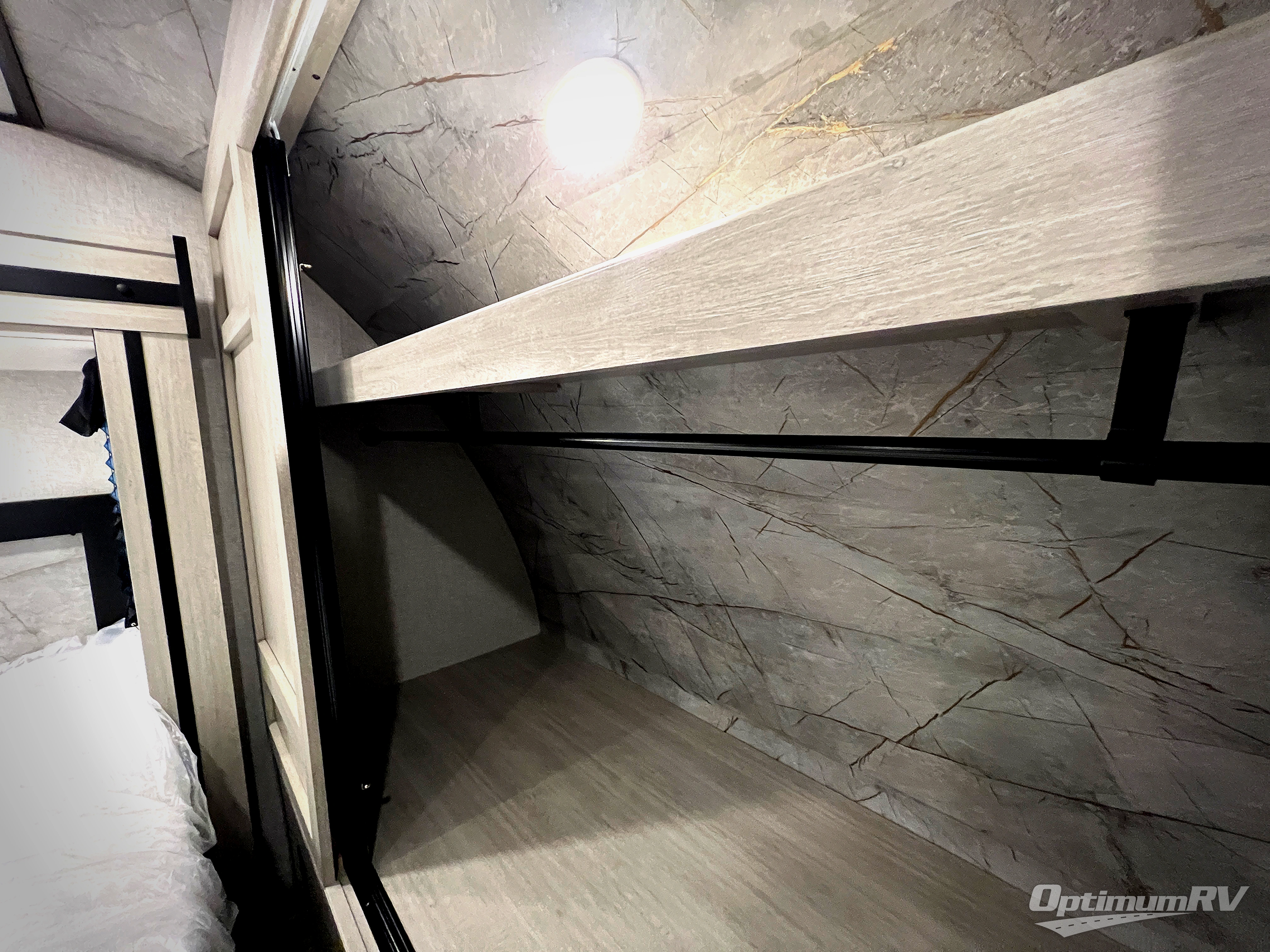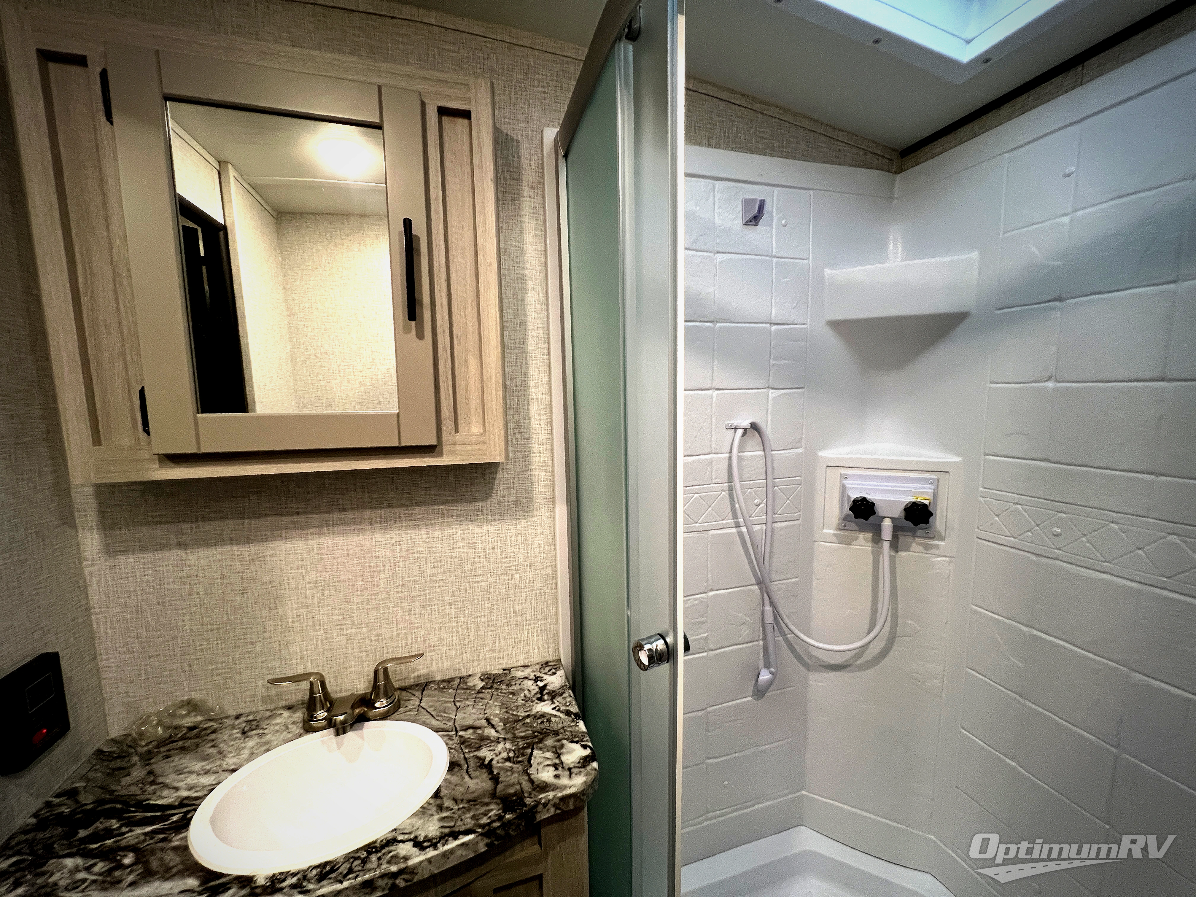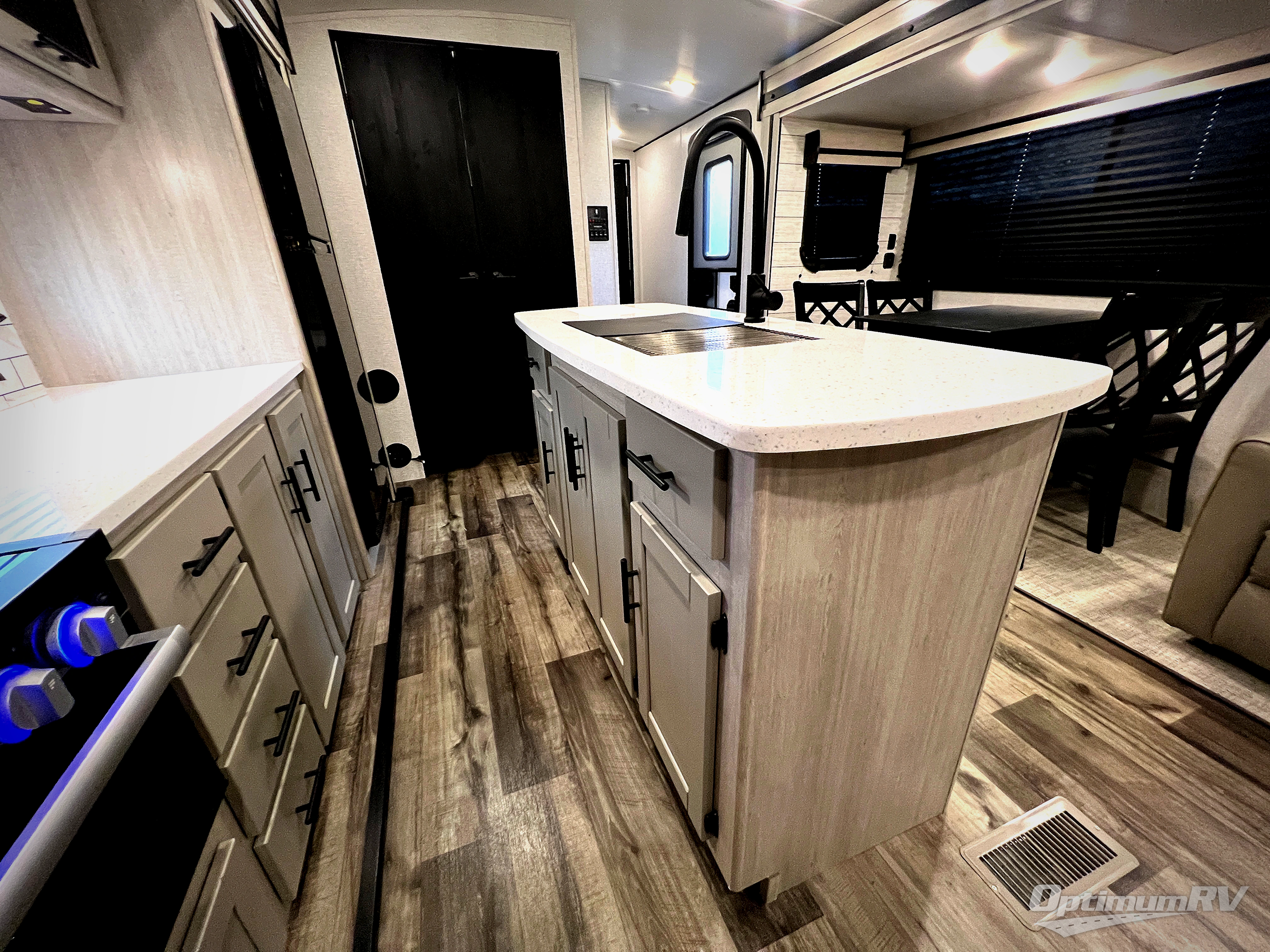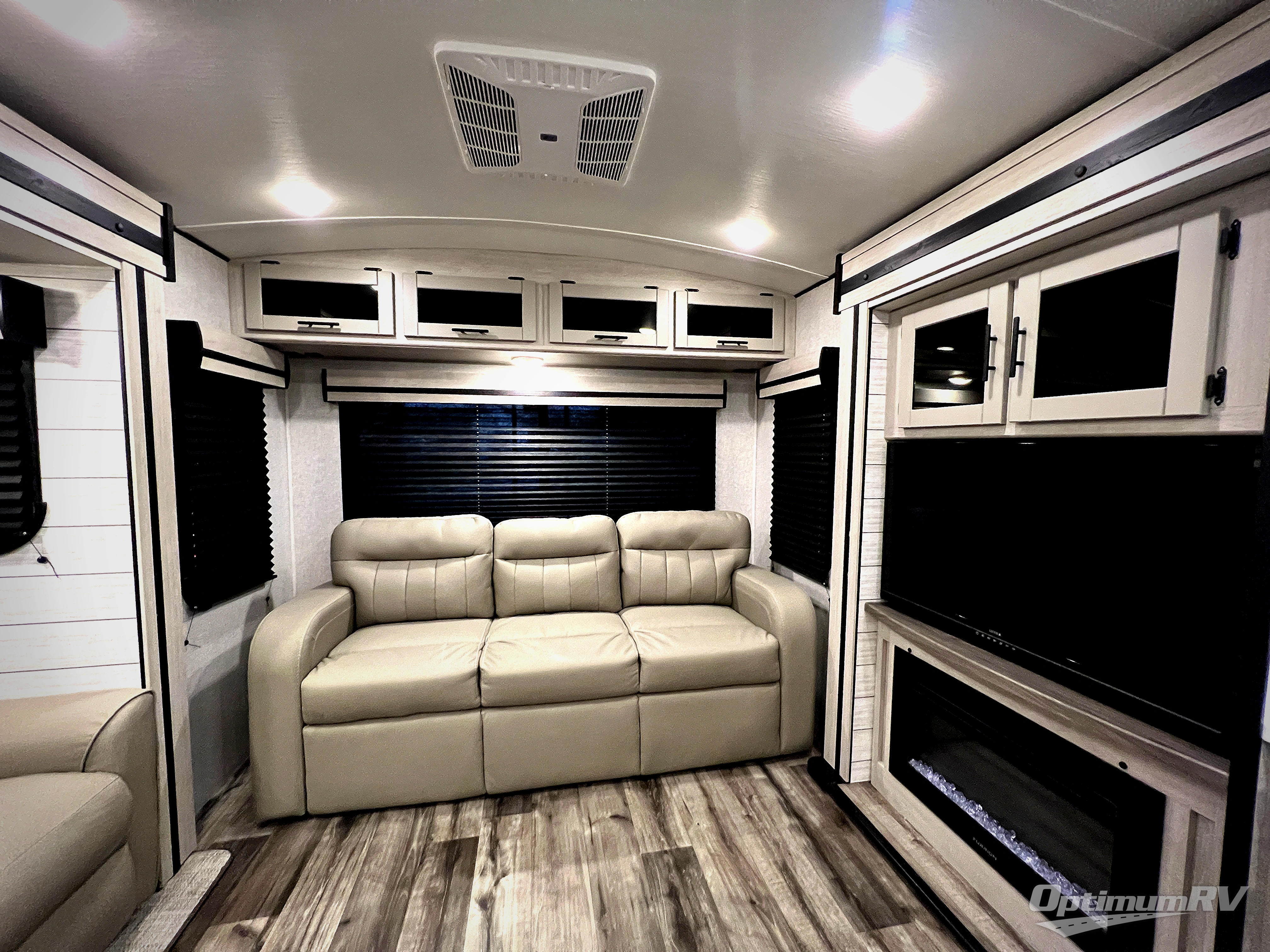 This spacious travel trailer is beaming with luxurious features you are sure to love. The dual opposing slides in the main living area open up the whole space, plus there is a third slide out in the front master suite. The chef of the family will appreciate the kitchen island for additional counter space, and there is a large pantry for all your non-perishables. This space has also been prepped to add an optional washer and dryer if you choose. Your family will find plenty of seating space on the rear 82" tri-fold sofa, the XL booth dinette, and the theater seating. The dual entry bath creates a front master bedroom, and you'll find plenty of storage space here, including a chest of drawers and a large front shelf!