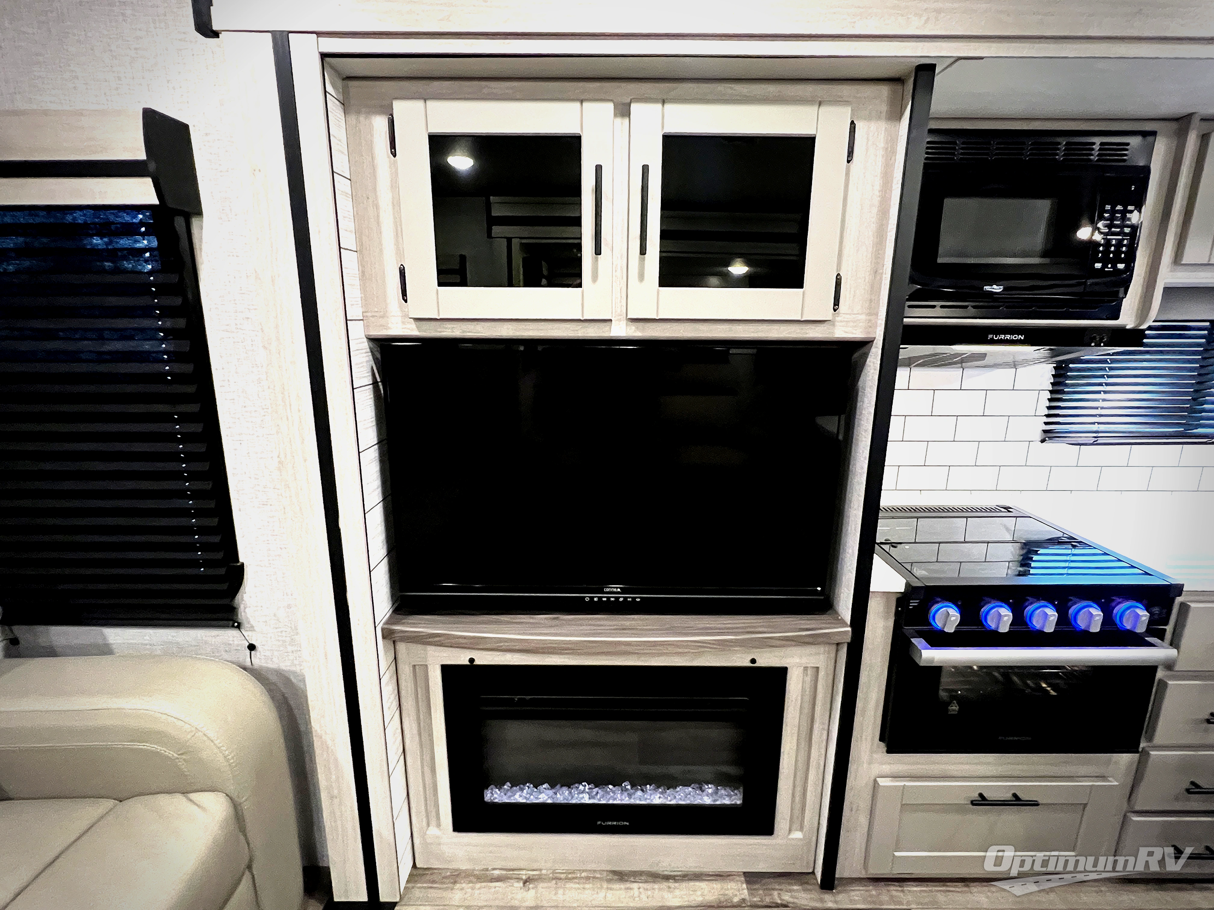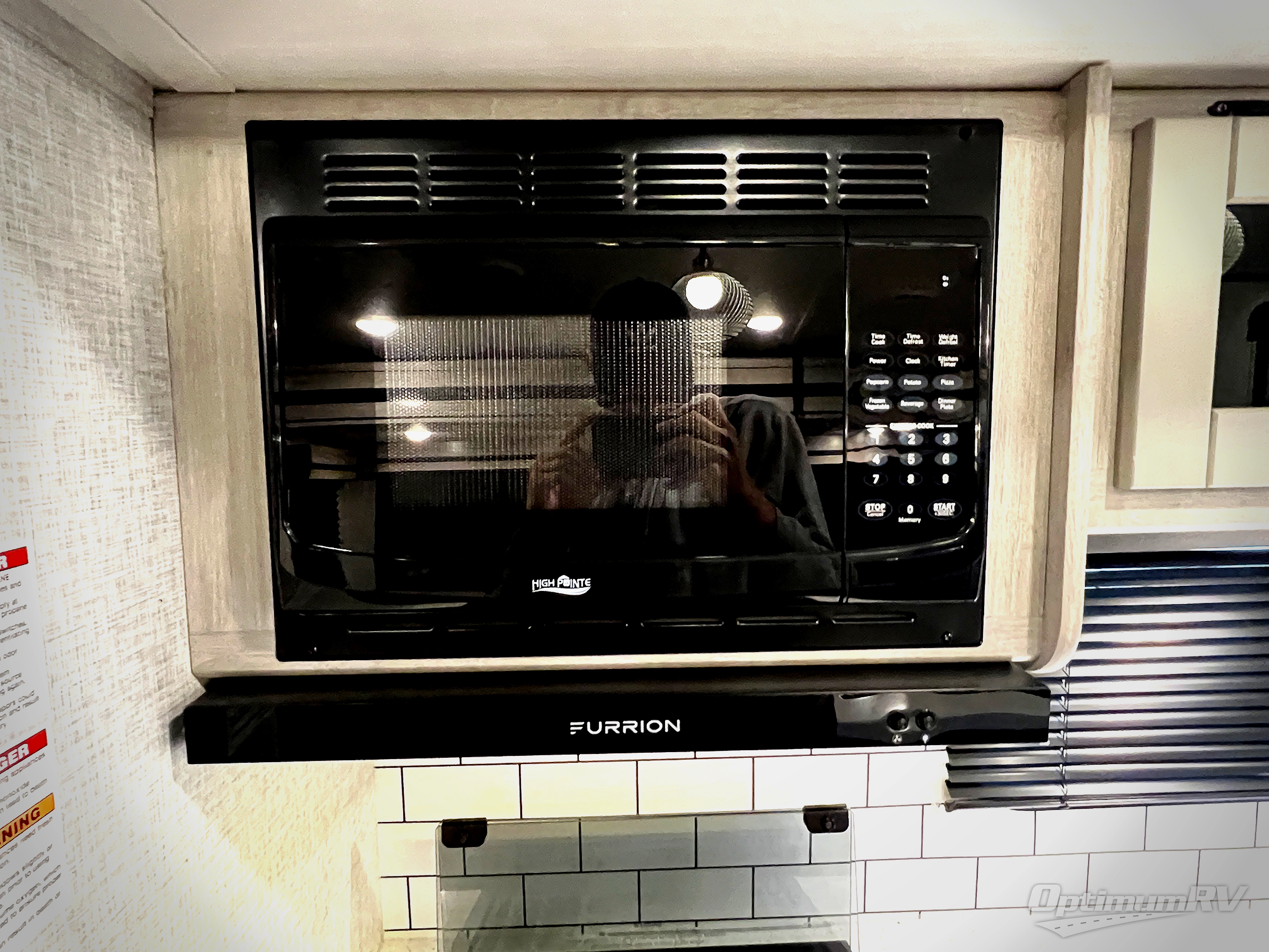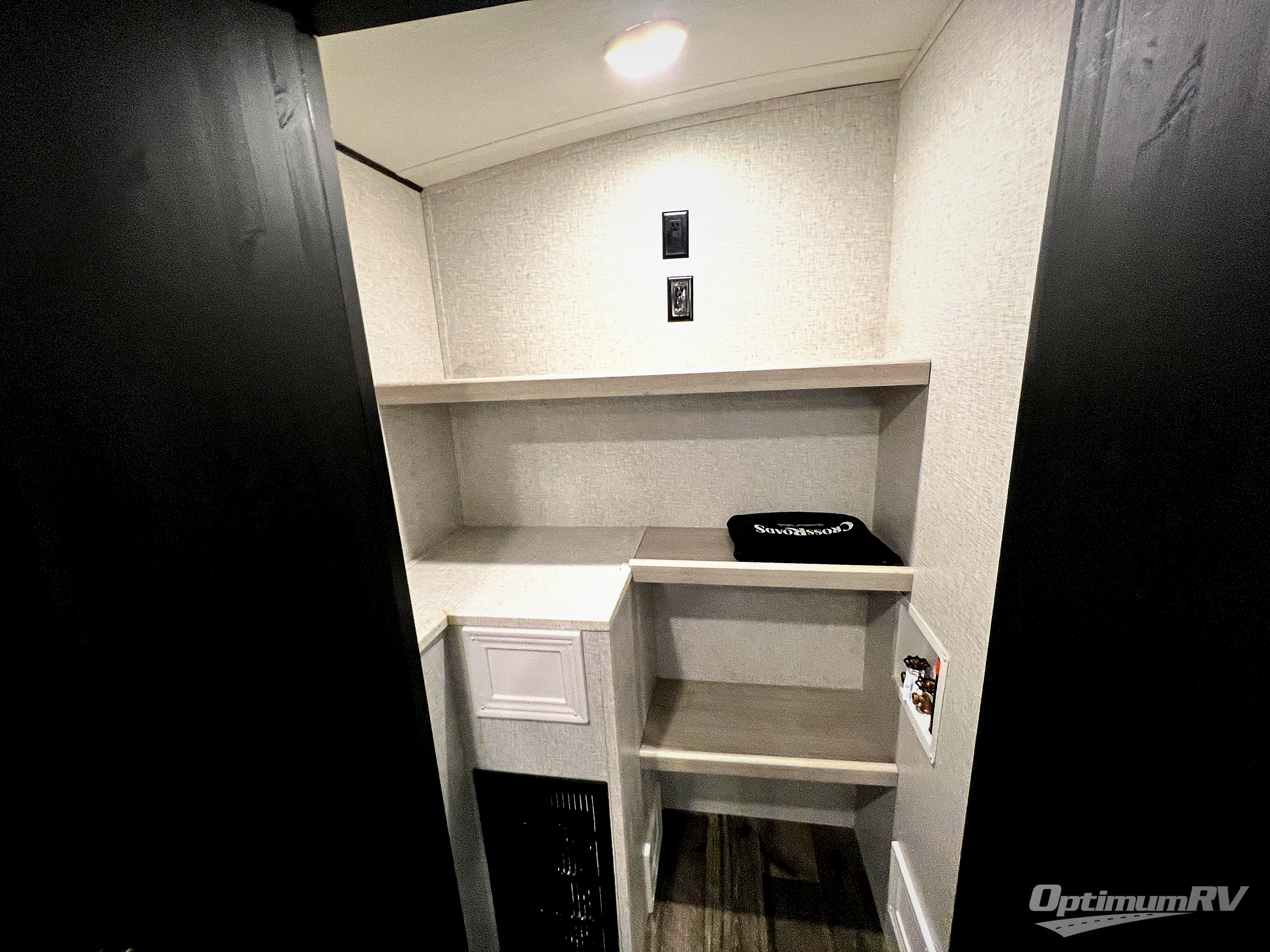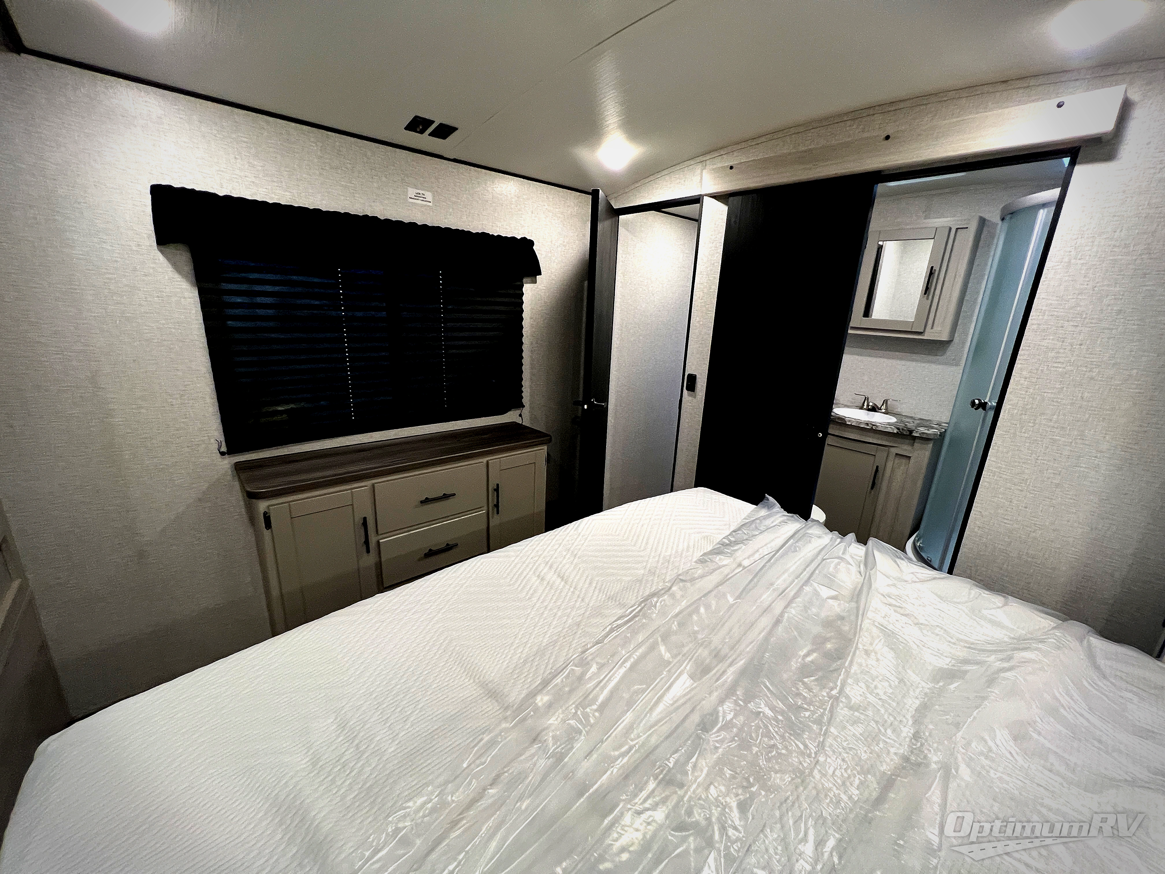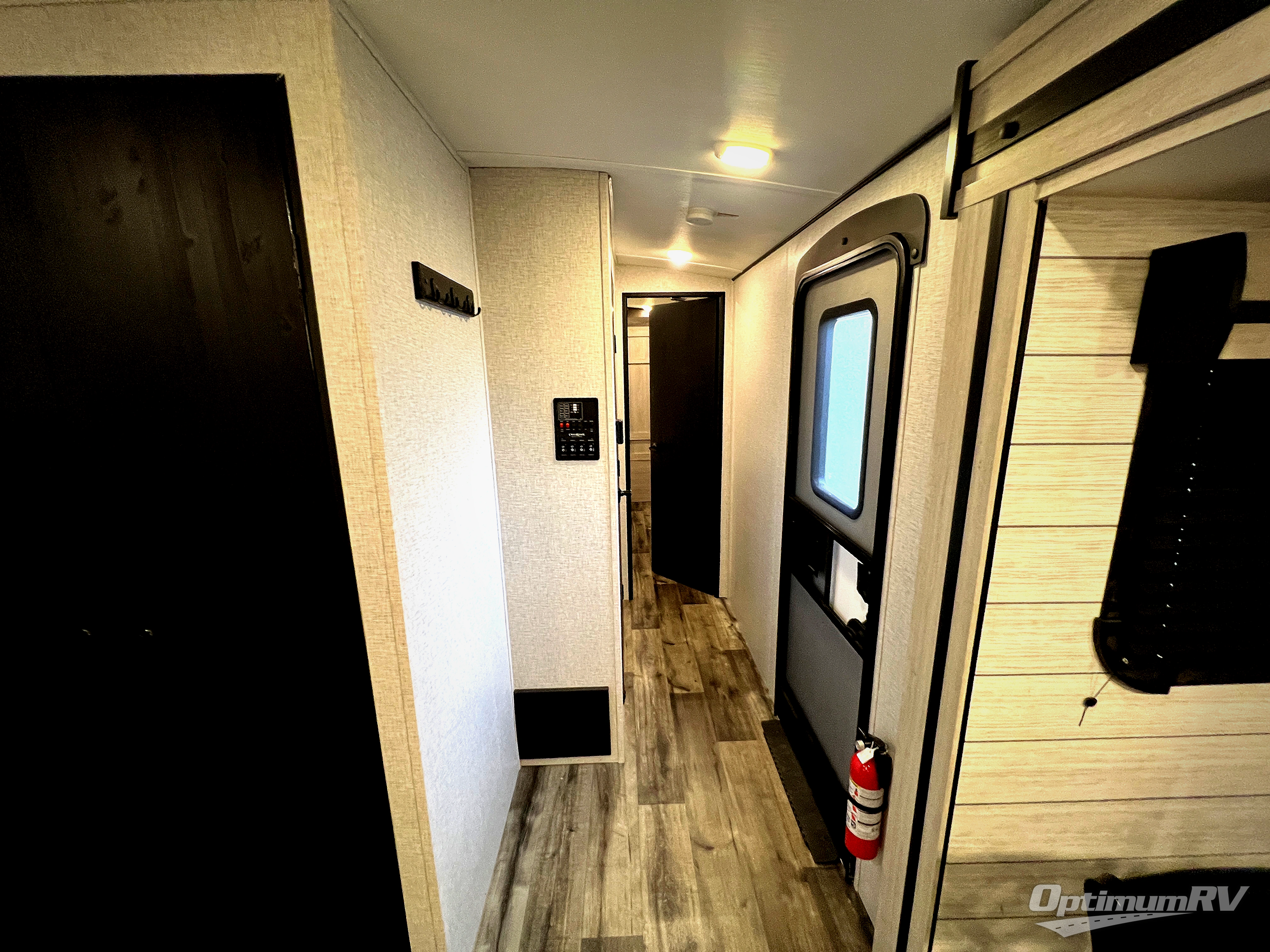 This spacious travel trailer is beaming with luxurious features you are sure to love. The dual opposing slides in the main living area open up the whole space, plus there is a third slide out in the front master suite. The chef of the family will appreciate the kitchen island for additional counter space, and there is a large pantry for all your non-perishables. This space has also been prepped to add an optional washer and dryer if you choose. Your family will find plenty of seating space on the rear 82" tri-fold sofa, the XL booth dinette, and the theater seating. The dual entry bath creates a front master bedroom, and you'll find plenty of storage space here, including a chest of drawers and a large front shelf!