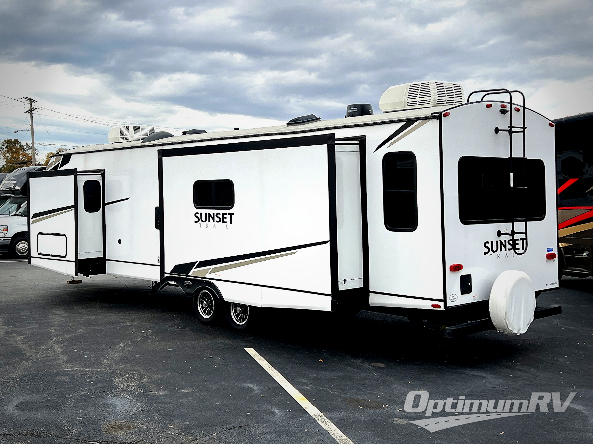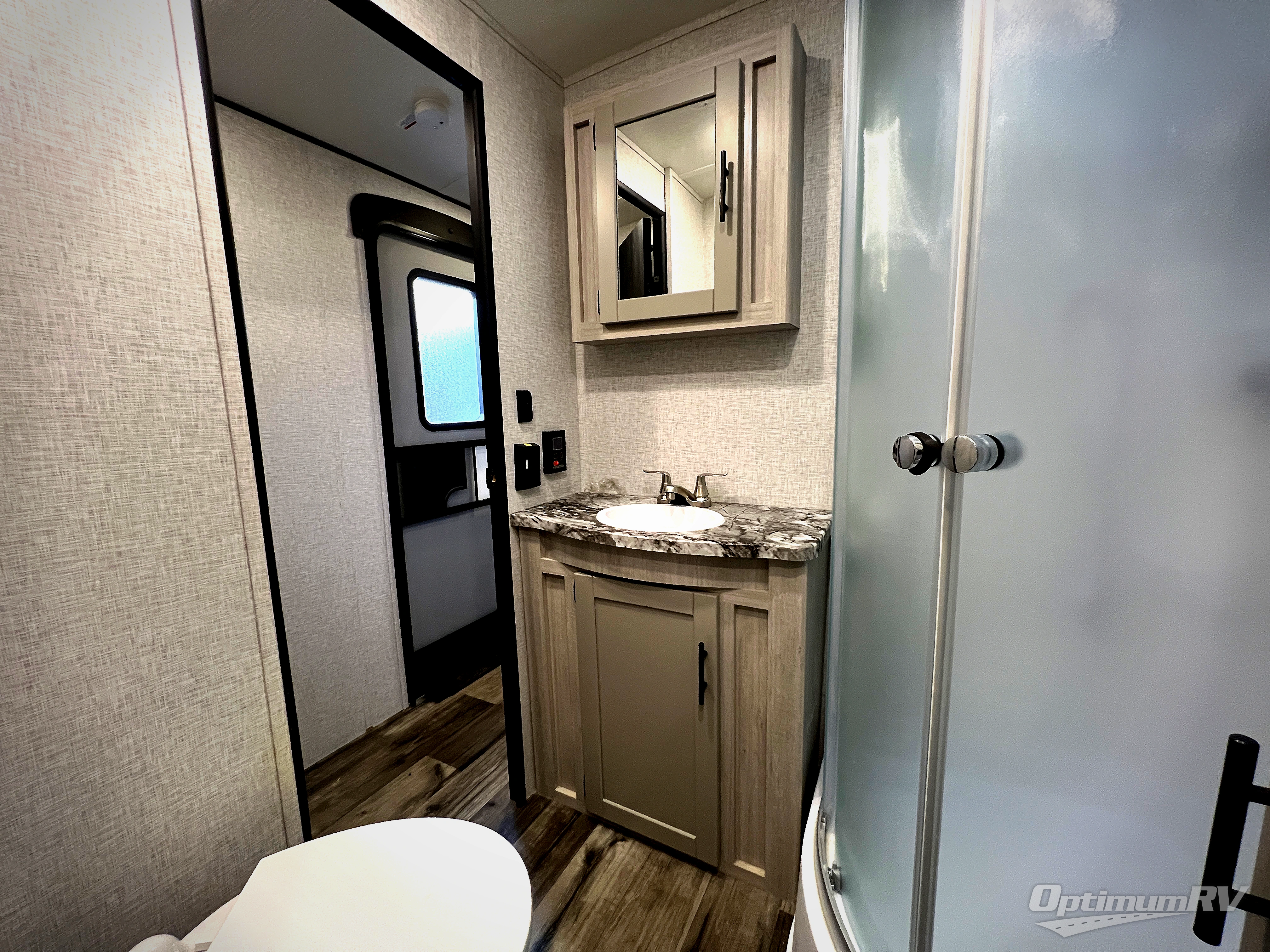 With any Sunset Trail travel trailer by CrossRoads RV, the interior offers a stainless steel farmhouse sink with a cover, solid surface kitchen countertops, and a docking station with 12 Volt, USB Port, and 110 Outlets. Also included is a 13,500 BTU air conditioner plus upgraded insulation with roof and floor reflective foil for added comfort, plus sturdy construction elements like a plywood bed board with strut assist, residential wood window trim, and hardwood cabinet doors. Make your lightweight and comfortable RV decision today!