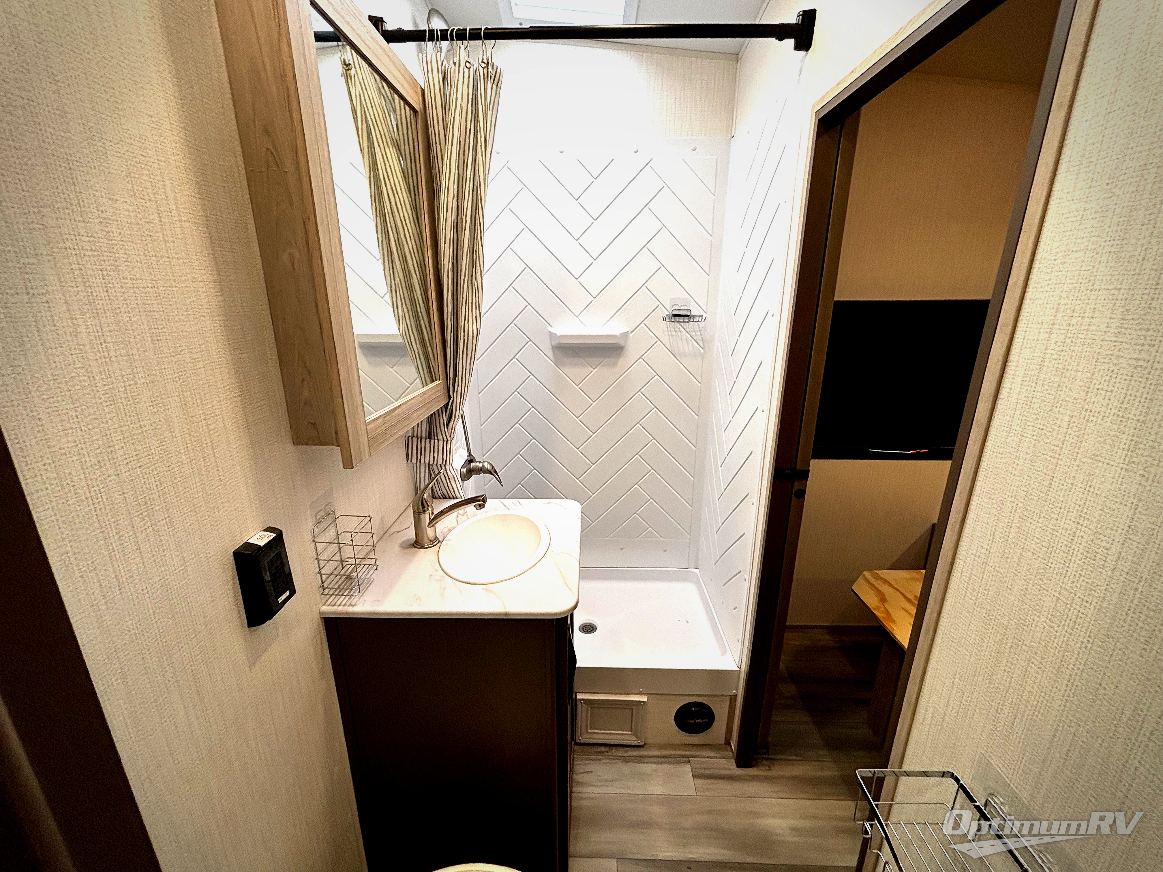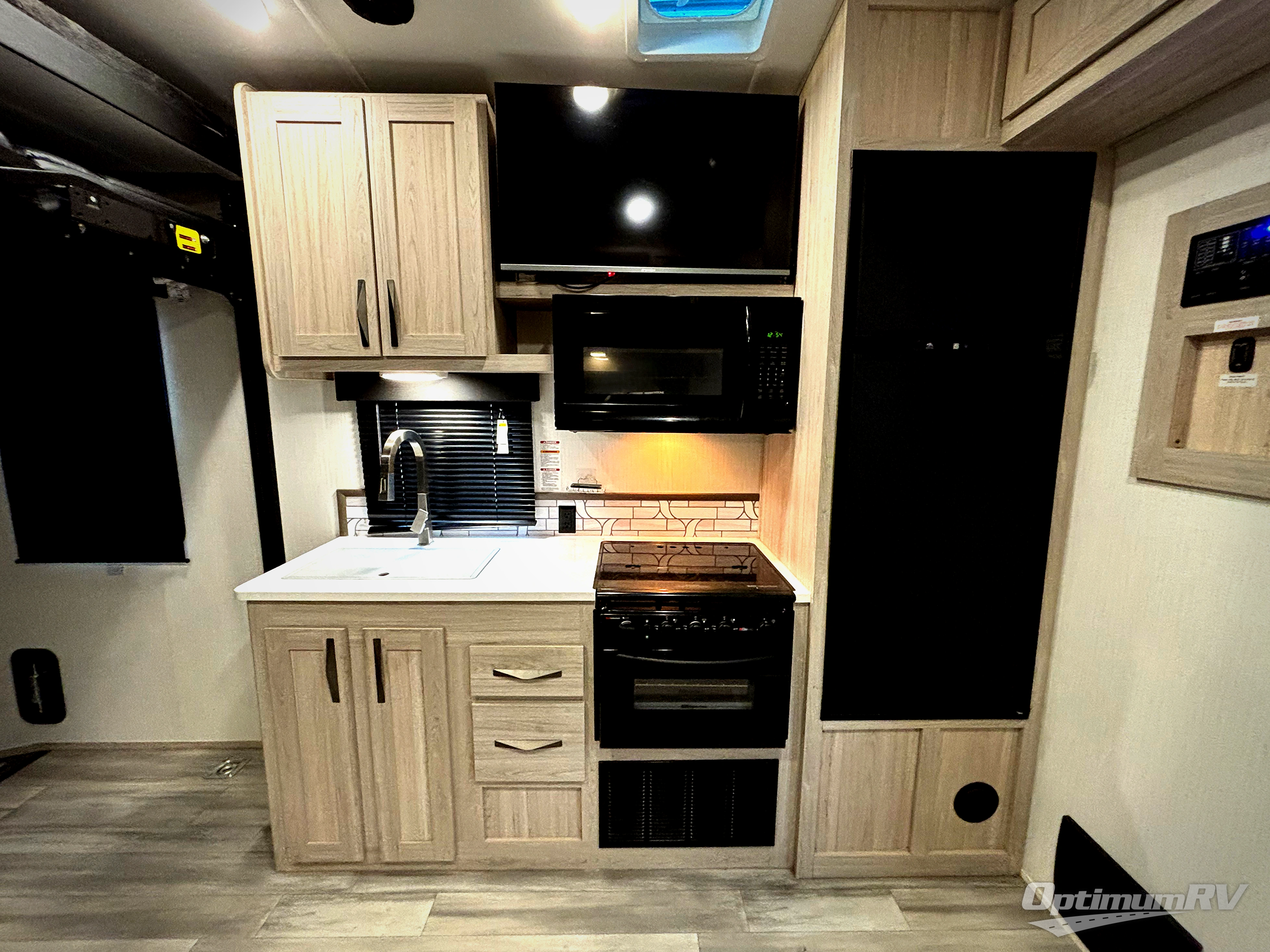Never leave your dirt bikes behind with this toy hauler in tow! You can easily unload them through the 8' 6" door opening while using the easy-load 8' ramp door. Once the toys are out, you can relax on the opposing sofas with a dinette, and this area can become your guests' bedroom at night since there is a power queen bed above the sofas. And you might want to add the optional three seasons glass door for great outdoor views as you dine or play cards in the evening. The full kitchen includes a three burner range with an oven and a large residential microwave to cook meals each day, along with a refrigerator for food storage. This model also includes dual lounge chairs in the kitchen area to provide even more seating space. When you're ready to turn in for the night, freshen up in the dual entry bath that includes a spacious shower with a skylight, a seamless edge countertop, and even a bonus shelf with towel hangers so everything has a place. Your king bed will be waiting for you in the front master bedroom, and you can keep all your clothes tidy in the dual wardrobes!