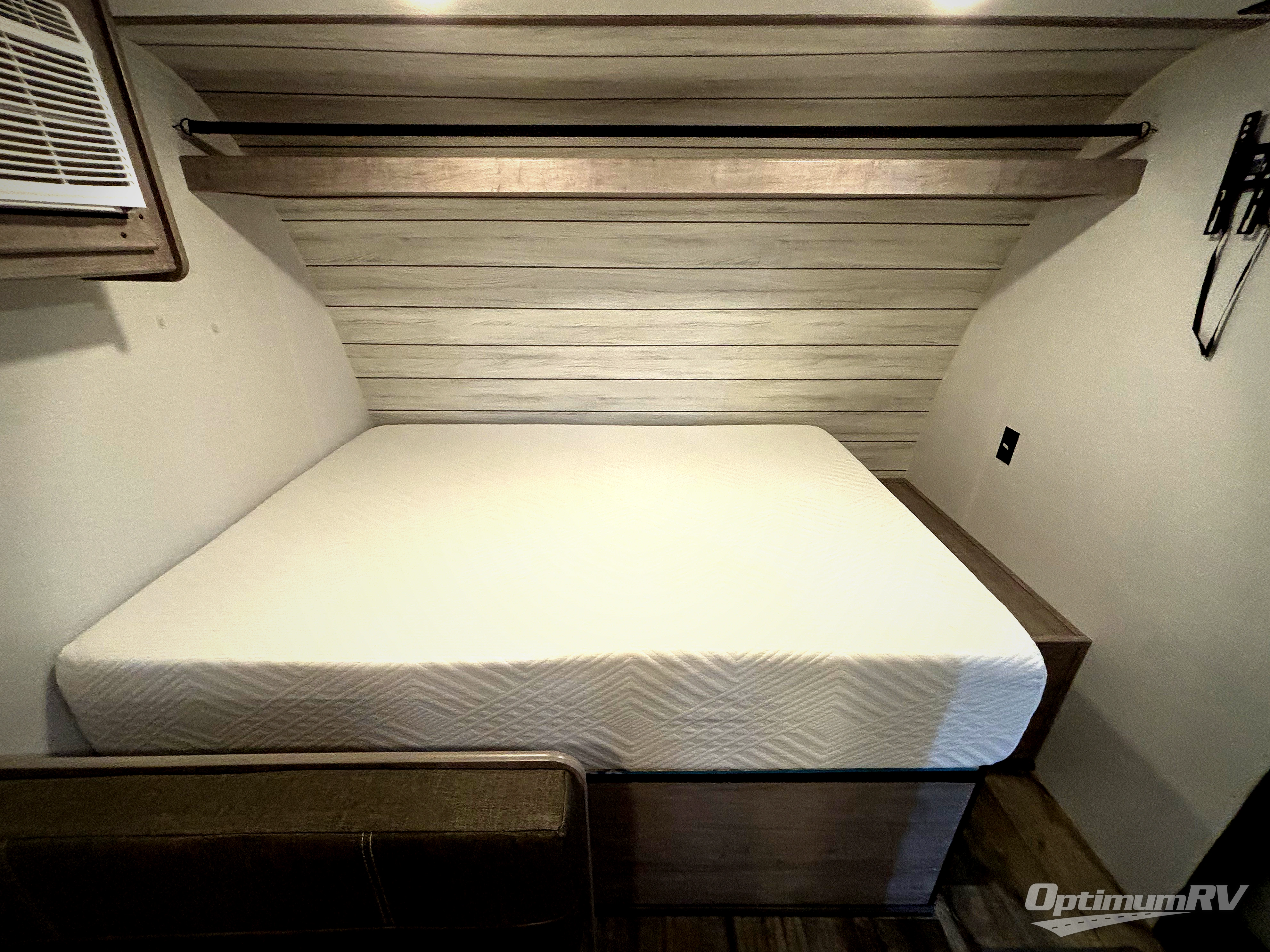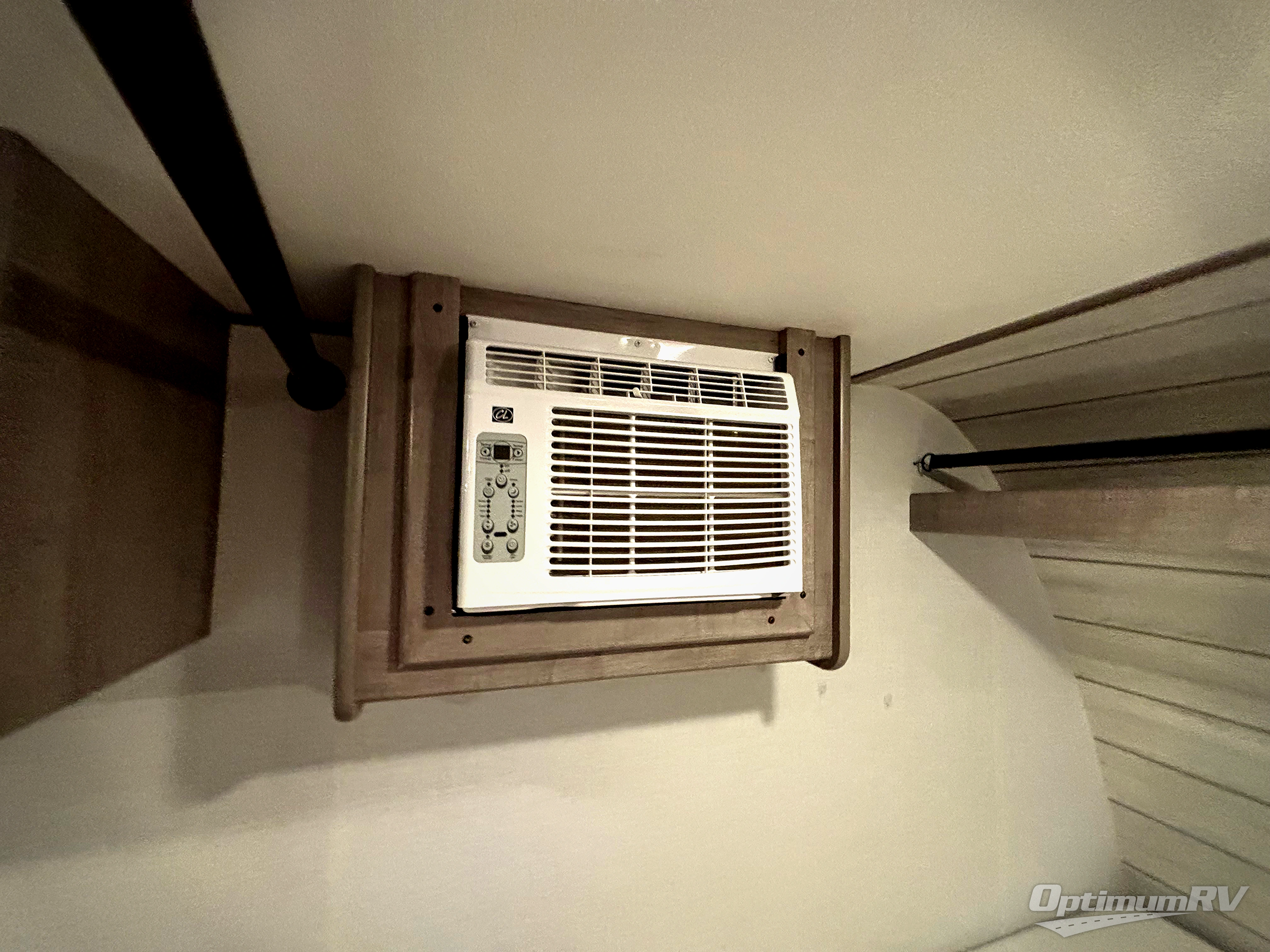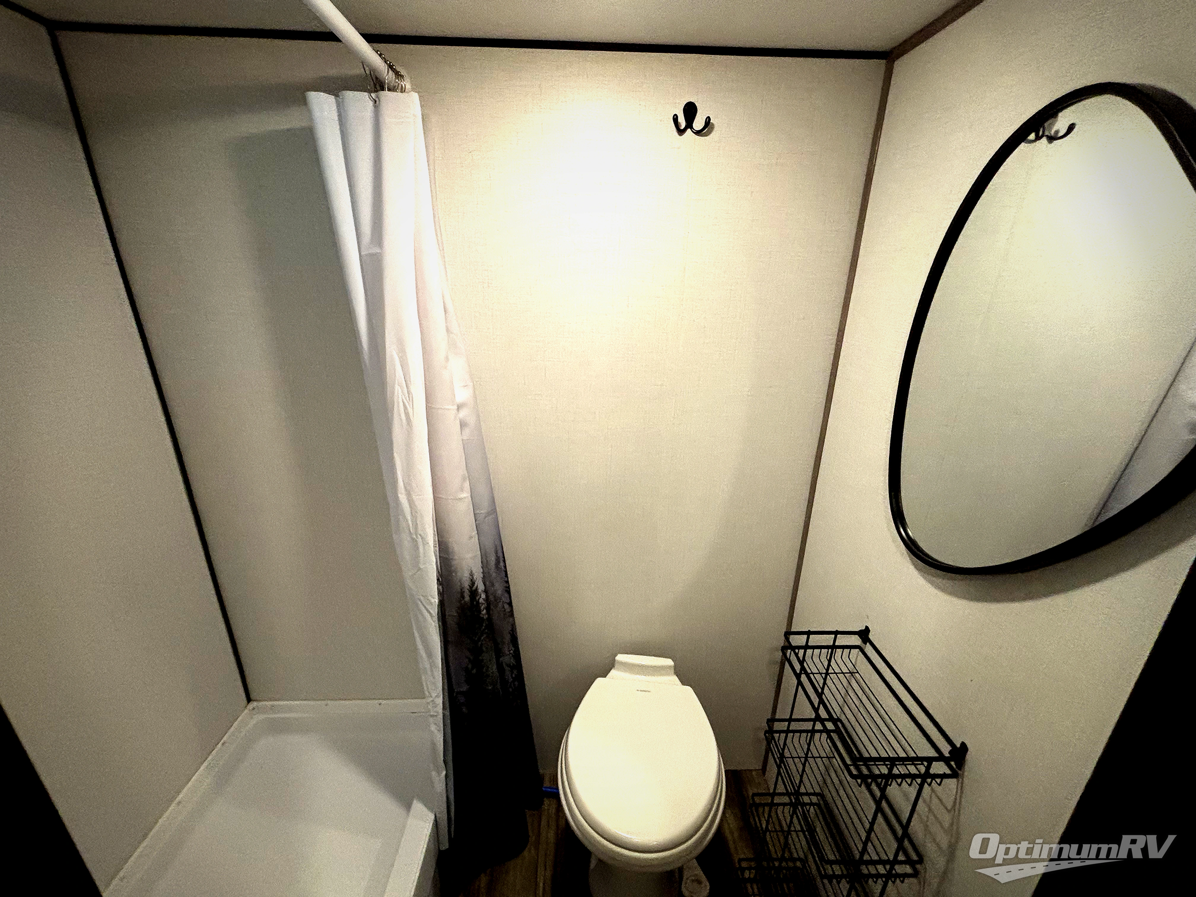 After making dinner on the two burner cooktop or inside the microwave, you can dine at the booth dinette or outside under the 8' power awning if you brought along your camping chairs. Either way you will be comfortable and the dinette may even sleep one person if needed. After playing outdoors all day, everyone can return to get cleaned up in the private bath with a shower and toilet, then fall asleep on the queen bed up front or the bunk beds in the rear corner.