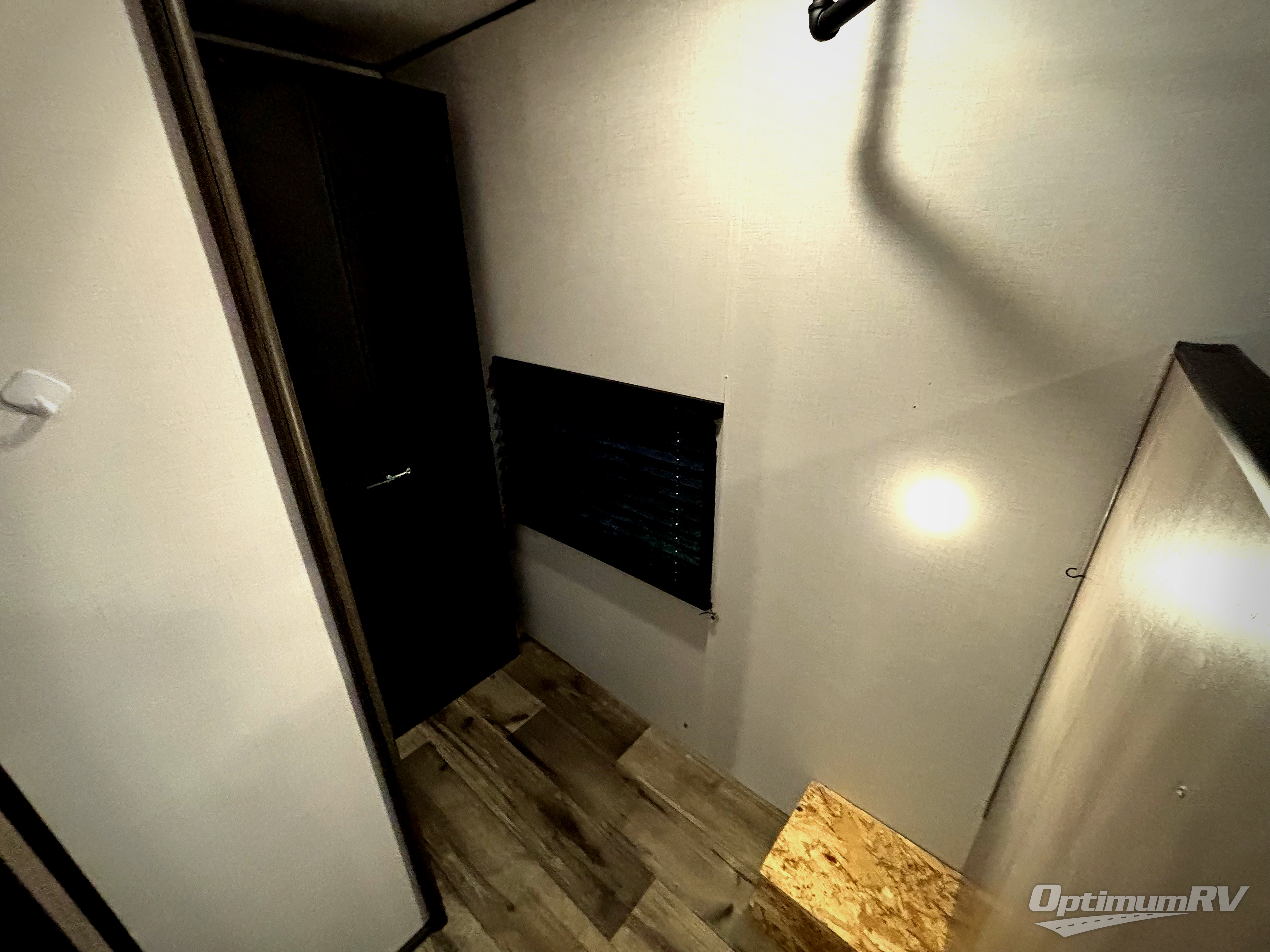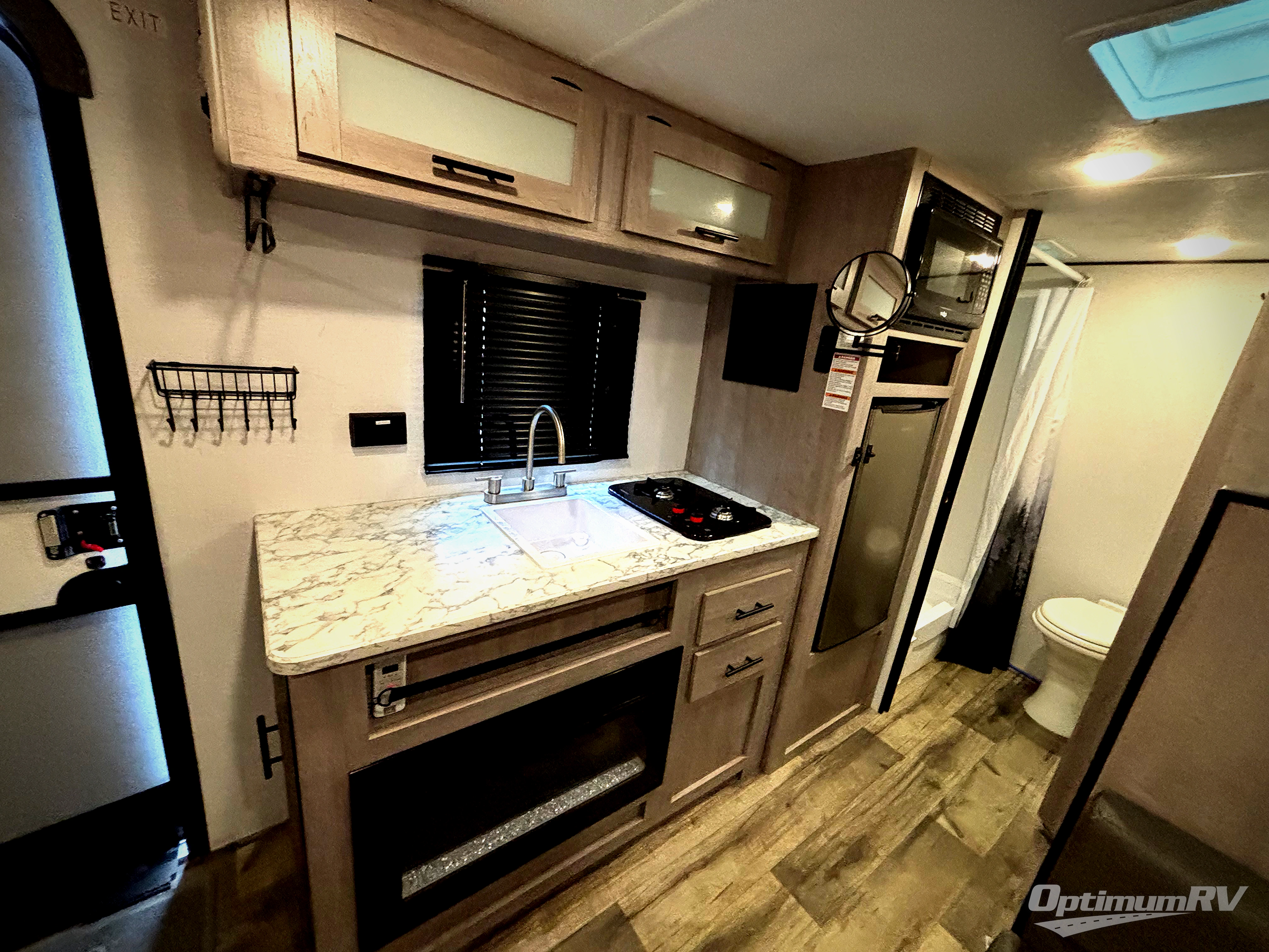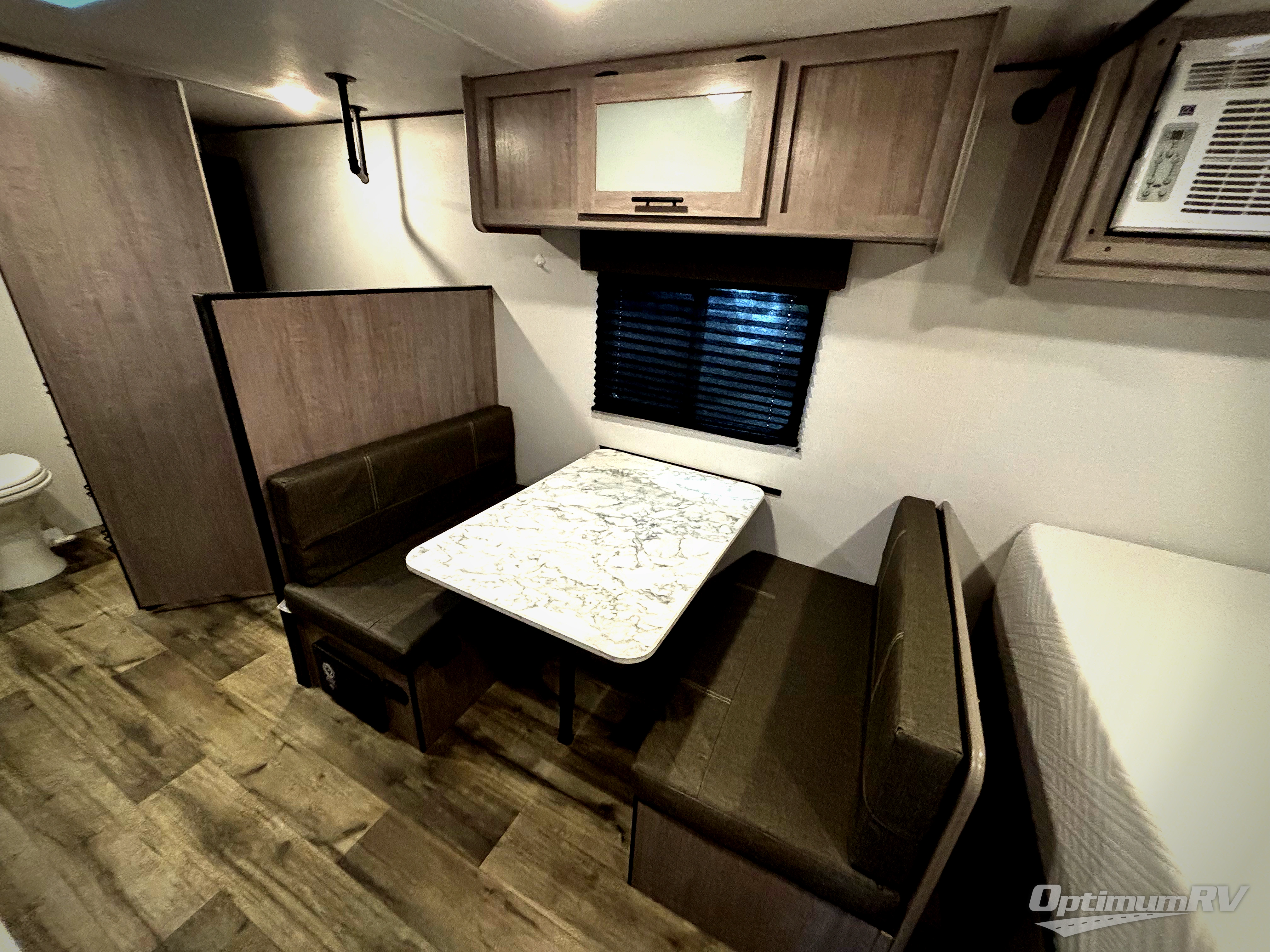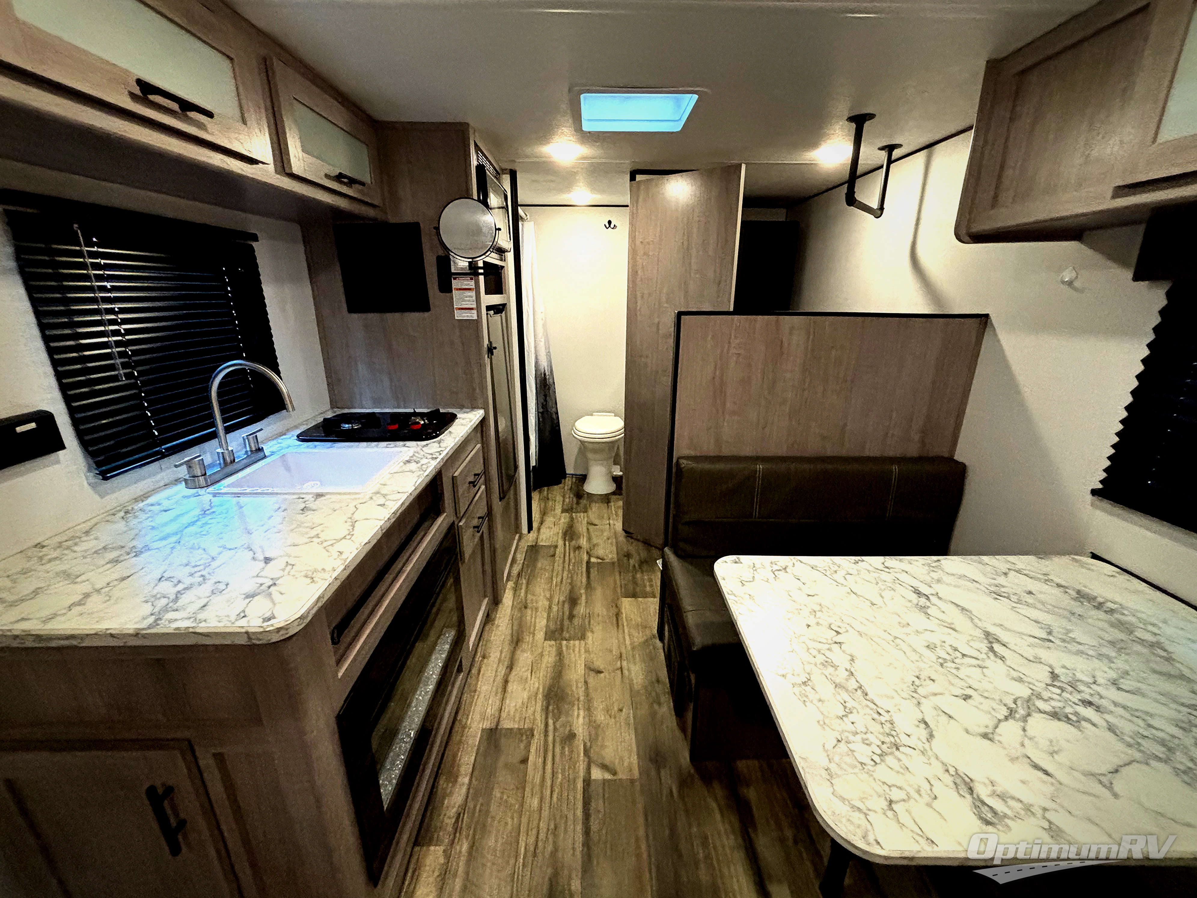 After making dinner on the two burner cooktop or inside the microwave, you can dine at the booth dinette or outside under the 8' power awning if you brought along your camping chairs. Either way you will be comfortable and the dinette may even sleep one person if needed. After playing outdoors all day, everyone can return to get cleaned up in the private bath with a shower and toilet, then fall asleep on the queen bed up front or the bunk beds in the rear corner.