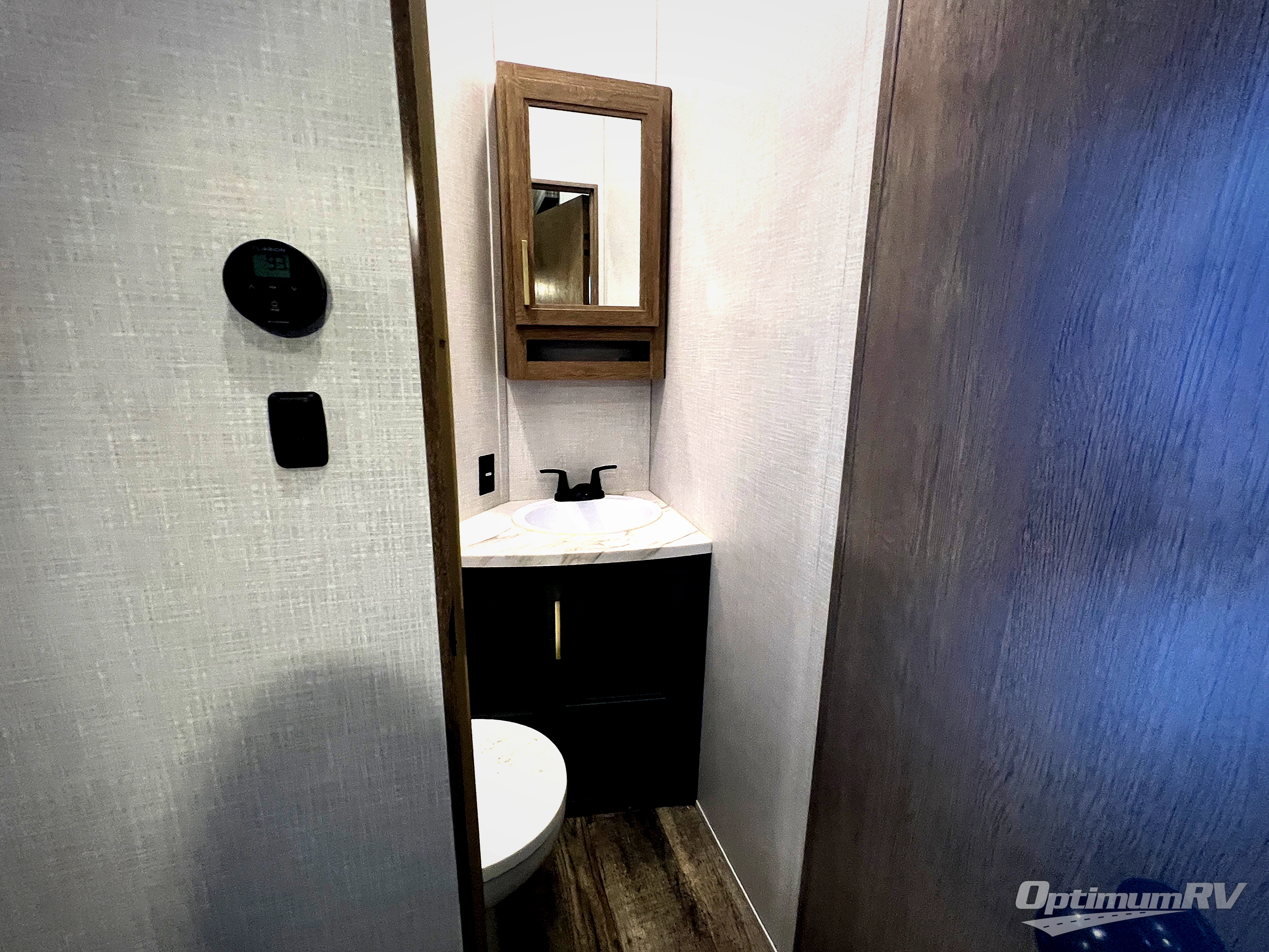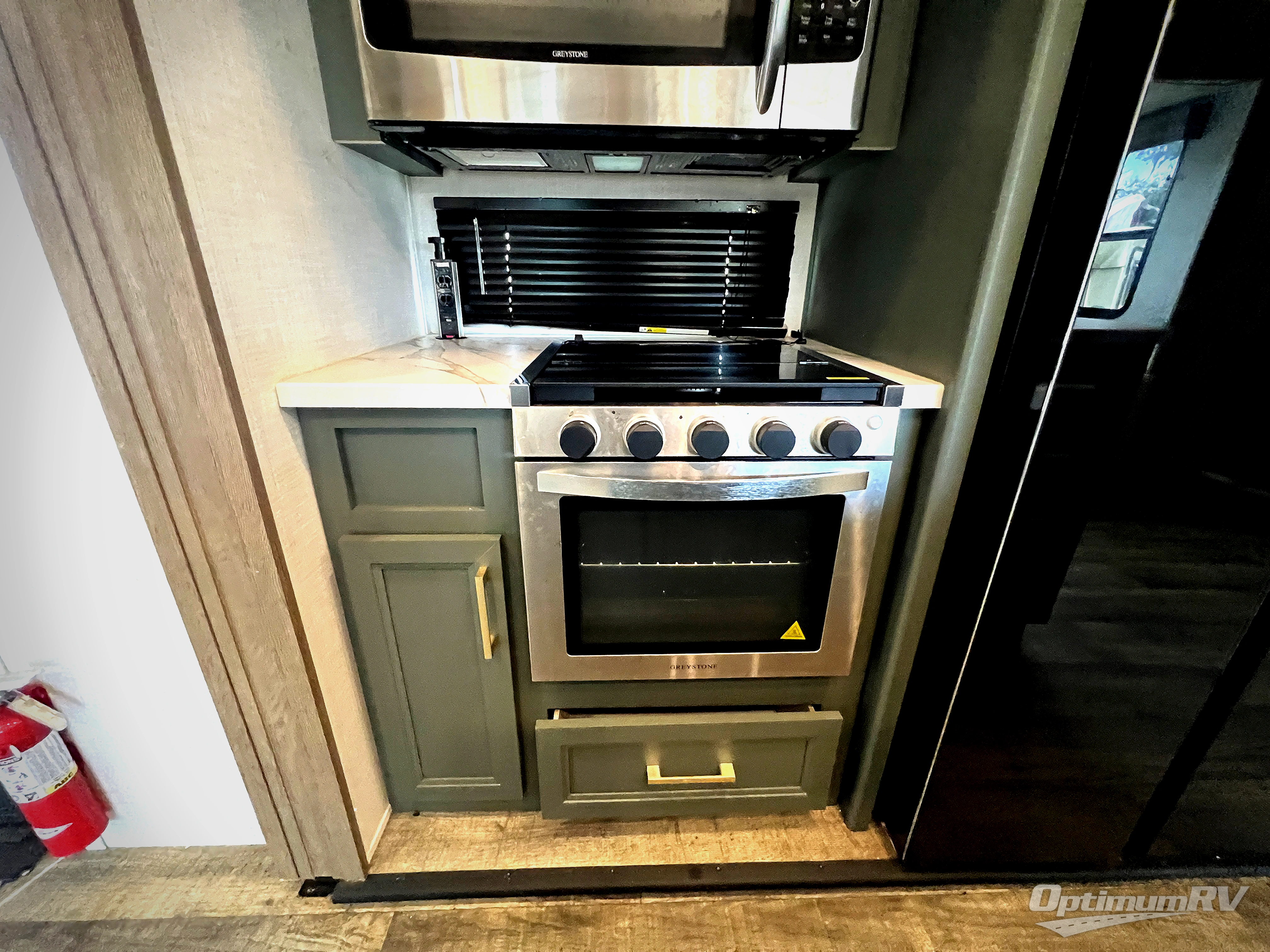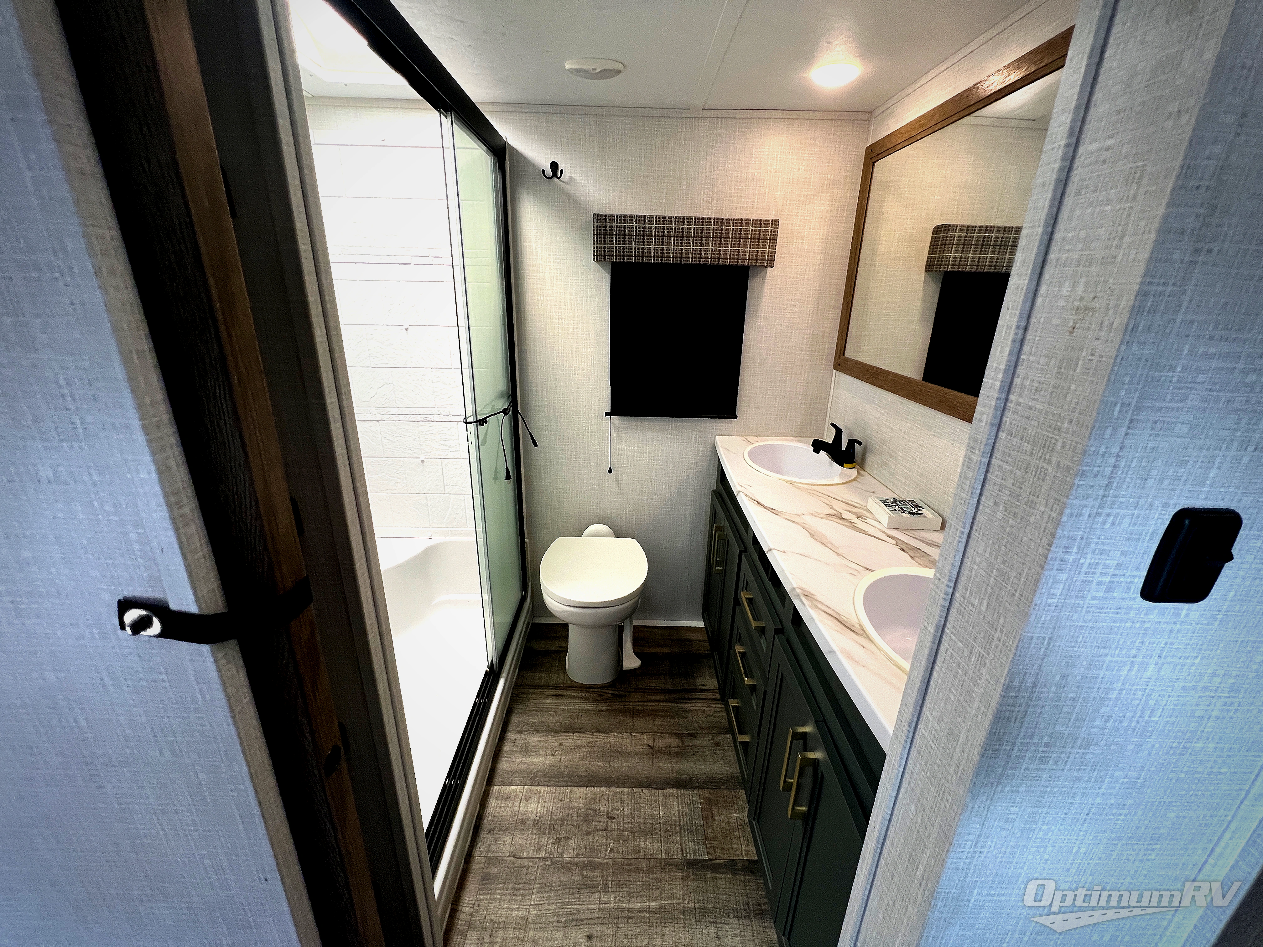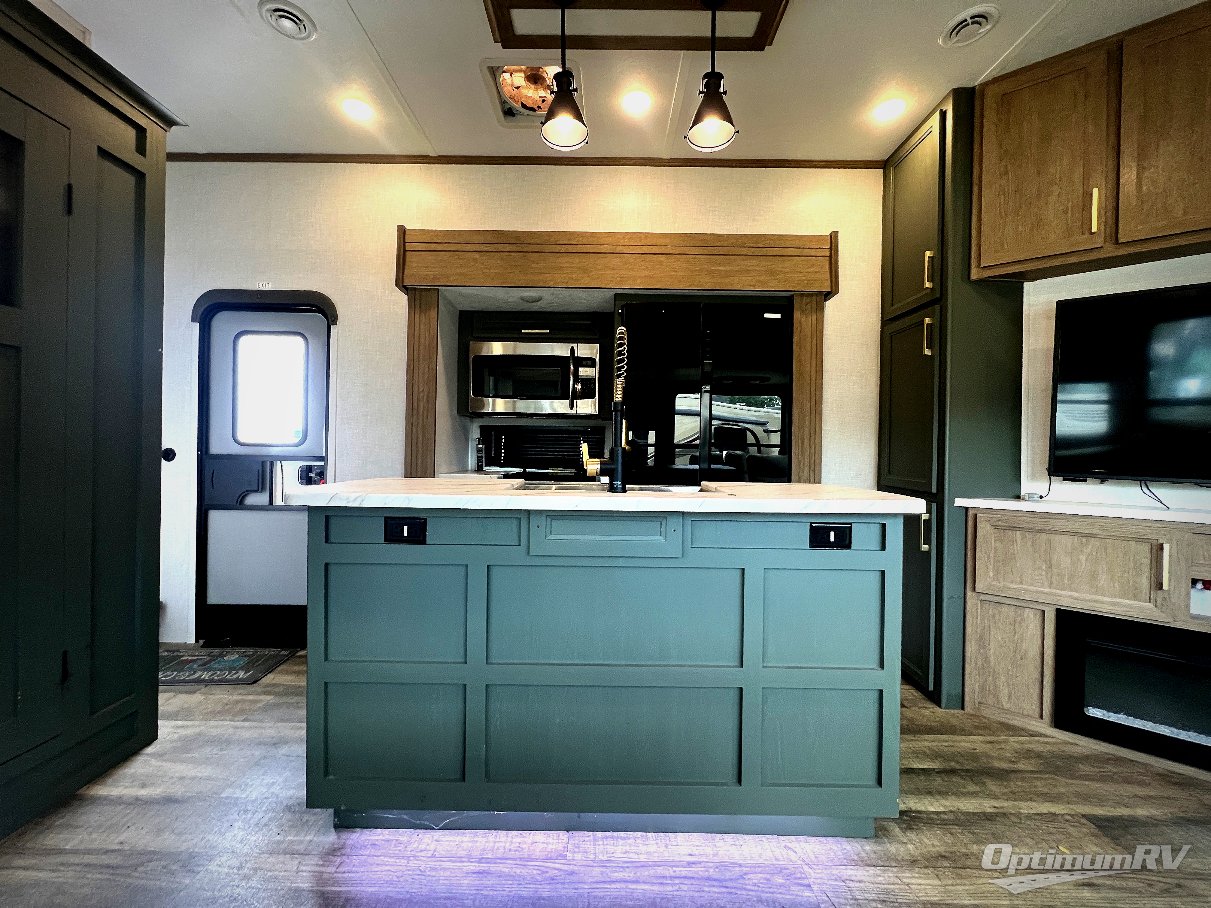 If you like to camp with a larger group, this fifth wheel is for you! There are two bedrooms; one up front with a king bed slide out, and one in the back with a bed plus a loft above to sleep more. There is even a half bath in the back bathroom for guests, and the full bath up front includes dual bath sinks for added convenience. Everyone can meet in the combined living area and kitchen since there is a booth dinette and theater seating in great view of the fireplace and HD LED TV, and the kitchen island will bring this whole room together. A large pantry is also found here and a spacious 16 cu. ft. refrigerator to hold food for the whole week. Head outside to find the outdoor kitchen, two patio awnings, plus dual entry doors for a smooth flow of traffic!